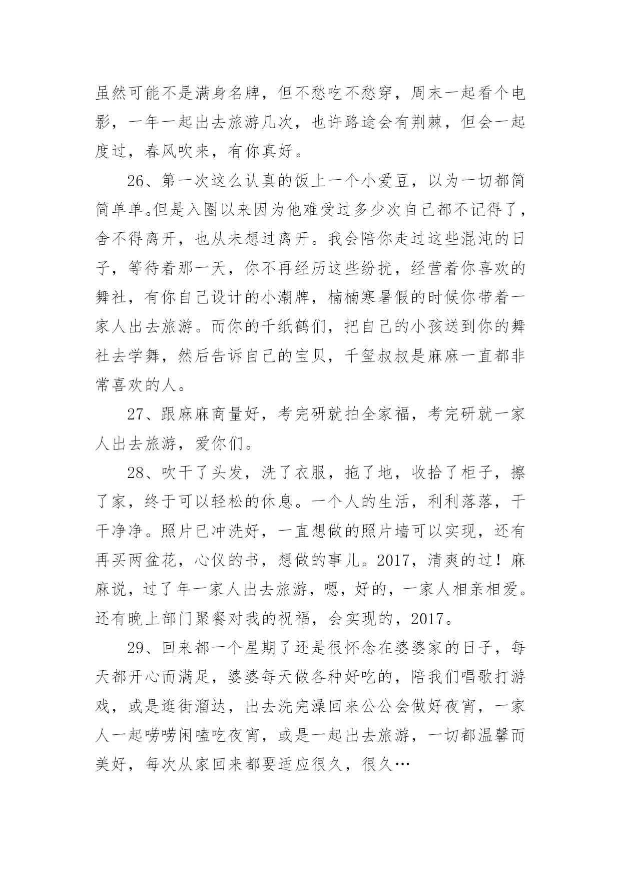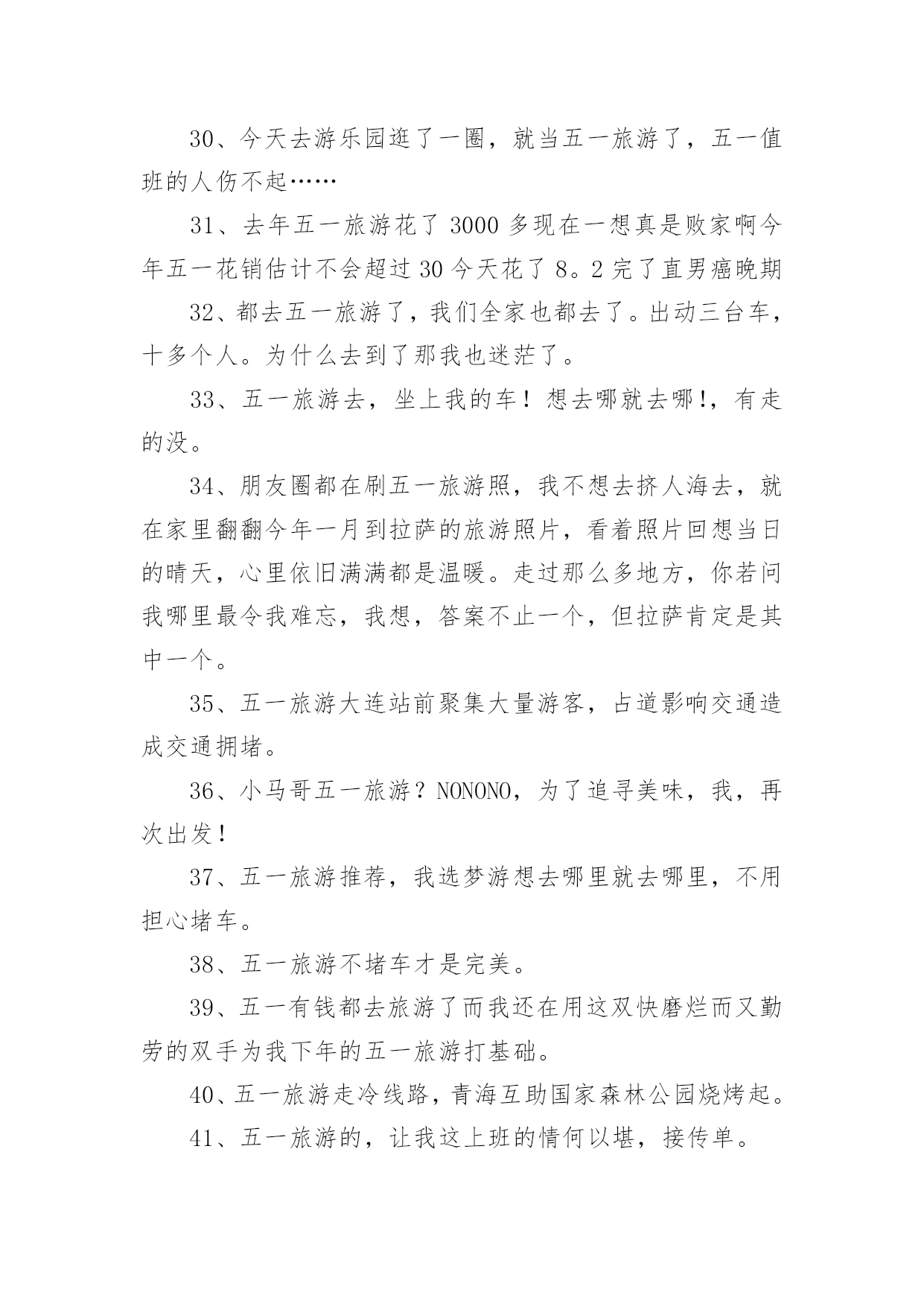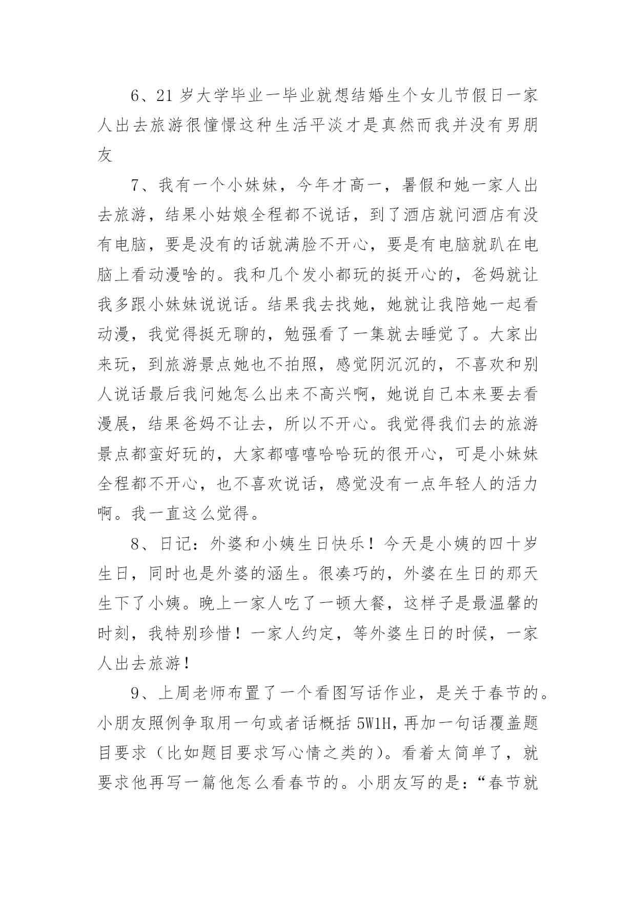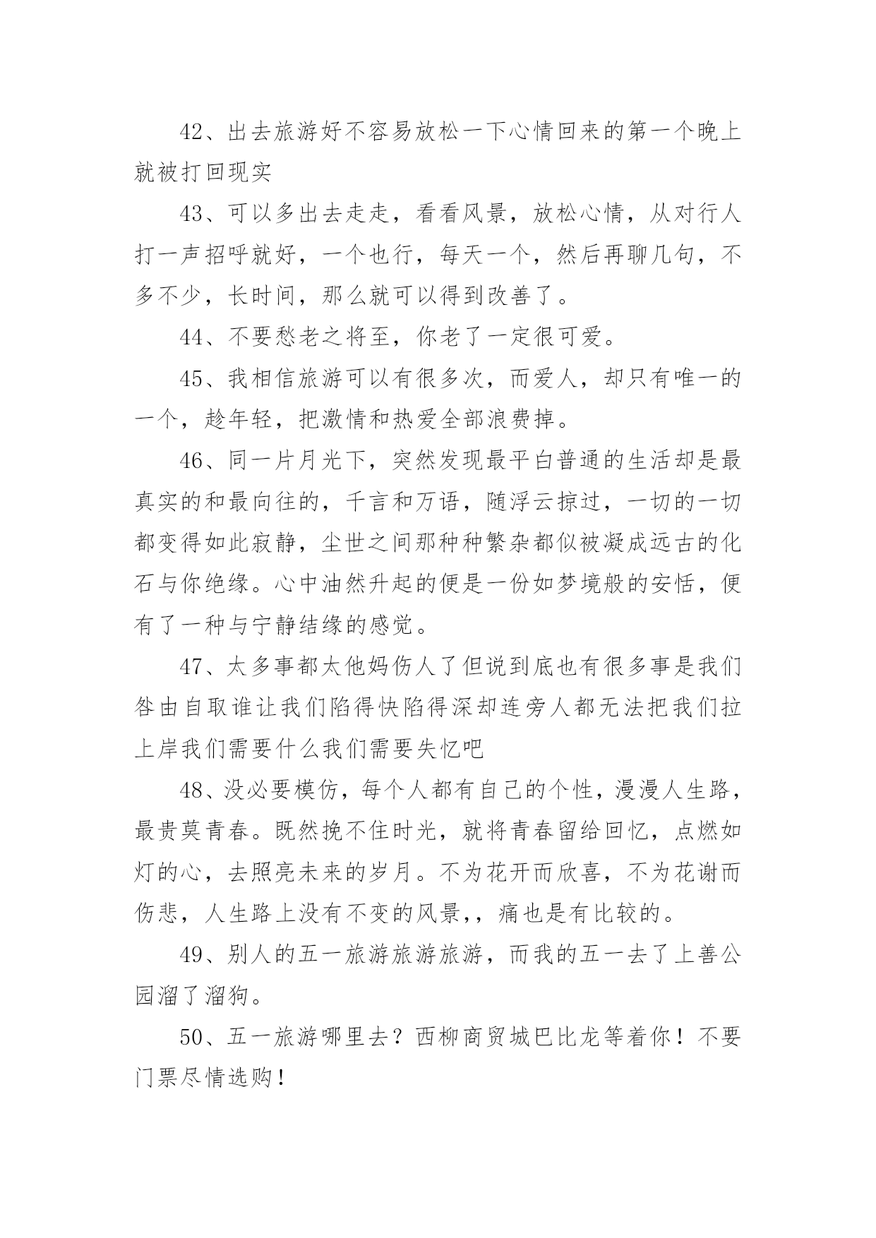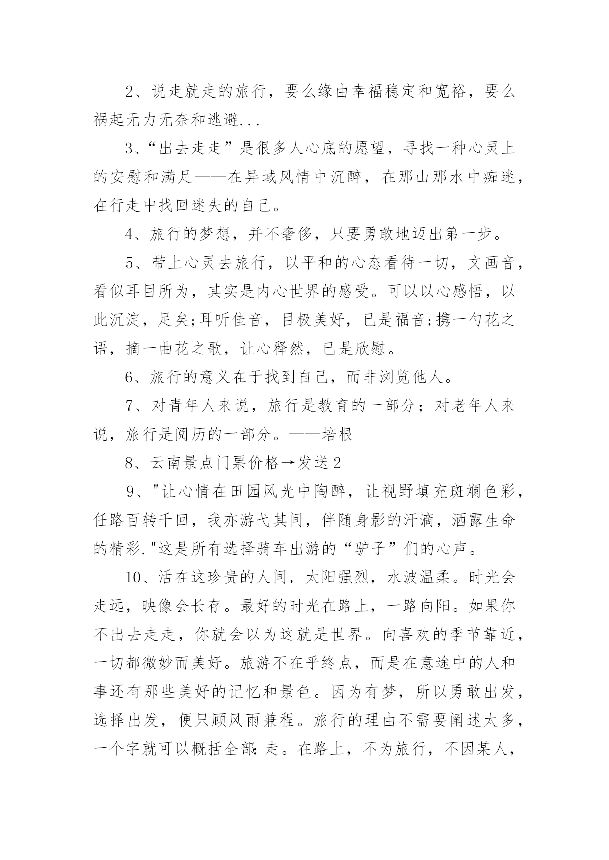 出去旅游的心情说说随着社交网络的兴起和普及,越来越多人钟情于发布说说,用以宣泄自己的情绪,调节心情。什么样的说说才让人印象深刻呢?下面是小编整理的出去旅游的心情说说,供大家参考借鉴,希望可以帮助到有需要的朋友。出去旅游的心情说说11、同样一家人,差别怎么这么大的呢,人人都出去旅游,就我一直呆在家。2、最近一家人出去旅游啦!宝宝好开心!很喜欢出去游玩~岳阳石牛寨,玻璃桥!老爸恐高也上了,勇敢的扶着不往下看走过去啦。3、打算,和男朋友一起去旅游当然是一家人出去开开心心的玩一下。4、这个跨年,看着朋友圈的朋友都在刷跨年,我的心有点酸酸的,很悲伤。好想找个人喝醉,好想堕落好想放纵一回。第二天一切都结束了,都变成我期望的样子,我想有个家,一个属于我的家,干净整洁温馨,每天接送孩子上下学,做着自己喜欢的工作,可以有时间学自己的爱好,可以一家人出去旅游…就这样一辈子。5、表妹一家人其乐融融的出去旅游,看到全家福得一瞬有种莫名的情绪,遗憾?羡慕?属于我的全家福依稀记得是十年多年前了吧。。。原来只是假装不在乎6、21岁大学毕业一毕业就想结婚生个女儿节假日一家人出去旅游很憧憬这种生活平淡才是真然而我并没有男朋友7、我有一个小妹妹,今年才高一,暑假和她一家人出去旅游,结果小姑娘全程都不说话,到了酒店就问酒店有没有电脑,要是没有的话就满脸不开心,要是有电脑就趴在电脑上看动漫啥的。我和几个发小都玩的挺开心的,爸妈就让我多跟小妹妹说说话。结果我去找她,她就让我陪她一起看动漫,我觉得挺无聊的,勉强看了一集就去睡觉了。大家出来玩,到旅游景点她也不拍照,感觉阴沉沉的,不喜欢和别人说话最后我问她怎么出来不高兴啊,她说自己本来要去看漫展,结果爸妈不让去,所以不开心。我觉得我们去的旅游景点都蛮好玩的,大家都嘻嘻哈哈玩的很开心,可是小妹妹全程都不开心,也不喜欢说话,感觉没有一点年轻人的活力啊。我一直这么觉得。8、日记:外婆和小姨生日快乐!今天是小姨的四十岁生日,同时也是外婆的涵生。很凑巧的,外婆在生日的那天生下了小姨。晚上一家人吃了一顿大餐,这样子是最温馨的时刻,我特别珍惜!一家人约定,等外婆生日的时候,一家人出去旅游!9、上周老师布置了一个看图写话作业,是关于春节的。小朋友照例争取用一句或者话概括5W1H,再加一句话覆盖题目要求(比如题目要求写心情之类的)。看着太简单了,就要求他再写一篇他怎么看春节的。小朋友写的是:“春节就是一家人开车出去旅游,妈妈通常在一边躲太阳,偶尔和我互动,爸爸就陪着我玩”社会的改变,小朋友对春节有了和我们完全不同的'理解10、白天傍晚睡太多,睡到半夜睡不着,睡不着的夜里就想我们家甜,一直没能全心全意照顾我家甜,但我们甜小小年纪非常乖巧懂事可爱聪明,我们一家人Fighting,甜快快乐乐长大哦!特别期盼假期快快到来,可以带我们家甜多出去旅游旅游!11、刚刚午休做了一个梦梦到,我们只是在开玩笑。你一言我一句就当什么也没有发生。然后一家人出去旅游,去逛ktv的时候把会所当ktv进去了。老板一个劲的忽悠说是ktv,然后我说我刚刚在里面才转了一圈都是老司机,大堂经理不厚道的笑了。第二继续旅游,剧情调转到了成都我一直在骑车……睡醒了发现文字都是发生过的,话也是说过的,有点似梦有点非梦。醒来感觉少了些什么12、我和弟未婚我爸妈年纪也大了,我跟我爸妈建议就是过年别折腾了,我和我弟弟出点钱,我爸妈出点钱,我们一家人凑个三四千,带着老的中的小的和娃娃,去酒店定一桌,大家吃吃喝喝,拍照留念,送点纪念品,回家后开开心心出去旅游。我妈妈说我这脑子怎么长的,一点都不像正常人。正常人应该是怎么样的?13、最美不过是冬天,冰冷的感觉很好,一切沉寂在心底。陪孩子上上课,一家人吃个热乎乎的火锅。偶尔出去旅旅游。雪,你好,我要回来了,倒计时三天。14、挺好的一家人出去旅游,期待下月快点到。15、生命太脆弱,亲情很伟大。一位母亲哭着跟我说,她女儿昨晚大出血。本来一家人高高兴兴圣诞节出去旅游,现在突然在医院抢救。老两口本来身体就不好,还有两个四五岁孩子。她一边说一边哭,我也跟着哭。情绪复杂,无法感同身受,只想好好爱家人。突然想回家,抱抱爸妈。16、当初怎么给我说的,我考完了就一家人出去旅游,一起其乐融融吃火锅,没想到我是最早回家过年的,我都快等不及了,老爸老姐快点放假回家好吗?17、看到二嫂全民K歌发新歌去听了一下,背景照片里有一张一家人出去旅游的照片,我二大走在最后面的身影,眼泪一下子就控制不住了,过再久也减退不了。还记得那天晚上,我一个人守在您身旁,其实一点都不害怕,而是多希望你就在那里,我说的你都能听到。18、昨天做梦。梦见钓鱼。还梦见捡了好多好多小米。好奇怪。一家人出去旅游。本来还想抓小鸭子的,19、其实我年轻时候交的钱不多,但是父母没有加以利用,而是用在干儿子一家人身