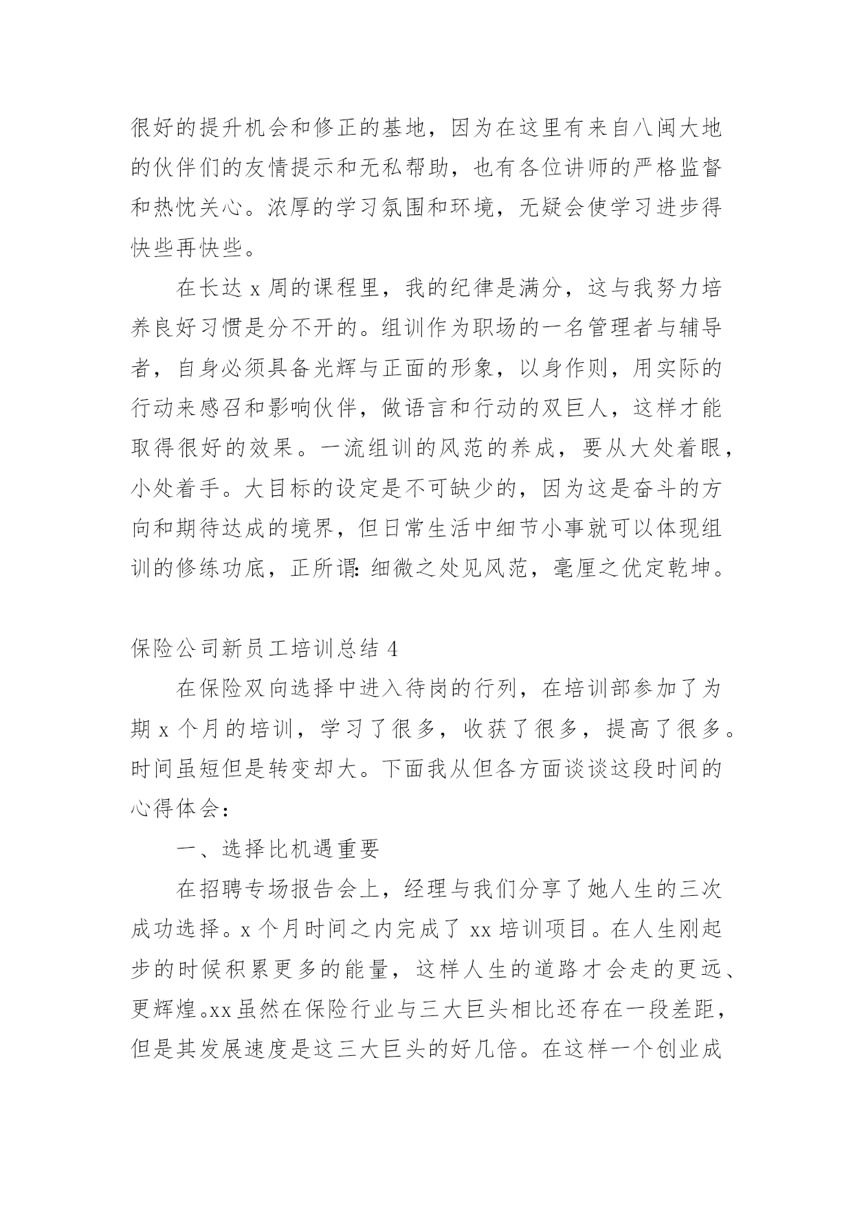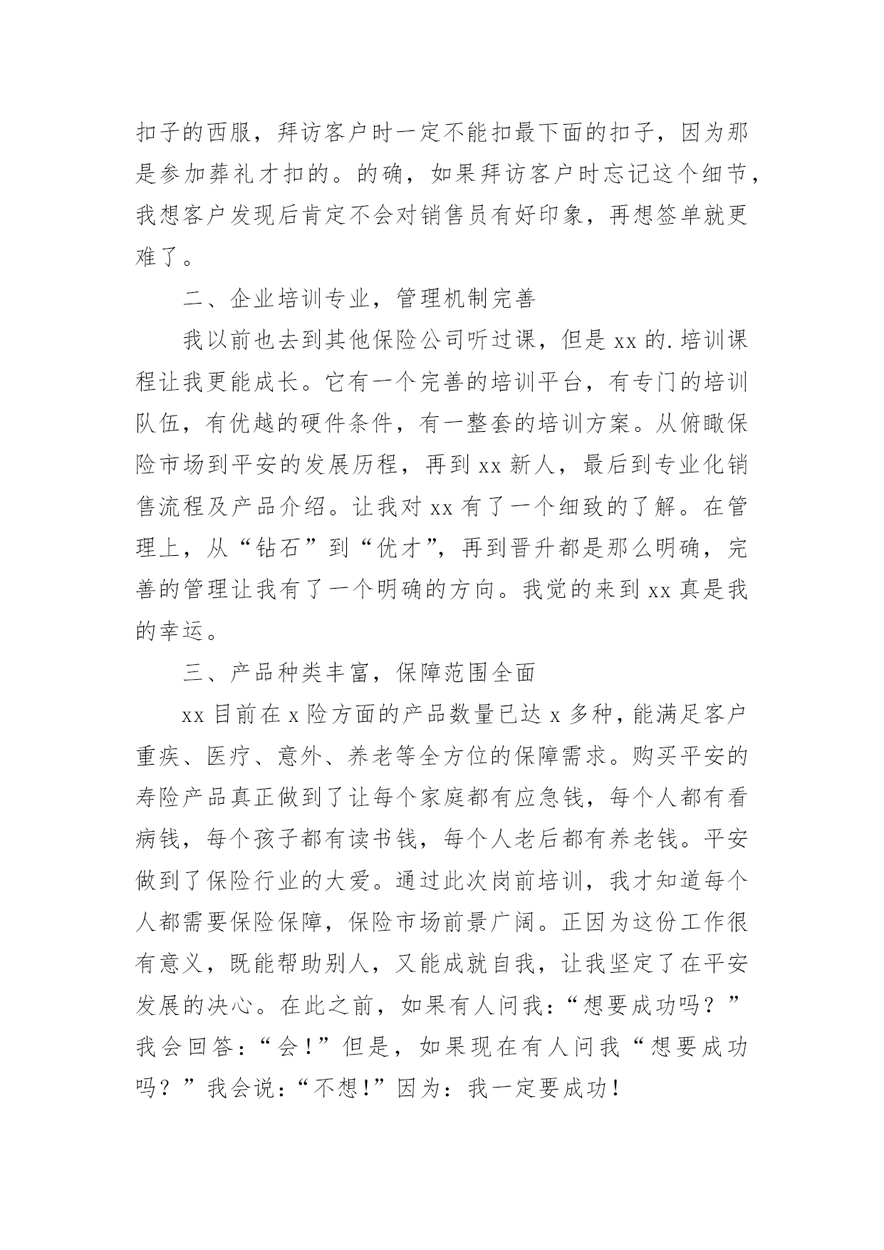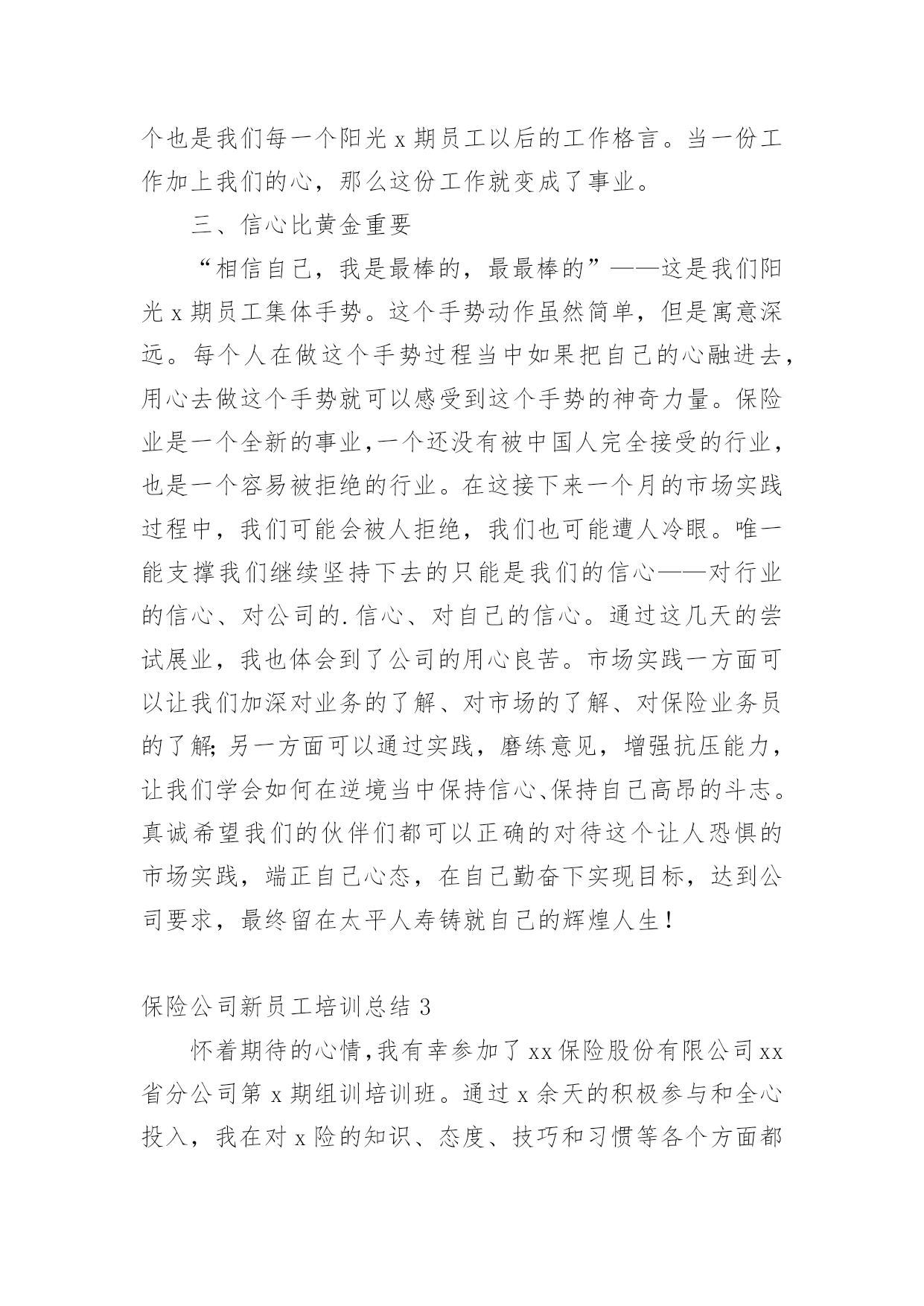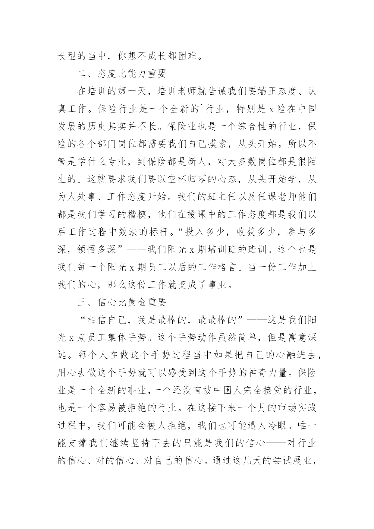 保险公司新员工培训总结总结在一个时期、一个年度、一个阶段对学习和工作生活等情况加以回顾和分析的一种书面材料,写总结有利于我们学习和工作能力的提高,因此我们需要回头归纳,写一份总结了。总结你想好怎么写了吗?下面是小编为大家整理的保险公司新员工培训总结,希望对大家有所帮助。保险公司新员工培训总结1一晃眼,为期x天的岗前培训便结束了。作为一名xx新人,我怀着新奇的心态参加了xx保险x月x期的新员工培训。参训后感慨良多,收获也颇丰,让我坚定了从事保险行业的决心。下面我就浅谈此次培训的收获:一、态度决定一切,细节决定成败第一堂课上,培训老师告诉我们一句话,那就是“不论你们从哪里来到平安,不管你们以前从事什么职业甚至担任任何职务,来到平安,你们就是新人,请怀着一颗空杯的心态进入学习!”我从事银行工作已经有x个年头,也销售了x年的分红保险,我以为我对保险的了解还不错,实际上大错特错。都说隔行如隔山,通过岗前学习,我发现我越学越觉得自己无知,很快,我摆正了心态进入学习。其次,培训老师们还给我们介绍了“四个习惯”,日积月累,可以让我们有更多的客户资源,为更好的业务发展打下坚实的基础。尤其是培训老师讲的一个西服穿着的注意事项:有两个或三个扣子的西服,拜访客户时一定不能扣最下面的扣子,因为那是参加葬礼才扣的。的确,如果拜访客户时忘记这个细节,我想客户发现后肯定不会对销售员有好印象,再想签单就更难了。二、企业培训专业,管理机制完善我以前也去到其他保险公司听过课,但是xx的.培训课程让我更能成长。它有一个完善的培训平台,有专门的培训队伍,有优越的硬件条件,有一整套的培训方案。从俯瞰保险市场到平安的发展历程,再到xx新人,最后到专业化销售流程及产品介绍。让我对xx有了一个细致的了解。在管理上,从“钻石”到“优才”,再到晋升都是那么明确,完善的管理让我有了一个明确的方向。我觉的来到xx真是我的幸运。三、产品种类丰富,保障范围全面xx目前在x险方面的产品数量已达x多种,能满足客户重疾、医疗、意外、养老等全方位的保障需求。购买平安的寿险产品真正做到了让每个家庭都有应急钱,每个人都有看病钱,每个孩子都有读书钱,每个人老后都有养老钱。平安做到了保险行业的大爱。通过此次岗前培训,我才知道每个人都需要保险保障,保险市场前景广阔。正因为这份工作很有意义,既能帮助别人,又能成就自我,让我坚定了在平安发展的决心。在此之前,如果有人问我:“想要成功吗?”我会回答:“会!”但是,如果现在有人问我“想要成功吗?”我会说:“不想!”因为:我一定要成功!保险公司新员工培训总结2在保险公司双向选择中进入待岗的行列,在培训部参加了为期x个月的培训,学习了很多,收获了很多,提高了很多。时间虽短但是转变却大。下面我从但各方面谈谈这段时间的心得体会:一、选择比机遇重要在招聘专场报告会上,经理与我们分享了她人生的三次成功选择。x个月时间之内独立完成了xx培训项目。在人生刚起步的时候积累更多的能量,这样人生的道路才会走的更远、更辉煌。xx虽然在保险行业与三大巨头相比还存在一段差距,但是其发展速度是这三大巨头的好几倍。在这样一个创业成长型的公司当中,你想不成长都困难。二、态度比能力重要在培训的第一天,培训老师就告诫我们要端正态度、认真工作。保险行业是一个全新的行业,特别是x险在中国发展的历史其实并不长。保险业也是一个综合性的行业,保险公司的各个部门岗位都需要我们自己摸索,从头开始。所以不管是学什么专业,到保险公司都是新人,对大多数岗位都是很陌生的。这就要求我们要以空杯归零的心态,从头开始学,从为人处事、工作态度开始。我们的班主任以及任课老师他们都是我们学习的楷模,他们在授课中的工作态度都是我们以后工作过程中效法的标杆。“投入多少,收获多少,参与多深,领悟多深”——我们阳光x期培训班的班训。这个也是我们每一个阳光x期员工以后的工作格言。当一份工作加上我们的心,那么这份工作就变成了事业。三、信心比黄金重要“相信自己,我是最棒的,最最棒的”——这是我们阳光x期员工集体手势。这个手势动作虽然简单,但是寓意深远。每个人在做这个手势过程当中如果把自己的心融进去,用心去做这个手势就可以感受到这个手势的神奇力量。保险业是一个全新的事业,一个还没有被中国人完全接受的行业,也是一个容易被拒绝的行业。在这接下来一个月的市场实践过程中,我们可能会被人拒绝,我们也可能遭人冷眼。唯一能支撑我们继续坚持下去的只能是我们的信心——对行业的信心、对公司的.信心、对自己的信心。通过这几天的尝试展业,我也体会到了公司的用心良苦。市场实践一方面可以让我们加深对业务的了解、对市场的了解、对保险业务员的了解;另一方面可以通过实践,磨练意见,增强抗压能力,让我们学会如何在逆境当中保持信心、保持自己高昂的斗志。真诚希望我们的伙伴们都可以正确的