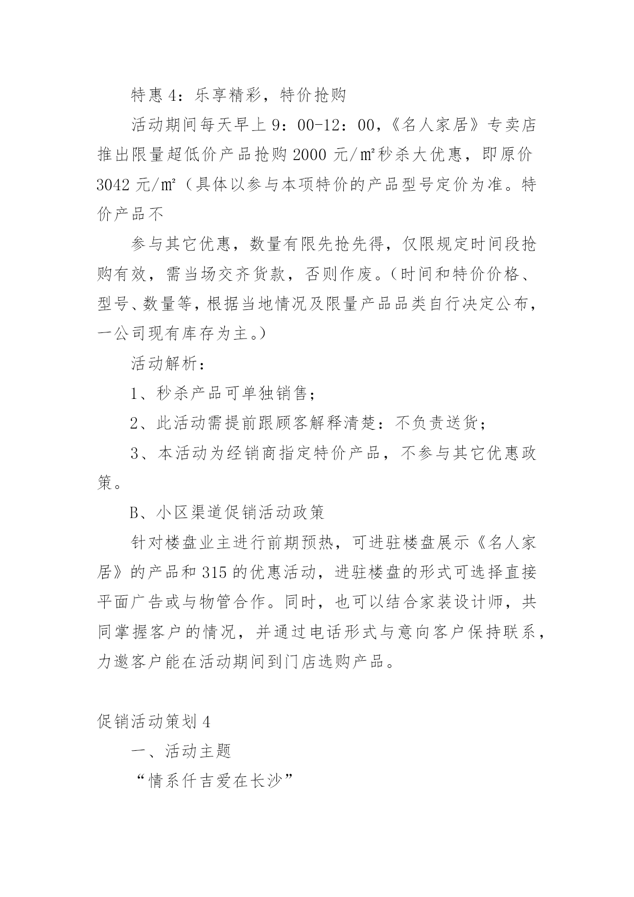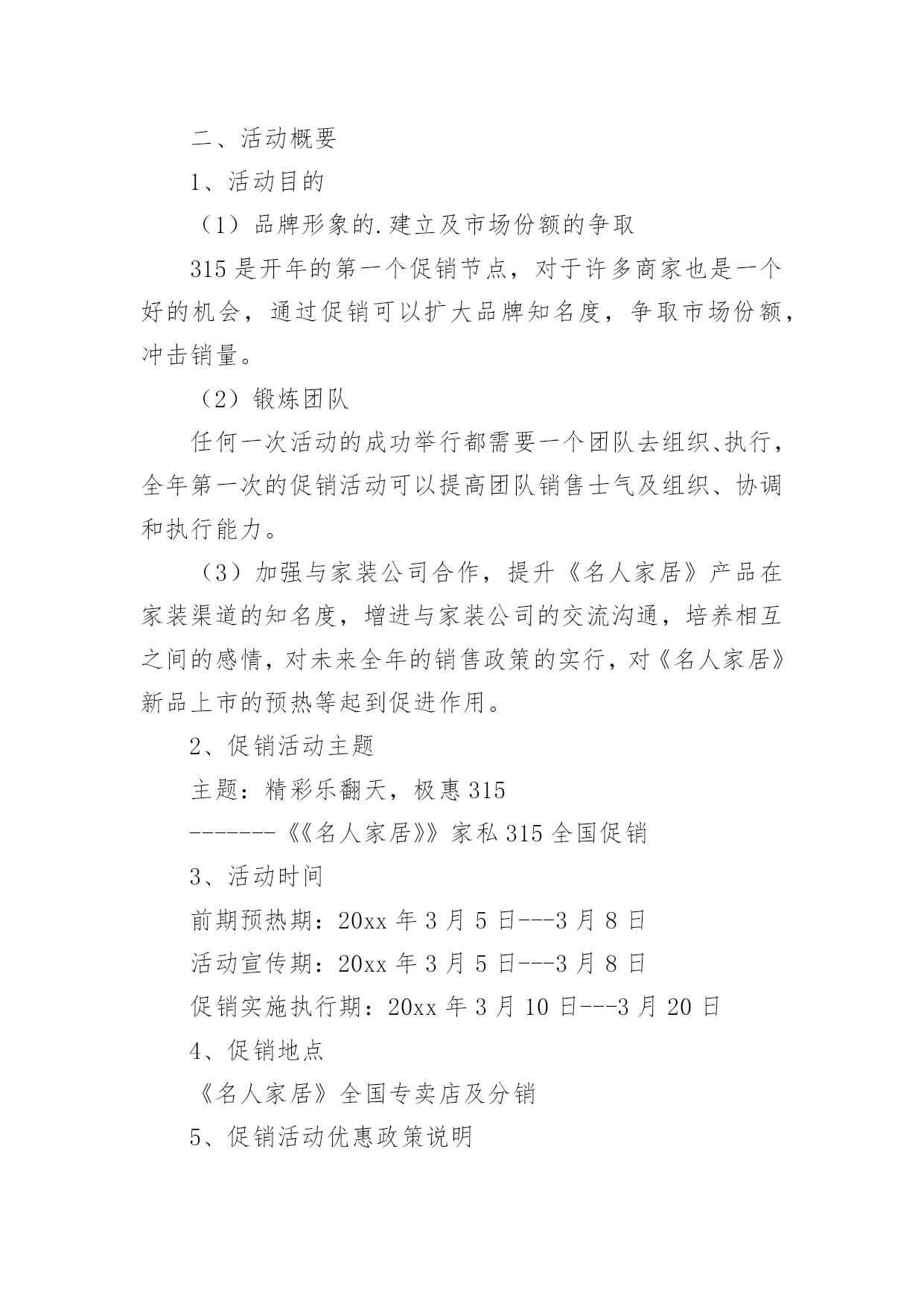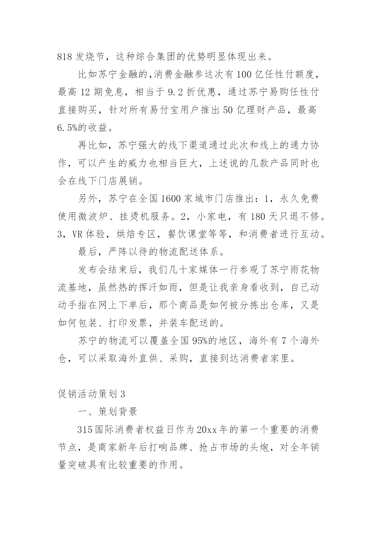 促销活动策划(热)促销活动策划促销活动策划1活动主题:活动主题:5600元套装组合家具一元秒杀活动口号:十一买家具就来x活动思路充分利用中秋节和国庆节两大契机,通过一元秒杀、特惠套装组合家具等促销手法,直接让利于消费者,从而提高产品销量及扩展x的品牌影响。活动时间:20xx年9月10日―20xx年10月5日活动地点:x路x城x家居自选商场活动内容:1、一元“秒杀”更劲爆!2、预订套装家具更惊喜!3、套装组合家具更超值!活动一“x?一元“秒杀”更劲爆”执行细则促销活动策划2在见识到造一个购物节的威力之后,友商京东于20xx年6月18日,也开始尝试此类模式。不同的是,京东每年都没有公布"618"具体的交易额。如何造一个购物节?以苏宁易购818发烧节为例从20xx年开始,苏宁易购也开始造购物节--苏宁易购818。20xx年7月26日,苏宁易购在总部召开新闻发布会,宣布"苏宁易购818发烧节-燃,就现在"启动,作为造节的后来者,今年苏宁易购818是如何操盘,有哪些亮点呢?宏民结合亲身体验做了如下整理。1,操盘者往年这个时候,苏宁控股集团董事长张近东都会站出来说几句:要发18亿红包!要力推发烧节!要要要~~今年则不同,张近东稳稳做起幕后军师,连新闻发布会都没有出席,全程由苏宁云商COO侯恩龙主讲。这应该是侯总担任COO的一年半以来,首次作为818发烧节的总控,苏宁内部起的职位是---818发烧节首席营销官。818发烧节发布会上的'侯恩龙2,庞大的朋友圈今年的苏宁易购818发烧节,在渠道商的广度上也是下足了功夫。比如,聚力传媒在此次发烧节上首次发布VR产品"聚·VR"一体机,销售价格为799元。家庭服务机器人品牌科沃斯,专门和苏宁合作定制一个专用产品——绝尘扫地机器人。看名字也知道,匠Japan株式会社是一家日本企业,主要致力于日本传统文化匠人,和匠人商品对全球分享的市场开拓,这次为了助力此次苏宁818发烧节,特意从东京赶过来。感动~~此次提供了日本刀(厨房用的那种)、板本龙马酒、瓷器钢笔、红酒杯等等。苏州虎丘婚纱总经理顾伟春,他说国内70%的婚纱礼服都是他们做的,哈哈哈哈,他们和苏宁的合作计划是:虎丘婚纱频道8月9日就会在苏宁的平台上上线。还有很多产品,具体有多少,看这张图。3,新潮的玩法把商品准备好,消费者还不一定来购买,为了极大的带动消费,苏宁易购在营销推广上尝试了许多新潮的玩法,比如直播。请818位网红到全球原产地去直播,再发出去8.18亿元红包。如何造一个购物节?以苏宁易购818发烧节为例苏宁的此次直播不是在哪些花椒、映客等直播平台上,而是苏宁自己的直播平台,预计1000万人次的流量还是自己的,机智!4,强大的整合能力。众所周知,苏宁最近几年频频出手,通过新成立、投资、并购等方法,已经成为一个名副其实的多元化集团。在此次818发烧节,这种综合集团的优势明显体现出来。比如苏宁金融的,消费金融参这次有100亿任性付额度,最高12期免息,相当于9.2折优惠,通过苏宁易购任性付直接购买,针对所有易付宝用户推出50亿理财产品,最高6.5%的收益。再比如,苏宁强大的线下渠道通过此次和线上的通力协作,可以产生的威力也相当巨大,上述说的几款产品同时也会在线下门店展销。另外,苏宁在全国1600家城市门店推出:1,永久免费使用微波炉、挂烫机服务。2,小家电,有180天只退不修。3,VR体验,烘焙专区,餐饮课堂等等,和消费者进行互动。最后,严阵以待的物流配送体系。发布会结束后,我们几十家媒体一行参观了苏宁雨花物流基地,虽然热的挥汗如雨,但是让我亲身看收到,自己动动手指在网上下单后,那个商品是如何被分拣出仓库,又是如何包装、打印发票,并装车配送的。苏宁的物流可以覆盖全国95%的地区,海外有7个海外仓,可以采取海外直供、采购,直接到达消费者家里。促销活动策划3一、策划背景315国际消费者权益日作为20xx年的第一个重要的消费节点,是商家新年后打响品牌、抢占市场的头炮,对全年销量突破具有比较重要的作用。二、活动概要1、活动目的(1)品牌形象的.建立及市场份额的争取315是开年的第一个促销节点,对于许多商家也是一个好的机会,通过促销可以扩大品牌知名度,争取市场份额,冲击销量。(2)锻炼团队任何一次活动的成功举行都需要一个团队去组织、执行,全年第一次的促销活动可以提高团队销售士气及组织、协调和执行能力。(3)加强与家装公司合作,提升《名人家居》产品在家装渠道的知名度,增进与家装公司的交流沟通,培养相互之间的感情,对未来全年的销售政策的实行,对《名人家居》新品上市的预热等起到促进作用。2、促销活动主题主题:精彩乐翻天,极惠315-------《《名人家居》》家私315全国促销3、活动时间前期预热期:20xx年3月5日---3月8日活动宣传期:20xx年3月5