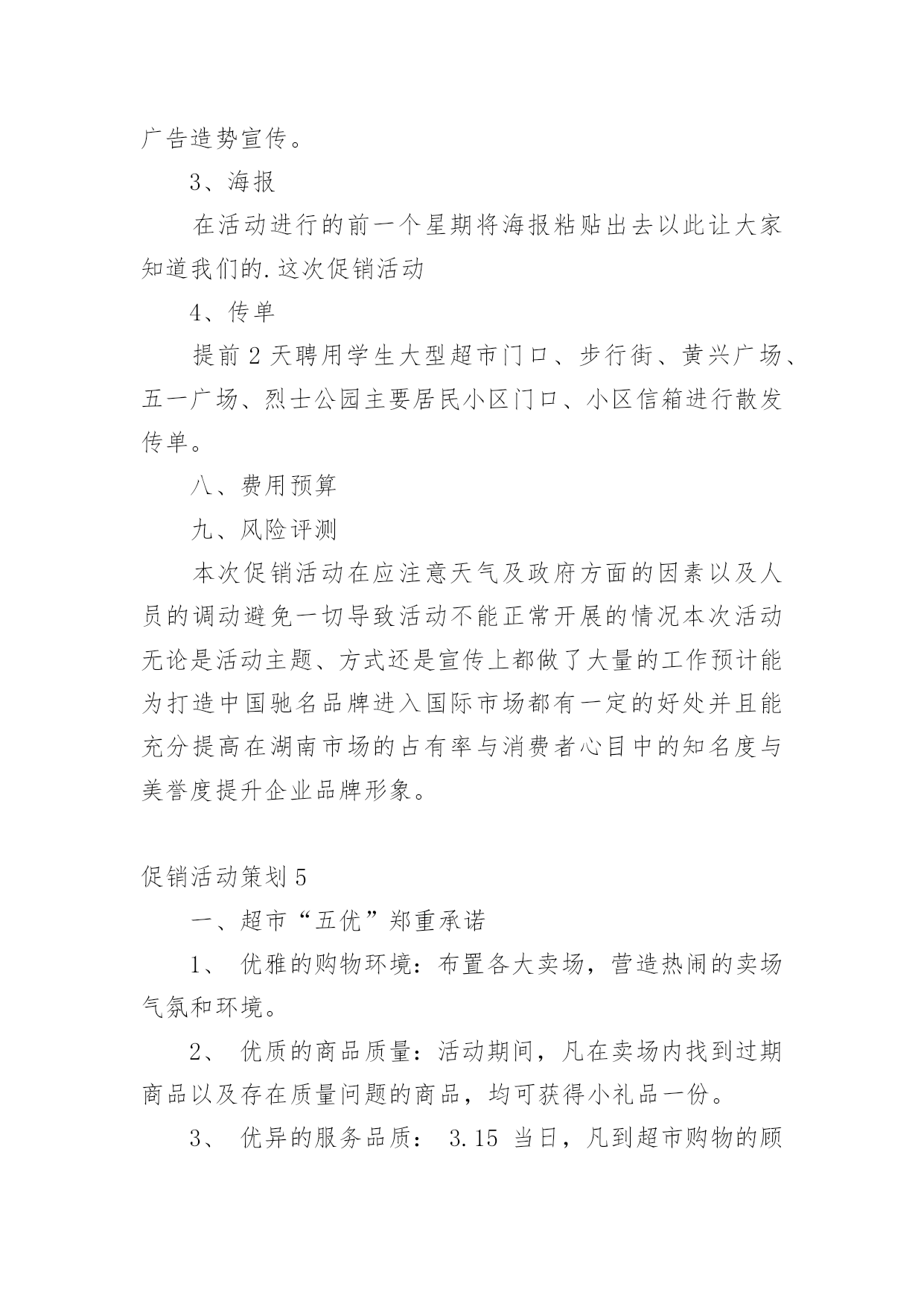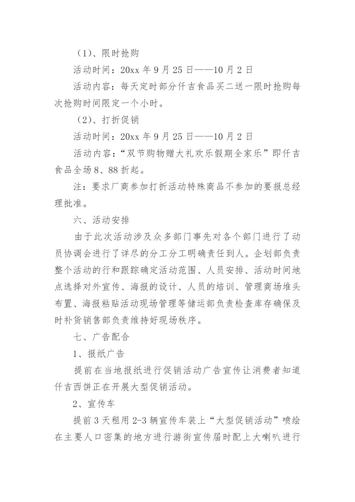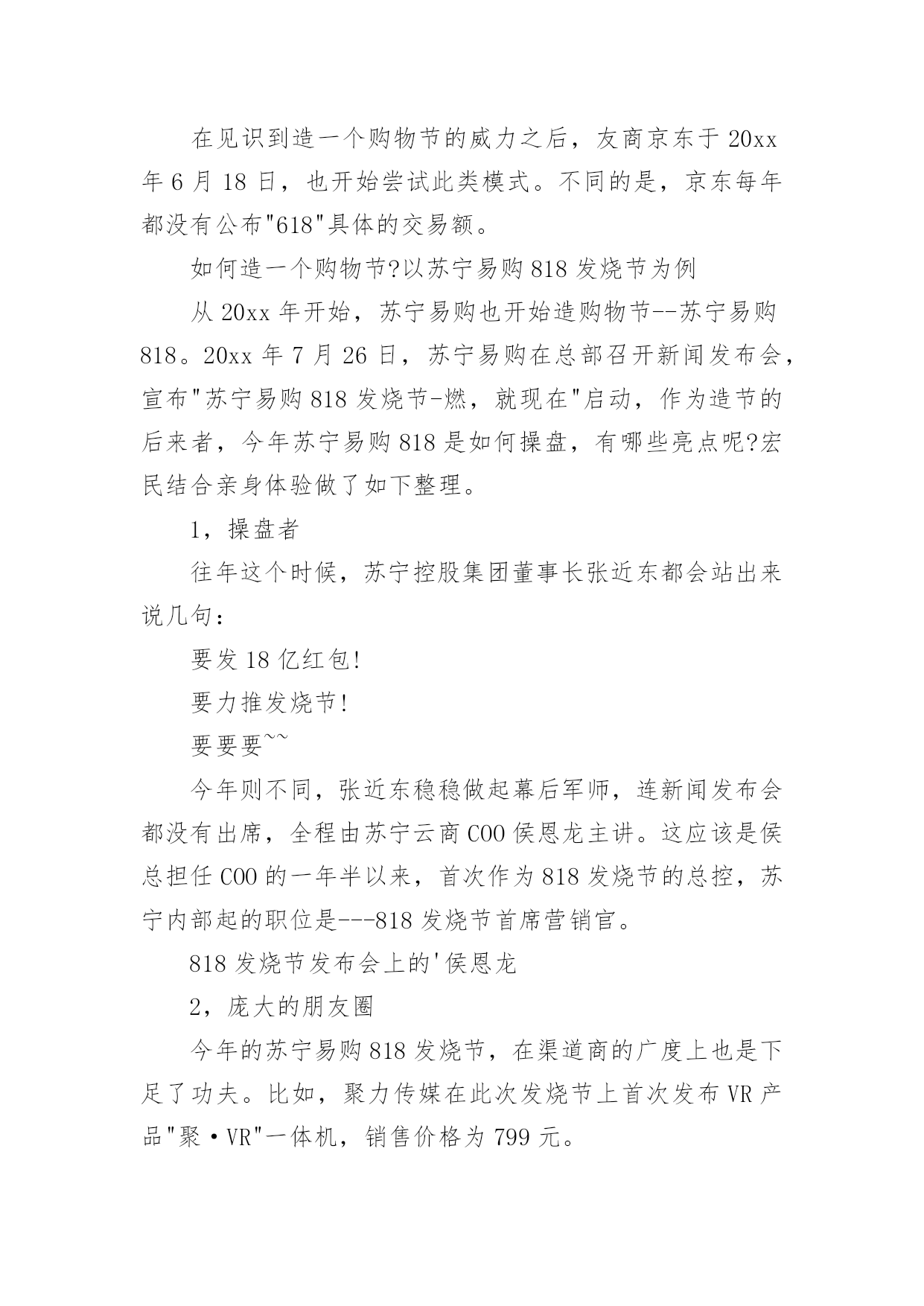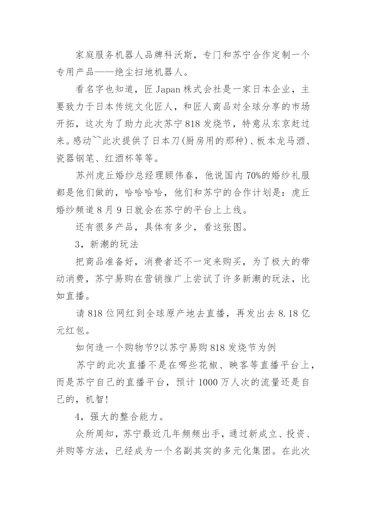 促销活动策划(热)促销活动策划促销活动策划1活动主题:活动主题:5600元套装组合家具一元秒杀活动口号:十一买家具就来x活动思路充分利用中秋节和国庆节两大契机,通过一元秒杀、特惠套装组合家具等促销手法,直接让利于消费者,从而提高产品销量及扩展x的品牌影响。活动时间:20xx年9月10日―20xx年10月5日活动地点:x路x城x家居自选商场活动内容:1、一元“秒杀”更劲爆!2、预订套装家具更惊喜!3、套装组合家具更超值!活动一“x?一元“秒杀”更劲爆”执行细则促销活动策划2在见识到造一个购物节的威力之后,友商京东于20xx年6月18日,也开始尝试此类模式。不同的是,京东每年都没有公布"618"具体的交易额。如何造一个购物节?以苏宁易购818发烧节为例从20xx年开始,苏宁易购也开始造购物节--苏宁易购818。20xx年7月26日,苏宁易购在总部召开新闻发布会,宣布"苏宁易购818发烧节-燃,就现在"启动,作为造节的后来者,今年苏宁易购818是如何操盘,有哪些亮点呢?宏民结合亲身体验做了如下整理。1,操盘者往年这个时候,苏宁控股集团董事长张近东都会站出来说几句:要发18亿红包!要力推发烧节!要要要~~今年则不同,张近东稳稳做起幕后军师,连新闻发布会都没有出席,全程由苏宁云商COO侯恩龙主讲。这应该是侯总担任COO的一年半以来,首次作为818发烧节的总控,苏宁内部起的职位是---818发烧节首席营销官。818发烧节发布会上的'侯恩龙2,庞大的朋友圈今年的苏宁易购818发烧节,在渠道商的广度上也是下足了功夫。比如,聚力传媒在此次发烧节上首次发布VR产品"聚·VR"一体机,销售价格为799元。家庭服务机器人品牌科沃斯,专门和苏宁合作定制一个专用产品——绝尘扫地机器人。看名字也知道,匠Japan株式会社是一家日本企业,主要致力于日本传统文化匠人,和匠人商品对全球分享的市场开拓,这次为了助力此次苏宁818发烧节,特意从东京赶过来。感动~~此次提供了日本刀(厨房用的那种)、板本龙马酒、瓷器钢笔、红酒杯等等。苏州虎丘婚纱总经理顾伟春,他说国内70%的婚纱礼服都是他们做的,哈哈哈哈,他们和苏宁的合作计划是:虎丘婚纱频道8月9日就会在苏宁的平台上上线。还有很多产品,具体有多少,看这张图。3,新潮的玩法把商品准备好,消费者还不一定来购买,为了极大的带动消费,苏宁易购在营销推广上尝试了许多新潮的玩法,比如直播。请818位网红到全球原产地去直播,再发出去8.18亿元红包。如何造一个购物节?以苏宁易购818发烧节为例苏宁的此次直播不是在哪些花椒、映客等直播平台上,而是苏宁自己的直播平台,预计1000万人次的流量还是自己的,机智!4,强大的整合能力。众所周知,苏宁最近几年频频出手,通过新成立、投资、并购等方法,已经成为一个名副其实的多元化集团。在此次818发烧节,这种综合集团的优势明显体现出来。比如苏宁金融的,消费金融参这次有100亿任性付额度,最高12期免息,相当于9.2折优惠,通过苏宁易购任性付直接购买,针对所有易付宝用户推出50亿理财产品,最高6.5%的收益。再比如,苏宁强大的线下渠道通过此次和线上的通力协作,可以产生的威力也相当巨大,上述说的几款产品同时也会在线下门店展销。另外,苏宁在全国1600家城市门店推出:1,永久免费使用微波炉、挂烫机服务。2,小家电,有180天只退不修。3,VR体验,烘焙专区,餐饮课堂等等,和消费者进行互动。最后,严阵以待的物流配送体系。发布会结束后,我们几十家媒体一行参观了苏宁雨花物流基地,虽然热的挥汗如雨,但是让我亲身看收到,自己动动手指在网上下单后,那个商品是如何被分拣出仓库,又是如何包装、打印发票,并装车配送的。苏宁的物流可以覆盖全国95%的地区,海外有7个海外仓,可以采取海外直供、采购,直接到达消费者家里。促销活动策划3一、策划背景315国际消费者权益日作为20xx年的第一个重要的消费节点,是商家新年后打响品牌、抢占市场的头炮,对全年销量突破具有比较重要的作用。二、活动概要1、活动目的(1)品牌形象的.建立及市场份额的争取315是开年的第一个促销节点,对于许多商家也是一个好的机会,通过促销可以扩大品牌知名度,争取市场份额,冲击销量。(2)锻炼团队任何一次活动的成功举行都需要一个团队去组织、执行,全年第一次的促销活动可以提高团队销售士气及组织、协调和执行能力。(3)加强与家装公司合作,提升《名人家居》产品在家装渠道的知名度,增进与家装公司的交流沟通,培养相互之间的感情,对未来全年的销售政策的实行,对《名人家居》新品上市的预热等起到促进作用。2、促销活动主题主题:精彩乐翻天,极惠315-------《《名人家居》》家私315全国促销3、活动时间前期预热期:20xx年3月5日---3月8日活动宣传期:20xx年3月5