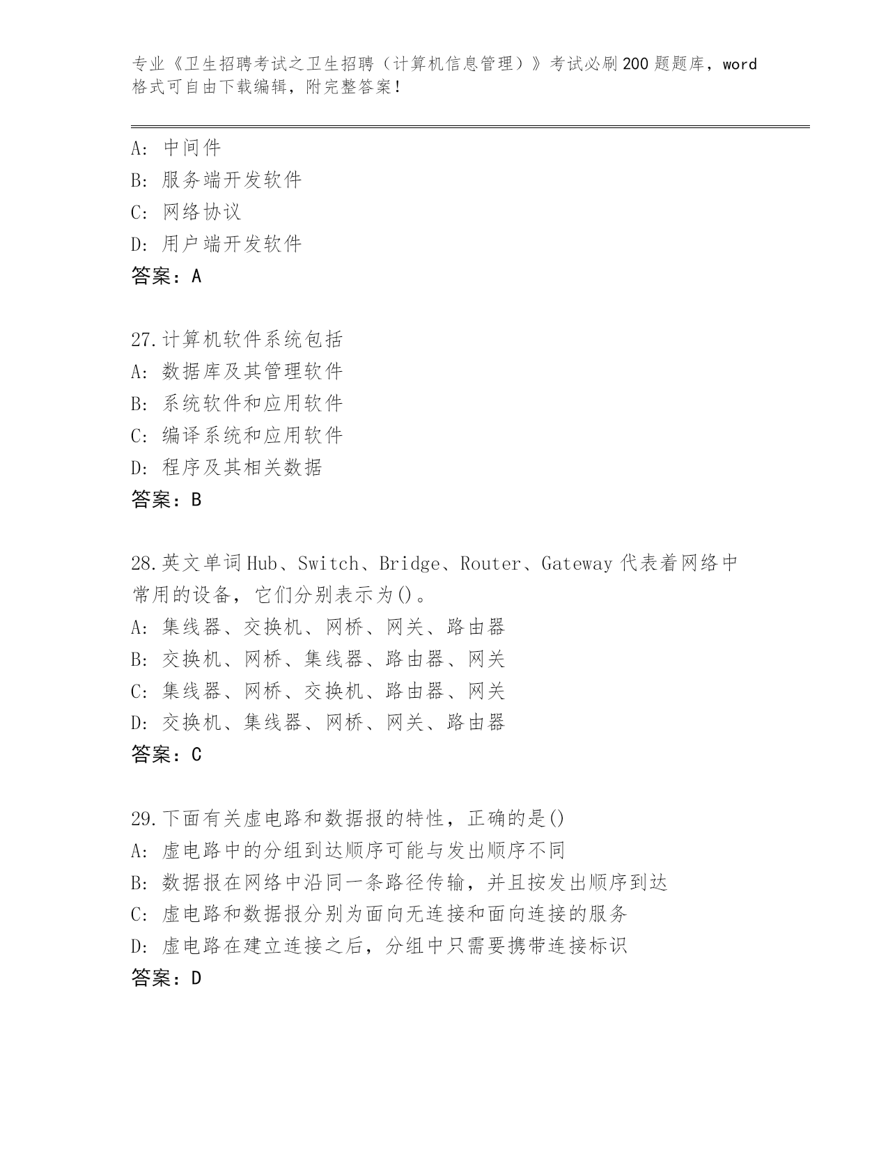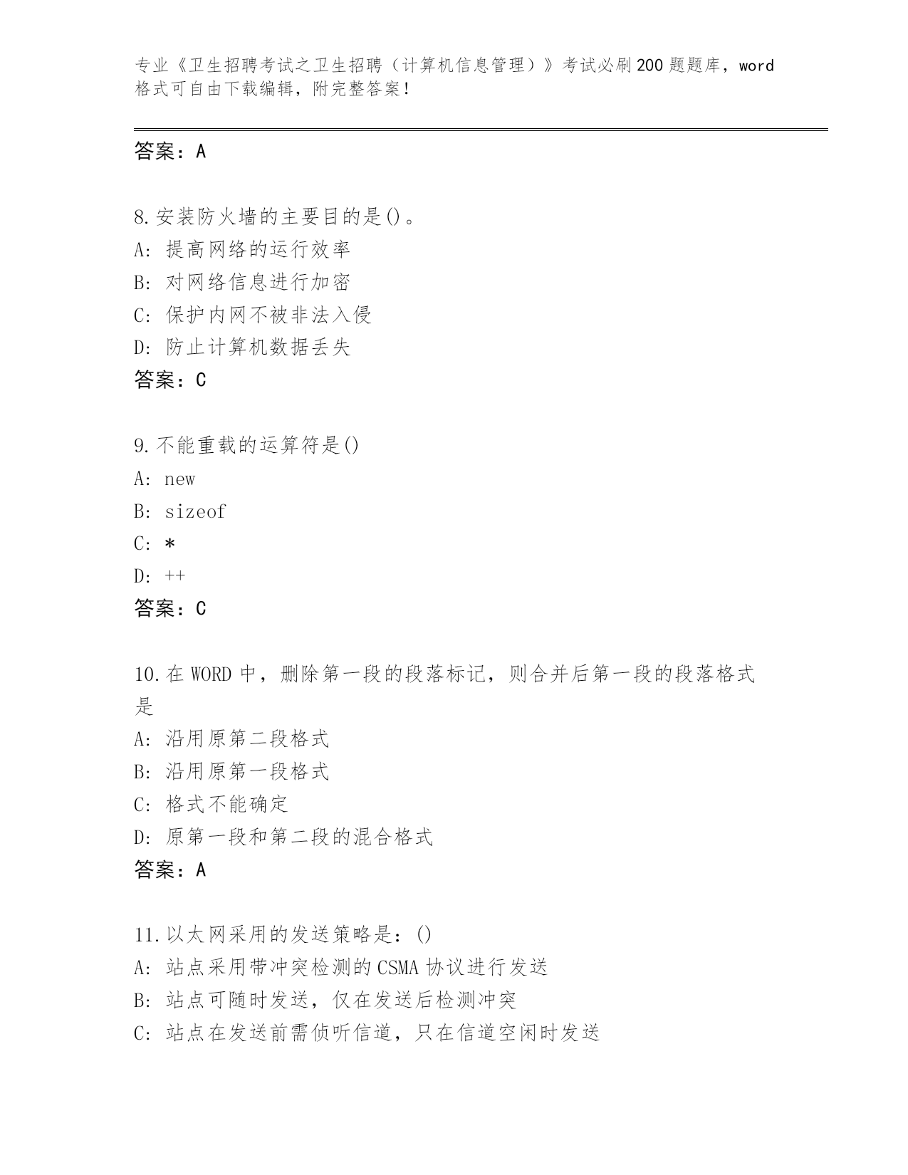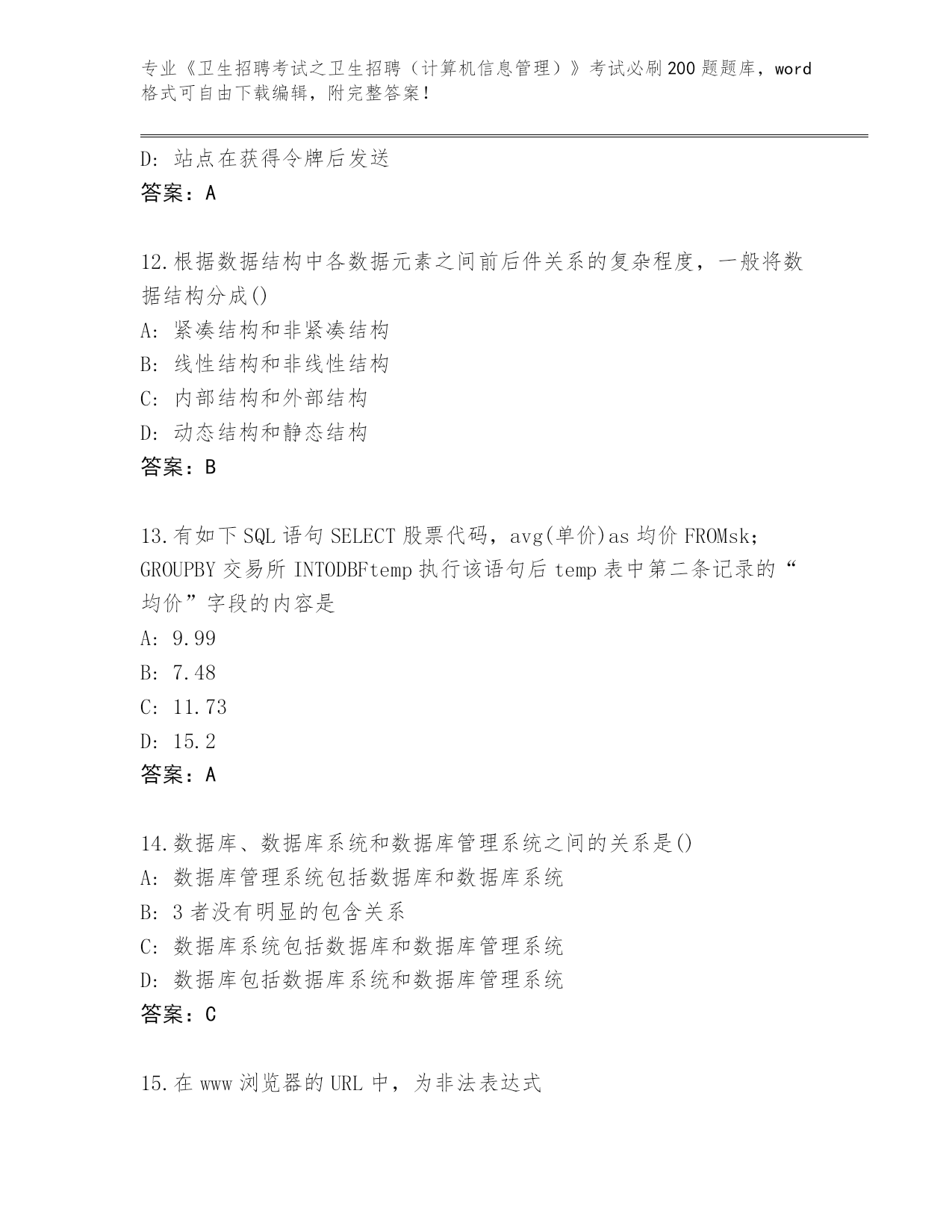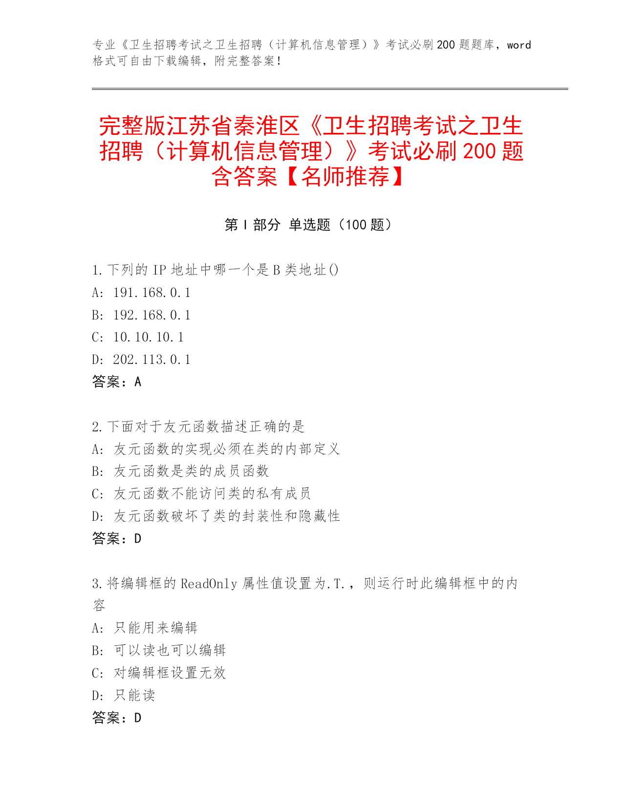 完整版江苏省秦淮区《卫生招聘考试之卫生招聘(计算机信息管理)》考试必刷200题含答案【名师推荐】