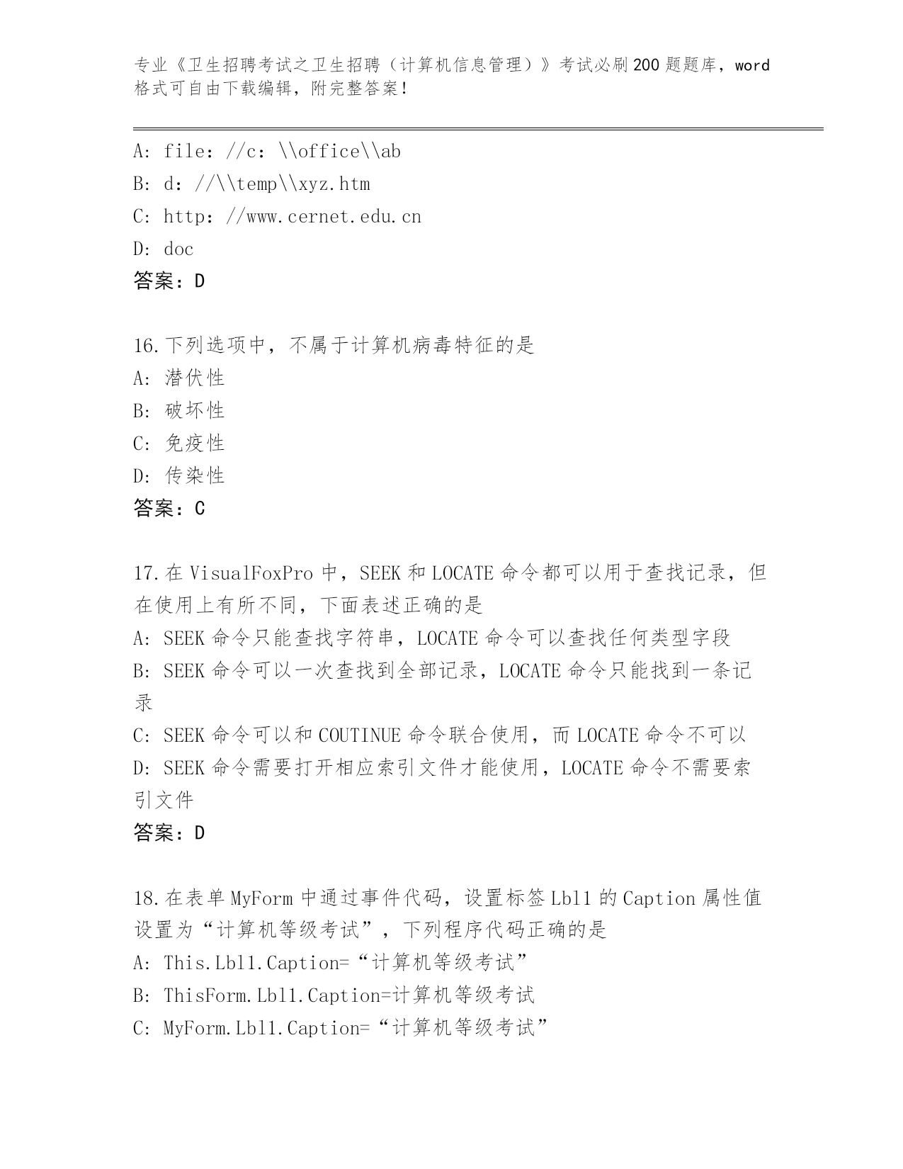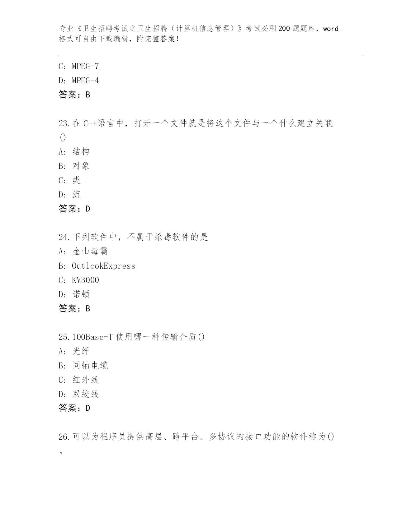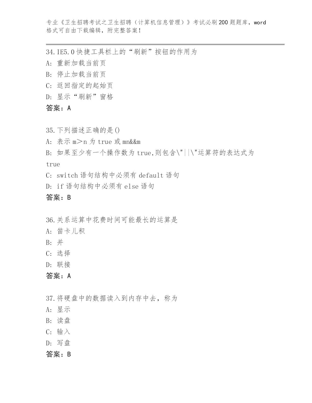 江苏省历年《卫生招聘考试之卫生招聘(计算机信息管理)》考试必刷200题及参考答案(名师推荐)