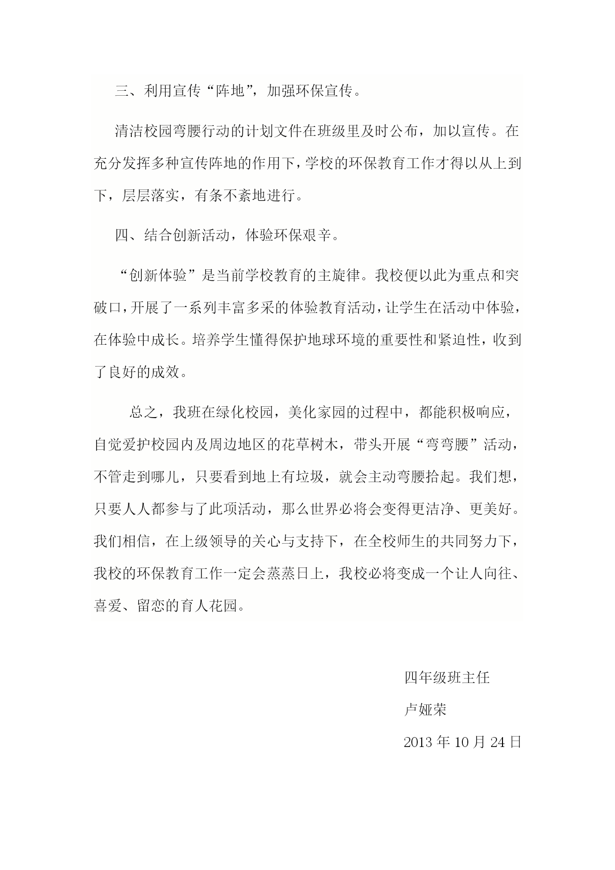四年级“清洁校园,弯弯腰”活动总结这一学期,我校在上级主管部门的领导下,发挥课堂环境教育主渠道的作用;以建设资源节约型、环境友好型社会为目标,引导师生参与环境保护和可持续发展的自觉行动。团结一致,开拓进取,以积极的态度和饱满的热情投入到学校环保教育工作中去,使学校的各项工作均得以顺利开展,并收到较好的效果。一、制定环保计划,明确工作方向。校园的弯腰活动是环保教育工作的实践行动,又是一项影响力较大的工作。学校本来就是一方净土,是育人的场所,环境的好坏必将影响到学校教育工作的顺利开展,然而要使其井然有序地进行,当然要制定一套科学合理的工作计划。我们就根据上级的指导思想,结合本校的实际情况,明确了方向,而且理清了思路。因此,各项教育活动开展得有条不紊、丰富多彩,不但活跃了学生的身心,而且增强了学生的环保意识,收得了寓教于乐的效果。二、建立环保组织,强化环保意识。要加强校园环境保护管理,靠一个人是不行的,只有健全了组织,才能使工作得以层层开展。老师和学生以身作则,每天都要对全校师生进行文明、卫生的保护。还要根据弯腰行动情况评选“文明卫士”。这样,不但潜移默化地加强了学生的环保意识,而且使学生养成了良好的行为习惯,促进了素质教育的发展。三、利用宣传“阵地”,加强环保宣传。清洁校园弯腰行动的计划文件在班级里及时公布,加以宣传。在充分发挥多种宣传阵地的作用下,学校的环保教育工作才得以从上到下,层层落实,有条不紊地进行。四、结合创新活动,体验环保艰辛。“创新体验”是当前学校教育的主旋律。我校便以此为重点和突破口,开展了一系列丰富多采的体验教育活动,让学生在活动中体验,在体验中成长。培养学生懂得保护地球环境的重要性和紧迫性,收到了良好的成效。总之,我班在绿化校园,美化家园的过程中,都能积极响应,自觉爱护校园内及周边地区的花草树木,带头开展“弯弯腰”活动,不管走到哪儿,只要看到地上有垃圾,就会主动弯腰拾起。我们想,只要人人都参与了此项活动,那么世界必将会变得更洁净、更美好。我们相信,在上级领导的关心与支持下,在全校师生的共同努力下,我校的环保教育工作一定会蒸蒸日上,我校必将变成一个让人向往、喜爱、留恋的育人花园。四年级班主任卢娅荣2013年10月24日