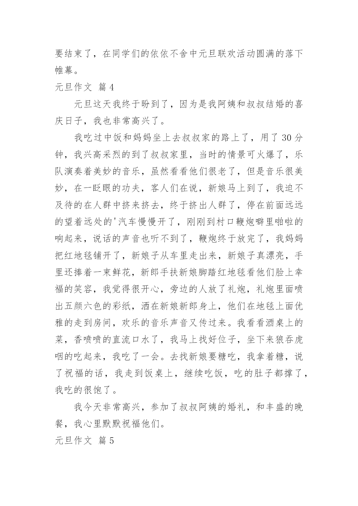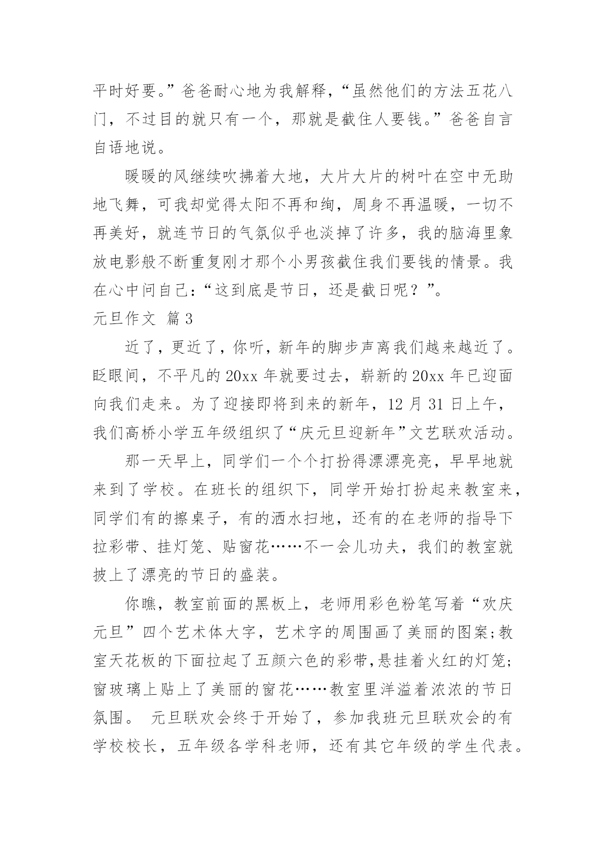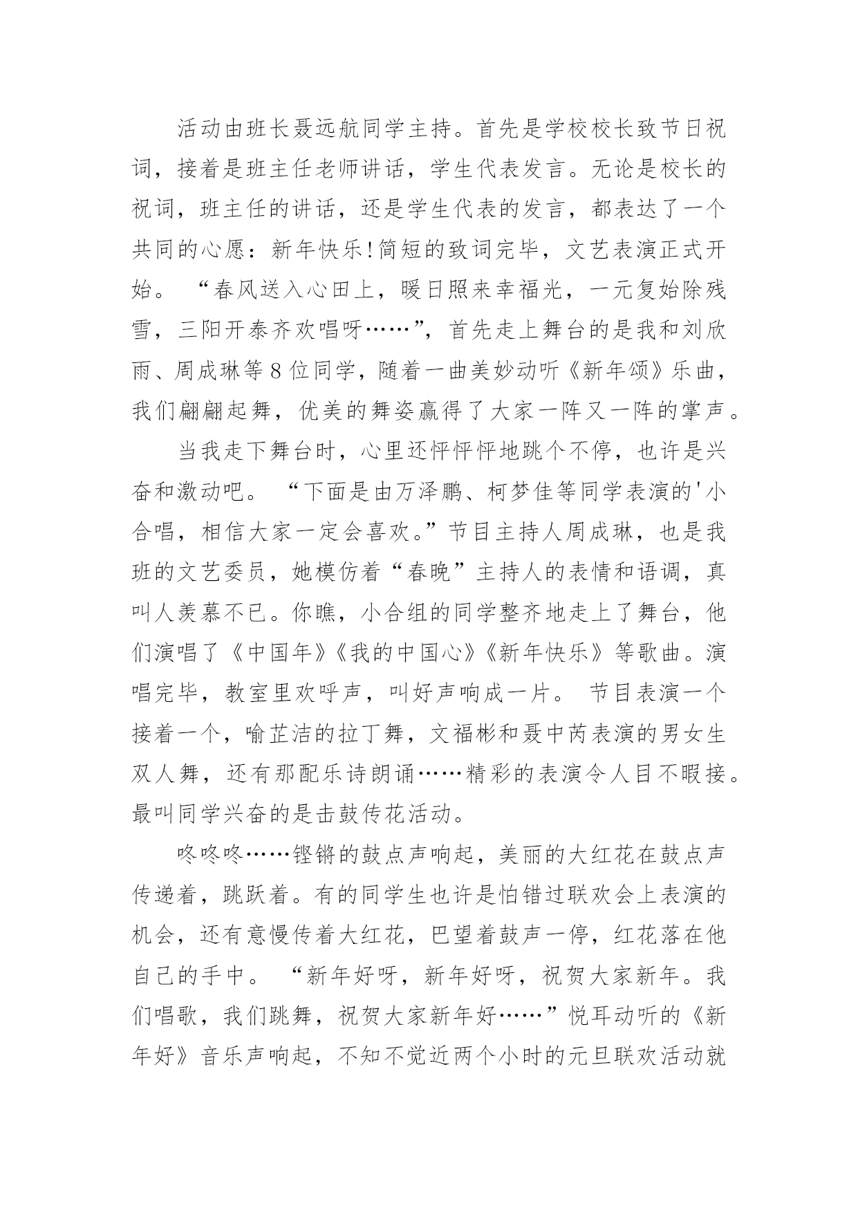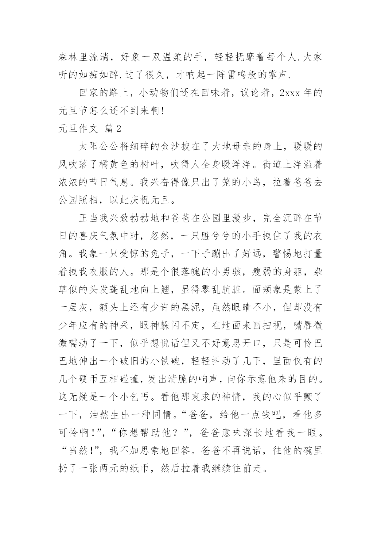 元旦作文(经典)实用的元旦作文在学习、工作乃至生活中,大家最不陌生的就是作文了吧,借助作文人们可以实现文化交流的目的。那么问题来了,到底应如何写一篇优秀的作文呢?下面是小编精心整理的元旦作文8篇,仅供参考,大家一起来看看吧。元旦作文篇1今天,在美丽可爱的大森林里,动物们举行了一场别开生面的联欢会.舞台就设在一棵老松树的下面.瞧!主持人山羊先生穿着帅气的燕尾服出场了:“2xxx年元旦联欢会咩__正式开始咩__!“舞台上的幕布拉开了,几头狮子手拉着手走上台来,随着音乐的响起,狮子们跳起欢快的伦巴舞.看那只最小的`狮子,也许是第一次参加吧,显得格外兴奋,也跳得格外起劲.金黄的头发随着舞蹈的动作也有节奏的舞动.突然,那只小狮子不知怎么滑倒了,躺在地上,手脚还在伴着音乐舞动,那又滑稽又可爱的样子,逗得大家哈哈大笑.接下来又表演了许多节目,都非常精彩,大家都看得眼花缭乱.山羊先生又走上台来:“请欣赏最后一个节目:笛子独奏.表演者:小兔白白.“白白走上台,把笛子放在嘴边吹着,一首悠扬的曲子在森林里流淌,好象一双温柔的手,轻轻抚摩着每个人.大家听的如痴如醉.过了很久,才响起一阵雷鸣般的掌声.回家的路上,小动物们还在回味着,议论着,2xxx年的元旦节怎么还不到来啊!元旦作文篇2太阳公公将细碎的金沙披在了大地母亲的身上,暖暖的风吹落了橘黄色的树叶,吹得人全身暖洋洋。街道上洋溢着浓浓的节日气息。我兴奋得像只出了笼的小鸟,拉着爸爸去公园照相,以此庆祝元旦。正当我兴致勃勃地和爸爸在公园里漫步,完全沉醉在节日的喜庆气氛中时,忽然,一只脏兮兮的小手拽住了我的衣角。我象一只受惊的兔子,一下子蹦出了好远,警惕地打量着拽我衣服的人。那是个很落魄的小男骇,瘦弱的身躯,杂草似的头发蓬乱地向上翘,显得零乱肮脏。面颊象是蒙上了一层灰,额头上还有少许的黑泥,虽然眼睛不小,但却没有少年应有的神采,眼神躲闪不定,在地面来回扫视,嘴唇微微嚅动了一下,似乎想说话但又不好意思开口,只是可怜巴巴地伸出一个破旧的小铁碗,轻轻抖动了几下,里面仅有的几个硬币互相碰撞,发出清脆的响声,向你示意他来的目的。这无疑是一个小乞丐。看他那哀求的神情,我的心似乎颤了一下,油然生出一种同情。“爸爸,给他一点钱吧,看他多可怜啊!”,“你想帮助他?”,爸爸意味深长地看我一眼。“当然!”,我不加思索地回答。爸爸不再说话,往他的碗里扔了一张两元的纸币,然后拉着我继续往前走。“先生,等等,再给一点吧”。令我惊讶的话语出自刚才那个“可怜”的小男孩的口中,此时他一扫刚才的羞涩,竟拦在我们的面前,用可怜的目光注视着我们,可我却从他的目光中看出一丝贪婪。“这到底是怎么回事?”,我的脑海中冒出无数个小问号,而爸爸象是什么都没有看见似的想绕道而行,可那个小男孩却死皮赖脸地挡在我们面前,一副不给钱就别想走的模样。“天啊,这个比我还小的.乞丐怎么现在变成一副抢劫犯的模样?”,看到这种状况,我一下蒙住了,求救似地望向爸爸。“我们已经没有多余的钱给你了,不要挡道!”爸爸用慍怒的语气说,两道眉毛也“系”成了一个“疙瘩”。那个小男孩见这里已经要不到“油水”,便悻悻地离开。“爸爸,您平时不是还教我要乐于助人吗?为什么对那个小男孩那么凶?”我不解地问。“孩子,我们要帮助那些实际有困难的人。”爸爸慈祥地抚摸着我的小脑袋。“乞丐他虽然也有经济困难,可刚才那个小男孩,是属于骗吃骗喝的那种。对那种人,没必要心软,知道吗?否则他的胃口会越来越大的。”听完爸爸的话,我的心象是突然坠入了冰窟窿,有说不出的难受,不知是为他们感到悲哀,还是……。“原来社会上也有这种人啊!”,我暗想。我四处张望了一下,真是不看不知道,一看吓一跳,躺着的、跪着的、拖着别人的,“乞丐还真是‘种类繁多’啊!”,想到这里,我不由自主地苦笑了一下,“为什么节日一到,乞丐们也‘活跃’起来了呢?”,我好奇地问爸爸,“因为现在上街的人多啊,要钱比平时好要。”爸爸耐心地为我解释,“虽然他们的方法五花八门,不过目的就只有一个,那就是截住人要钱。”爸爸自言自语地说。暖暖的风继续吹拂着大地,大片大片的树叶在空中无助地飞舞,可我却觉得太阳不再和绚,周身不再温暖,一切不再美好,就连节日的气氛似乎也淡掉了许多,我的脑海里象放电影般不断重复刚才那个小男孩截住我们要钱的情景。我在心中问自己:“这到底是节日,还是截日呢?”。元旦作文篇3近了,更近了,你听,新年的脚步声离我们越来越近了。眨眼间,不平凡的20xx年就要过去,崭新的20xx年已迎面向我们走来。为了迎接即将到来的新年,12月31日上午,我们高桥小学五年级组织了“庆元旦迎新年”文艺联欢活动。那一天早上,同学们一个个打扮得漂漂亮亮,早早地就来到了学校。在班长的组织下,同学开始打扮起来教室来,同学们有的擦桌子,有的洒水扫地,还有的在老师的指导下拉彩带、挂