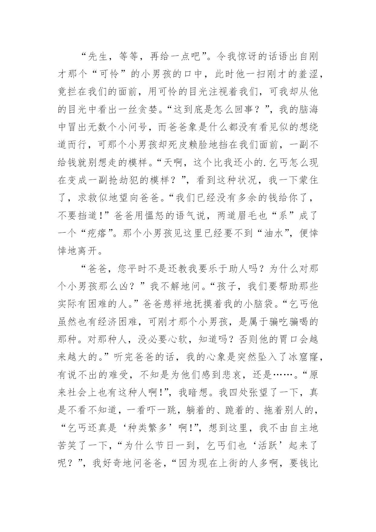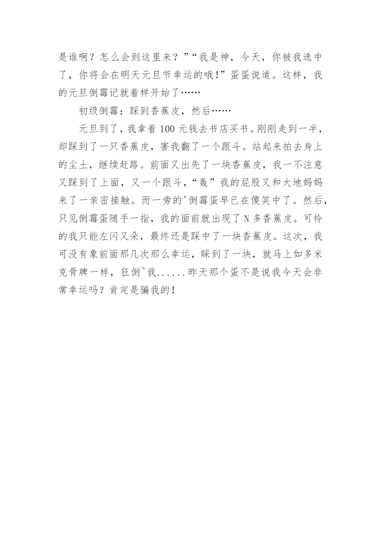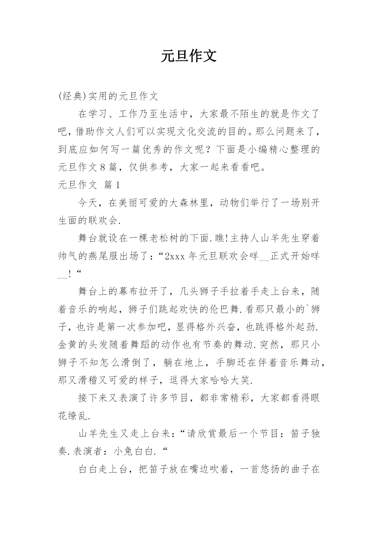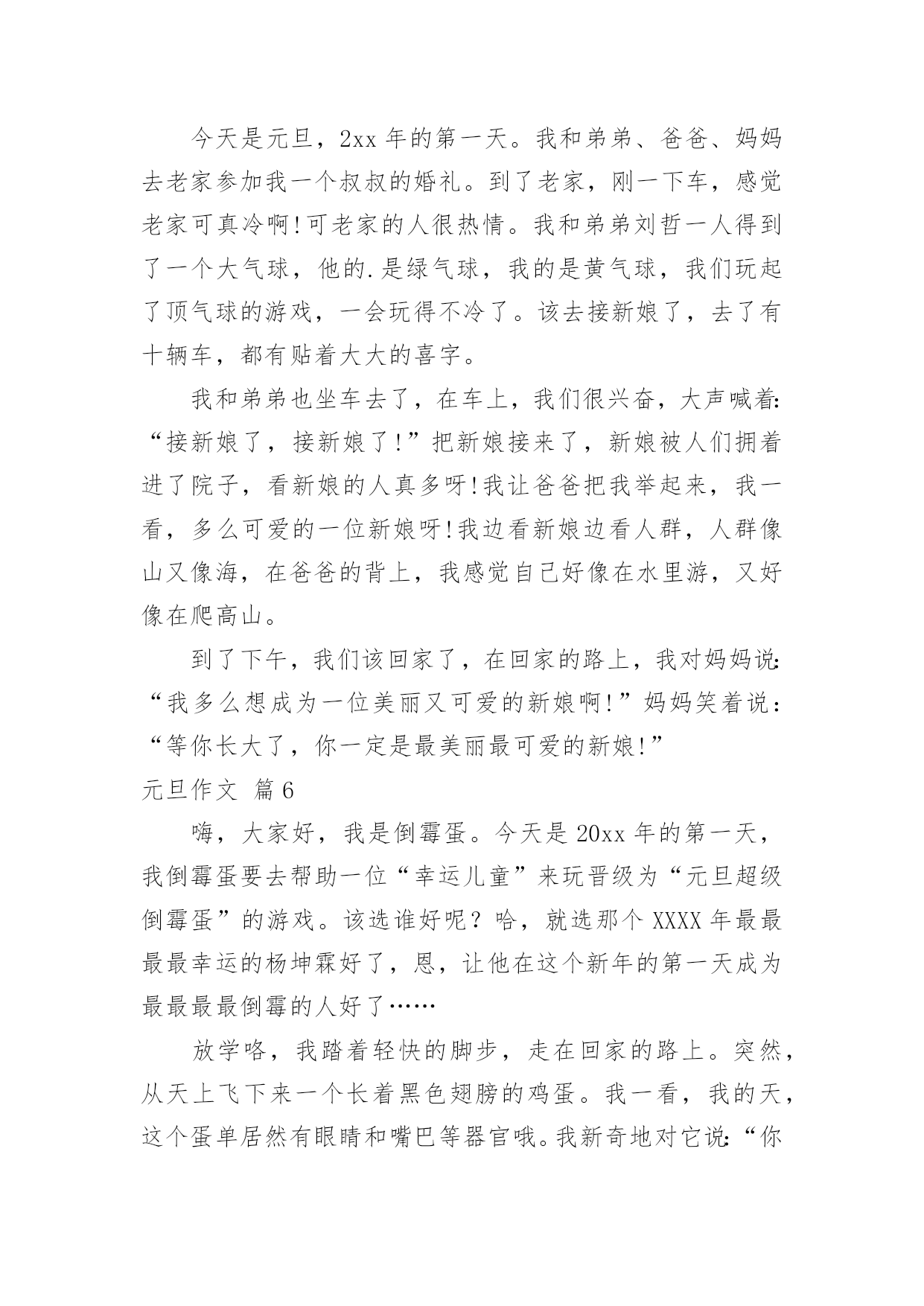 元旦作文(经典)实用的元旦作文在学习、工作乃至生活中,大家最不陌生的就是作文了吧,借助作文人们可以实现文化交流的目的。那么问题来了,到底应如何写一篇优秀的作文呢?下面是小编精心整理的元旦作文8篇,仅供参考,大家一起来看看吧。元旦作文篇1今天,在美丽可爱的大森林里,动物们举行了一场别开生面的联欢会.舞台就设在一棵老松树的下面.瞧!主持人山羊先生穿着帅气的燕尾服出场了:“2xxx年元旦联欢会咩__正式开始咩__!“舞台上的幕布拉开了,几头狮子手拉着手走上台来,随着音乐的响起,狮子们跳起欢快的伦巴舞.看那只最小的`狮子,也许是第一次参加吧,显得格外兴奋,也跳得格外起劲.金黄的头发随着舞蹈的动作也有节奏的舞动.突然,那只小狮子不知怎么滑倒了,躺在地上,手脚还在伴着音乐舞动,那又滑稽又可爱的样子,逗得大家哈哈大笑.接下来又表演了许多节目,都非常精彩,大家都看得眼花缭乱.山羊先生又走上台来:“请欣赏最后一个节目:笛子独奏.表演者:小兔白白.“白白走上台,把笛子放在嘴边吹着,一首悠扬的曲子在森林里流淌,好象一双温柔的手,轻轻抚摩着每个人.大家听的如痴如醉.过了很久,才响起一阵雷鸣般的掌声.回家的路上,小动物们还在回味着,议论着,2xxx年的元旦节怎么还不到来啊!元旦作文篇2太阳公公将细碎的金沙披在了大地母亲的身上,暖暖的风吹落了橘黄色的树叶,吹得人全身暖洋洋。街道上洋溢着浓浓的节日气息。我兴奋得像只出了笼的小鸟,拉着爸爸去公园照相,以此庆祝元旦。正当我兴致勃勃地和爸爸在公园里漫步,完全沉醉在节日的喜庆气氛中时,忽然,一只脏兮兮的小手拽住了我的衣角。我象一只受惊的兔子,一下子蹦出了好远,警惕地打量着拽我衣服的人。那是个很落魄的小男骇,瘦弱的身躯,杂草似的头发蓬乱地向上翘,显得零乱肮脏。面颊象是蒙上了一层灰,额头上还有少许的黑泥,虽然眼睛不小,但却没有少年应有的神采,眼神躲闪不定,在地面来回扫视,嘴唇微微嚅动了一下,似乎想说话但又不好意思开口,只是可怜巴巴地伸出一个破旧的小铁碗,轻轻抖动了几下,里面仅有的几个硬币互相碰撞,发出清脆的响声,向你示意他来的目的。这无疑是一个小乞丐。看他那哀求的神情,我的心似乎颤了一下,油然生出一种同情。“爸爸,给他一点钱吧,看他多可怜啊!”,“你想帮助他?”,爸爸意味深长地看我一眼。“当然!”,我不加思索地回答。爸爸不再说话,往他的碗里扔了一张两元的纸币,然后拉着我继续往前走。“先生,等等,再给一点吧”。令我惊讶的话语出自刚才那个“可怜”的小男孩的口中,此时他一扫刚才的羞涩,竟拦在我们的面前,用可怜的目光注视着我们,可我却从他的目光中看出一丝贪婪。“这到底是怎么回事?”,我的脑海中冒出无数个小问号,而爸爸象是什么都没有看见似的想绕道而行,可那个小男孩却死皮赖脸地挡在我们面前,一副不给钱就别想走的模样。“天啊,这个比我还小的.乞丐怎么现在变成一副抢劫犯的模样?”,看到这种状况,我一下蒙住了,求救似地望向爸爸。“我们已经没有多余的钱给你了,不要挡道!”爸爸用慍怒的语气说,两道眉毛也“系”成了一个“疙瘩”。那个小男孩见这里已经要不到“油水”,便悻悻地离开。“爸爸,您平时不是还教我要乐于助人吗?为什么对那个小男孩那么凶?”我不解地问。“孩子,我们要帮助那些实际有困难的人。”爸爸慈祥地抚摸着我的小脑袋。“乞丐他虽然也有经济困难,可刚才那个小男孩,是属于骗吃骗喝的那种。对那种人,没必要心软,知道吗?否则他的胃口会越来越大的。”听完爸爸的话,我的心象是突然坠入了冰窟窿,有说不出的难受,不知是为他们感到悲哀,还是……。“原来社会上也有这种人啊!”,我暗想。我四处张望了一下,真是不看不知道,一看吓一跳,躺着的、跪着的、拖着别人的,“乞丐还真是‘种类繁多’啊!”,想到这里,我不由自主地苦笑了一下,“为什么节日一到,乞丐们也‘活跃’起来了呢?”,我好奇地问爸爸,“因为现在上街的人多啊,要钱比平时好要。”爸爸耐心地为我解释,“虽然他们的方法五花八门,不过目的就只有一个,那就是截住人要钱。”爸爸自言自语地说。暖暖的风继续吹拂着大地,大片大片的树叶在空中无助地飞舞,可我却觉得太阳不再和绚,周身不再温暖,一切不再美好,就连节日的气氛似乎也淡掉了许多,我的脑海里象放电影般不断重复刚才那个小男孩截住我们要钱的情景。我在心中问自己:“这到底是节日,还是截日呢?”。元旦作文篇3近了,更近了,你听,新年的脚步声离我们越来越近了。眨眼间,不平凡的20xx年就要过去,崭新的20xx年已迎面向我们走来。为了迎接即将到来的新年,12月31日上午,我们高桥小学五年级组织了“庆元旦迎新年”文艺联欢活动。那一天早上,同学们一个个打扮得漂漂亮亮,早早地就来到了学校。在班长的组织下,同学开始打扮起来教室来,同学们有的擦桌子,有的洒水扫地,还有的在老师的指导下拉彩带、挂
