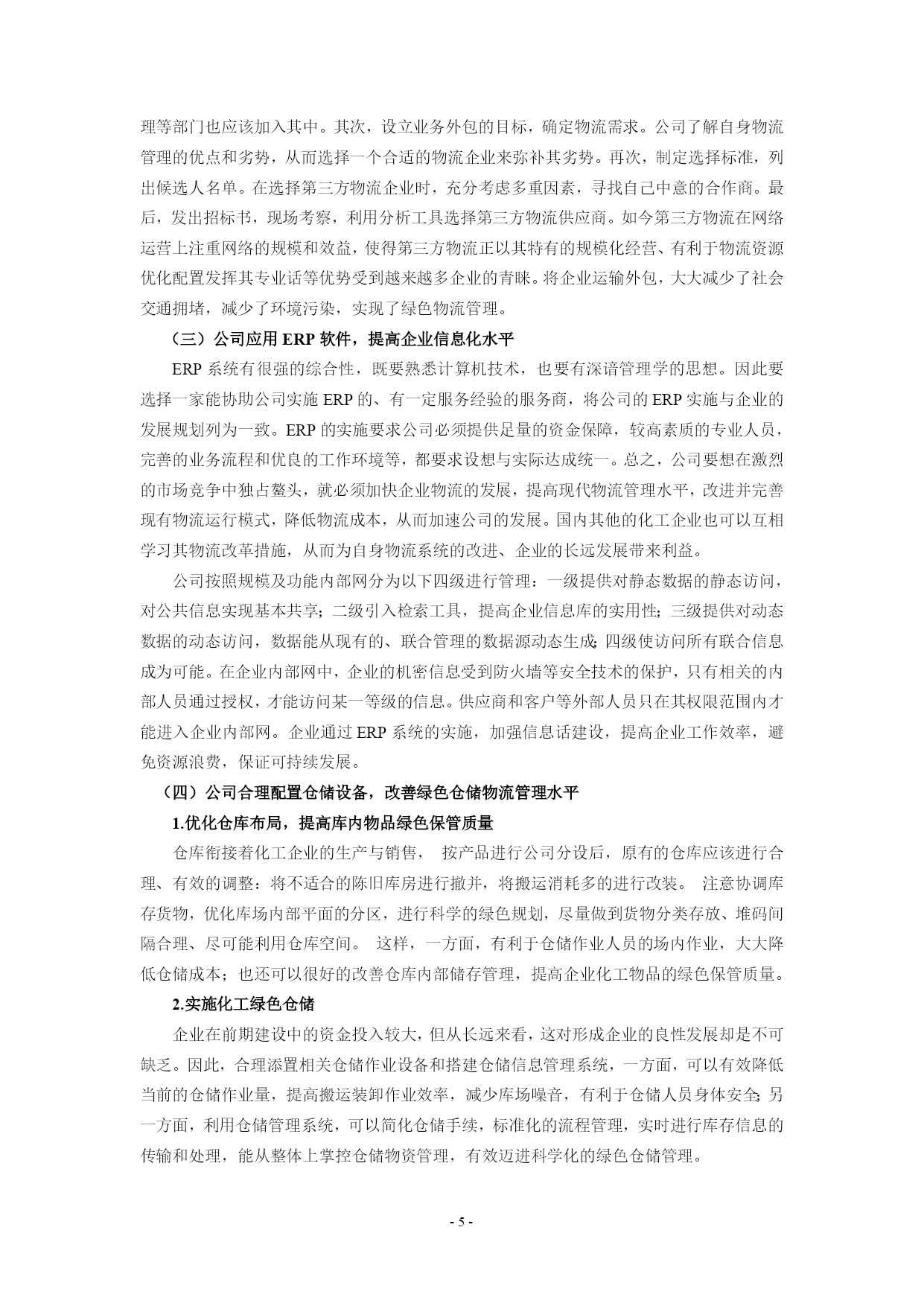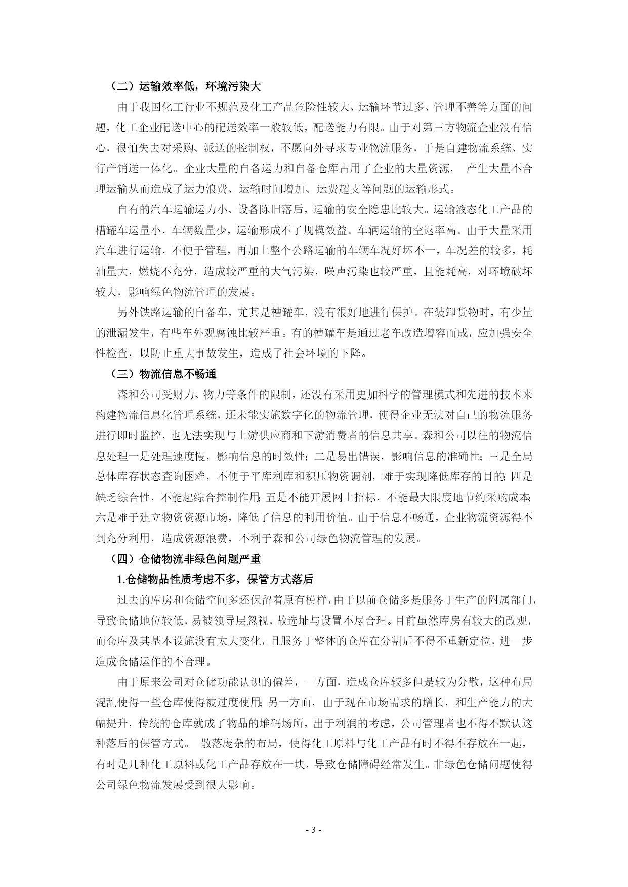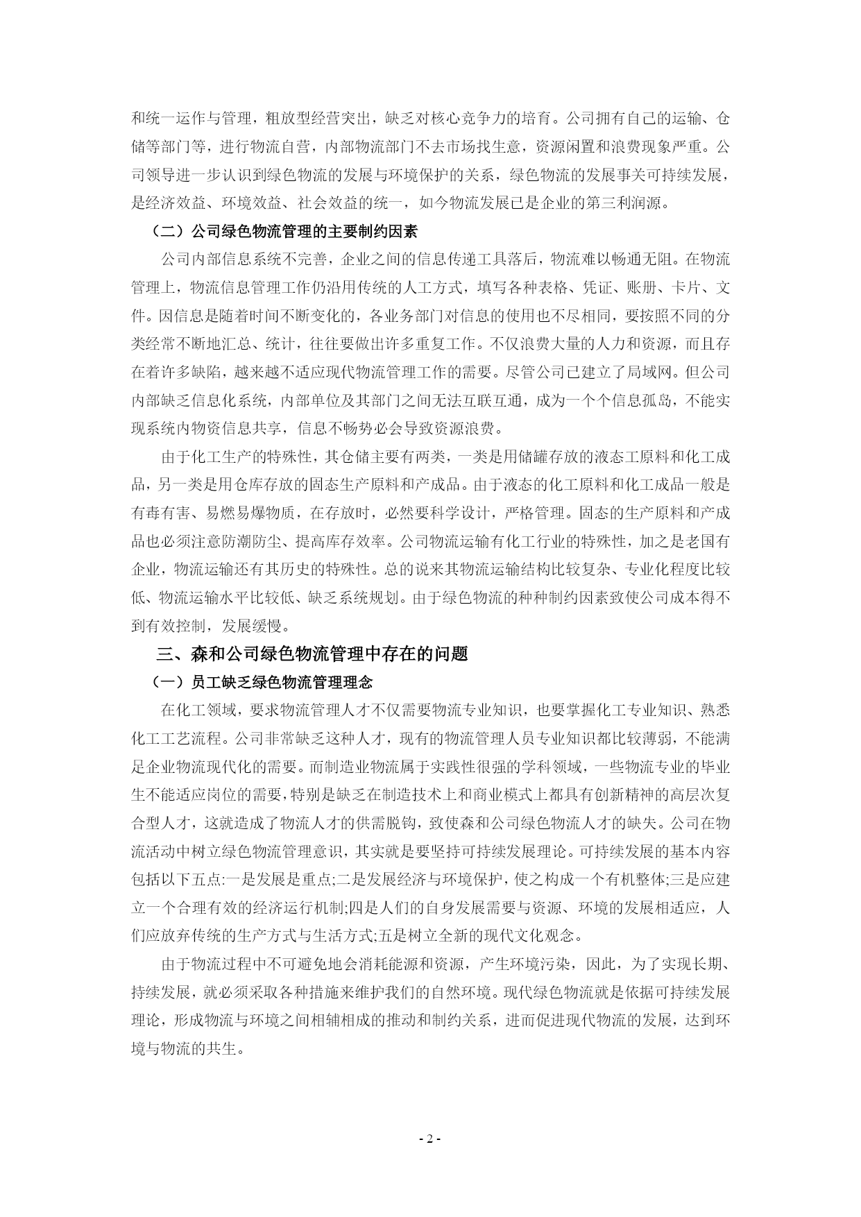 -PAGE7-上海森和有限公司绿色物流管理策略研究一、绪论(一)绿色物流管理理论绿色物流是在物流过程中抑制物流对环境造成危害的同时,实现对物流环境的净化。使物流资源得到充分利用。绿色物流的最终目标是可持续性发展,实现该目标的准则不仅仅是经济利益,还包括社会利益和环境利益,并且是这些利益的统一。绿色物流在资源利用过程中也有着资源节约、低能量消耗、可循环利用的显著特点,达到了真正意义上的环保与节省资源的目的。绿色物流是物流管理与环境科学交叉的一门科学。当今,由于环境问题日益突出,以及物流与环境的密切关系,因而在研究社会物流和企业物流时必须考虑环境问题,尤其在原材料的取得和产品的分销中,运输作为主要的物流活动,对环境可能会产生一系列的影响,而且废旧物品如何合理回收,减少对环境的污染且最大可能地再利用也是物流管理所需考虑的内容。现代绿色物流从环境的角度对物流体系进行改进,形成一个环境共生的物流系统。绿色物流系统建立在维护全球环境和可持续发展的基础上,改变原来经济发展与物流、消费生活与物流的单向作用关系,在抑制物流对环境造成危害的同时,形成一种能促进经济和消费健康发展的物流系统。(二)上海森和公司概况上海森和公司成立于2002年5月,占地42000平方米,位于金山区,是一家与蓝科石化设备有限责任公司技术密切合作、优势互补,共同生产研发高新技术换热设备及压力容器的股份制公司。公司的产品定位为技术含量高的高科技产品和附加值高的不锈钢及有色金属产品、高效节能板式产品、高压加氢换热器产品,公司是一家化工设施设备生产制造厂商。公司主要产品:板式空冷器;大型板壳式换热器;板式空气预热器;不锈钢及有色金属制压力容器;不锈钢及有色金属制各种换热器;高压加氢换热器;本公司开发的其他专利产品。二、森和公司绿色物流管理现状(一)公司领导逐渐树立了绿色物流管理理念公司领导转变了环境发展与公司发展无关或关系不大的观念,寓环保意识于经营决策之中,转变绿色投入会增加公司负担的观念,用长远眼光来看待绿色投入和公司发展的关系,并切实把环境保护贯穿于新产品的各个环节中。在各项管理中比较重视物流活动,尤其是绿色物流管理。其物流主要由企业自身承担,造成物流资源分散,资金短缺、产品积压、库存资金占用多、设备利用率低、生产管理水平低下等。首先,公司内部物流各自为政,产、供、销相互脱节,物流系统协调性差。企业将物流活动置于附属地位,将仓储、运输、装卸搬运、采购、包装、配送等物流活动分散在不同部门,没有纳入一个部门对物流活动进行系统规划和统一运作与管理,粗放型经营突出,缺乏对核心竞争力的培育。公司拥有自己的运输、仓储等部门等,进行物流自营,内部物流部门不去市场找生意,资源闲置和浪费现象严重。公司领导进一步认识到绿色物流的发展与环境保护的关系,绿色物流的发展事关可持续发展,是经济效益、环境效益、社会效益的统一,如今物流发展已是企业的第三利润源。(二)公司绿色物流管理的主要制约因素公司内部信息系统不完善,企业之间的信息传递工具落后,物流难以畅通无阻。在物流管理上,物流信息管理工作仍沿用传统的人工方式,填写各种表格、凭证、账册、卡片、文件。因信息是随着时间不断变化的,各业务部门对信息的使用也不尽相同,要按照不同的分类经常不断地汇总、统计,往往要做出许多重复工作。不仅浪费大量的人力和资源,而且存在着许多缺陷,越来越不适应现代物流管理工作的需要。尽管公司已建立了局域网。但公司内部缺乏信息化系统,内部单位及其部门之间无法互联互通,成为一个个信息孤岛,不能实现系统内物资信息共享,信息不畅势必会导致资源浪费。由于化工生产的特殊性,其仓储主要有两类,一类是用储罐存放的液态工原料和化工成品,另一类是用仓库存放的固态生产原料和产成品。由于液态的化工原料和化工成品一般是有毒有害、易燃易爆物质,在存放时,必然要科学设计,严格管理。固态的生产原料和产成品也必须注意防潮防尘、提高库存效率。公司物流运输有化工行业的特殊性,加之是老国有企业,物流运输还有其历史的特殊性。总的说来其物流运输结构比较复杂、专业化程度比较低、物流运输水平比较低、缺乏系统规划。由于绿色物流的种种制约因素致使公司成本得不到有效控制,发展缓慢。三、森和公司绿色物流管理中存在的问题(一)员工缺乏绿色物流管理理念在化工领域,要求物流管理人才不仅需要物流专业知识,也要掌握化工专业知识、熟悉化工工艺流程。公司非常缺乏这种人才,现有的物流管理人员专业知识都比较薄弱,不能满足企业物流现代化的需要。而制造业物流属于实践性很强的学科领域,一些物流专业的毕业生不能适应岗位的需要,特别是缺乏在制造技术上和商业模式上都具有创新精神的高层次复合型人才,这就造成了物流人才的供需脱钩,致使森和公司绿色物流人才的缺失。公司在HYPE