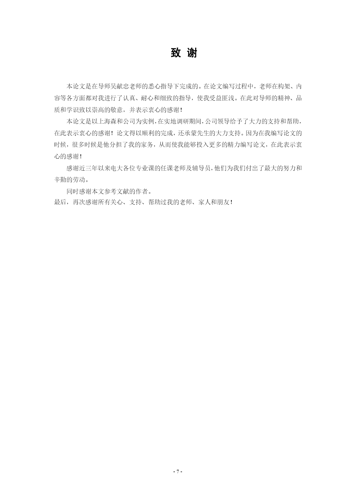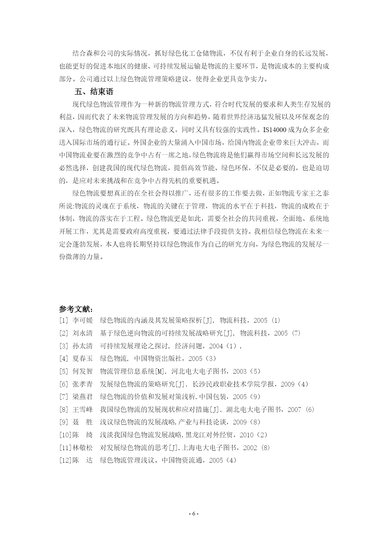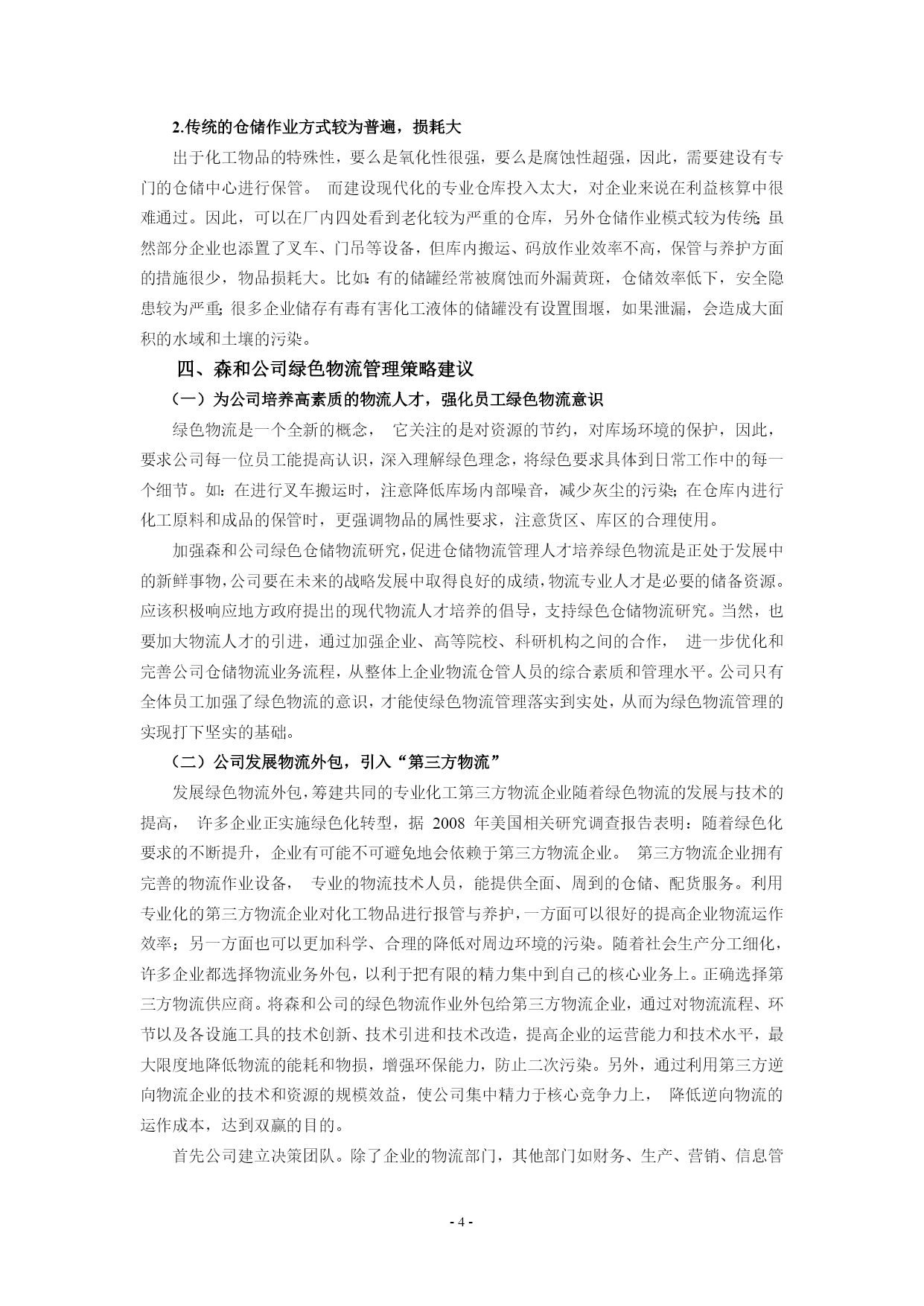 -PAGE7-上海森和有限公司绿色物流管理策略研究一、绪论(一)绿色物流管理理论绿色物流是在物流过程中抑制物流对环境造成危害的同时,实现对物流环境的净化。使物流资源得到充分利用。绿色物流的最终目标是可持续性发展,实现该目标的准则不仅仅是经济利益,还包括社会利益和环境利益,并且是这些利益的统一。绿色物流在资源利用过程中也有着资源节约、低能量消耗、可循环利用的显著特点,达到了真正意义上的环保与节省资源的目的。绿色物流是物流管理与环境科学交叉的一门科学。当今,由于环境问题日益突出,以及物流与环境的密切关系,因而在研究社会物流和企业物流时必须考虑环境问题,尤其在原材料的取得和产品的分销中,运输作为主要的物流活动,对环境可能会产生一系列的影响,而且废旧物品如何合理回收,减少对环境的污染且最大可能地再利用也是物流管理所需考虑的内容。现代绿色物流从环境的角度对物流体系进行改进,形成一个环境共生的物流系统。绿色物流系统建立在维护全球环境和可持续发展的基础上,改变原来经济发展与物流、消费生活与物流的单向作用关系,在抑制物流对环境造成危害的同时,形成一种能促进经济和消费健康发展的物流系统。(二)上海森和公司概况上海森和公司成立于2002年5月,占地42000平方米,位于金山区,是一家与蓝科石化设备有限责任公司技术密切合作、优势互补,共同生产研发高新技术换热设备及压力容器的股份制公司。公司的产品定位为技术含量高的高科技产品和附加值高的不锈钢及有色金属产品、高效节能板式产品、高压加氢换热器产品,公司是一家化工设施设备生产制造厂商。公司主要产品:板式空冷器;大型板壳式换热器;板式空气预热器;不锈钢及有色金属制压力容器;不锈钢及有色金属制各种换热器;高压加氢换热器;本公司开发的其他专利产品。二、森和公司绿色物流管理现状(一)公司领导逐渐树立了绿色物流管理理念公司领导转变了环境发展与公司发展无关或关系不大的观念,寓环保意识于经营决策之中,转变绿色投入会增加公司负担的观念,用长远眼光来看待绿色投入和公司发展的关系,并切实把环境保护贯穿于新产品的各个环节中。在各项管理中比较重视物流活动,尤其是绿色物流管理。其物流主要由企业自身承担,造成物流资源分散,资金短缺、产品积压、库存资金占用多、设备利用率低、生产管理水平低下等。首先,公司内部物流各自为政,产、供、销相互脱节,物流系统协调性差。企业将物流活动置于附属地位,将仓储、运输、装卸搬运、采购、包装、配送等物流活动分散在不同部门,没有纳入一个部门对物流活动进行系统规划和统一运作与管理,粗放型经营突出,缺乏对核心竞争力的培育。公司拥有自己的运输、仓储等部门等,进行物流自营,内部物流部门不去市场找生意,资源闲置和浪费现象严重。公司领导进一步认识到绿色物流的发展与环境保护的关系,绿色物流的发展事关可持续发展,是经济效益、环境效益、社会效益的统一,如今物流发展已是企业的第三利润源。(二)公司绿色物流管理的主要制约因素公司内部信息系统不完善,企业之间的信息传递工具落后,物流难以畅通无阻。在物流管理上,物流信息管理工作仍沿用传统的人工方式,填写各种表格、凭证、账册、卡片、文件。因信息是随着时间不断变化的,各业务部门对信息的使用也不尽相同,要按照不同的分类经常不断地汇总、统计,往往要做出许多重复工作。不仅浪费大量的人力和资源,而且存在着许多缺陷,越来越不适应现代物流管理工作的需要。尽管公司已建立了局域网。但公司内部缺乏信息化系统,内部单位及其部门之间无法互联互通,成为一个个信息孤岛,不能实现系统内物资信息共享,信息不畅势必会导致资源浪费。由于化工生产的特殊性,其仓储主要有两类,一类是用储罐存放的液态工原料和化工成品,另一类是用仓库存放的固态生产原料和产成品。由于液态的化工原料和化工成品一般是有毒有害、易燃易爆物质,在存放时,必然要科学设计,严格管理。固态的生产原料和产成品也必须注意防潮防尘、提高库存效率。公司物流运输有化工行业的特殊性,加之是老国有企业,物流运输还有其历史的特殊性。总的说来其物流运输结构比较复杂、专业化程度比较低、物流运输水平比较低、缺乏系统规划。由于绿色物流的种种制约因素致使公司成本得不到有效控制,发展缓慢。三、森和公司绿色物流管理中存在的问题(一)员工缺乏绿色物流管理理念在化工领域,要求物流管理人才不仅需要物流专业知识,也要掌握化工专业知识、熟悉化工工艺流程。公司非常缺乏这种人才,现有的物流管理人员专业知识都比较薄弱,不能满足企业物流现代化的需要。而制造业物流属于实践性很强的学科领域,一些物流专业的毕业生不能适应岗位的需要,特别是缺乏在制造技术上和商业模式上都具有创新精神的高层次复合型人才,这就造成了物流人才的供需脱钩,致使森和公司绿色物流人才的缺失。公司在HYPE