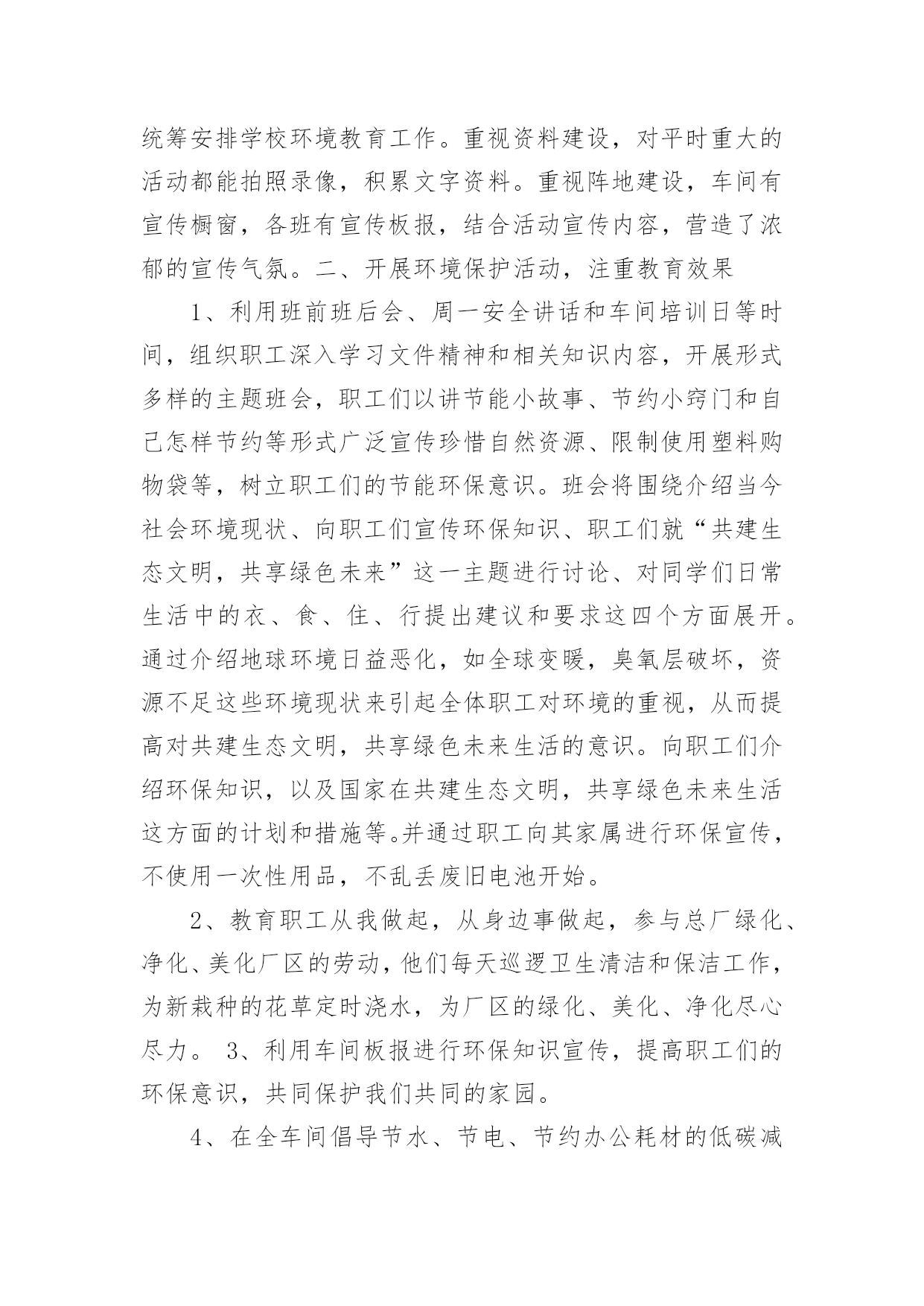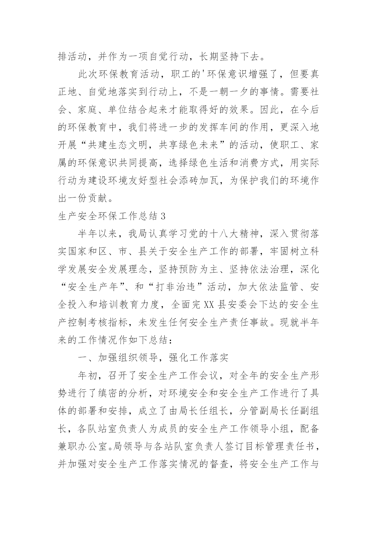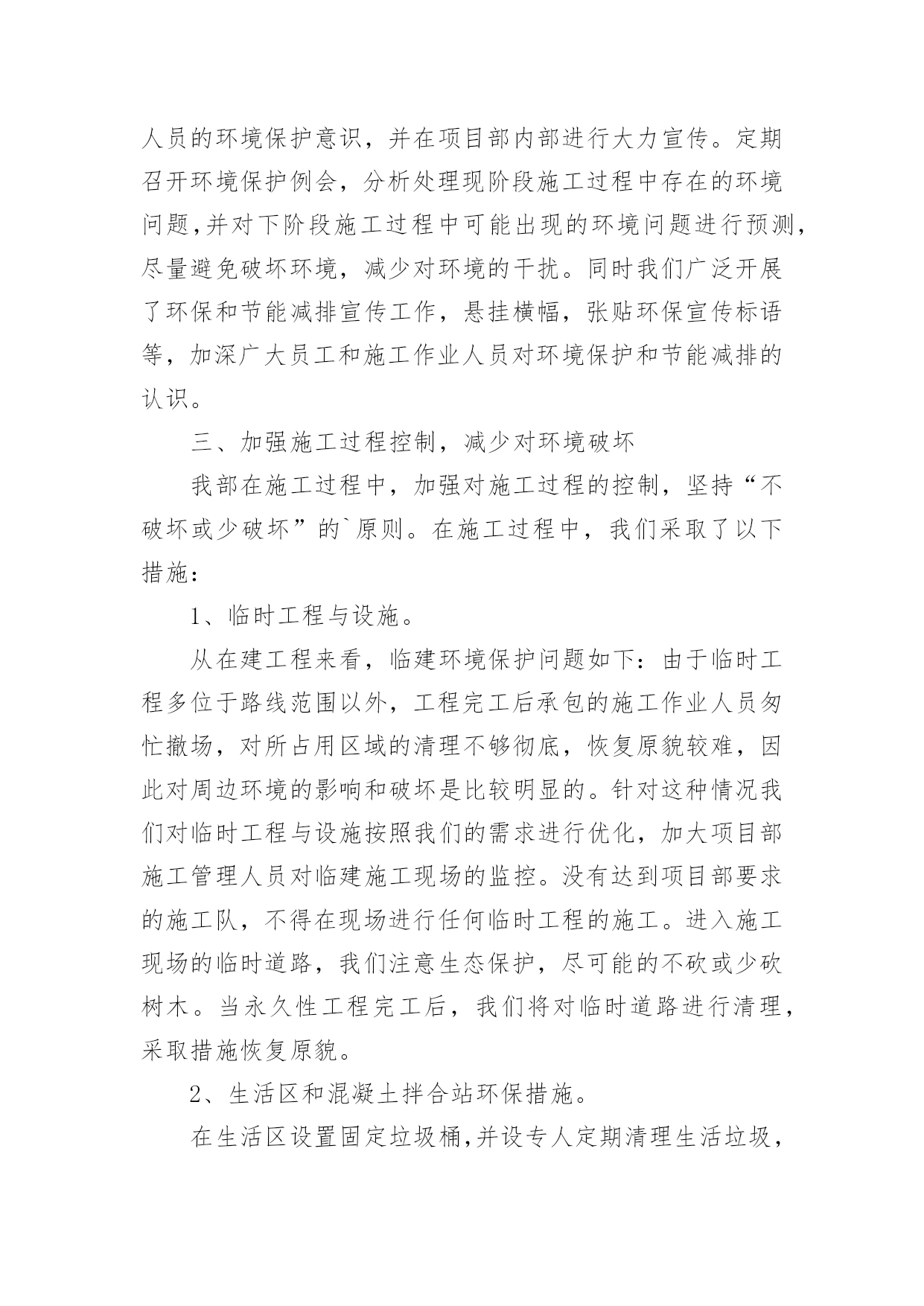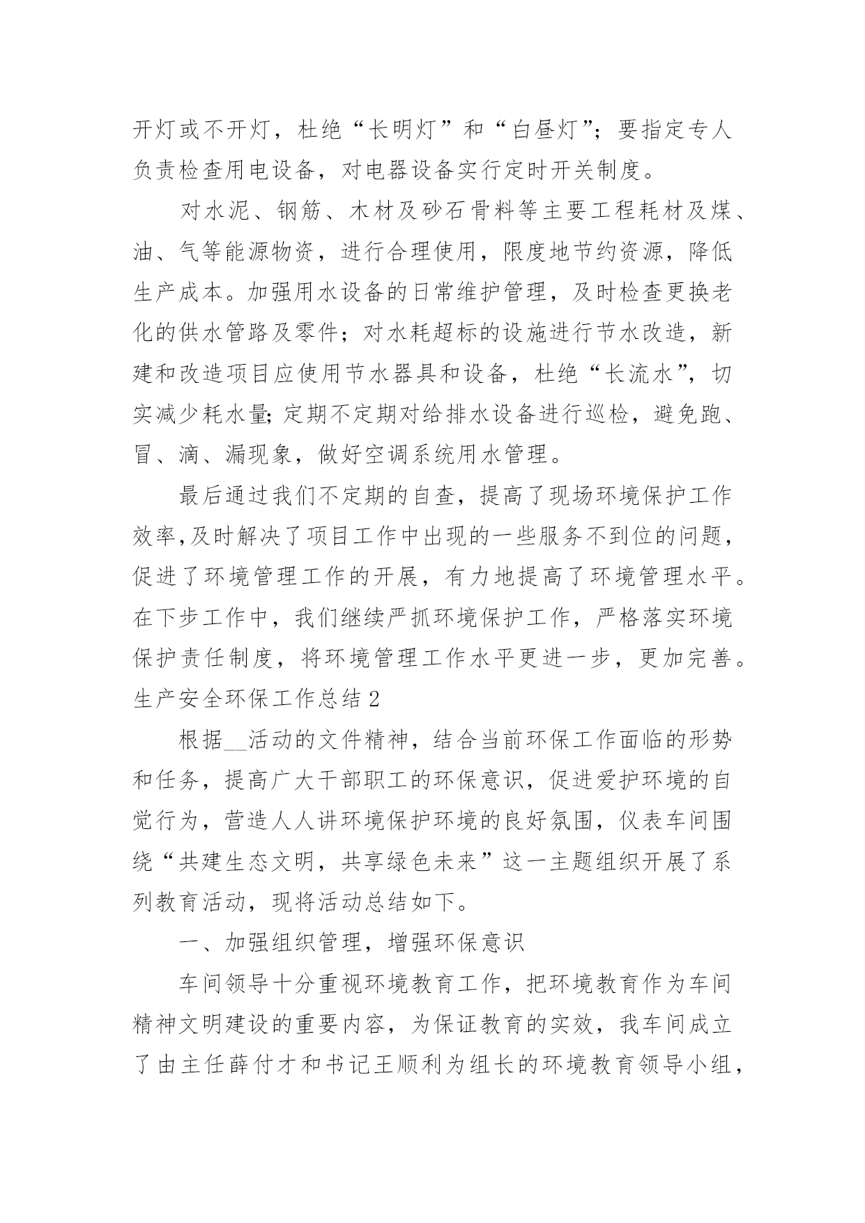 生产安全环保工作总结生产安全环保工作总结总结是对取得的成绩、存在的问题及得到的经验和教训等方面情况进行评价与描述的一种书面材料,通过它可以全面地、系统地了解以往的学习和工作情况,让我们一起认真地写一份总结吧。那么你真的懂得怎么写总结吗?以下是小编帮大家整理的生产安全环保工作总结,希望对大家有所帮助。生产安全环保工作总结1今年上半年,按照公司对环境保护的统一部署,项目部环境保护工作在环境保护领导小组的领导下,取得了一定的成绩,实实在在地做了大量、细致的工作,项目部综合环境得到了进一步的改善,没有发生一起环境污染事件。现就本项目部对环境保护工作作如下回顾和总结。一、领导重视,目标明确项目部成立了以项目经理为组长,以副经理为副组长,以各部门长为成员的环境保护工作领导小组。在环境保护工作领导小组的领导下,我项目部制订了各项规章制度,完善环境保护工作体系。项目部将环境保护工作具体落实到各部门和个人,落实环境保护工作责任制,做到人人参与。二、加强宣传、培训工作,强化环境保护意识组织相关人员参加环境保护的培训,以增强项目部管理人员的环境保护意识,并在项目部内部进行大力宣传。定期召开环境保护例会,分析处理现阶段施工过程中存在的环境问题,并对下阶段施工过程中可能出现的环境问题进行预测,尽量避免破坏环境,减少对环境的干扰。同时我们广泛开展了环保和节能减排宣传工作,悬挂横幅,张贴环保宣传标语等,加深广大员工和施工作业人员对环境保护和节能减排的认识。三、加强施工过程控制,减少对环境破坏我部在施工过程中,加强对施工过程的控制,坚持“不破坏或少破坏”的`原则。在施工过程中,我们采取了以下措施:1、临时工程与设施。从在建工程来看,临建环境保护问题如下:由于临时工程多位于路线范围以外,工程完工后承包的施工作业人员匆忙撤场,对所占用区域的清理不够彻底,恢复原貌较难,因此对周边环境的影响和破坏是比较明显的。针对这种情况我们对临时工程与设施按照我们的需求进行优化,加大项目部施工管理人员对临建施工现场的监控。没有达到项目部要求的施工队,不得在现场进行任何临时工程的施工。进入施工现场的临时道路,我们注意生态保护,尽可能的不砍或少砍树木。当永久性工程完工后,我们将对临时道路进行清理,采取措施恢复原貌。2、生活区和混凝土拌合站环保措施。在生活区设置固定垃圾桶,并设专人定期清理生活垃圾,生活垃圾收集后,运送至永久性弃渣场掩埋。在生活区后修建化粪池,化粪池上设置隔油层,生活废水经化粪池沉淀后,集中排放。混凝土拌合站中产生的生产废水,经沉淀池沉淀后集中排放,严禁生产废水直接排放至河流中,污染水体。混凝土拌合站设置洗车台,所有车辆的清洗必须在洗车台内进行,严禁车辆在施工区域内清洗。及时打扫混凝土拌合站,保持地面清洁。3、施工中的环境保护。注意夜间施工的噪音影响,必须在夜间从事有噪音污染的施工应先发安民告示,以征得附近居民的理解。对距离居民区100米以内的工程,限定施工时间,部分高噪音设备严禁夜间施工作业。项目部配备两台洒水车在施工区域和施工便道上进行洒水,避免产生扬尘,危害生产人员和其他人的身体健康。4、弃土、弃渣场的环境保护。严格按照设计图纸进行施工。弃土场和弃渣场在使用前必须设置相应的防护和环保设施,先施工防护措施,然后才是弃土、弃渣。取土场和施工现场的临时弃土场堆放的表土或临时堆放土,须覆盖防尘网,防止大风天气产生扬尘。弃土弃渣场坡脚须堆放袋装土,防止雨后水土流失。四、细节入手、强化管理、狠抓节能减排工作科学使用各类用电设备,尽可能地节约用电。严格执行国家有关室内温度的控制标准,合理设置空调温度;节约照明用电,办公室、会议室等场所尽量采用自然光,尽可能少开灯或不开灯,杜绝“长明灯”和“白昼灯”;要指定专人负责检查用电设备,对电器设备实行定时开关制度。对水泥、钢筋、木材及砂石骨料等主要工程耗材及煤、油、气等能源物资,进行合理使用,限度地节约资源,降低生产成本。加强用水设备的日常维护管理,及时检查更换老化的供水管路及零件;对水耗超标的设施进行节水改造,新建和改造项目应使用节水器具和设备,杜绝“长流水”,切实减少耗水量;定期不定期对给排水设备进行巡检,避免跑、冒、滴、漏现象,做好空调系统用水管理。最后通过我们不定期的自查,提高了现场环境保护工作效率,及时解决了项目工作中出现的一些服务不到位的问题,促进了环境管理工作的开展,有力地提高了环境管理水平。在下步工作中,我们继续严抓环境保护工作,严格落实环境保护责任制度,将环境管理工作水平更进一步,更加完善。生产安全环保工作总结2根据__活动的文件精神,结合当前环保工作面临的形势和任务,提高广大干部职工的环保意识,促进爱护环境的自觉行为,营造人人讲环境保护环境的良好氛围,仪表车间围绕“共建生态文明,共享绿色未来”这一主题组织开展了系列