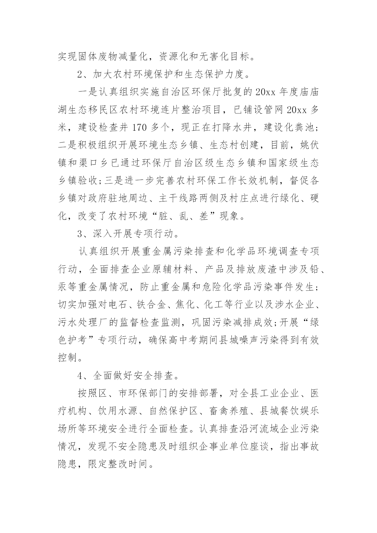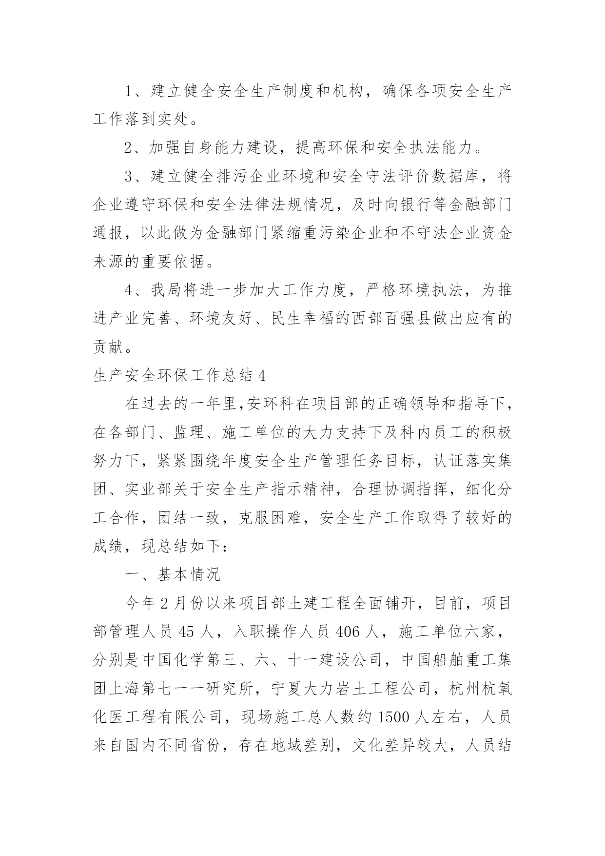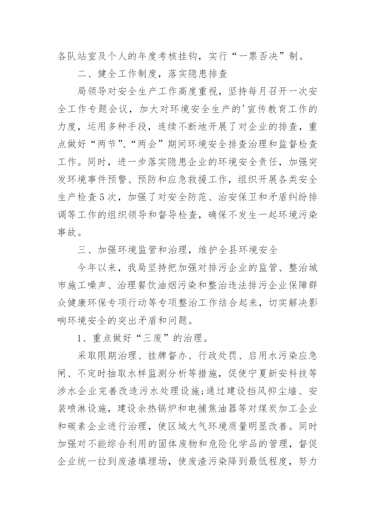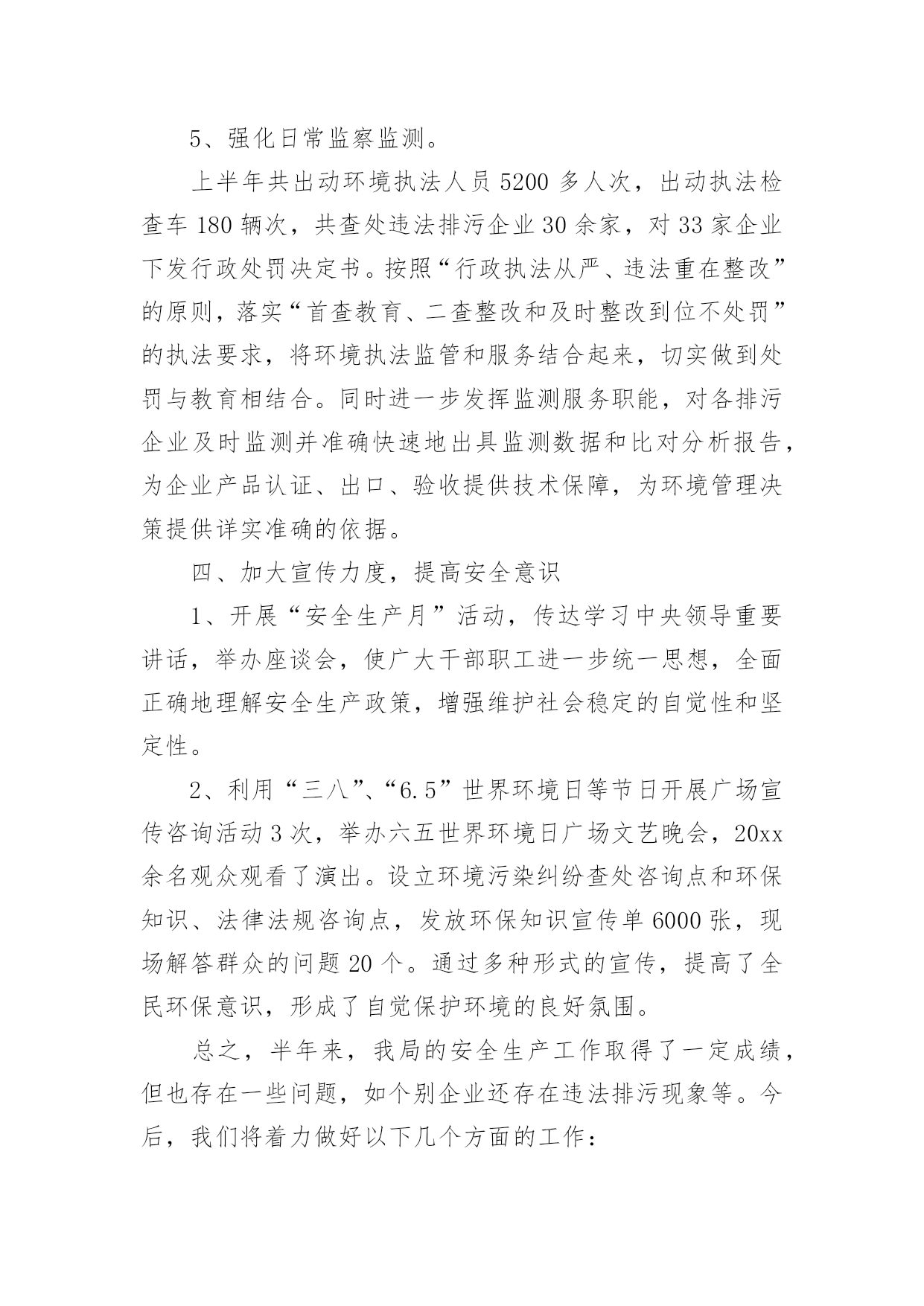 生产安全环保工作总结生产安全环保工作总结总结是对取得的成绩、存在的问题及得到的经验和教训等方面情况进行评价与描述的一种书面材料,通过它可以全面地、系统地了解以往的学习和工作情况,让我们一起认真地写一份总结吧。那么你真的懂得怎么写总结吗?以下是小编帮大家整理的生产安全环保工作总结,希望对大家有所帮助。生产安全环保工作总结1今年上半年,按照公司对环境保护的统一部署,项目部环境保护工作在环境保护领导小组的领导下,取得了一定的成绩,实实在在地做了大量、细致的工作,项目部综合环境得到了进一步的改善,没有发生一起环境污染事件。现就本项目部对环境保护工作作如下回顾和总结。一、领导重视,目标明确项目部成立了以项目经理为组长,以副经理为副组长,以各部门长为成员的环境保护工作领导小组。在环境保护工作领导小组的领导下,我项目部制订了各项规章制度,完善环境保护工作体系。项目部将环境保护工作具体落实到各部门和个人,落实环境保护工作责任制,做到人人参与。二、加强宣传、培训工作,强化环境保护意识组织相关人员参加环境保护的培训,以增强项目部管理人员的环境保护意识,并在项目部内部进行大力宣传。定期召开环境保护例会,分析处理现阶段施工过程中存在的环境问题,并对下阶段施工过程中可能出现的环境问题进行预测,尽量避免破坏环境,减少对环境的干扰。同时我们广泛开展了环保和节能减排宣传工作,悬挂横幅,张贴环保宣传标语等,加深广大员工和施工作业人员对环境保护和节能减排的认识。三、加强施工过程控制,减少对环境破坏我部在施工过程中,加强对施工过程的控制,坚持“不破坏或少破坏”的`原则。在施工过程中,我们采取了以下措施:1、临时工程与设施。从在建工程来看,临建环境保护问题如下:由于临时工程多位于路线范围以外,工程完工后承包的施工作业人员匆忙撤场,对所占用区域的清理不够彻底,恢复原貌较难,因此对周边环境的影响和破坏是比较明显的。针对这种情况我们对临时工程与设施按照我们的需求进行优化,加大项目部施工管理人员对临建施工现场的监控。没有达到项目部要求的施工队,不得在现场进行任何临时工程的施工。进入施工现场的临时道路,我们注意生态保护,尽可能的不砍或少砍树木。当永久性工程完工后,我们将对临时道路进行清理,采取措施恢复原貌。2、生活区和混凝土拌合站环保措施。在生活区设置固定垃圾桶,并设专人定期清理生活垃圾,生活垃圾收集后,运送至永久性弃渣场掩埋。在生活区后修建化粪池,化粪池上设置隔油层,生活废水经化粪池沉淀后,集中排放。混凝土拌合站中产生的生产废水,经沉淀池沉淀后集中排放,严禁生产废水直接排放至河流中,污染水体。混凝土拌合站设置洗车台,所有车辆的清洗必须在洗车台内进行,严禁车辆在施工区域内清洗。及时打扫混凝土拌合站,保持地面清洁。3、施工中的环境保护。注意夜间施工的噪音影响,必须在夜间从事有噪音污染的施工应先发安民告示,以征得附近居民的理解。对距离居民区100米以内的工程,限定施工时间,部分高噪音设备严禁夜间施工作业。项目部配备两台洒水车在施工区域和施工便道上进行洒水,避免产生扬尘,危害生产人员和其他人的身体健康。4、弃土、弃渣场的环境保护。严格按照设计图纸进行施工。弃土场和弃渣场在使用前必须设置相应的防护和环保设施,先施工防护措施,然后才是弃土、弃渣。取土场和施工现场的临时弃土场堆放的表土或临时堆放土,须覆盖防尘网,防止大风天气产生扬尘。弃土弃渣场坡脚须堆放袋装土,防止雨后水土流失。四、细节入手、强化管理、狠抓节能减排工作科学使用各类用电设备,尽可能地节约用电。严格执行国家有关室内温度的控制标准,合理设置空调温度;节约照明用电,办公室、会议室等场所尽量采用自然光,尽可能少开灯或不开灯,杜绝“长明灯”和“白昼灯”;要指定专人负责检查用电设备,对电器设备实行定时开关制度。对水泥、钢筋、木材及砂石骨料等主要工程耗材及煤、油、气等能源物资,进行合理使用,限度地节约资源,降低生产成本。加强用水设备的日常维护管理,及时检查更换老化的供水管路及零件;对水耗超标的设施进行节水改造,新建和改造项目应使用节水器具和设备,杜绝“长流水”,切实减少耗水量;定期不定期对给排水设备进行巡检,避免跑、冒、滴、漏现象,做好空调系统用水管理。最后通过我们不定期的自查,提高了现场环境保护工作效率,及时解决了项目工作中出现的一些服务不到位的问题,促进了环境管理工作的开展,有力地提高了环境管理水平。在下步工作中,我们继续严抓环境保护工作,严格落实环境保护责任制度,将环境管理工作水平更进一步,更加完善。生产安全环保工作总结2根据__活动的文件精神,结合当前环保工作面临的形势和任务,提高广大干部职工的环保意识,促进爱护环境的自觉行为,营造人人讲环境保护环境的良好氛围,仪表车间围绕“共建生态文明,共享绿色未来”这一主题组织开展了系列