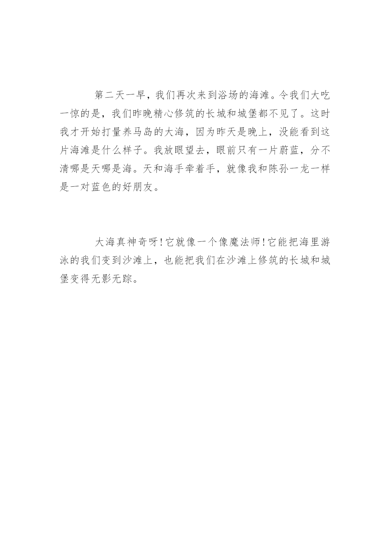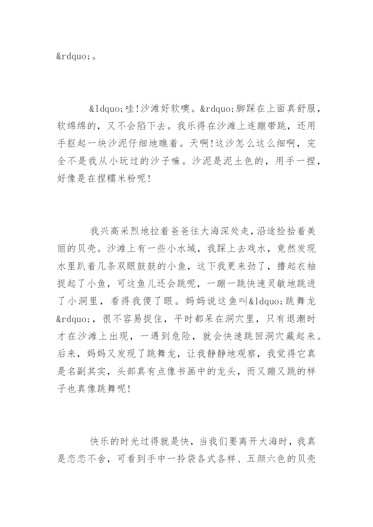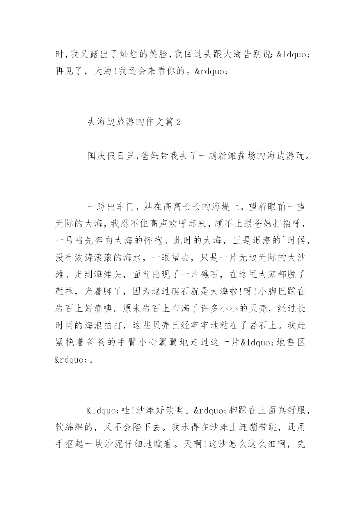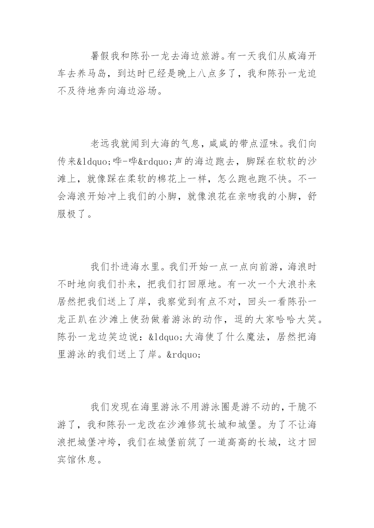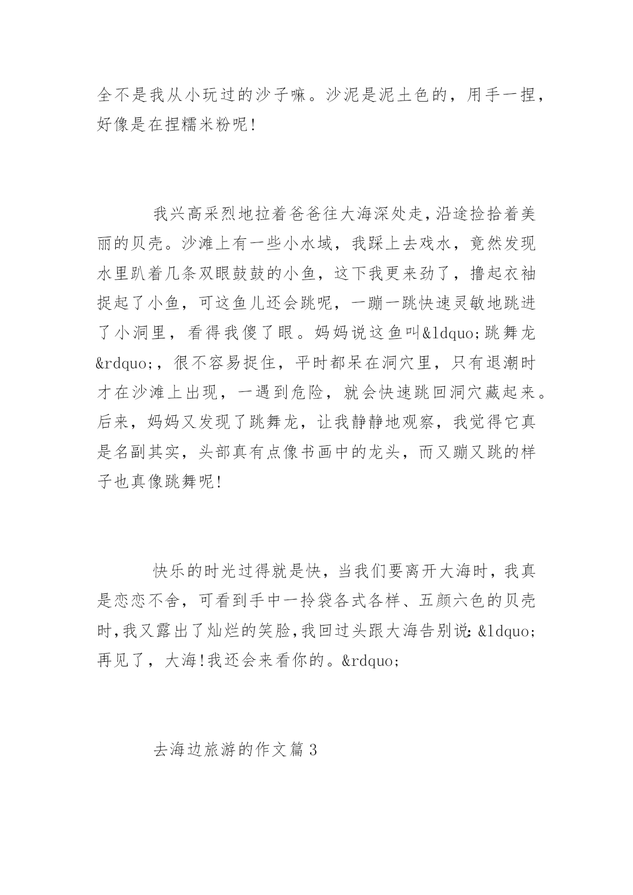 去海边旅游的作文去海边旅游的作文大海真神奇呀!它就像一个像魔法师,它能把海里游泳的我们变到沙滩上,也能把我们在沙滩上修筑的长城和城堡变得无影无踪,这次海边旅游令我心情愉悦。以下是百分网小编为大家整理的去海边旅游的作文,欢迎大家参考阅读。去海边旅游的作文篇1国庆假日里,爸妈带我去了一趟新滩盐场的海边游玩。一跨出车门,站在高高长长的海堤上,望着眼前一望无际的大海,我忍不住高声欢呼起来,顾不上跟爸妈打招呼,一马当先奔向大海的怀抱。此时的大海,正是退潮的时候,没有波涛滚滚的海水,一眼望去,只是一片无边无际的大沙滩。走到海滩头,面前出现了一片礁石,在这里大家都脱了鞋袜,光着脚丫,因为越过礁石就是大海啦!呀!小脚巴踩在岩石上好痛噢。原来岩石上布满了许多小小的贝壳,经过长时间的海浪拍打,这些贝壳已经牢牢地粘在了岩石上。我赶紧挽着爸爸的手臂小心翼翼地走过这一片“地雷区”。“哇!沙滩好软噢。”脚踩在上面真舒服,软绵绵的,又不会陷下去。我乐得在沙滩上连蹦带跳,还用手抠起一块沙泥仔细地瞧着。天啊!这沙怎么这么细啊,完全不是我从小玩过的沙子嘛。沙泥是泥土色的,用手一捏,好像是在捏糯米粉呢!我兴高采烈地拉着爸爸往大海深处走,沿途捡拾着美丽的贝壳。沙滩上有一些小水域,我踩上去戏水,竟然发现水里趴着几条双眼鼓鼓的小鱼,这下我更来劲了,撸起衣袖捉起了小鱼,可这鱼儿还会跳呢,一蹦一跳快速灵敏地跳进了小洞里,看得我傻了眼。妈妈说这鱼叫“跳舞龙”,很不容易捉住,平时都呆在洞穴里,只有退潮时才在沙滩上出现,一遇到危险,就会快速跳回洞穴藏起来。后来,妈妈又发现了跳舞龙,让我静静地观察,我觉得它真是名副其实,头部真有点像书画中的龙头,而又蹦又跳的样子也真像跳舞呢!快乐的时光过得就是快,当我们要离开大海时,我真是恋恋不舍,可看到手中一拎袋各式各样、五颜六色的贝壳时,我又露出了灿烂的笑脸,我回过头跟大海告别说:“再见了,大海!我还会来看你的。”去海边旅游的作文篇2国庆假日里,爸妈带我去了一趟新滩盐场的海边游玩。一跨出车门,站在高高长长的海堤上,望着眼前一望无际的大海,我忍不住高声欢呼起来,顾不上跟爸妈打招呼,一马当先奔向大海的怀抱。此时的大海,正是退潮的`时候,没有波涛滚滚的海水,一眼望去,只是一片无边无际的大沙滩。走到海滩头,面前出现了一片礁石,在这里大家都脱了鞋袜,光着脚丫,因为越过礁石就是大海啦!呀!小脚巴踩在岩石上好痛噢。原来岩石上布满了许多小小的贝壳,经过长时间的海浪拍打,这些贝壳已经牢牢地粘在了岩石上。我赶紧挽着爸爸的手臂小心翼翼地走过这一片“地雷区”。“哇!沙滩好软噢。”脚踩在上面真舒服,软绵绵的,又不会陷下去。我乐得在沙滩上连蹦带跳,还用手抠起一块沙泥仔细地瞧着。天啊!这沙怎么这么细啊,完全不是我从小玩过的沙子嘛。沙泥是泥土色的,用手一捏,好像是在捏糯米粉呢!我兴高采烈地拉着爸爸往大海深处走,沿途捡拾着美丽的贝壳。沙滩上有一些小水域,我踩上去戏水,竟然发现水里趴着几条双眼鼓鼓的小鱼,这下我更来劲了,撸起衣袖捉起了小鱼,可这鱼儿还会跳呢,一蹦一跳快速灵敏地跳进了小洞里,看得我傻了眼。妈妈说这鱼叫“跳舞龙”,很不容易捉住,平时都呆在洞穴里,只有退潮时才在沙滩上出现,一遇到危险,就会快速跳回洞穴藏起来。后来,妈妈又发现了跳舞龙,让我静静地观察,我觉得它真是名副其实,头部真有点像书画中的龙头,而又蹦又跳的样子也真像跳舞呢!快乐的时光过得就是快,当我们要离开大海时,我真是恋恋不舍,可看到手中一拎袋各式各样、五颜六色的贝壳时,我又露出了灿烂的笑脸,我回过头跟大海告别说:“再见了,大海!我还会来看你的。”去海边旅游的作文篇3暑假我和陈孙一龙去海边旅游。有一天我们从威海开车去养马岛,到达时已经是晚上八点多了,我和陈孙一龙迫不及待地奔向海边浴场。老远我就闻到大海的气息,咸咸的带点涩味。我们向传来“哗-哗”声的海边跑去,脚踩在软软的沙滩上,就像踩在柔软的棉花上一样,怎么跑也跑不快。不一会海浪开始冲上我们的小脚,就像浪花在亲吻我的小脚,舒服极了。我们扑进海水里。我们开始一点一点向前游,海浪时不时地向我们扑来,把我们打回原地。有一次一个大浪扑来居然把我们送上了岸,我察觉到有点不对,回头一看陈孙一龙正趴在沙滩上使劲做着游泳的动作,逗的大家哈哈大笑。陈孙一龙边笑边说:“大海使了什么魔法,居然把海里游泳的我们送上了岸。”我们发现在海里游泳不用游泳圈是游不动的,干脆不游了,我和陈孙一龙改在沙滩修筑长城和城堡。为了不