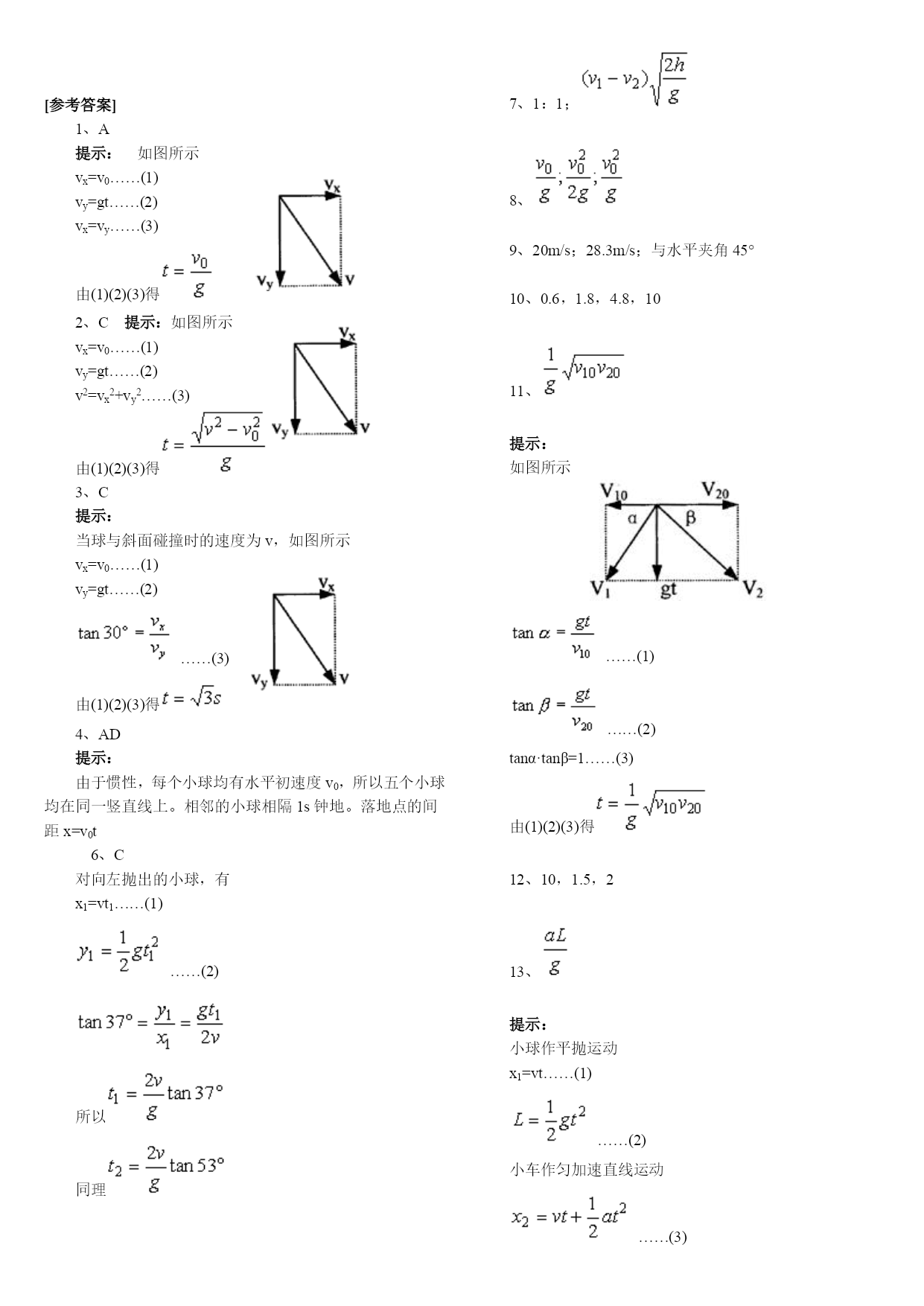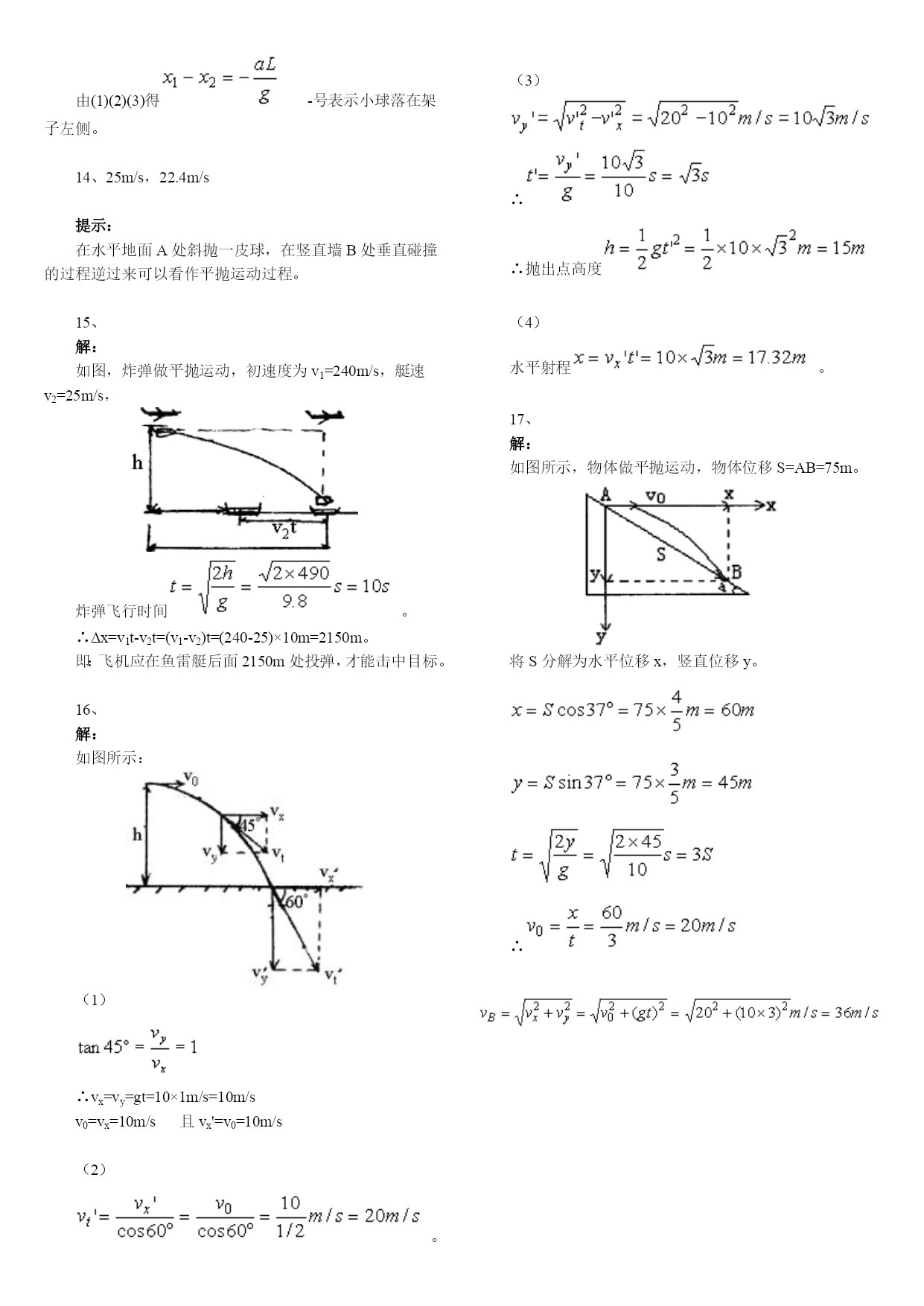 平抛运动专题练习一、选择题1、一个物体以初速度v0水平抛出,经t秒时,其速度竖直方向分量和v0大小相等,t等于:()A、B、C、D、2、一个物体以初速度v0水平抛出,落地速度为v,则物体运动时间为:()A、B、C、D、3、如图所示,以水平初速度v0=9.8m/s秒抛出的物体,飞行一段时间后,垂直地撞在倾角θ=30°的斜面上,可知物体完成这段飞行的时间是:()A、B、C、D、2s4、正在水平匀速飞行的飞机,每隔1秒种释放一个小球,先后共释放5个,不计空气阻力,则:()A、这5个小球在空中排成一条直线B、这5个小球在空中处在同一抛物上C、在空中,第1、2两球间的距离保持不变D、相邻两球的落地点间距离相等6、如图所示,在坡度一定的斜面顶点以大小相同的初速v同时水平向左与水平向右抛出两个小球A和B,两侧斜坡的倾角分别为37°和53°,小球均落在坡面上,若不计空气阻力,则A和B两小球的运动时间之比为:()A、3:4B、4:3C、9:16D、16:97、从同一高度h向同一方向水平抛出甲、乙两个小球,初速度分别为v1,v2,且v1>v1,则落地时间t1:t2=__________,两球落地点相距Δx=__________。8、从某一高度平抛一个物体,忽略空气阻力,如果落地前它的速度是v0,则物体飞行时间为_________,抛出点到落地点高度为__________,射程为__________。9、平抛一物体,抛出后第2S内的位移大小S=25m,g=10m/s2,则物体水平初速度v0=_________m/s,抛出后第2S末的速度大小为_________1m/s,方向为_________。10、以8m/s的初速度将一小球水平抛出,若它落地时速度方向与水平方向成37°角,则小球的飞行时间是_______s,其抛出时间的高度是_____m,落地点与抛出点水平距离是________m,落地速度大小是___m/s。11、从空中同一点沿水平方向同时抛出两个小球,它们的初速度大小分别是V10和V20,它们的初速度方向相反。求经过时间t=_____两小球速度之间的夹角等于90°。12、如图所示为小球做平抛运动的闪光照片的一部分,图中每一小方格边长5厘米,g取10米/秒2,则(1)闪光的频率是__________次/秒。(2)小球运动的水平分速度是__________米/秒。(3)小球经过B点时竖直分速度大小是__________米/秒。13、如图所示,车以V作匀速直线运动,小车里距车底L的架子上放一个小球,突然车以a加速,小球落下,问小球落到车底的位置与原来位置的水平距离是__________。14、如图,在水平地面A处斜抛一皮球,恰好在竖直墙B处垂直碰撞后弹回落到C点,h=20m,S1=30m,S2=20m。则抛出时的速度大小v0=__________,落地时的速度大小vC=__________。15、在490m高空,以240m/s的速度水平飞行的轰炸机追击一鱼雷艇,该艇正以25m/s的速度与飞机同方向行驶,求飞机应在鱼雷艇后面多远处投弹,才能击中目标?16、平抛一个物体,当抛出1S后,它的速度方向与水平方向成45°角,落地时,速度方向与水平方向成60°角,求(1)初速度,(2)落地速度,(3)抛出点距地面的高度(4)水平射程。(g取10m/s2)17、从倾角为α的斜面上的A点以速度v0水平抛出一个物体,飞行一段时间后,落到斜面的B点,AB=75m,α=37°,求v0,vB。[参考答案]1、A提示:如图所示vx=v0……(1)vy=gt……(2)vx=vy……(3)由(1)(2)(3)得2、C提示:如图所示vx=v0……(1)vy=gt……(2)v2=vx2+vy2……(3)由(1)(2)(3)得3、C提示:当球与斜面碰撞时的速度为v,如图所示vx=v0……(1)vy=gt……(2)……(3)由(1)(2)(3)得4、AD提示:由于惯性,每个小球均有水平初速度v0,所以五个小球均在同一竖直线上。相邻的小球相隔1s钟地。落地点的间距x=v0t6、C对向左抛出的小球,有x1=vt1……(1)……(2)所以同理7、1:1;8、9、20m/s;28.3m/s;与水平夹角45°10、0.6,1.8,4.8,1011、提示:如图所示……(1)……(2)tanα·tanβ=1……(3)由(1)(2)(3)得12、10,1.5,213、提示:小球作平抛运动x1=vt……(1)……(2)小车作匀加速直线运动……(3)由(1)(2)(3)得-号表示小球落在架子左侧。14、25m/s,22.4m/s提示:在水平地面A处斜抛一皮球,在竖直墙B处垂直碰撞的过程逆过来可以看作平抛运动过程。15、解:如图,炸弹做平抛运动