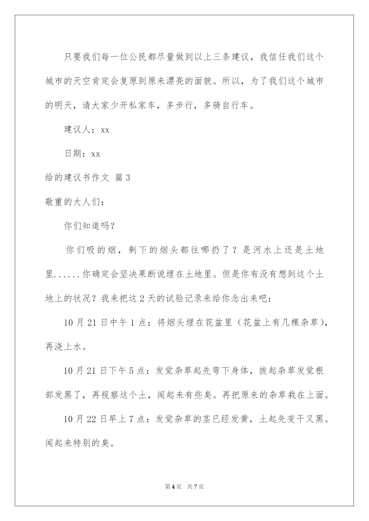 第PAGE\*Arabic\*MERGEFORMAT7页共NUMPAGES\*Arabic\*MERGEFORMAT7页第PAGE\*MERGEFORMAT7页共NUMPAGES\*MERGEFORMAT7页第PAGE\*MERGEFORMAT7页共NUMPAGES\*MERGEFORMAT7页第PAGE\*MERGEFORMAT7页共NUMPAGES\*MERGEFORMAT7页第PAGE\*MERGEFORMAT7页共NUMPAGES\*MERGEFORMAT7页第PAGE\*MERGEFORMAT7页共NUMPAGES\*MERGEFORMAT7页第PAGE\*MERGEFORMAT7页共NUMPAGES\*MERGEFORMAT7页第PAGE\*MERGEFORMAT7页共NUMPAGES\*MERGEFORMAT7页第PAGE\*MERGEFORMAT7页共NUMPAGES\*MERGEFORMAT7页第PAGE\*MERGEFORMAT7页共NUMPAGES\*MERGEFORMAT7页第PAGE\*MERGEFORMAT7页共NUMPAGES\*MERGEFORMAT7页2022给的建议书作文关于给的建议书作文4篇在学习、工作、生活中,大家都写过作文吧,借助作文人们可以反映客观事物、表达思想感情、传递学问信息。那么你知道一篇好的作文该怎么写吗?下面是我细心整理的给的建议书作文4篇,仅供参考,希望能够帮助到大家。给的建议书作文篇1尊敬的校长:您好!作为一个接近毕业的学生,出于对母校的酷爱,为了让这个校内更加漂亮,我向您提出一点儿建议。我希望学校能建设跑道。每一次上体育课,我们都会跑步,而每次跑步时扬起的风沙大都迷到了同学们的眼睛,也有许多同学,不仅仅是我们班的,都被小石子硌到或绊倒了,别看这是件小事,但有不少的同学因此流过血呢!之前,老校的跑道用沙石铺成的,很危急,而新校没有跑道,这不仅仅是受伤的问题,还有一点就是跑步时没有目标,不是跑大了圈就是跑小了的,很不便利,就连运动会的跑道也是用白灰撒的,很简单就磨掉了,如今,我建议建设跑道。我还想到了一些详细方法。第一,建设橡胶跑道,总长在400米左右。其次,完善后,建立一个制度:应爱护这跑道,不得破坏,违者记名处分。第三,找一位老师或其他人有时间监督看管好跑道。第四,假如有条件,要建设一些健身器械,如低年级小挚友玩的话题,高年级的单杠等等,并找专人看护。以上就是我的建议,望校长考虑接受。给的建议书作文篇2敬重的市长先生:您好!我是xx小学xx年级xx班的xx。特别感谢您能够在百忙之中抽出时间来看这封环境爱护建议书。我想和您聊一聊关于我们这个城市在环境爱护中出现的`问题。您有没有发觉,我们这个城市的天空变了颜色,从原来的湛蓝变成了灰白色;您有没有发觉,我们这个城市的汽车越来越多。人们认为有一辆私家车是富有的表现,有了一辆私家车,就认为自己在亲朋好友面前特殊的有面子。有些人家明明不须要车,但他们看别人都有一辆车,就也想买一辆车。有些小区为了省下一块停车场地,便把小区门口的人行横道上画满了停车线,人们只好走在公路上,躲避着来来往往的车辆,非常危急。有些居民为了省下一笔停车费,把车辆停在了小区的绿地上,那纤细的小草哪能承受住汽车这个硕大无朋的重量,早就压弯了腰。现在家家户户的生活都富有了起来,在大街上到处都是汽车的踪影,现在的人很少情愿走路,除了傍晚有老人在漫步,其他时间人们都是有车一族。摩托车、电动车、汽车,哪怕就是几步远的地方,人们也要驾驶着自己的爱车出行。这样一来,汽车尾气排放的越来越严峻,二氧化碳排放的也越来越严峻,我们的空气质量也越来越差。在此我提出几条建议:1、多供应公共交通方式,如:巴士等。2、增加对环境爱护的宣扬,让人们意识到开车的危害。3、让人们尽量用乘坐公共汽车,步行或骑自行车的方式出行。只要我们每一位公民都尽量做到以上三条建议,我信任我们这个城市的天空肯定会复原到原来漂亮的面貌。所以,为了我们这个城市的明天,请大家少开私家车,多步行,多骑自行车。建议人:xx日期:xx给的建议书作文篇3敬重的大人们:你们知道吗?你们吸的烟,剩下的烟头都往哪扔了?是河水上还是土地里......你确定会坚决果断说埋在土地里。但是你有没有想到这个土地上的状况?我来把这2天的试验记录来给你念出来吧:10月21日中午1点:将烟头埋在花盆里(花盆上有几棵杂草),再浇上水。10月21日下午5点:发觉杂草起先弯下身体,拔起杂草发觉根部发黑了,再视察这个土,闻起来有些臭。再把原来的杂草栽在上面。10月22日早上7点:发觉杂草的茎已经发黄