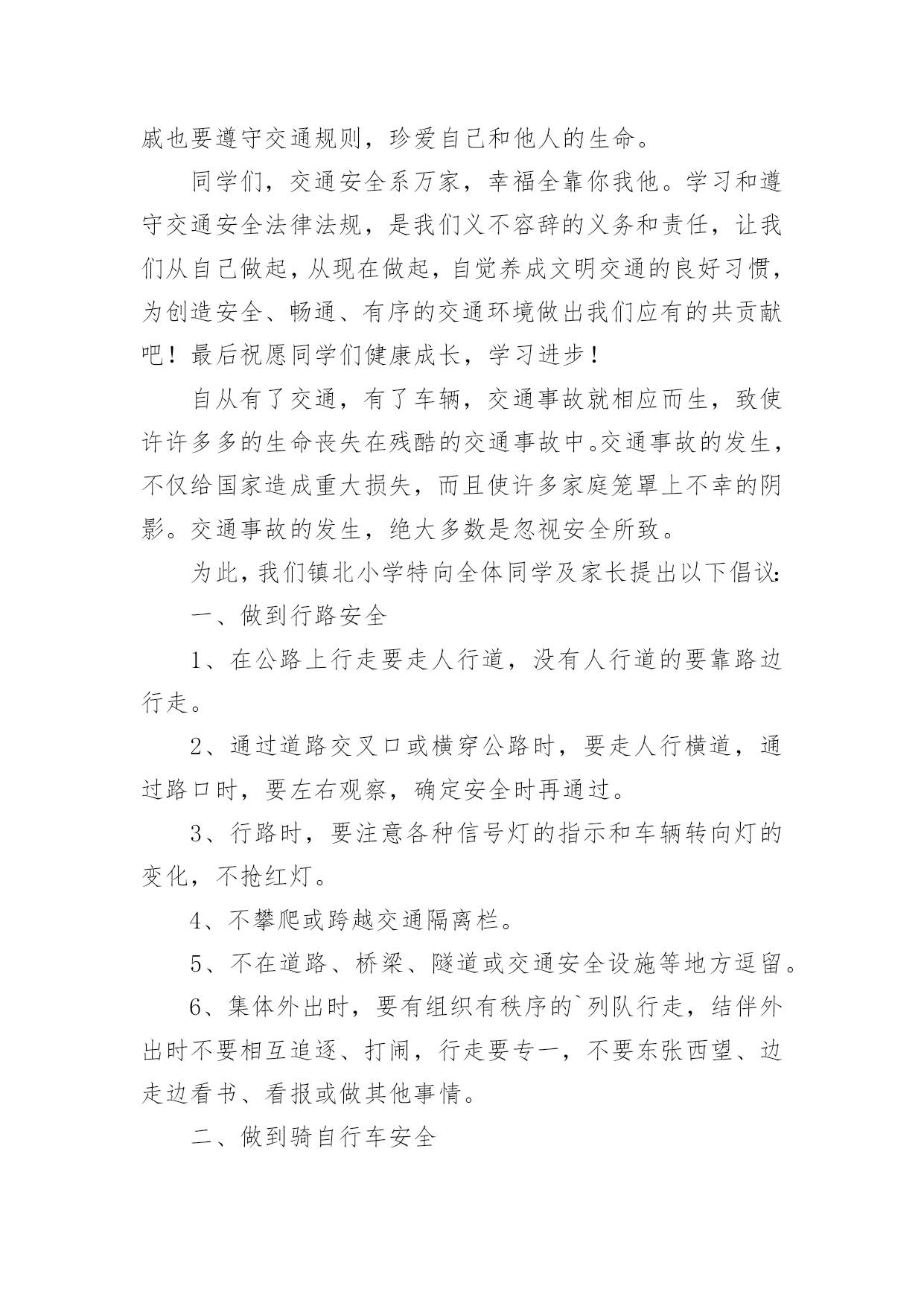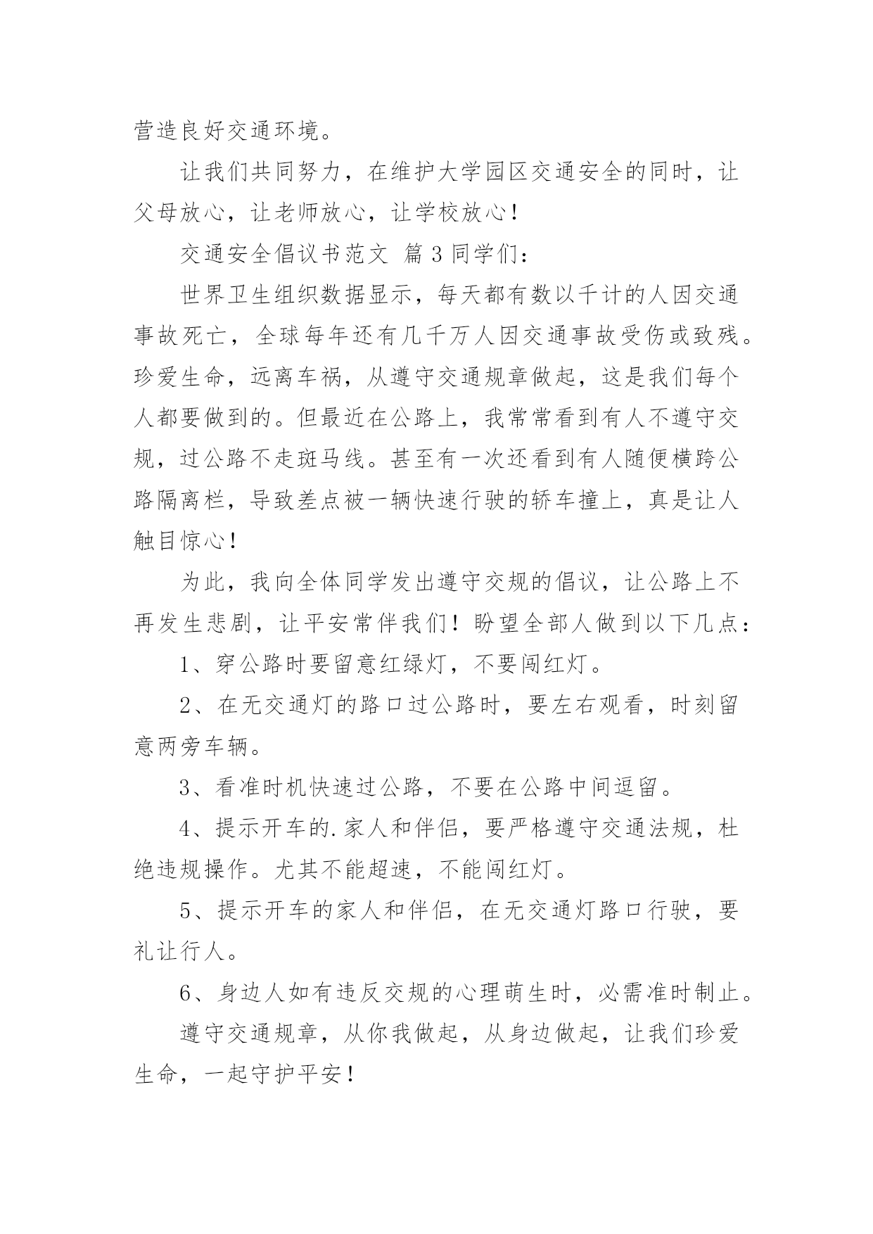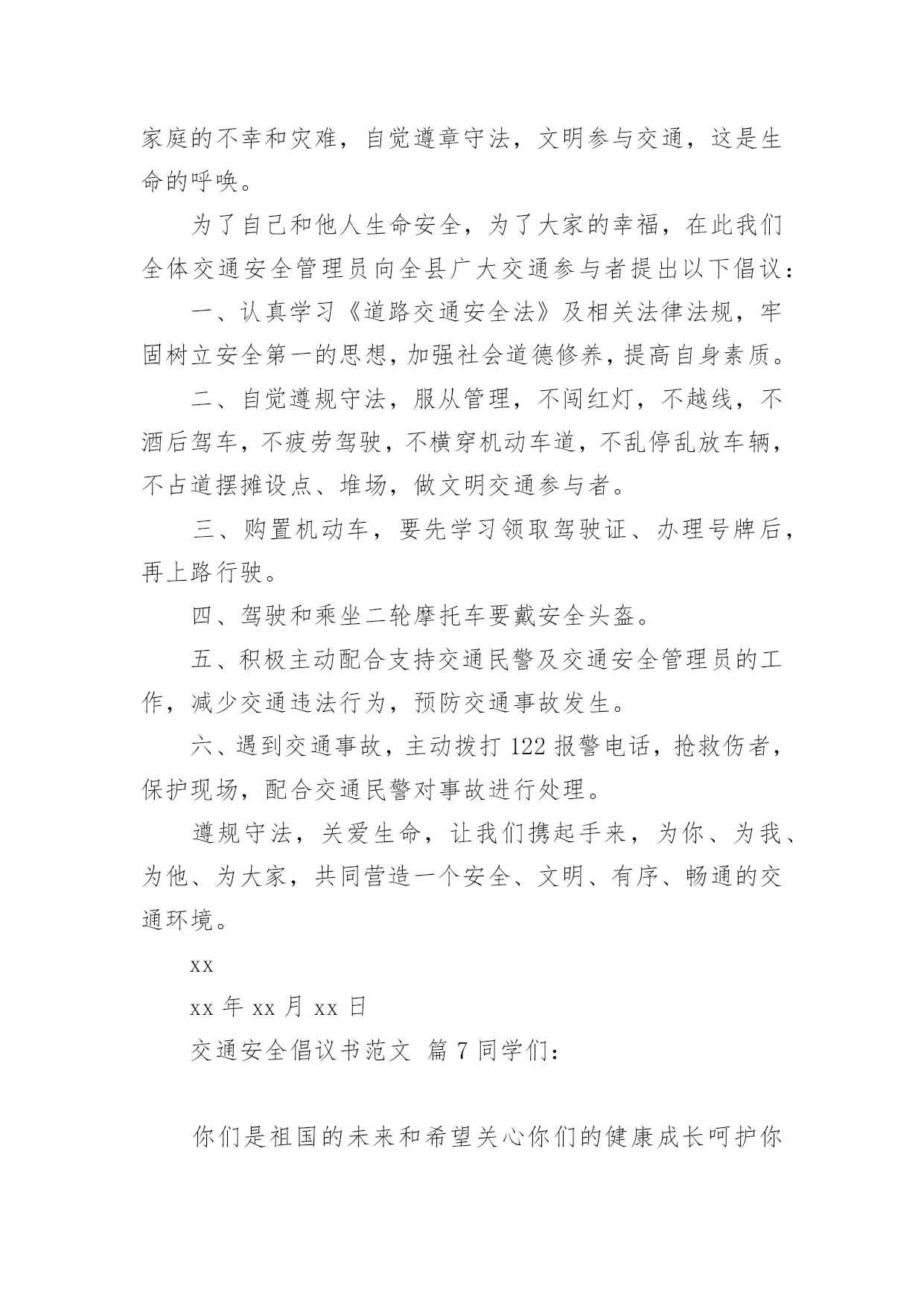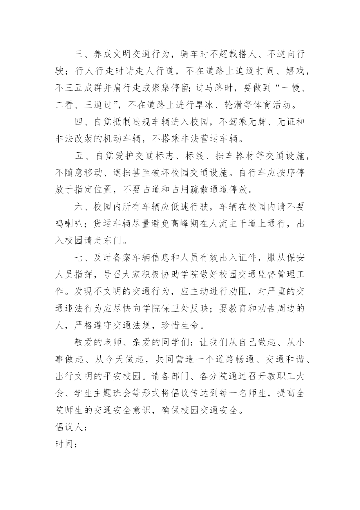 交通安全倡议书交通安全倡议书范文现如今,越来越多人会去使用倡议书,倡议书不是对某个人或某一小集体而发的,它的受众往往是广大群众,或是部门的所有人,或是一个地区的所有人,甚至是全国人民。那么问题来了,到底应如何写一份恰当的倡议书呢?以下是小编整理的交通安全倡议书范文,希望对大家有所帮助。交通安全倡议书范文篇1敬爱的老师、亲爱的同学们:安全平稳的校园环境是全院师生快乐工作、学习和生活的'基础。随着大家生活水平的提高,机动车辆与日俱增,交通事故隐患逐年增加。为进一步提高师生交通安全意识,规范校园交通行为,在12月2日第四个“全国交通安全日”来临之际,现发出校园交通安全倡议如下:一、认真学习各种有关交通安全的法律、法规和规章制度,树立交通安全文明意识,增强交通法制观念,积极宣传交通法规,争做交通安全志愿者和义务宣传员,为营造平安和谐校园环境尽到责任。二、在驾驶车辆时要提高警惕,谨慎驾驶,杜绝酒后开车、无证驾驶、逆向行驶、超速行驶以及在校园内违规学开机动车辆等存在严重安全隐患的行为;驾驶车辆应主动避让行人,避开上下课、学生聚集活动时间;车辆要在指定区域停放,要有序停放,不占道停放、不随意停放,不在绿化带上停放。三、养成文明交通行为,骑车时不超载搭人、不逆向行驶;行人行走时请走人行道,不在道路上追逐打闹、嬉戏,不三五成群并肩行走或聚集停留;过马路时,要做到“一慢、二看、三通过”,不在道路上进行旱冰、轮滑等体育活动。四、自觉抵制违规车辆进入校园,不驾乘无牌、无证和非法改装的机动车辆,不搭乘非法营运车辆。五、自觉爱护交通标志、标线、挡车器材等交通设施,不随意移动、遮挡甚至破坏校园交通设施。自行车应按序停放于指定位置,不要占道和占用疏散通道停放。六、校园内所有车辆应低速行驶,车辆在校园内请不要鸣喇叭;货运车辆尽量避免高峰期在人流主干道上通行,出入校园请走东门。七、及时备案车辆信息和人员有效出入证件,服从保安人员指挥,号召大家积极协助学院做好校园交通监督管理工作。发现不文明的交通行为,应主动进行劝阻,对严重的交通违法行为应尽快向学院保卫处反映;要教育和劝告周边的人,严格遵守交通法规,珍惜生命。敬爱的老师、亲爱的同学们:让我们从自己做起、从小事做起、从今天做起,共同营造一个道路畅通、交通和谐、出行文明的平安校园。请各部门、各分院通过召开教职工大会、学生主题班会等形式将倡议传达到每一名师生,提高全院师生的交通安全意识,确保校园交通安全。倡议人:时间:交通安全倡议书范文篇2亲爱的同学们:随着松江大学园区基础设施的日趋完善,校园规模也在日趋扩大。繁荣的校园,不息的人流,在让我们感到蓬勃朝气的同时,也存在着一定的交通隐患:擅闯红灯、乱穿马路、逆向行驶、双手脱把、相互飙车……为了一时的便利,生命之花悄然凋谢。在一幕幕血的教训面前,我们愕然、痛惜……而随后,红灯依旧擅闯,车辆依旧逆驶,惨案依旧发生。难道,这就是我们每天面对的交通环境?这就是我们作为一名知法、守法公民所愿面对的'吗?同学们,你可曾想到,在校园区内不注意交通安全的你会给家中守候的父母带去什么?是无尽的担心和忧愁;不遵守交通规则在马路上不文明行路的你会为身边的同学带去什么?是生命危险和隐患;当发生后懊悔不已的你又会为别人带去什么?是痛苦、悲伤和无奈……身为一名新世纪的大学生,在学习知识的同时,请勿忘珍惜自己和他人的生命,铭记交通安全。为了你我的生命安全,让我们共同学习、遵守交通法规,以法律法规约束自我,文明交通,做一个知法、懂法、守法的大学生。在此,上海对外贸易学院法学院特向松江大学城全体学生发出倡议:从我做起,加强交通安全意识;认真学习交通法规,遵纪守法,维护交通正常秩序;严格遵守交通规则,同时学会规避危险;积极倡导和发动周围的同学,共同遵守交通规则,营造良好交通环境。让我们共同努力,在维护大学园区交通安全的同时,让父母放心,让老师放心,让学校放心!交通安全倡议书范文篇3同学们:世界卫生组织数据显示,每天都有数以千计的人因交通事故死亡,全球每年还有几千万人因交通事故受伤或致残。珍爱生命,远离车祸,从遵守交通规章做起,这是我们每个人都要做到的。但最近在公路上,我常常看到有人不遵守交规,过公路不走斑马线。甚至有一次还看到有人随便横跨公路隔离栏,导致差点被一辆快速行驶的轿车撞上,真是让人触目惊心!为此,我向全体同学发出遵守交规的倡议,让公路上不再发生悲剧,让平安常伴我们!盼望全部人做到以下几点:1、穿公路时要留意红绿灯,不要闯红灯。2、在无交通灯的路口过公路时,要左右观看,时刻留意两旁车辆。3、看准时机快速过公路,不要在公路中间逗留。4、提示开车的.家人和伴侣,要严格遵守交通法规,杜绝违规操作。尤其不能超速,不能闯红灯。5、提示开车的家人和伴侣,在无交通灯路口行驶,要礼让行人。6、身边人如有违反交规