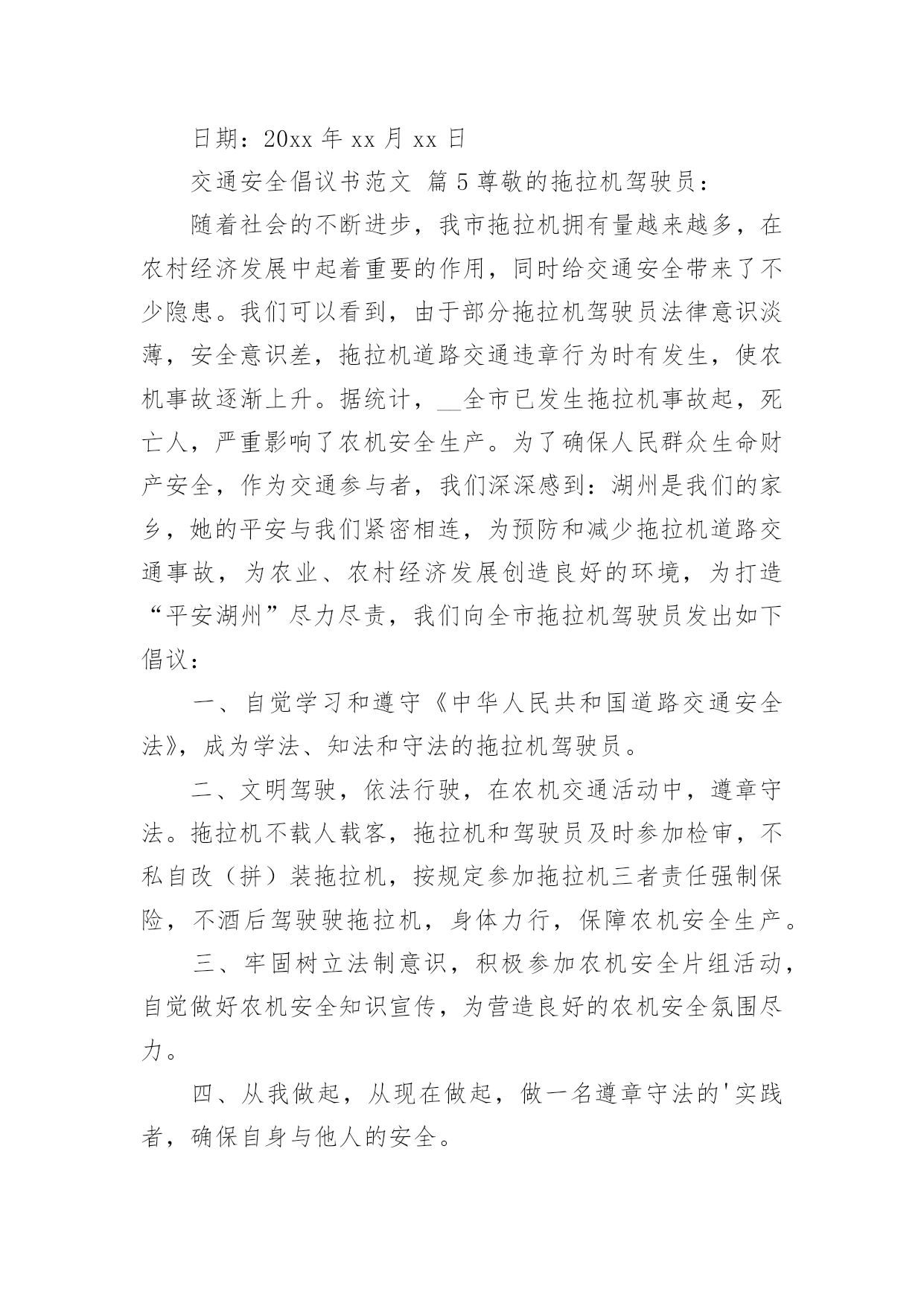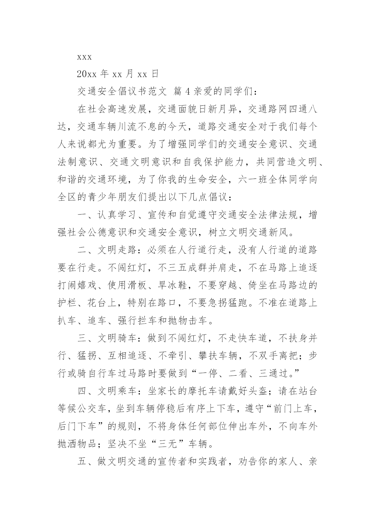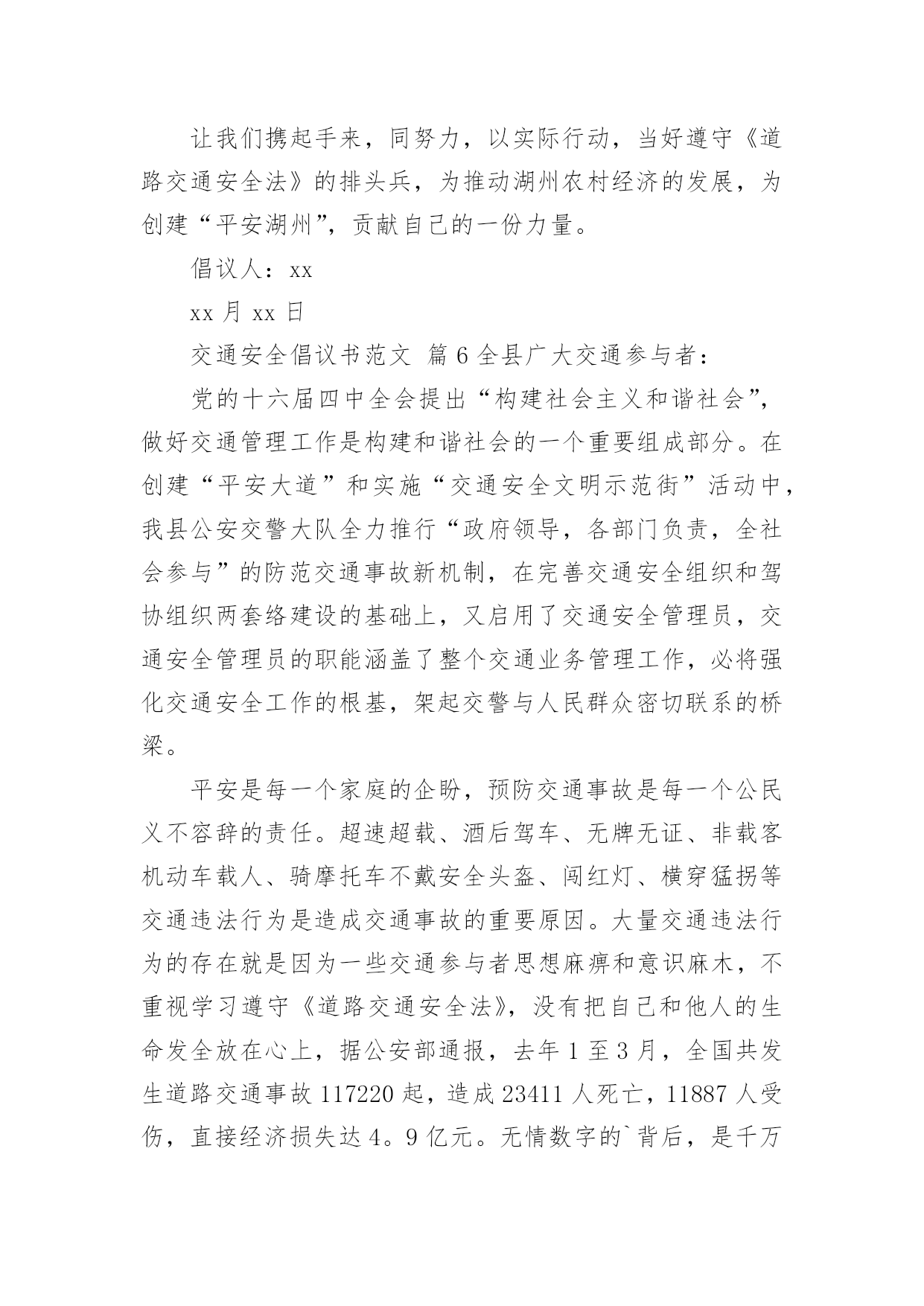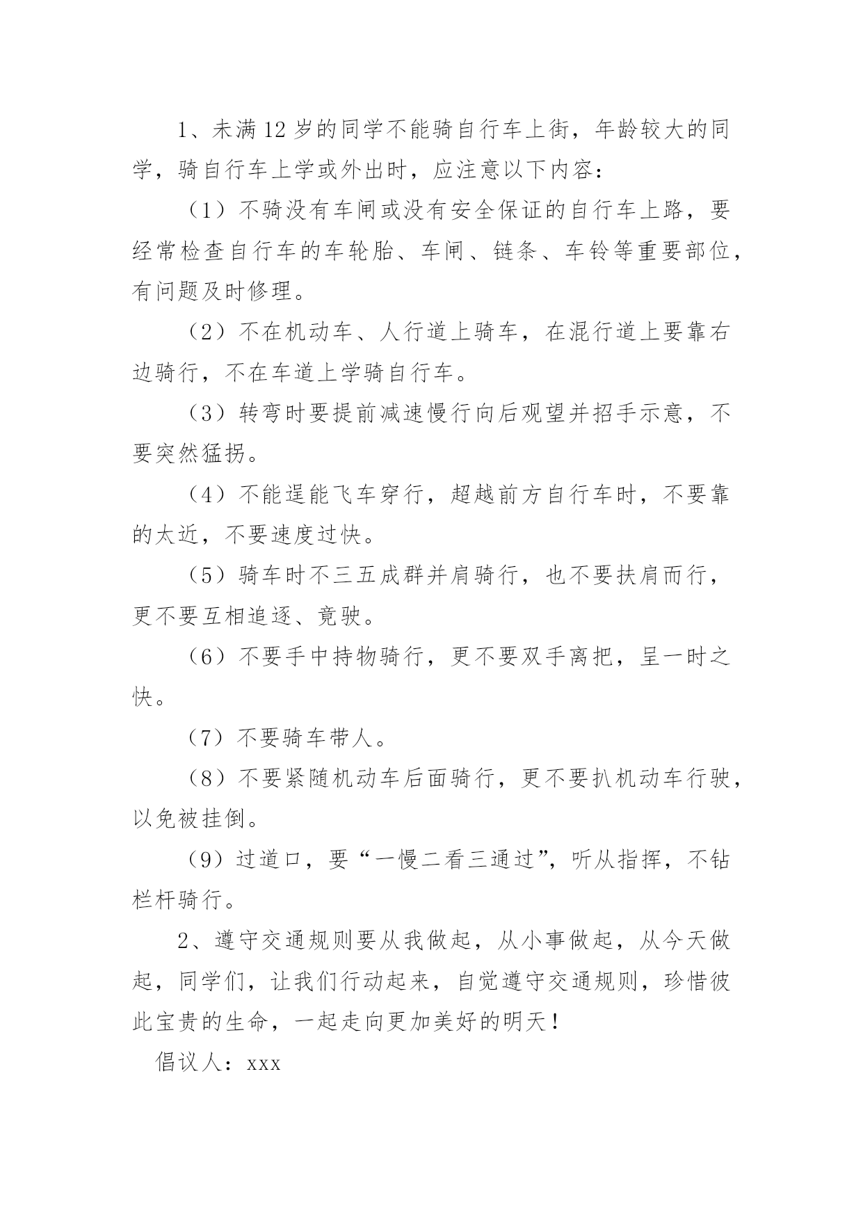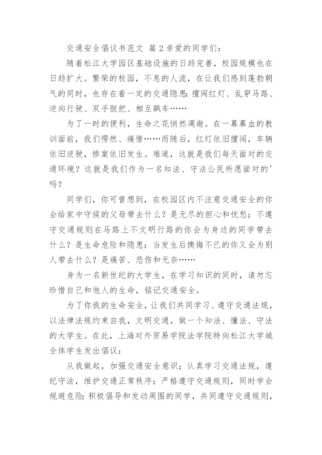 交通安全倡议书交通安全倡议书范文现如今,越来越多人会去使用倡议书,倡议书不是对某个人或某一小集体而发的,它的受众往往是广大群众,或是部门的所有人,或是一个地区的所有人,甚至是全国人民。那么问题来了,到底应如何写一份恰当的倡议书呢?以下是小编整理的交通安全倡议书范文,希望对大家有所帮助。交通安全倡议书范文篇1敬爱的老师、亲爱的同学们:安全平稳的校园环境是全院师生快乐工作、学习和生活的'基础。随着大家生活水平的提高,机动车辆与日俱增,交通事故隐患逐年增加。为进一步提高师生交通安全意识,规范校园交通行为,在12月2日第四个“全国交通安全日”来临之际,现发出校园交通安全倡议如下:一、认真学习各种有关交通安全的法律、法规和规章制度,树立交通安全文明意识,增强交通法制观念,积极宣传交通法规,争做交通安全志愿者和义务宣传员,为营造平安和谐校园环境尽到责任。二、在驾驶车辆时要提高警惕,谨慎驾驶,杜绝酒后开车、无证驾驶、逆向行驶、超速行驶以及在校园内违规学开机动车辆等存在严重安全隐患的行为;驾驶车辆应主动避让行人,避开上下课、学生聚集活动时间;车辆要在指定区域停放,要有序停放,不占道停放、不随意停放,不在绿化带上停放。三、养成文明交通行为,骑车时不超载搭人、不逆向行驶;行人行走时请走人行道,不在道路上追逐打闹、嬉戏,不三五成群并肩行走或聚集停留;过马路时,要做到“一慢、二看、三通过”,不在道路上进行旱冰、轮滑等体育活动。四、自觉抵制违规车辆进入校园,不驾乘无牌、无证和非法改装的机动车辆,不搭乘非法营运车辆。五、自觉爱护交通标志、标线、挡车器材等交通设施,不随意移动、遮挡甚至破坏校园交通设施。自行车应按序停放于指定位置,不要占道和占用疏散通道停放。六、校园内所有车辆应低速行驶,车辆在校园内请不要鸣喇叭;货运车辆尽量避免高峰期在人流主干道上通行,出入校园请走东门。七、及时备案车辆信息和人员有效出入证件,服从保安人员指挥,号召大家积极协助学院做好校园交通监督管理工作。发现不文明的交通行为,应主动进行劝阻,对严重的交通违法行为应尽快向学院保卫处反映;要教育和劝告周边的人,严格遵守交通法规,珍惜生命。敬爱的老师、亲爱的同学们:让我们从自己做起、从小事做起、从今天做起,共同营造一个道路畅通、交通和谐、出行文明的平安校园。请各部门、各分院通过召开教职工大会、学生主题班会等形式将倡议传达到每一名师生,提高全院师生的交通安全意识,确保校园交通安全。倡议人:时间:交通安全倡议书范文篇2亲爱的同学们:随着松江大学园区基础设施的日趋完善,校园规模也在日趋扩大。繁荣的校园,不息的人流,在让我们感到蓬勃朝气的同时,也存在着一定的交通隐患:擅闯红灯、乱穿马路、逆向行驶、双手脱把、相互飙车……为了一时的便利,生命之花悄然凋谢。在一幕幕血的教训面前,我们愕然、痛惜……而随后,红灯依旧擅闯,车辆依旧逆驶,惨案依旧发生。难道,这就是我们每天面对的交通环境?这就是我们作为一名知法、守法公民所愿面对的'吗?同学们,你可曾想到,在校园区内不注意交通安全的你会给家中守候的父母带去什么?是无尽的担心和忧愁;不遵守交通规则在马路上不文明行路的你会为身边的同学带去什么?是生命危险和隐患;当发生后懊悔不已的你又会为别人带去什么?是痛苦、悲伤和无奈……身为一名新世纪的大学生,在学习知识的同时,请勿忘珍惜自己和他人的生命,铭记交通安全。为了你我的生命安全,让我们共同学习、遵守交通法规,以法律法规约束自我,文明交通,做一个知法、懂法、守法的大学生。在此,上海对外贸易学院法学院特向松江大学城全体学生发出倡议:从我做起,加强交通安全意识;认真学习交通法规,遵纪守法,维护交通正常秩序;严格遵守交通规则,同时学会规避危险;积极倡导和发动周围的同学,共同遵守交通规则,营造良好交通环境。让我们共同努力,在维护大学园区交通安全的同时,让父母放心,让老师放心,让学校放心!交通安全倡议书范文篇3同学们:世界卫生组织数据显示,每天都有数以千计的人因交通事故死亡,全球每年还有几千万人因交通事故受伤或致残。珍爱生命,远离车祸,从遵守交通规章做起,这是我们每个人都要做到的。但最近在公路上,我常常看到有人不遵守交规,过公路不走斑马线。甚至有一次还看到有人随便横跨公路隔离栏,导致差点被一辆快速行驶的轿车撞上,真是让人触目惊心!为此,我向全体同学发出遵守交规的倡议,让公路上不再发生悲剧,让平安常伴我们!盼望全部人做到以下几点:1、穿公路时要留意红绿灯,不要闯红灯。2、在无交通灯的路口过公路时,要左右观看,时刻留意两旁车辆。3、看准时机快速过公路,不要在公路中间逗留。4、提示开车的.家人和伴侣,要严格遵守交通法规,杜绝违规操作。尤其不能超速,不能闯红灯。5、提示开车的家人和伴侣,在无交通灯路口行驶,要礼让行人。6、身边人如有违反交规