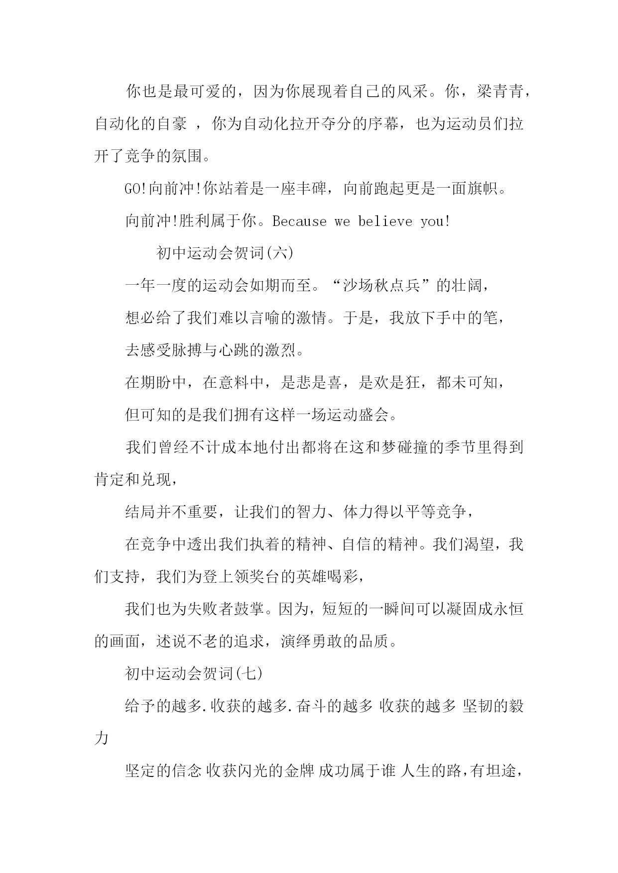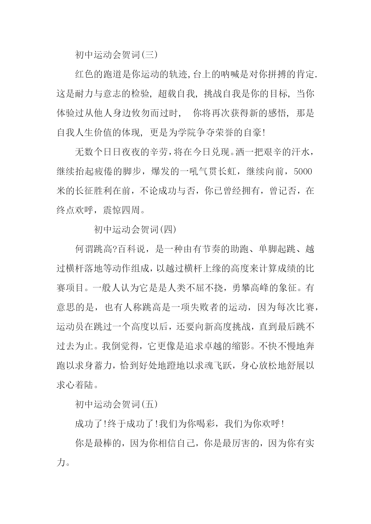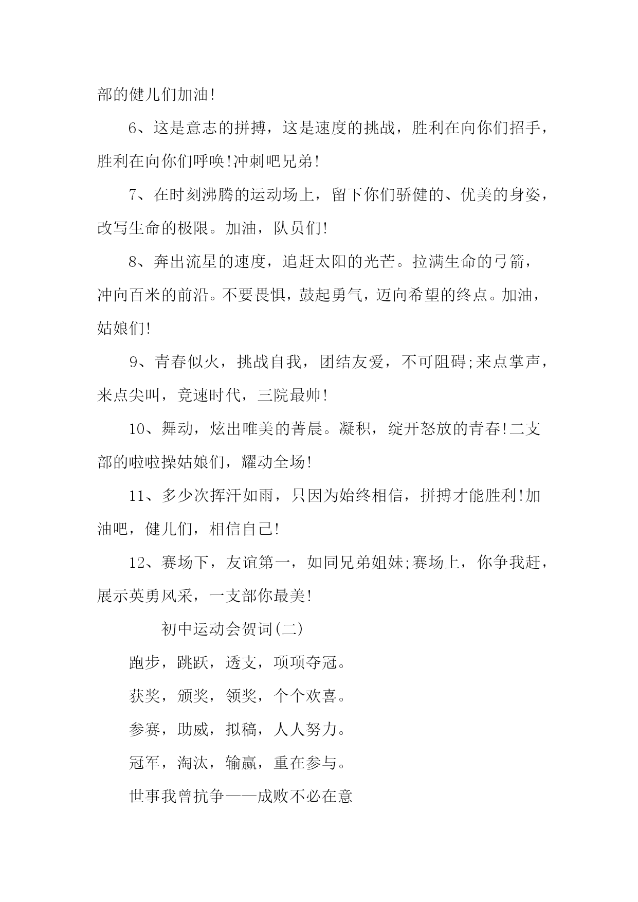 初中运动会贺词在飞扬的青春中,挥洒奔跑的汗水,迎着朝晖,释放朝气,以下是课堂作文网为大家搜集整理的初中运动会贺词,希望大家喜欢!初中运动会贺词(一)1、赛场上,你们传递的不是接力棒,更是火一样的热情!传递吧!奔跑吧!把我们一支部的友谊无限延长,为“三院梦”砥砺前行!2、如双截棍的接力棒,牵系着起点和终点。一支部4*400米混搭组合,牵动着我们一支部所有人的心弦,向着终点冲啊!3、一个灿烂明媚的十一月,一个丰收吉祥的十一月。欢声笑语,彩旗飘飘,第二届“新湘雅.世茂杯”青年运动会开幕了!内心的喜悦无法用语言来表达,千万个美丽的词汇也无法描述,昔日的努力要在今天得到考验,来吧,让今天的成功谱写新的未来!4、诺大的竞技场期待着你矫健的身影瑟瑟的秋风为你送来爽朗的气息。在你踏上跑道的那一刻,告诉自己,将信心进行到底。请微笑着跑完全程只要年轻的心还在蓬勃的跳动,就要大声告诉自己----将信心进行到底!5、在你脑中,有一个梦。要用努力为支部增添荣誉。茵茵运动场,谁是真的英雄?努力拼搏的你带给我们太多感动。八支部的健儿们加油!6、这是意志的拼搏,这是速度的挑战,胜利在向你们招手,胜利在向你们呼唤!冲刺吧兄弟!7、在时刻沸腾的运动场上,留下你们骄健的、优美的身姿,改写生命的极限。加油,队员们!8、奔出流星的速度,追赶太阳的光芒。拉满生命的弓箭,冲向百米的前沿。不要畏惧,鼓起勇气,迈向希望的终点。加油,姑娘们!9、青春似火,挑战自我,团结友爱,不可阻碍;来点掌声,来点尖叫,竞速时代,三院最帅!10、舞动,炫出唯美的菁晨。凝积,绽开怒放的青春!二支部的啦啦操姑娘们,耀动全场!11、多少次挥汗如雨,只因为始终相信,拼搏才能胜利!加油吧,健儿们,相信自己!12、赛场下,友谊第一,如同兄弟姐妹;赛场上,你争我赶,展示英勇风采,一支部你最美!初中运动会贺词(二)跑步,跳跃,透支,项项夺冠。获奖,颁奖,领奖,个个欢喜。参赛,助威,拟稿,人人努力。冠军,淘汰,输赢,重在参与。世事我曾抗争——成败不必在意初中运动会贺词(三)红色的跑道是你运动的轨迹,台上的呐喊是对你拼搏的肯定.这是耐力与意志的检验,超载自我,挑战自我是你的目标,当你体验过从他人身边攸勿而过时,你将再次获得新的感悟,那是自我人生价值的体现,更是为学院争夺荣誉的自豪!无数个日日夜夜的辛劳,将在今日兑现。洒一把艰辛的汗水,继续抬起疲倦的脚步,爆发的一吼气贯长虹,继续向前,5000米的长征胜利在前,不论成功与否,你已曾经拥有,曾记否,在终点欢呼,震惊四周。初中运动会贺词(四)何谓跳高?百科说,是一种由有节奏的助跑、单脚起跳、越过横杆落地等动作组成,以越过横杆上缘的高度来计算成绩的比赛项目。一般人认为它是是人类不屈不挠,勇攀高峰的象征。有意思的是,也有人称跳高是一项失败者的运动,因为每次比赛,运动员在跳过一个高度以后,还要向新高度挑战,直到最后跳不过去为止。我倒觉得,它更像是追求卓越的缩影。不快不慢地奔跑以求身蓄力,恰到好处地蹬地以求魂飞跃,身心放松地舒展以求心着陆。初中运动会贺词(五)成功了!终于成功了!我们为你喝彩,我们为你欢呼!你是最棒的,因为你相信自己,你是最厉害的,因为你有实力。你也是最可爱的,因为你展现着自己的风采。你,梁青青,自动化的自豪,你为自动化拉开夺分的序幕,也为运动员们拉开了竞争的氛围。GO!向前冲!你站着是一座丰碑,向前跑起更是一面旗帜。向前冲!胜利属于你。Becausewebelieveyou!初中运动会贺词(六)一年一度的运动会如期而至。“沙场秋点兵”的壮阔,想必给了我们难以言喻的激情。于是,我放下手中的笔,去感受脉搏与心跳的激烈。在期盼中,在意料中,是悲是喜,是欢是狂,都未可知,但可知的是我们拥有这样一场运动盛会。我们曾经不计成本地付出都将在这和梦碰撞的季节里得到肯定和兑现,结局并不重要,让我们的智力、体力得以平等竞争,在竞争中透出我们执着的精神、自信的精神。我们渴望,我们支持,我们为登上领奖台的英雄喝彩,我们也为失败者鼓掌。因为,短短的一瞬间可以凝固成永恒的画面,述说不老的追求,演绎勇敢的品质。初中运动会贺词(七)给予的越多.收获的越多.奋斗的越多收获的越多坚韧的毅力坚定的信念收获闪光的金牌成功属于谁人生的路,有坦途,也有坎坷;做过的岁月,有欢笑,也有苦涩,泪水告诉我一个跌倒的故事,汗水使我多了一份沉重,几多成熟。理想毕竟不同于现实,失败是生活的一部分,谁也无法选择,无法拒绝。人生要自己去拼搏,去奋斗,在风雨中百折不挠勇往前进,在集资的每个驿站上都留下一段不悔的回忆。流泪不是失落,徘徊不是迷惑,成功属于那些战胜失败,坚持不懈、勇于追求梦想的人。加油吧,运动健儿们!初中运动会贺词(八)生活中,我们每天都在尝试尝试中,我们走向成功品味失败,走过心灵的阴雨晴空运动员们,不要放弃