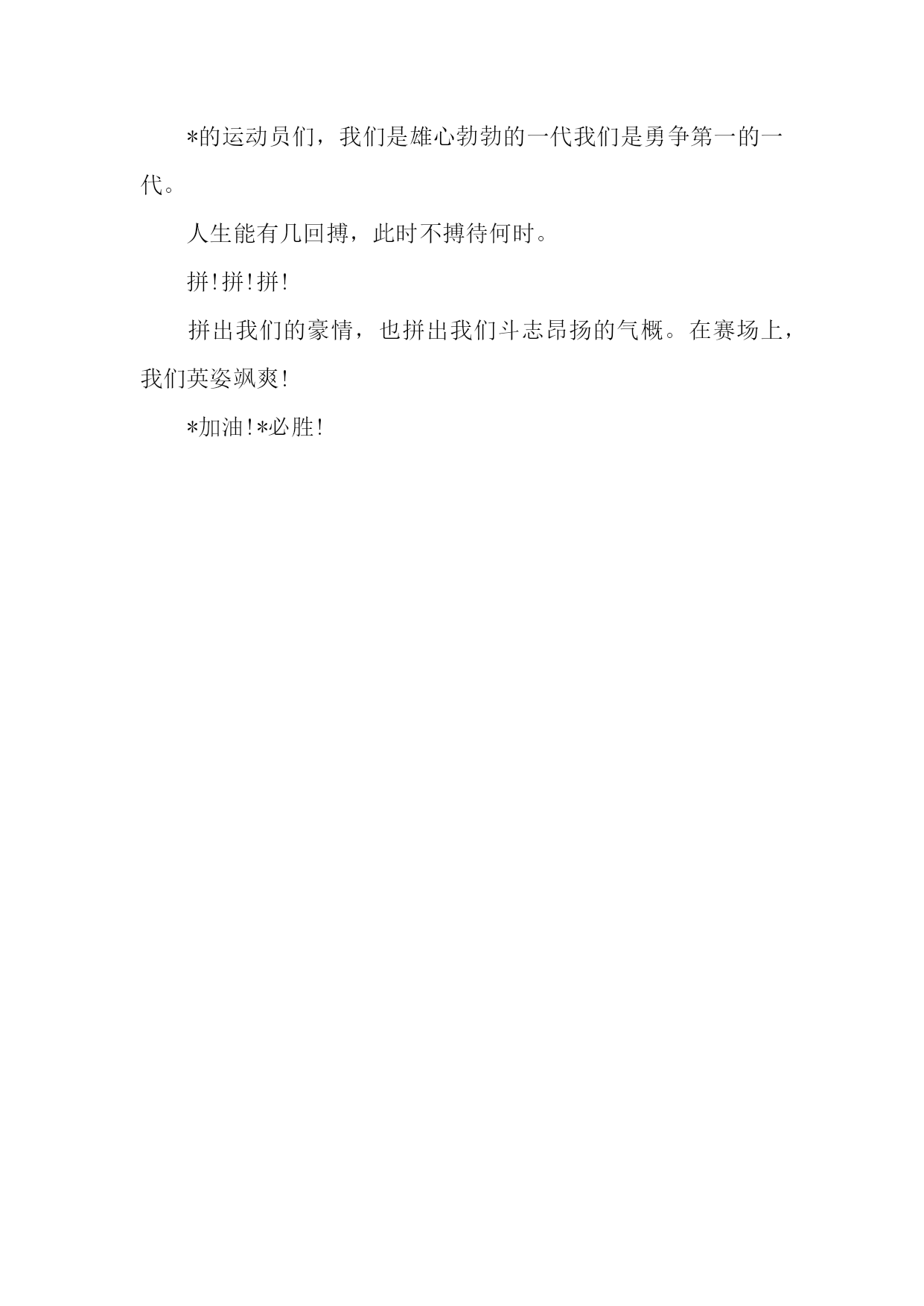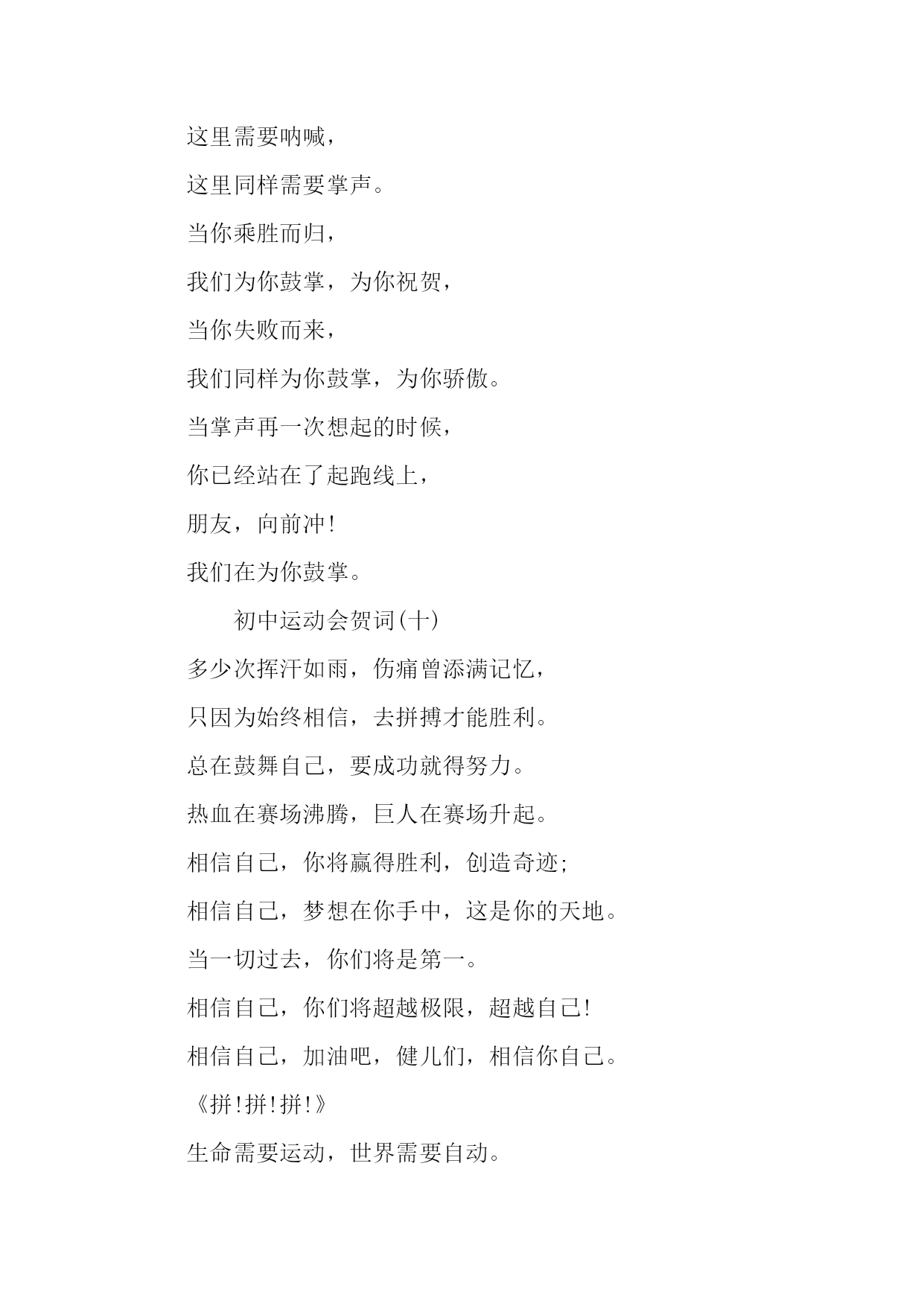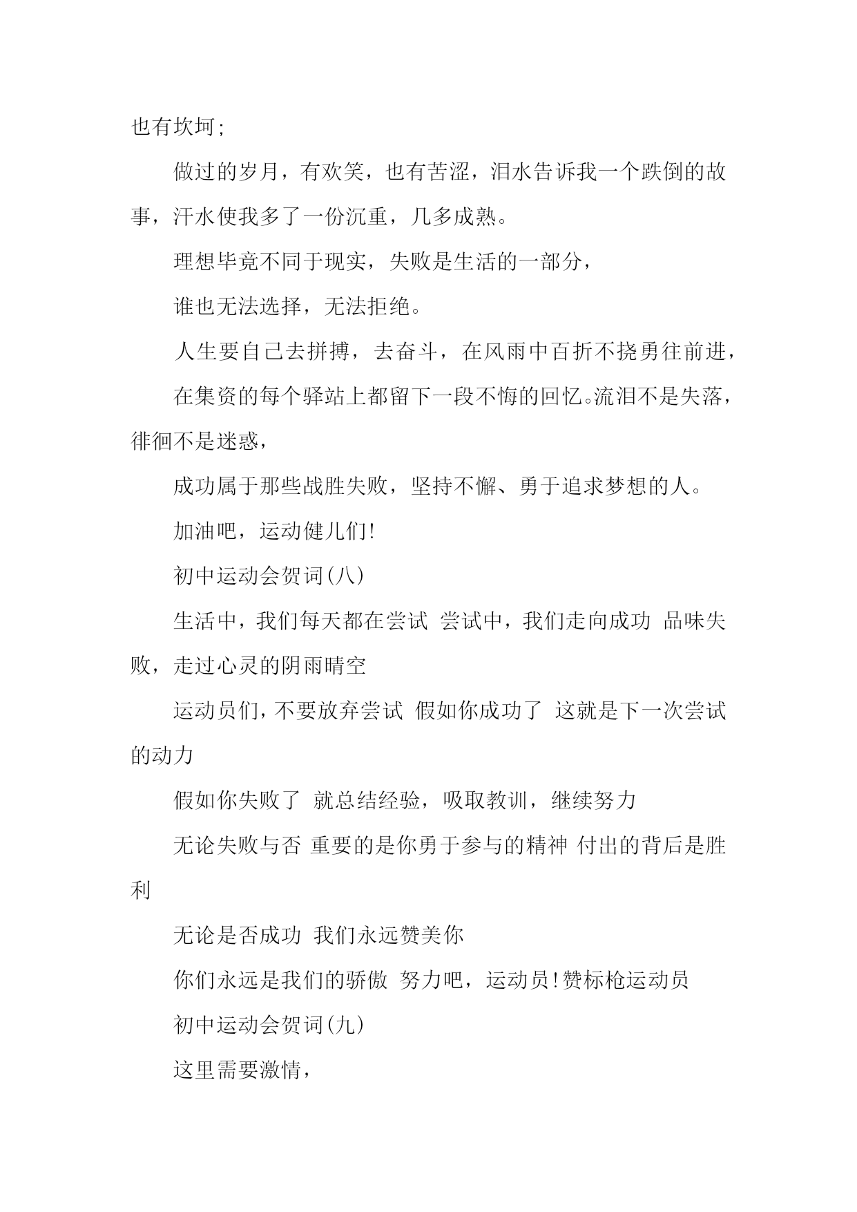 初中运动会贺词在飞扬的青春中,挥洒奔跑的汗水,迎着朝晖,释放朝气,以下是课堂作文网为大家搜集整理的初中运动会贺词,希望大家喜欢!初中运动会贺词(一)1、赛场上,你们传递的不是接力棒,更是火一样的热情!传递吧!奔跑吧!把我们一支部的友谊无限延长,为“三院梦”砥砺前行!2、如双截棍的接力棒,牵系着起点和终点。一支部4*400米混搭组合,牵动着我们一支部所有人的心弦,向着终点冲啊!3、一个灿烂明媚的十一月,一个丰收吉祥的十一月。欢声笑语,彩旗飘飘,第二届“新湘雅.世茂杯”青年运动会开幕了!内心的喜悦无法用语言来表达,千万个美丽的词汇也无法描述,昔日的努力要在今天得到考验,来吧,让今天的成功谱写新的未来!4、诺大的竞技场期待着你矫健的身影瑟瑟的秋风为你送来爽朗的气息。在你踏上跑道的那一刻,告诉自己,将信心进行到底。请微笑着跑完全程只要年轻的心还在蓬勃的跳动,就要大声告诉自己----将信心进行到底!5、在你脑中,有一个梦。要用努力为支部增添荣誉。茵茵运动场,谁是真的英雄?努力拼搏的你带给我们太多感动。八支部的健儿们加油!6、这是意志的拼搏,这是速度的挑战,胜利在向你们招手,胜利在向你们呼唤!冲刺吧兄弟!7、在时刻沸腾的运动场上,留下你们骄健的、优美的身姿,改写生命的极限。加油,队员们!8、奔出流星的速度,追赶太阳的光芒。拉满生命的弓箭,冲向百米的前沿。不要畏惧,鼓起勇气,迈向希望的终点。加油,姑娘们!9、青春似火,挑战自我,团结友爱,不可阻碍;来点掌声,来点尖叫,竞速时代,三院最帅!10、舞动,炫出唯美的菁晨。凝积,绽开怒放的青春!二支部的啦啦操姑娘们,耀动全场!11、多少次挥汗如雨,只因为始终相信,拼搏才能胜利!加油吧,健儿们,相信自己!12、赛场下,友谊第一,如同兄弟姐妹;赛场上,你争我赶,展示英勇风采,一支部你最美!初中运动会贺词(二)跑步,跳跃,透支,项项夺冠。获奖,颁奖,领奖,个个欢喜。参赛,助威,拟稿,人人努力。冠军,淘汰,输赢,重在参与。世事我曾抗争——成败不必在意初中运动会贺词(三)红色的跑道是你运动的轨迹,台上的呐喊是对你拼搏的肯定.这是耐力与意志的检验,超载自我,挑战自我是你的目标,当你体验过从他人身边攸勿而过时,你将再次获得新的感悟,那是自我人生价值的体现,更是为学院争夺荣誉的自豪!无数个日日夜夜的辛劳,将在今日兑现。洒一把艰辛的汗水,继续抬起疲倦的脚步,爆发的一吼气贯长虹,继续向前,5000米的长征胜利在前,不论成功与否,你已曾经拥有,曾记否,在终点欢呼,震惊四周。初中运动会贺词(四)何谓跳高?百科说,是一种由有节奏的助跑、单脚起跳、越过横杆落地等动作组成,以越过横杆上缘的高度来计算成绩的比赛项目。一般人认为它是是人类不屈不挠,勇攀高峰的象征。有意思的是,也有人称跳高是一项失败者的运动,因为每次比赛,运动员在跳过一个高度以后,还要向新高度挑战,直到最后跳不过去为止。我倒觉得,它更像是追求卓越的缩影。不快不慢地奔跑以求身蓄力,恰到好处地蹬地以求魂飞跃,身心放松地舒展以求心着陆。初中运动会贺词(五)成功了!终于成功了!我们为你喝彩,我们为你欢呼!你是最棒的,因为你相信自己,你是最厉害的,因为你有实力。你也是最可爱的,因为你展现着自己的风采。你,梁青青,自动化的自豪,你为自动化拉开夺分的序幕,也为运动员们拉开了竞争的氛围。GO!向前冲!你站着是一座丰碑,向前跑起更是一面旗帜。向前冲!胜利属于你。Becausewebelieveyou!初中运动会贺词(六)一年一度的运动会如期而至。“沙场秋点兵”的壮阔,想必给了我们难以言喻的激情。于是,我放下手中的笔,去感受脉搏与心跳的激烈。在期盼中,在意料中,是悲是喜,是欢是狂,都未可知,但可知的是我们拥有这样一场运动盛会。我们曾经不计成本地付出都将在这和梦碰撞的季节里得到肯定和兑现,结局并不重要,让我们的智力、体力得以平等竞争,在竞争中透出我们执着的精神、自信的精神。我们渴望,我们支持,我们为登上领奖台的英雄喝彩,我们也为失败者鼓掌。因为,短短的一瞬间可以凝固成永恒的画面,述说不老的追求,演绎勇敢的品质。初中运动会贺词(七)给予的越多.收获的越多.奋斗的越多收获的越多坚韧的毅力坚定的信念收获闪光的金牌成功属于谁人生的路,有坦途,也有坎坷;做过的岁月,有欢笑,也有苦涩,泪水告诉我一个跌倒的故事,汗水使我多了一份沉重,几多成熟。理想毕竟不同于现实,失败是生活的一部分,谁也无法选择,无法拒绝。人生要自己去拼搏,去奋斗,在风雨中百折不挠勇往前进,在集资的每个驿站上都留下一段不悔的回忆。流泪不是失落,徘徊不是迷惑,成功属于那些战胜失败,坚持不懈、勇于追求梦想的人。加油吧,运动健儿们!初中运动会贺词(八)生活中,我们每天都在尝试尝试中,我们走向成功品味失败,走过心灵的阴雨晴空运动员们,不要放弃