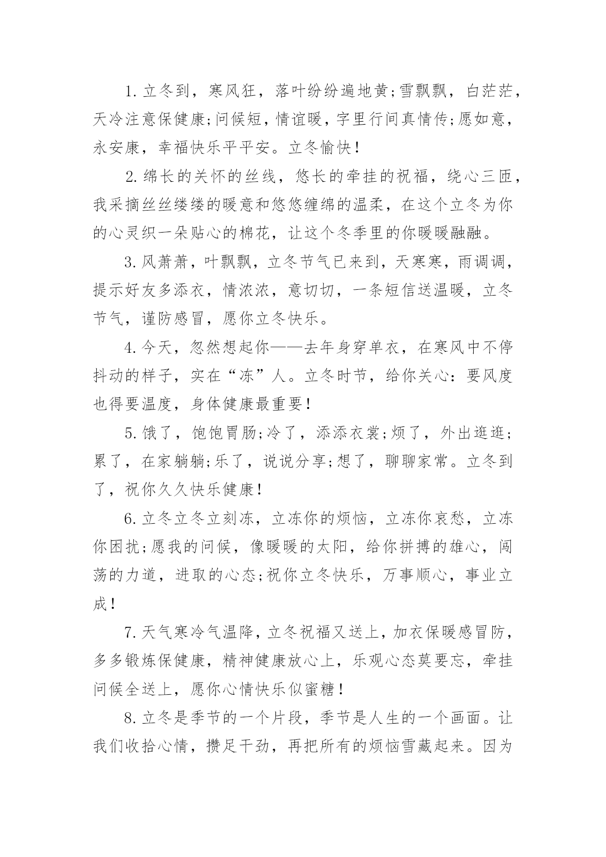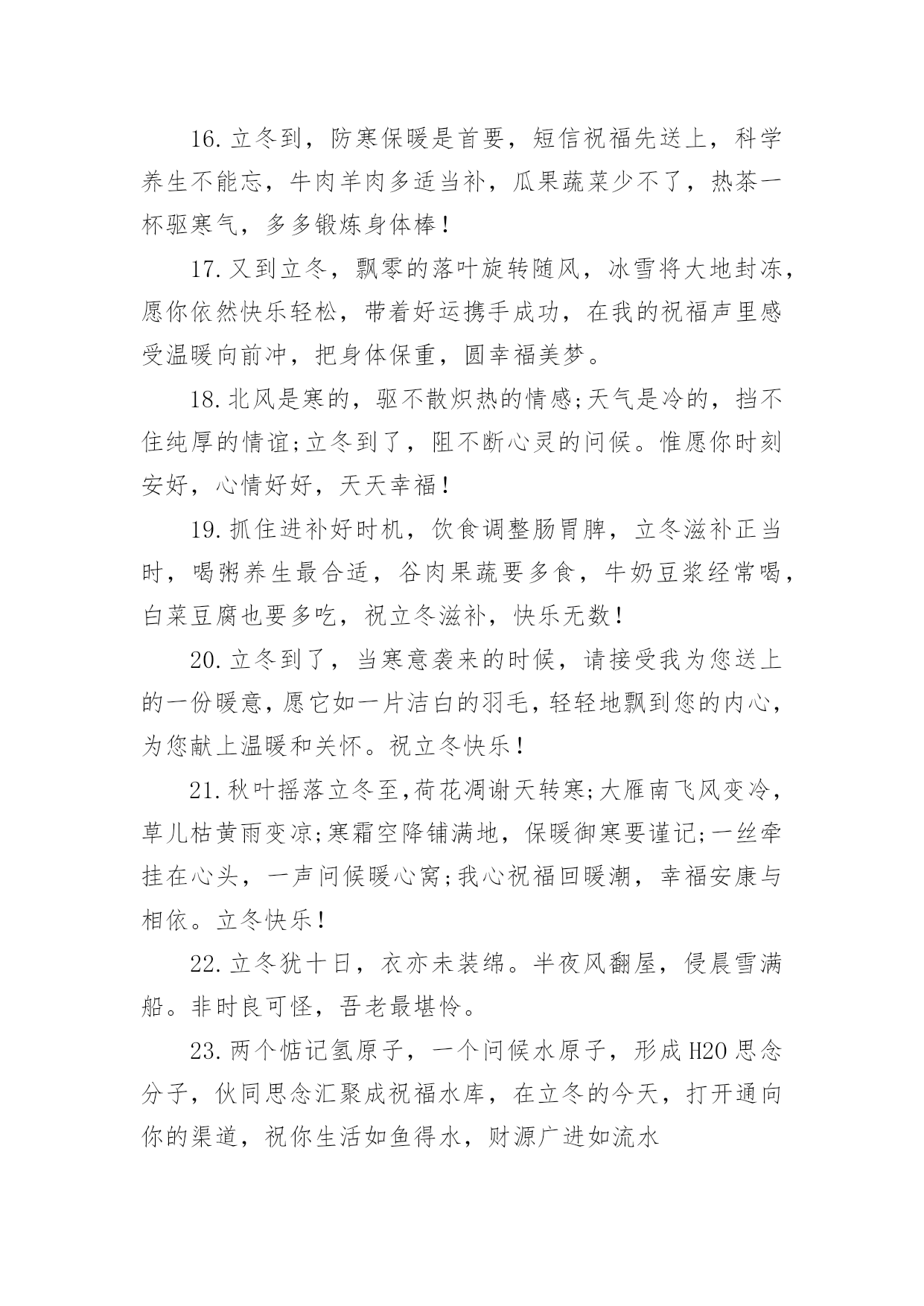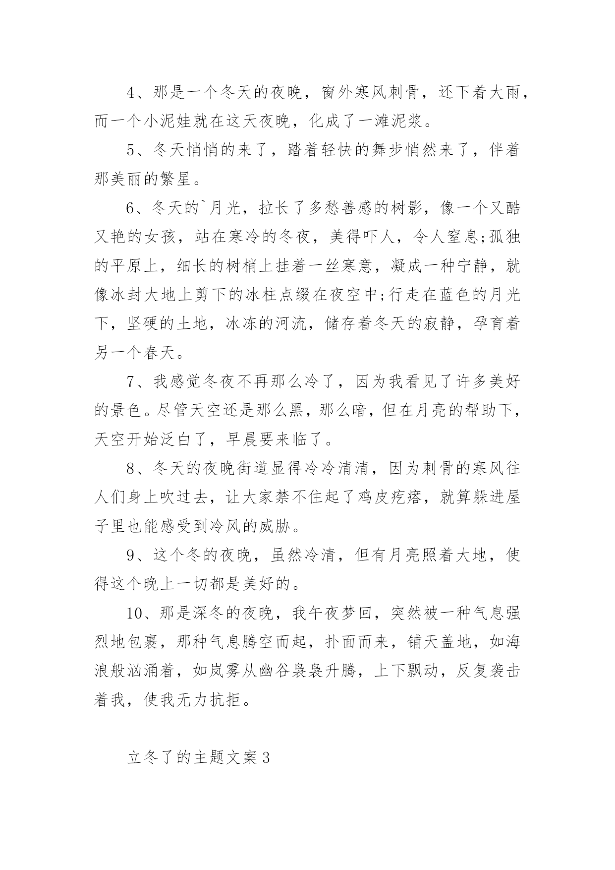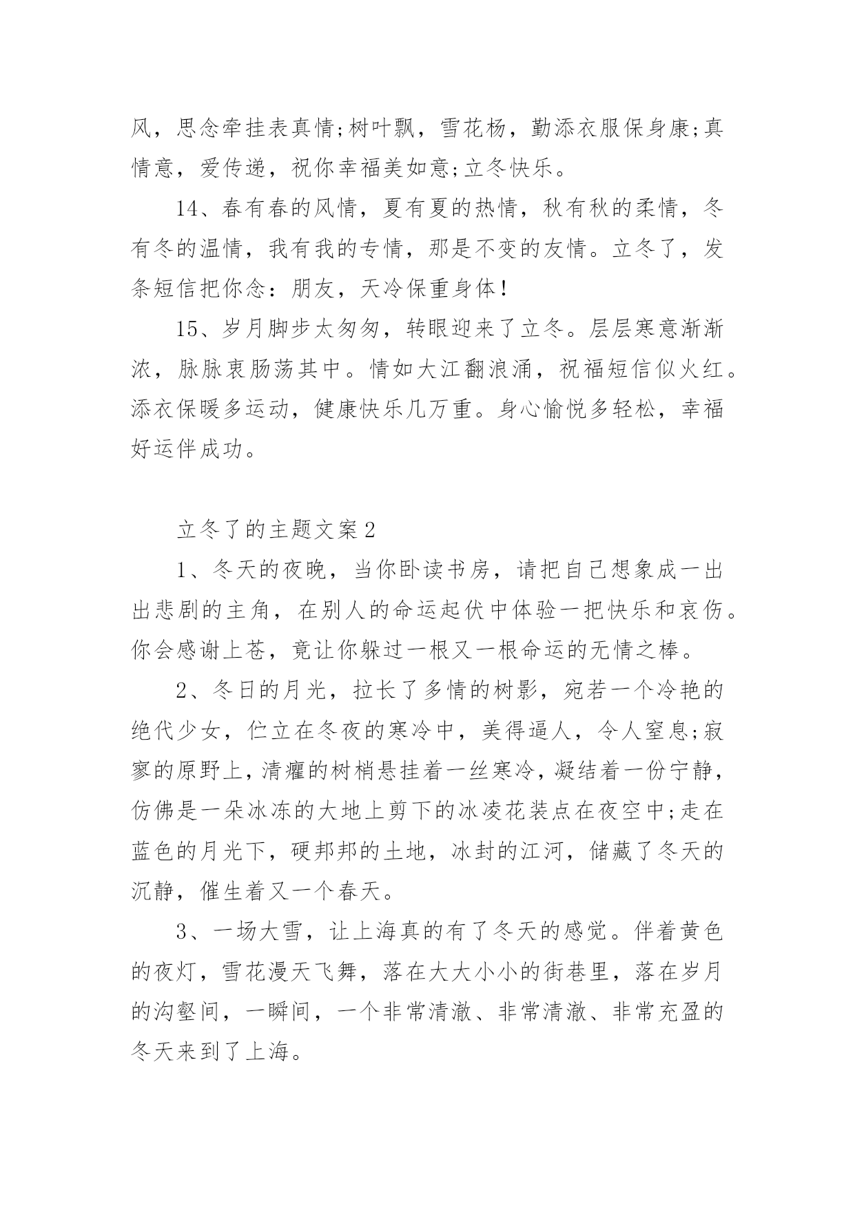 立冬了的主题文案随着社交网络的兴起,越来越多人会在朋友圈发布文案,文案用于记录和分享生活中有意义的事。什么样的文案才经典呢?下面是小编整理的立冬了的主题文案,欢迎阅读与收藏。立冬了的主题文案11、北风狂吼百草衰,千树万树寒梅开;花中君子情豪迈,天寒地冻暖常在;发条短信传关爱,祝福两端系开怀;祝立冬身体康健,问候声音不断!2、眨眼立冬降临,忍不住发条短信提醒你:天冷多注意,添衣保暖防病袭;保持好心情,莫要烦躁坏情绪;有空时多联系,温馨短信带去温暖!祝身康体健,快乐如意,好运继续!3、用立冬的暖阳为你煲汤,用立冬的冰霜为你沏茶,用立冬的雪雨为你淋浴;愿你用立冬冰霜雪雨,封住忧烦苦闷,强健你的身心灵魂;祝你立冬快乐,大展宏图,步步高升!4、冰雪封冻的只是时间而不是挂念,黑暗驱赶的只是距离而不是亲切,寒冷困住的只是感觉而不是真心,今日立冬,我的心,愿你能懂,祝你快乐!5、立冬了,降温了,叶落的声音风儿知道,草枯的萧瑟大地知道,寒冷的温度北风知道,雪舞的日子季节知道,转眼冬天已来到,温暖的祝福马上就到!6、冬天最幽默,收起万物假装沉默;冬天最感伤,西风北风轮流坐庄;冬天最真实,万事万物放慢脚步;冬天最温暖,送去祝福,安康一生,立冬快乐!7、拉着立冬的手,我要狮子大开口,不让寒意跟你走。借天地一场风,把你烦恼全清空;借日月一束光,把你心房来温暖;借思念一点情,让快乐围绕你身边。祝你快乐幸福一冬天!8、立冬天气寒了,朋友联谊勤了。衣服穿的暖了,友谊情感深了。冬季农活闲了,走亲串友忙了。短信传递多了,亲情友亲近了。幸福吉祥乐了,美满健康笑了。9、立冬节气,万事皆立。衣食无忧,安身立命。爱情甜蜜,成家立业。性格坚韧,顶天立地。事业辉煌,建功立业。祝你成功,立冬快乐。10、立冬祝福暖又暖,千里相隔一条心;阴晴圆缺都面对,苦辣酸甜两人分;无论成功与失败,我是永远支持你的粉。立冬快乐,指端情深。11、为了保暖多吃饭,吃饱盖被睡好觉。虽说起早爱偷懒,身外衣服要增厚。不要光顾看手机,勿忘冬眠时间到。雪花漫飘立冬来,发条短信逗你笑。12、立冬到了,愿你的事业无往不利,愿你的运气大吉大利,愿你的生活顺顺利利,愿你的老婆漂亮美丽。祝你立冬快乐,愿你笑口常开!13、立冬至,寒意浓,短信问候遥相送;雾蒙蒙,霜如风,思念牵挂表真情;树叶飘,雪花杨,勤添衣服保身康;真情意,爱传递,祝你幸福美如意;立冬快乐。14、春有春的风情,夏有夏的热情,秋有秋的柔情,冬有冬的温情,我有我的专情,那是不变的友情。立冬了,发条短信把你念:朋友,天冷保重身体!15、岁月脚步太匆匆,转眼迎来了立冬。层层寒意渐渐浓,脉脉衷肠荡其中。情如大江翻浪涌,祝福短信似火红。添衣保暖多运动,健康快乐几万重。身心愉悦多轻松,幸福好运伴成功。立冬了的主题文案21、冬天的夜晚,当你卧读书房,请把自己想象成一出出悲剧的主角,在别人的命运起伏中体验一把快乐和哀伤。你会感谢上苍,竟让你躲过一根又一根命运的无情之棒。2、冬日的月光,拉长了多情的树影,宛若一个冷艳的绝代少女,伫立在冬夜的寒冷中,美得逼人,令人窒息;寂寥的原野上,清癯的树梢悬挂着一丝寒冷,凝结着一份宁静,仿佛是一朵冰冻的大地上剪下的冰凌花装点在夜空中;走在蓝色的月光下,硬邦邦的土地,冰封的江河,储藏了冬天的沉静,催生着又一个春天。3、一场大雪,让上海真的有了冬天的感觉。伴着黄色的夜灯,雪花漫天飞舞,落在大大小小的街巷里,落在岁月的沟壑间,一瞬间,一个非常清澈、非常清澈、非常充盈的冬天来到了上海。4、那是一个冬天的夜晚,窗外寒风刺骨,还下着大雨,而一个小泥娃就在这天夜晚,化成了一滩泥浆。5、冬天悄悄的来了,踏着轻快的舞步悄然来了,伴着那美丽的繁星。6、冬天的`月光,拉长了多愁善感的树影,像一个又酷又艳的女孩,站在寒冷的冬夜,美得吓人,令人窒息;孤独的平原上,细长的树梢上挂着一丝寒意,凝成一种宁静,就像冰封大地上剪下的冰柱点缀在夜空中;行走在蓝色的月光下,坚硬的土地,冰冻的河流,储存着冬天的寂静,孕育着另一个春天。7、我感觉冬夜不再那么冷了,因为我看见了许多美好的景色。尽管天空还是那么黑,那么暗,但在月亮的帮助下,天空开始泛白了,早晨要来临了。8、冬天的夜晚街道显得冷冷清清,因为刺骨的寒风往人们身上吹过去,让大家禁不住起了鸡皮疙瘩,就算躲进屋子里也能感受到冷风的威胁。9、这个冬的夜晚,虽然冷清,但有月亮照着大地,使得这个晚上一切都是美好的。10、那是深冬的夜晚,我午夜梦回,突然被一种气息强烈地包裹,那种气息腾空而起,扑面而来,铺天盖地,如海浪般汹涌着,如岚雾从幽谷袅袅升腾,上下飘动,反复袭击着我,使我无力抗拒。立冬了的主题文案31.立冬到,寒风狂,落叶纷纷遍地黄;雪飘飘,白茫茫,天冷注意保健康;问候短,情谊暖,字里行间真情传;愿如意,永安康,幸福快乐平平
