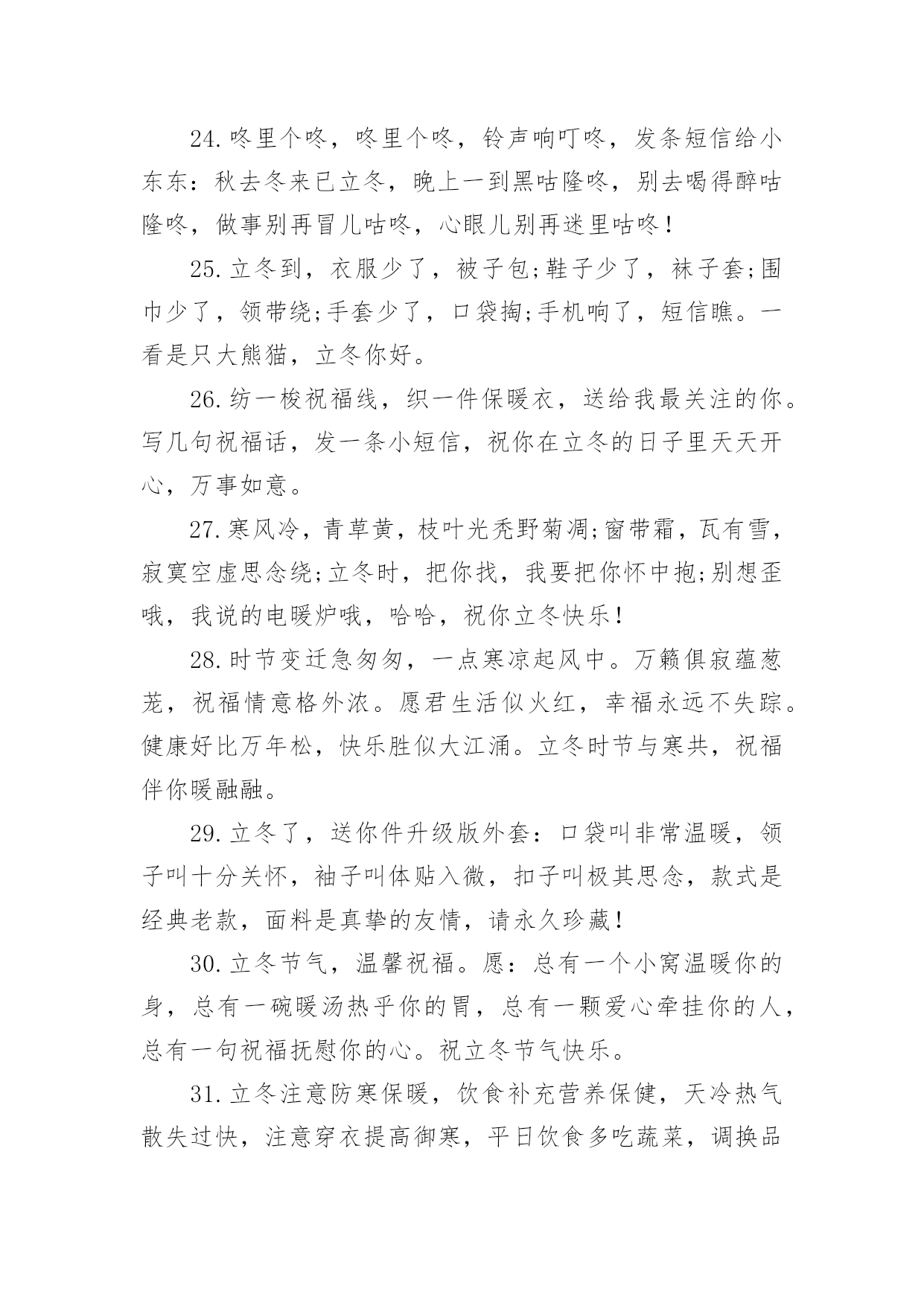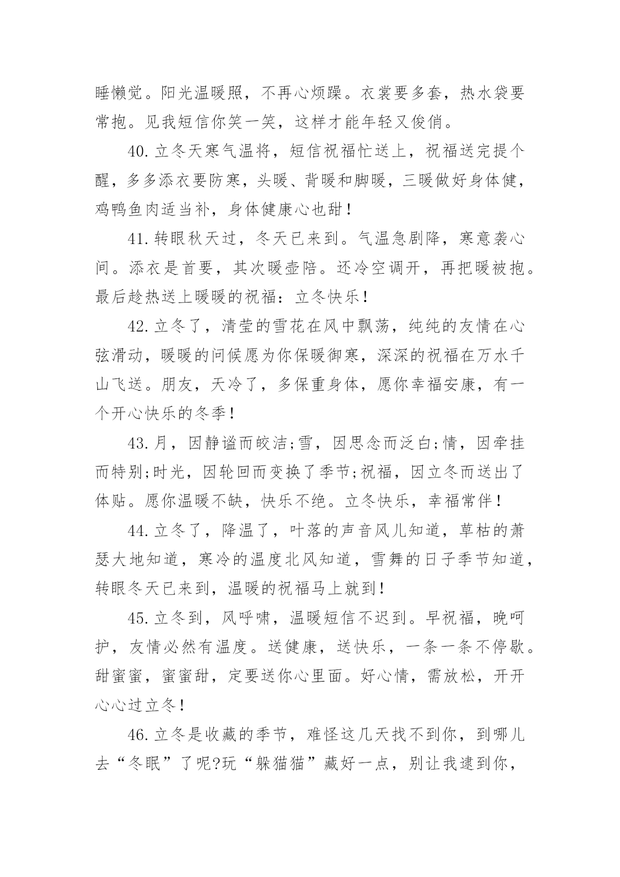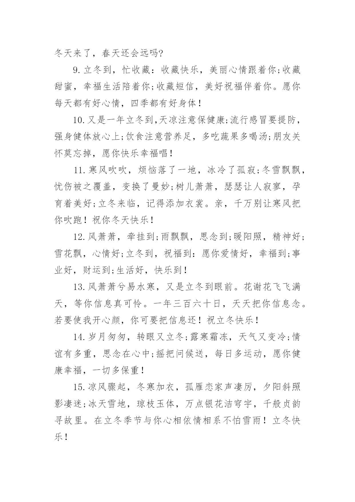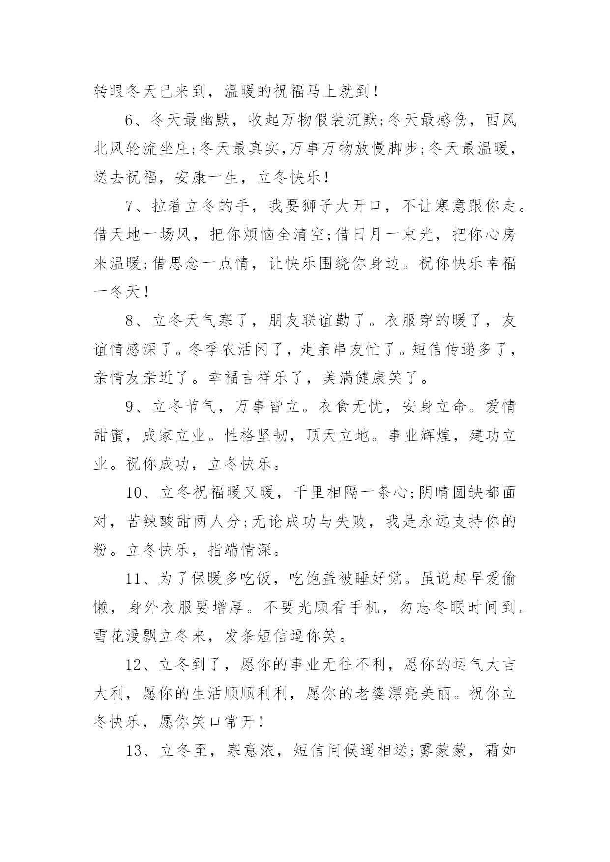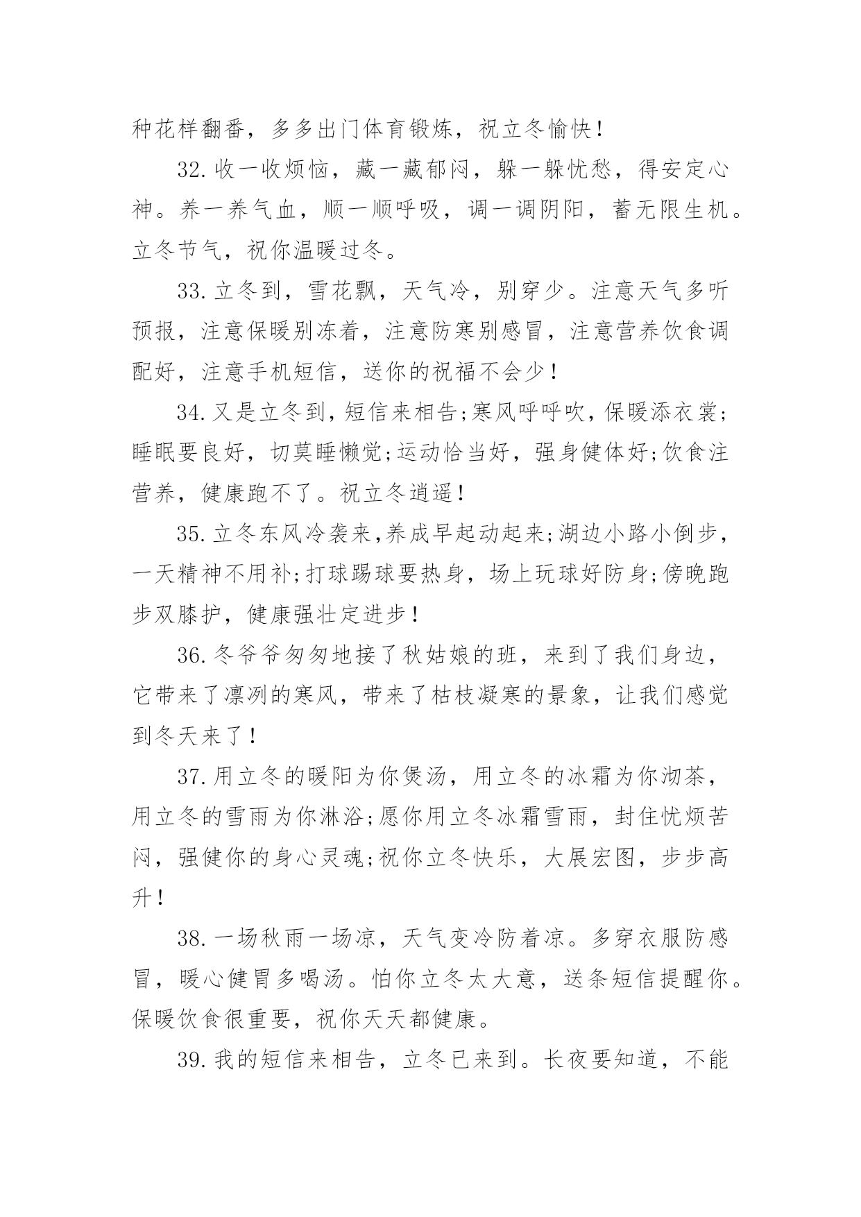 立冬了的主题文案随着社交网络的兴起,越来越多人会在朋友圈发布文案,文案用于记录和分享生活中有意义的事。什么样的文案才经典呢?下面是小编整理的立冬了的主题文案,欢迎阅读与收藏。立冬了的主题文案11、北风狂吼百草衰,千树万树寒梅开;花中君子情豪迈,天寒地冻暖常在;发条短信传关爱,祝福两端系开怀;祝立冬身体康健,问候声音不断!2、眨眼立冬降临,忍不住发条短信提醒你:天冷多注意,添衣保暖防病袭;保持好心情,莫要烦躁坏情绪;有空时多联系,温馨短信带去温暖!祝身康体健,快乐如意,好运继续!3、用立冬的暖阳为你煲汤,用立冬的冰霜为你沏茶,用立冬的雪雨为你淋浴;愿你用立冬冰霜雪雨,封住忧烦苦闷,强健你的身心灵魂;祝你立冬快乐,大展宏图,步步高升!4、冰雪封冻的只是时间而不是挂念,黑暗驱赶的只是距离而不是亲切,寒冷困住的只是感觉而不是真心,今日立冬,我的心,愿你能懂,祝你快乐!5、立冬了,降温了,叶落的声音风儿知道,草枯的萧瑟大地知道,寒冷的温度北风知道,雪舞的日子季节知道,转眼冬天已来到,温暖的祝福马上就到!6、冬天最幽默,收起万物假装沉默;冬天最感伤,西风北风轮流坐庄;冬天最真实,万事万物放慢脚步;冬天最温暖,送去祝福,安康一生,立冬快乐!7、拉着立冬的手,我要狮子大开口,不让寒意跟你走。借天地一场风,把你烦恼全清空;借日月一束光,把你心房来温暖;借思念一点情,让快乐围绕你身边。祝你快乐幸福一冬天!8、立冬天气寒了,朋友联谊勤了。衣服穿的暖了,友谊情感深了。冬季农活闲了,走亲串友忙了。短信传递多了,亲情友亲近了。幸福吉祥乐了,美满健康笑了。9、立冬节气,万事皆立。衣食无忧,安身立命。爱情甜蜜,成家立业。性格坚韧,顶天立地。事业辉煌,建功立业。祝你成功,立冬快乐。10、立冬祝福暖又暖,千里相隔一条心;阴晴圆缺都面对,苦辣酸甜两人分;无论成功与失败,我是永远支持你的粉。立冬快乐,指端情深。11、为了保暖多吃饭,吃饱盖被睡好觉。虽说起早爱偷懒,身外衣服要增厚。不要光顾看手机,勿忘冬眠时间到。雪花漫飘立冬来,发条短信逗你笑。12、立冬到了,愿你的事业无往不利,愿你的运气大吉大利,愿你的生活顺顺利利,愿你的老婆漂亮美丽。祝你立冬快乐,愿你笑口常开!13、立冬至,寒意浓,短信问候遥相送;雾蒙蒙,霜如风,思念牵挂表真情;树叶飘,雪花杨,勤添衣服保身康;真情意,爱传递,祝你幸福美如意;立冬快乐。14、春有春的风情,夏有夏的热情,秋有秋的柔情,冬有冬的温情,我有我的专情,那是不变的友情。立冬了,发条短信把你念:朋友,天冷保重身体!15、岁月脚步太匆匆,转眼迎来了立冬。层层寒意渐渐浓,脉脉衷肠荡其中。情如大江翻浪涌,祝福短信似火红。添衣保暖多运动,健康快乐几万重。身心愉悦多轻松,幸福好运伴成功。立冬了的主题文案21、冬天的夜晚,当你卧读书房,请把自己想象成一出出悲剧的主角,在别人的命运起伏中体验一把快乐和哀伤。你会感谢上苍,竟让你躲过一根又一根命运的无情之棒。2、冬日的月光,拉长了多情的树影,宛若一个冷艳的绝代少女,伫立在冬夜的寒冷中,美得逼人,令人窒息;寂寥的原野上,清癯的树梢悬挂着一丝寒冷,凝结着一份宁静,仿佛是一朵冰冻的大地上剪下的冰凌花装点在夜空中;走在蓝色的月光下,硬邦邦的土地,冰封的江河,储藏了冬天的沉静,催生着又一个春天。3、一场大雪,让上海真的有了冬天的感觉。伴着黄色的夜灯,雪花漫天飞舞,落在大大小小的街巷里,落在岁月的沟壑间,一瞬间,一个非常清澈、非常清澈、非常充盈的冬天来到了上海。4、那是一个冬天的夜晚,窗外寒风刺骨,还下着大雨,而一个小泥娃就在这天夜晚,化成了一滩泥浆。5、冬天悄悄的来了,踏着轻快的舞步悄然来了,伴着那美丽的繁星。6、冬天的`月光,拉长了多愁善感的树影,像一个又酷又艳的女孩,站在寒冷的冬夜,美得吓人,令人窒息;孤独的平原上,细长的树梢上挂着一丝寒意,凝成一种宁静,就像冰封大地上剪下的冰柱点缀在夜空中;行走在蓝色的月光下,坚硬的土地,冰冻的河流,储存着冬天的寂静,孕育着另一个春天。7、我感觉冬夜不再那么冷了,因为我看见了许多美好的景色。尽管天空还是那么黑,那么暗,但在月亮的帮助下,天空开始泛白了,早晨要来临了。8、冬天的夜晚街道显得冷冷清清,因为刺骨的寒风往人们身上吹过去,让大家禁不住起了鸡皮疙瘩,就算躲进屋子里也能感受到冷风的威胁。9、这个冬的夜晚,虽然冷清,但有月亮照着大地,使得这个晚上一切都是美好的。10、那是深冬的夜晚,我午夜梦回,突然被一种气息强烈地包裹,那种气息腾空而起,扑面而来,铺天盖地,如海浪般汹涌着,如岚雾从幽谷袅袅升腾,上下飘动,反复袭击着我,使我无力抗拒。立冬了的主题文案31.立冬到,寒风狂,落叶纷纷遍地黄;雪飘飘,白茫茫,天冷注意保健康;问候短,情谊暖,字里行间真情传;愿如意,永安康,幸福快乐平平