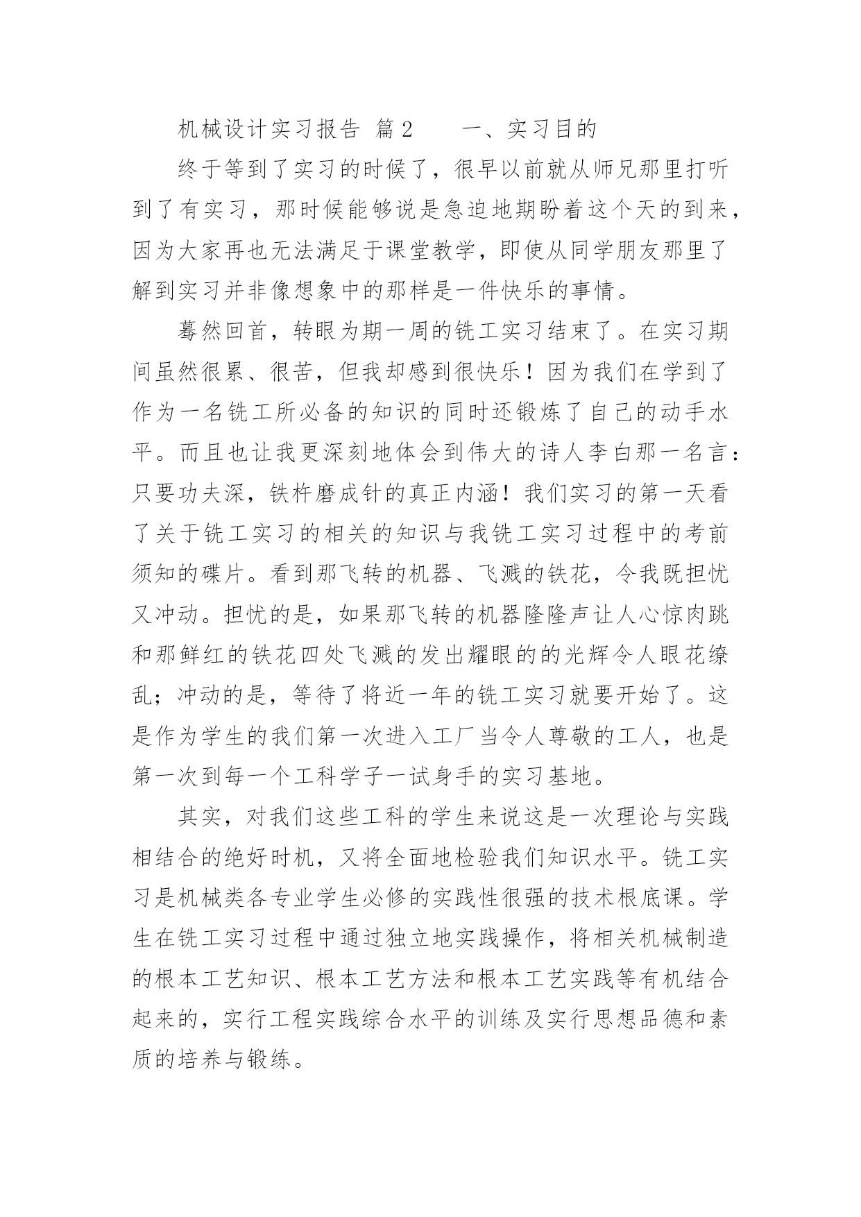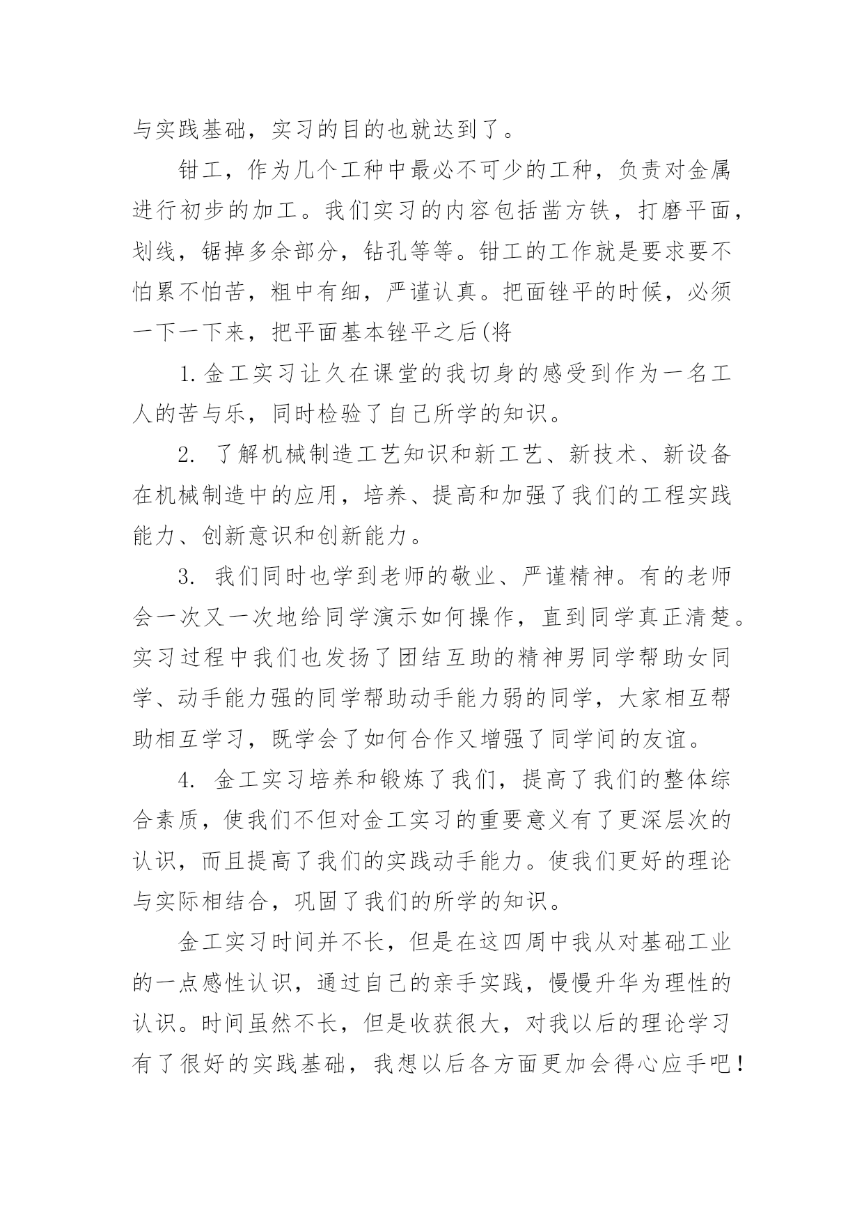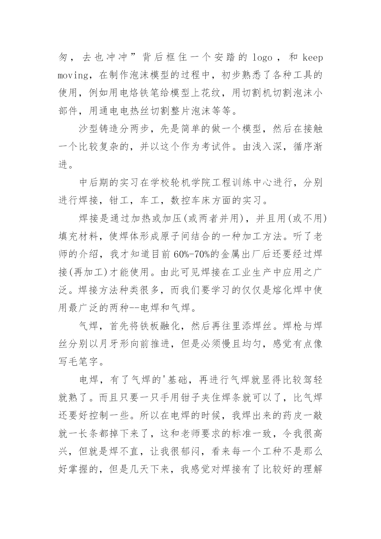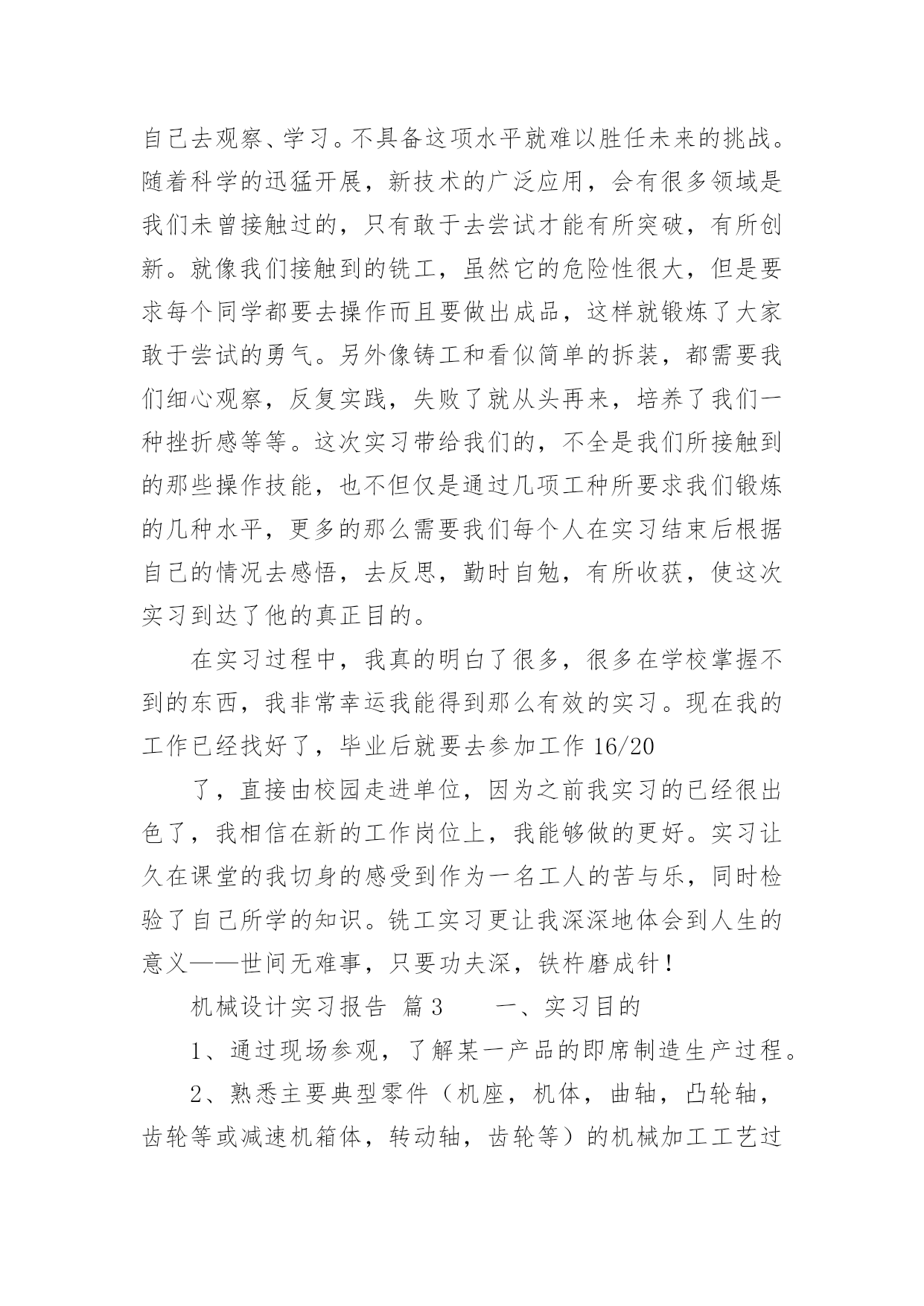 机械设计实习报告机械设计实习报告在日常生活和工作中,大家逐渐认识到报告的重要性,报告具有成文事后性的特点。为了让您不再为写报告头疼,下面是小编精心整理的机械设计实习报告,仅供参考,希望能够帮助到大家。机械设计实习报告篇1机械设计专业金工实习报告金工实习是高等院校学生进行工程训练、培养工程意识、学习工艺知识、提高综合素质的一门实践性的基础课。短暂的一个月时间,我们经历了铸造、锻压、气焊、电焊、钳工、车工这几个工种,也算是把基础工业的几个工种过了一遍。我觉得实习生活和以前想象的不一样了,实习不是一件简单的事,并不是我们的假期,不是一件轻松的事,而是一件劳心劳力的事。在这个短暂的四个星期内,我学到许多在课堂里无法学到的东西,并在意志品质上得到了锻炼。在实习期间虽然很累、很苦,但我却感到很快乐!因为我们在学到了作为一名技工所必备的基本知识的同时还锻炼了自己的动手能力。前期的实习地点在大工工程训练中心,学习锻压,消失模,沙型铸造等方面的知识。我组设计的消失模是一个创意的小便池,上书“来也匆匆,去也冲冲”背后框住一个安踏的logo,和keepmoving,在制作泡沫模型的过程中,初步熟悉了各种工具的使用,例如用电烙铁笔给模型上花纹,用切割机切割泡沫小部件,用通电电热丝切割整片泡沫等等。沙型铸造分两步,先是简单的做一个模型,然后在接触一个比较复杂的,并以这个作为考试件。由浅入深,循序渐进。中后期的实习在学校轮机学院工程训练中心进行,分别进行焊接,钳工,车工,数控车床方面的实习。焊接是通过加热或加压(或两者并用),并且用(或不用)填充材料,使焊体形成原子间结合的一种加工方法。听了老师的介绍,我才知道目前60%-70%的金属出厂后还要经过焊接(再加工)才能使用。由此可见焊接在工业生产中应用之广泛。焊接方法种类很多,而我们要学习的仅仅是熔化焊中使用最广泛的两种--电焊和气焊。气焊,首先将铁板融化,然后再往里添焊丝。焊枪与焊丝分别以月牙形向前推进,但是必须慢且均匀,感觉有点像写毛笔字。电焊,有了气焊的'基础,再进行气焊就显得比较驾轻就熟了。而且只要一只手用钳子夹住焊条就可以了,比气焊还要好控制一些。所以在电焊的时候,我焊出来的药皮一敲就一长条都掉下来了,这和老师要求的标准一致,令我很高兴,但就是焊不直,让我很郁闷,看来每一个工种不是那么好掌握的,但是几天下来,我感觉对焊接有了比较好的理解与实践基础,实习的目的也就达到了。钳工,作为几个工种中最必不可少的工种,负责对金属进行初步的加工。我们实习的内容包括凿方铁,打磨平面,划线,锯掉多余部分,钻孔等等。钳工的工作就是要求要不怕累不怕苦,粗中有细,严谨认真。把面锉平的时候,必须一下一下来,把平面基本锉平之后(将1.金工实习让久在课堂的我切身的感受到作为一名工人的苦与乐,同时检验了自己所学的知识。2.了解机械制造工艺知识和新工艺、新技术、新设备在机械制造中的应用,培养、提高和加强了我们的工程实践能力、创新意识和创新能力。3.我们同时也学到老师的敬业、严谨精神。有的老师会一次又一次地给同学演示如何操作,直到同学真正清楚。实习过程中我们也发扬了团结互助的精神男同学帮助女同学、动手能力强的同学帮助动手能力弱的同学,大家相互帮助相互学习,既学会了如何合作又增强了同学间的友谊。4.金工实习培养和锻炼了我们,提高了我们的整体综合素质,使我们不但对金工实习的重要意义有了更深层次的认识,而且提高了我们的实践动手能力。使我们更好的理论与实际相结合,巩固了我们的所学的知识。金工实习时间并不长,但是在这四周中我从对基础工业的一点感性认识,通过自己的亲手实践,慢慢升华为理性的认识。时间虽然不长,但是收获很大,对我以后的理论学习有了很好的实践基础,我想以后各方面更加会得心应手吧!机械设计实习报告篇2一、实习目的终于等到了实习的时候了,很早以前就从师兄那里打听到了有实习,那时候能够说是急迫地期盼着这个天的到来,因为大家再也无法满足于课堂教学,即使从同学朋友那里了解到实习并非像想象中的那样是一件快乐的事情。蓦然回首,转眼为期一周的铣工实习结束了。在实习期间虽然很累、很苦,但我却感到很快乐!因为我们在学到了作为一名铣工所必备的知识的同时还锻炼了自己的动手水平。而且也让我更深刻地体会到伟大的诗人李白那一名言:只要功夫深,铁杵磨成针的真正内涵!我们实习的第一天看了关于铣工实习的相关的知识与我铣工实习过程中的考前须知的碟片。看到那飞转的机器、飞溅的铁花,令我既担忧又冲动。担忧的是,如果那飞转的机器隆隆声让人心惊肉跳和那鲜红的铁花四处飞溅的发出耀眼的的光辉令人眼花缭乱;冲动的是,等待了将近一年的铣工实习就要开始了。这是作为学生的我们第一次进入工厂当令人尊敬的工人,也是第一次到每一个工科学子一试身手的实习基地。其实,对我们这些工科的学生来说这是