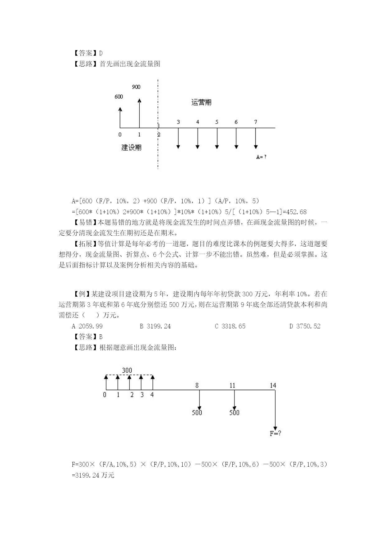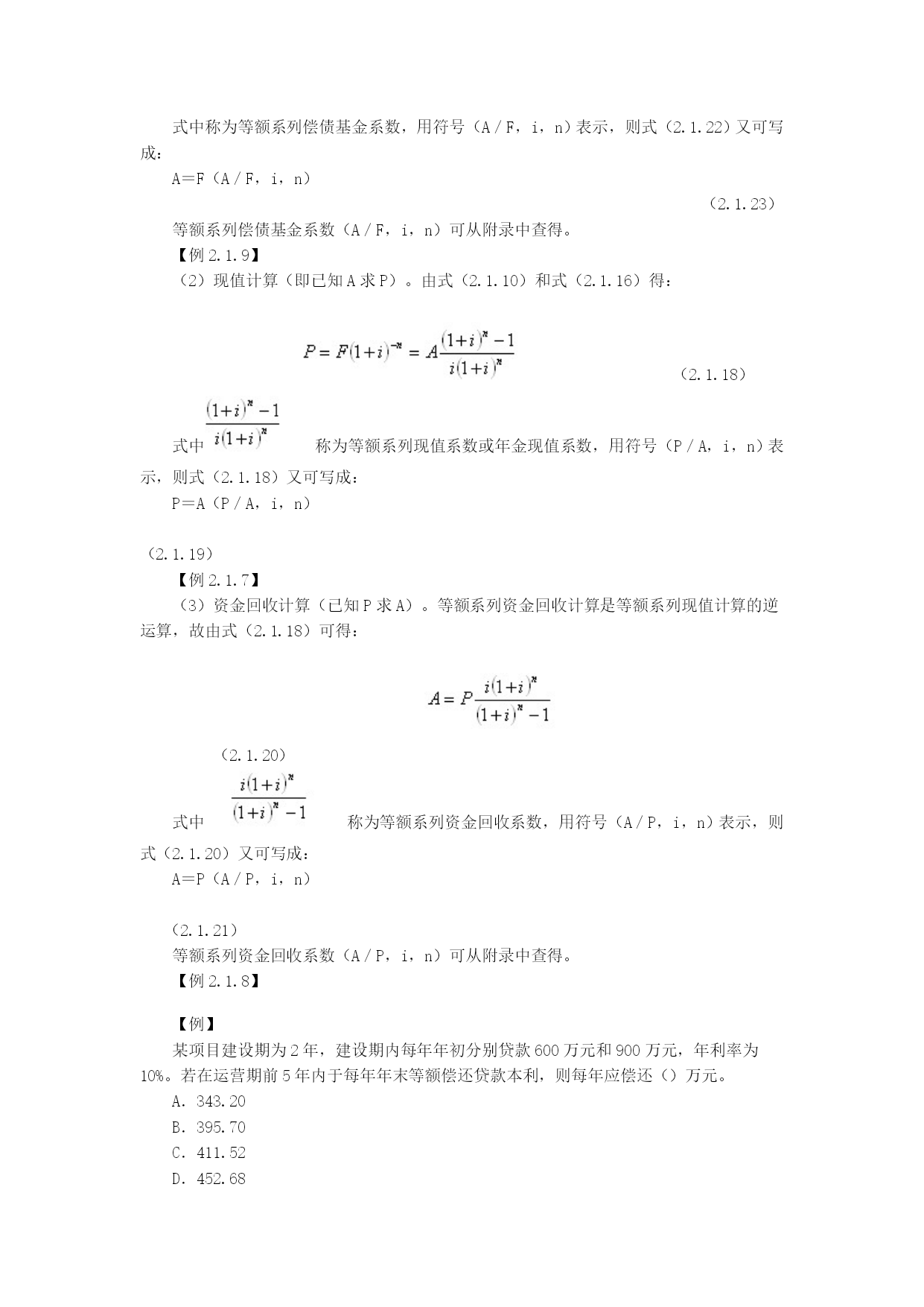 三、等值计算(一)影响资金等值的因素如前所述,由于资金的时间价值,使得金额相同的资金发生在不同时间,会产生不同的价值。反之,不同时点金额不等的资金在时间价值的作用下,却可能具有相等的价值。这些不同时期、不同数额但其“价值等效”的资金称为等值,也称为等效值。影响资金等值的因素有三个:资金的多少、资金发生的时间及利率(或折现率)的大小。(二)等值计算方法常用的资金等值计算主要包括两大类,即:一次支付和等额支付。1.一次支付的情形(1)终值计算(已知P求F)。现有一笔资金P,年利率为i,按复利计算,则n年末的本利和F为多少?即已知P、i、n,求F。其现金流量如图2.1.2所示。(2.1.8)式中:i计息周期复利率;n计息周期数;P现值(即现在的资金价值或本金,PresentValue),指资金发生在(或折算为)某一特定时间序列起点时的价值;F终值(n期末的资金价值或本利和,FutureValue),指资金发生在(或折算为)某一特定时间序列终点的价值。式(2.1.8)中的(1+i)n称为一次支付终值系数,用(F/P,i,n)表示,则式(2.1.8)又可写成:F=P(F/P,i,n)(2.1.9)【例2.1.4】(2)现值计算(已知F求P)。由式(2.1.8)即可求出现值P。P=F(1+i)-n(2.1.10)式中(1+i)-n称为一次支付现值系数,用符号(P/F,i,n)表示,并按不同的利率i和计息期n列表于附录。在工程经济分析中,一般是将未来时刻的资金价值折算为现在时刻的价值,该过程称为“折现”或“贴现”,其所使用的利率常称为折现率或贴现率。故(1+i)-n或(P/F,i,n)也可称为折现系数或贴现系数。式(2.1.10)常写成:P=F(P/F,i,n)(2.1.11)【例2.1.5】等额支付系列情形A——年金,发生在(或折算为)某一特定时间序列各计息期末(不包括零期)的等额资金序列的价值。对于等额系列现金流量,其复利计算方法如下:(1)终值计算(即已知A求F)。(2.1.16)式中称为等额系列终值系数或年金终值系数,用符号(F/A,i,n)表示,式(2.1.16)又可写成:F=A(F/A,i,n)(2.1.17)【例2.1.6】(4)偿债基金计算(已知F求A)。偿债基金计算是等额系列终值计算的逆运算,故由式(2.1.16)可得:(2.1.22)式中称为等额系列偿债基金系数,用符号(A/F,i,n)表示,则式(2.1.22)又可写成:A=F(A/F,i,n)(2.1.23)等额系列偿债基金系数(A/F,i,n)可从附录中查得。【例2.1.9】(2)现值计算(即已知A求P)。由式(2.1.10)和式(2.1.16)得:(2.1.18)式中称为等额系列现值系数或年金现值系数,用符号(P/A,i,n)表示,则式(2.1.18)又可写成:P=A(P/A,i,n)(2.1.19)【例2.1.7】(3)资金回收计算(已知P求A)。等额系列资金回收计算是等额系列现值计算的逆运算,故由式(2.1.18)可得:(2.1.20)式中称为等额系列资金回收系数,用符号(A/P,i,n)表示,则式(2.1.20)又可写成:A=P(A/P,i,n)(2.1.21)等额系列资金回收系数(A/P,i,n)可从附录中查得。【例2.1.8】【例】某项目建设期为2年,建设期内每年年初分别贷款600万元和900万元,年利率为10%。若在运营期前5年内于每年年末等额偿还贷款本利,则每年应偿还()万元。A.343.20B.395.70C.411.52D.452.68【答案】D【思路】首先画出现金流量图A=[600(F/P,10%,2)+900(F/P,10%,1)](A/P,10%,5)=[600*(1+10%)2+900*(1+10%)]*10%*(1+10%)5/[(1+10%)5—1]=452.68【易错】本题易错的地方就是将现金流发生的时间点弄错,在画现金流量图的时候,一定要分清现金流发生在期初还是在期末。【拓展】等值计算是每年必考的一道题,题目的难度比课本的例题要大得多,这道题要想得分,现金流量图、折算点、6个公式、计算一步不能出错。虽然难,但是必须掌握。这是后面指标计算以及案例分析相关内容的基础。【例】某建设项目建设期为5年,建设期内每年年初贷款300万元,年利率10%。若在运营期第3年底和第6年底分别偿还500万元,则在运营期第9年底全部还清贷款本利和尚需偿还()万元。A2059.99B3199.24C3318.65D3750.52【答案】B【思路】根据题意画出现金流量图:F=300×(F/A,10%,5)×(F/P,10%,10)-500×(F/P,10%,6)-500×(F/P,10%,3)=3199.24万元