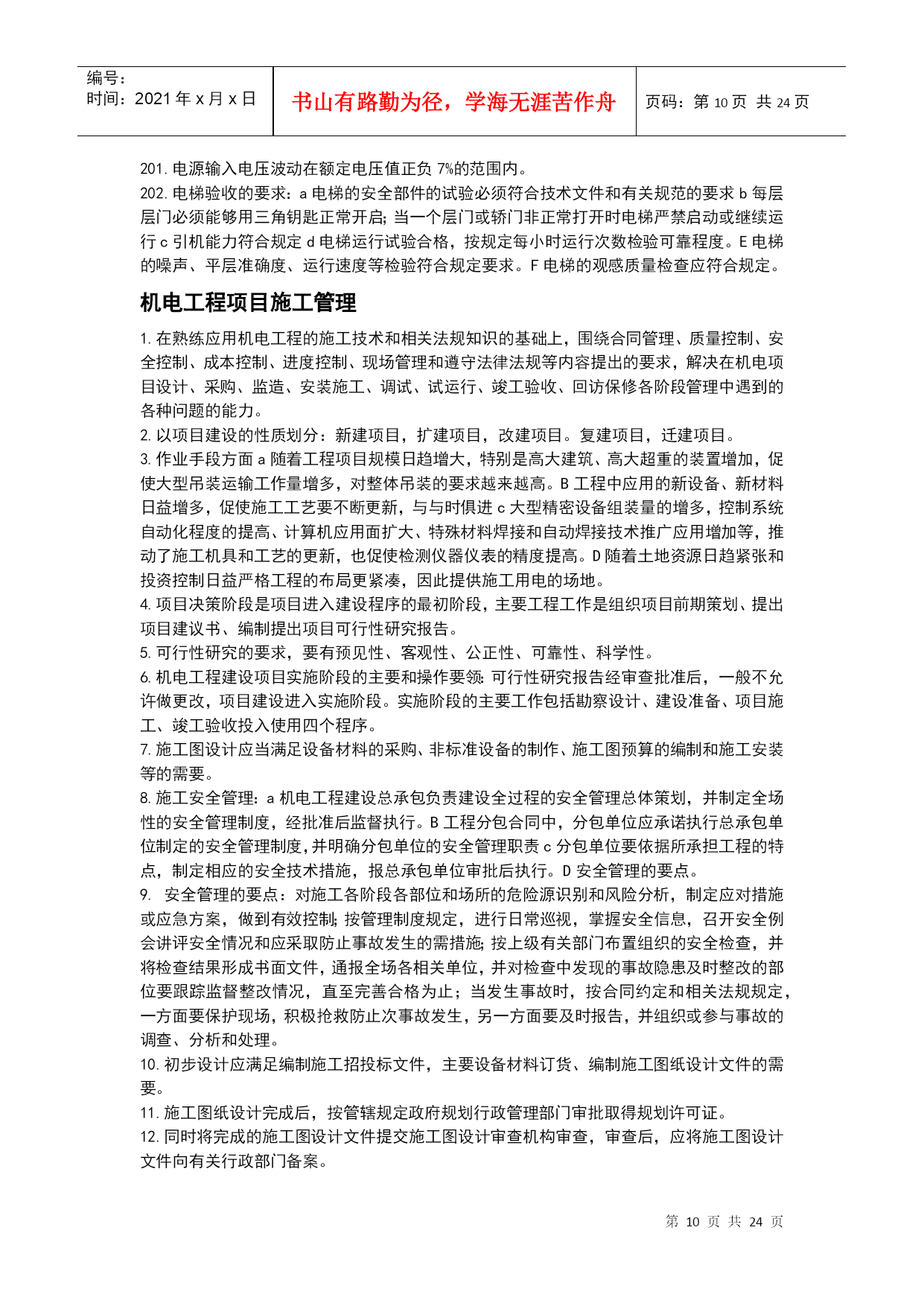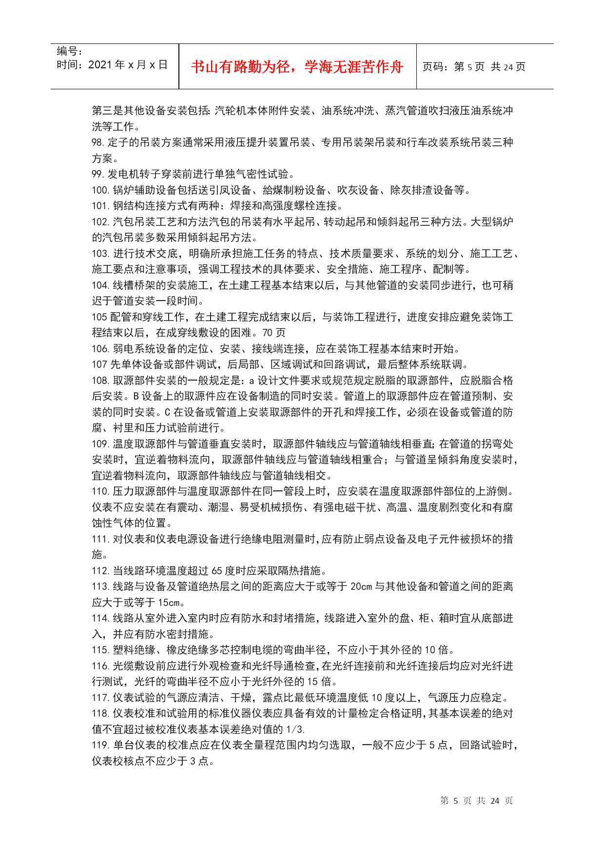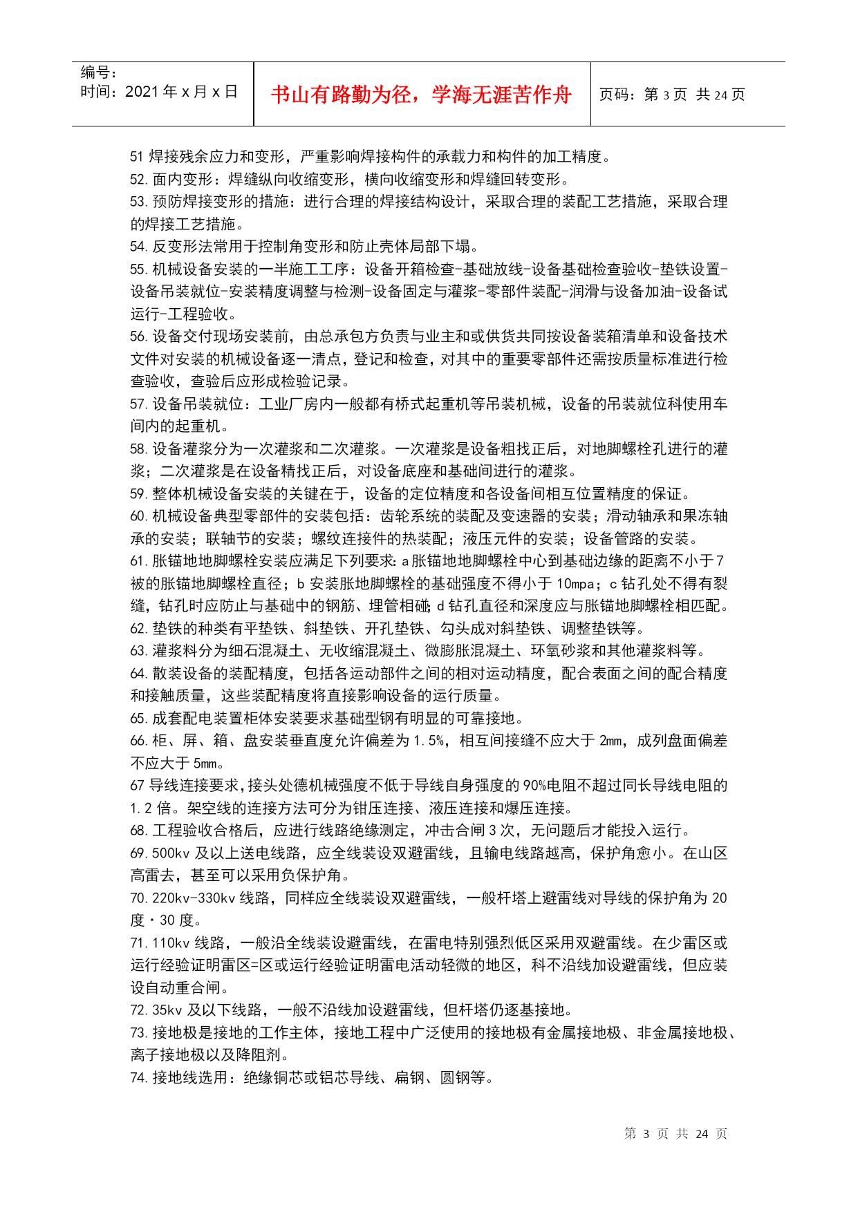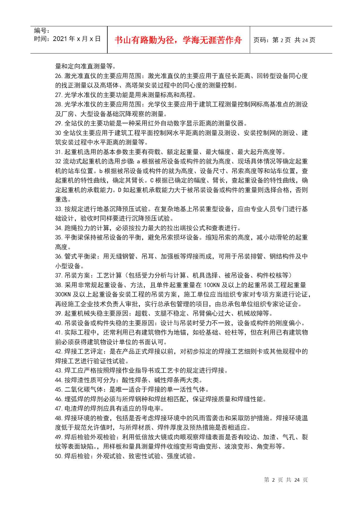 编号:时间:2021年x月x日书山有路勤为径,学海无涯苦作舟页码:第PAGE24页共NUMPAGES24页第PAGE\*MERGEFORMAT24页共NUMPAGES\*MERGEFORMAT24页机电工程技术1.碳素结构钢具有良好的塑性和韧性,易于成型和焊接。2.机电工程常见的各种型钢、钢筋、钢丝等。3.低合金结构钢具有较好的综合力学性能,主要适用于锅炉汽包、压力容器、压力管道、桥梁、重轨等制造。4.特殊性能低合金高强度钢能够满足特殊需要的钢类,其中工程结构用特殊钢主要包括:耐候钢、耐海水腐蚀钢、表面处理钢材、汽车冲压钢板、石油及天然气管线钢、工程机械用钢与可焊接高强度钢、钢筋钢、低温用钢及钢轨钢等。5.在机电工程中,常用的钢制品主要有焊材、管件、阀门等。6.VLV型、VV型电力电缆:不能受机械外来作用,适用于室内、隧道内及管道内敷设。7.VLV22型、VV22型电缆:能承受机械外力作用,但不能承受大的拉力,可敷设在地下。8.VLV32型、VV32型电缆:能承受机械外力作用,且可承受相当大的拉力,科敷设在竖井内、高层建筑的电缆竖井内,且适用于潮湿场所。9.舟山至宁波的海底电缆使用的是VV59型铜芯聚乙烯绝缘聚氯乙烯护套内粗钢丝10.特种新型的无机非金属材料主要指用氧化物、氮化物、碳化物、硼化物、硫化物、硅化物以及各种无机非金属化合物经特殊的先进工艺支撑的材料。11.高分子材料摩擦系数小,易滑动,能吸收震动和声音能量,是电绝缘体、难导热体,人膨胀大,耐热温度低,低温脆性;耐水,大多数能耐酸、碱、盐等;使用过程中会出现老化现象。12.酚醛复合风管适用于低中空调系统及潮湿环境。13.风机的性能参数主要有:流量风压功率转速比转速。14.压缩机的性能参数包括容器流量吸气压力排气压力工作效率。15.加工精度包括被加工工件的尺寸精度、形状精度、表面质量和机床的精度保持性。16.机床的静态特性(如静态几何精度和刚度)以及机床的动态特性(如运动精度、动刚度、热变形和噪声等)17.同步电动机常用于拖动恒速运转的大中型低速机械。缺点:结构较复杂、价格较贵、启动麻烦。18.异步电动机是现代生产和生活中使用最广泛的一种电动机。它具有结构简单、制造容易、价格低廉、运行可靠、维护方便、坚固耐用等一系列有点。缺点:与直流电动机相比,其启动性盒调速性能较差;与同步电动机相比,其功率因数不高。19.直流电动机常用于拖动对调速要求较高的生产机械,缺点:结构复杂,价格高。20.专用设备针对性高,它往往只完成某种或有限的几种零件或产品的特定工序或几个工序的加工或生产,效率特别高,适合用于单品种大批量加工或连续生产。21.大型静置设备安装测量控制的重点是对垂直度的测量。22.三角测量的网布设应符合下列要求:各等级的首级控制网,均宜布设为近似等边三角形的网。其三角形的内角不应小于30度,当受地形限制时,个别可放宽,但不应小于25度。23.光学经纬仪的主要功能测量纵向、横向轴线以及垂直度的控制测量等。24.光学经纬仪的主要应用范围:主要应用于机电工程建筑物监理平面控制网的测量以及厂房柱安装垂直度的控制测量。25.激光准直仪的主要功能:除均有光学经纬仪的功能外,还可进行精度较高的角度坐标测量和定向准直测量等。26.激光准直仪的主要应用范围:激光准直仪的主要应用于直径长距离、回转型设备同心度的找正测量以及高塔体、高塔架安装过程中的同心度的测量控制。27.光学水准仪的主要功能是用来测量标高和高程。28.光学水准仪的主要应用范围:光学仪主要应用于建筑工程测量控制网标高基准点的测设及厂房、大型设备基础沉降观察的测量。29.全站仪的主要功能是一种采用红外自动数字显示距离的测量仪器。30全站仪主要应用于建筑工程平面控制网水平距离的测量及测设、安装控制网的测设、建筑安装过程中水平距离的测量等。31.起重机选用的基本参数主要有荷载、额定起重量、最大幅度、最大起升高度等。32流动式起重机的选用步骤:a根据被吊设备或构件的就为高度、现场具体情况等确定起重机的站车位置。b根据被吊设备或构件的就为高度、设备尺寸、吊索高度等和站车位置,查起重机的特性曲线,确定其臂长。C根据已确定的幅度、臂长,查起重设备的特性曲线,确定起重机的承载能力。D如起重机承载能力大于被吊装设备或构件的重量则选择合格,否则重选。33.按规定进行地基沉降预压试验。在复杂地基上吊装重型设备,应由专业人员专门进行基础设计,验收时同样要进行沉降预压试验。34.跑绳拉力的计算,必须按拉力最大的拉出端按公式和查表进行。35.平衡梁保持被吊设备的平衡,避免吊索损坏设备。缩短吊索的高度,减小动滑轮的起重高度。36.管式平衡梁:用无缝钢管