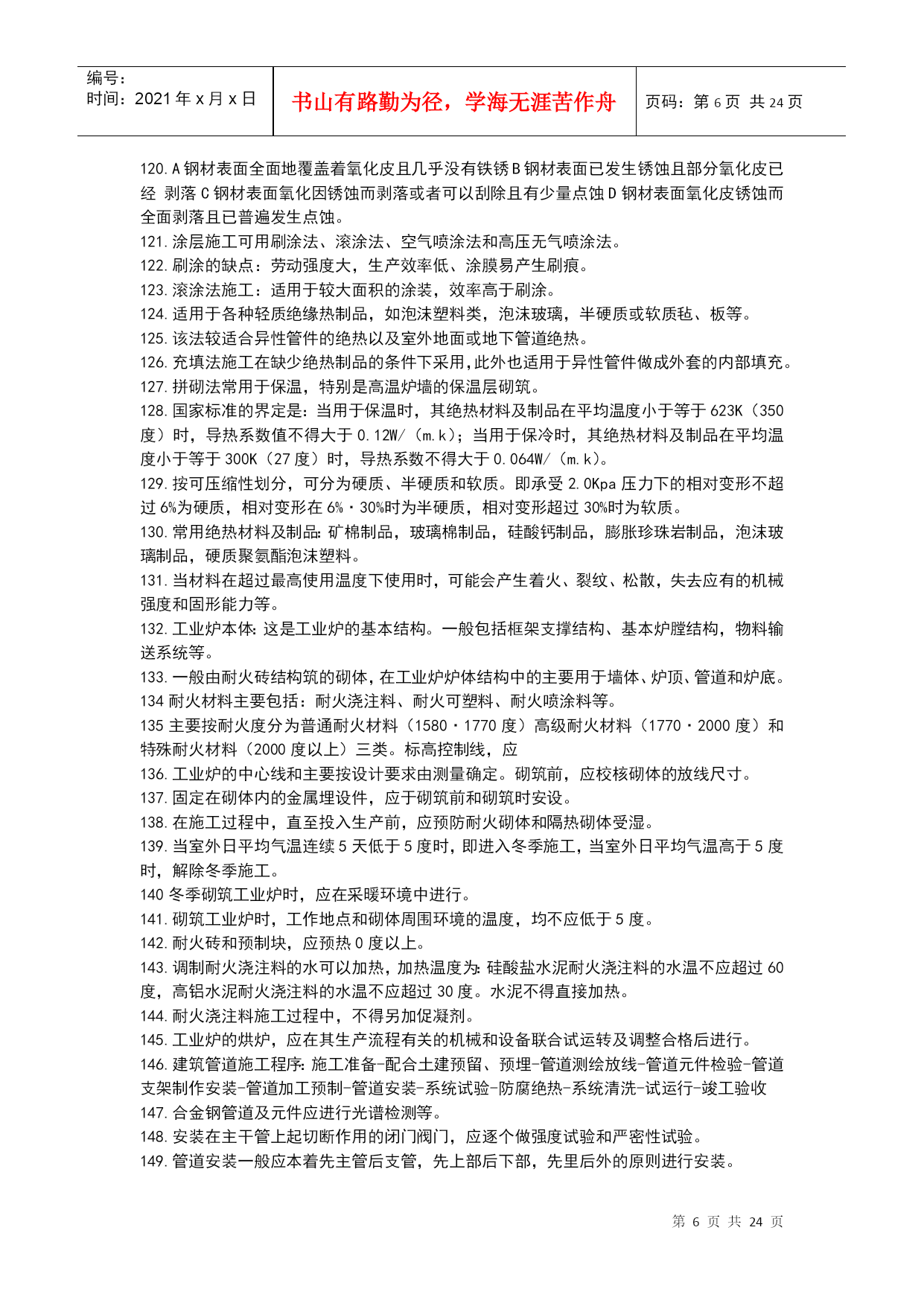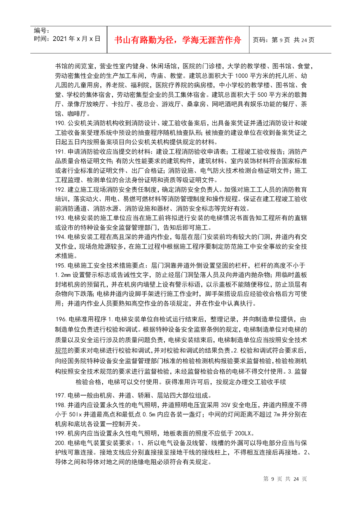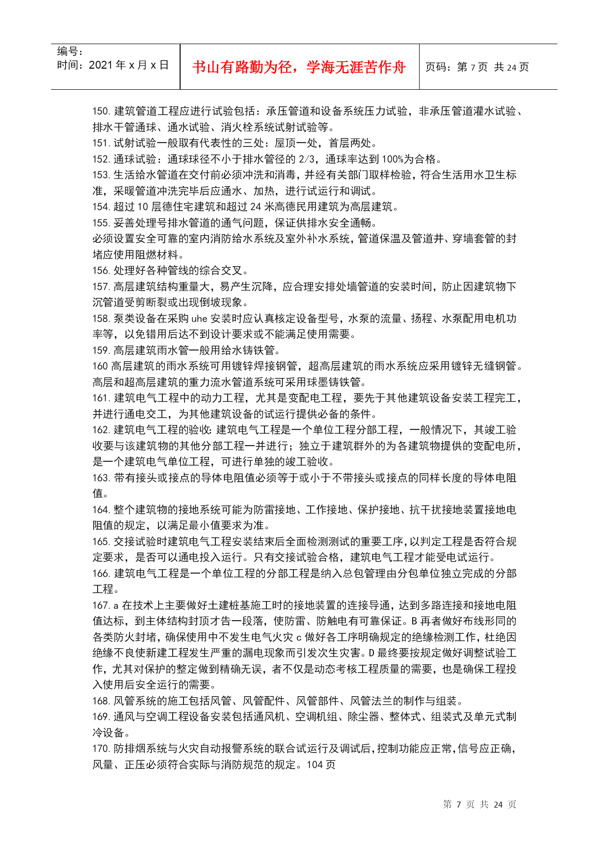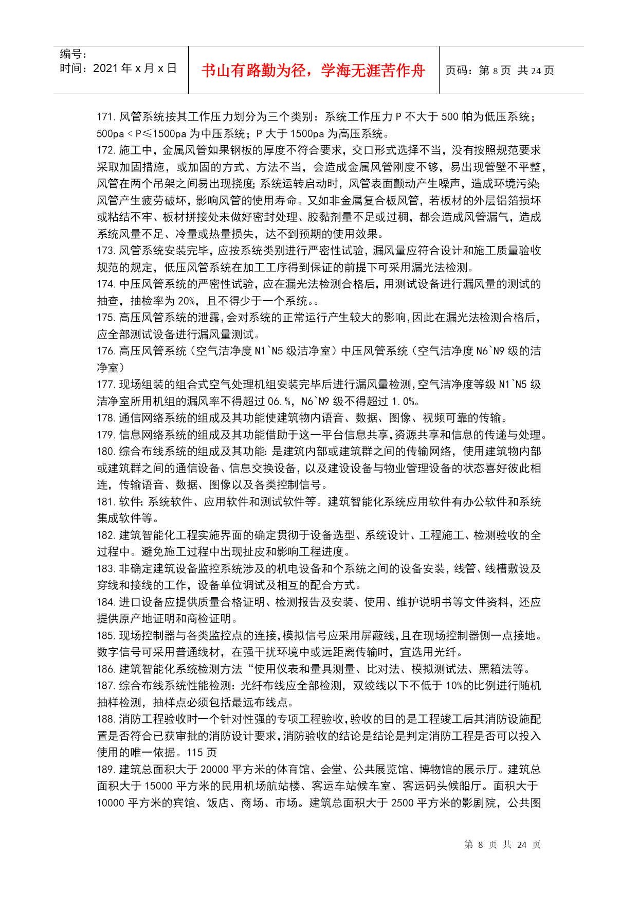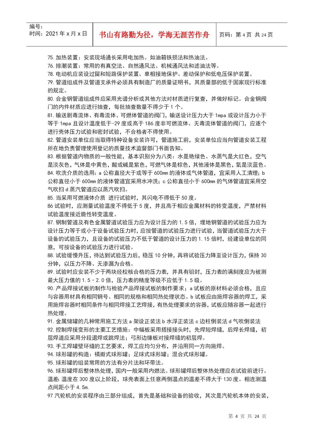 编号:时间:2021年x月x日书山有路勤为径,学海无涯苦作舟页码:第PAGE24页共NUMPAGES24页第PAGE\*MERGEFORMAT24页共NUMPAGES\*MERGEFORMAT24页机电工程技术1.碳素结构钢具有良好的塑性和韧性,易于成型和焊接。2.机电工程常见的各种型钢、钢筋、钢丝等。3.低合金结构钢具有较好的综合力学性能,主要适用于锅炉汽包、压力容器、压力管道、桥梁、重轨等制造。4.特殊性能低合金高强度钢能够满足特殊需要的钢类,其中工程结构用特殊钢主要包括:耐候钢、耐海水腐蚀钢、表面处理钢材、汽车冲压钢板、石油及天然气管线钢、工程机械用钢与可焊接高强度钢、钢筋钢、低温用钢及钢轨钢等。5.在机电工程中,常用的钢制品主要有焊材、管件、阀门等。6.VLV型、VV型电力电缆:不能受机械外来作用,适用于室内、隧道内及管道内敷设。7.VLV22型、VV22型电缆:能承受机械外力作用,但不能承受大的拉力,可敷设在地下。8.VLV32型、VV32型电缆:能承受机械外力作用,且可承受相当大的拉力,科敷设在竖井内、高层建筑的电缆竖井内,且适用于潮湿场所。9.舟山至宁波的海底电缆使用的是VV59型铜芯聚乙烯绝缘聚氯乙烯护套内粗钢丝10.特种新型的无机非金属材料主要指用氧化物、氮化物、碳化物、硼化物、硫化物、硅化物以及各种无机非金属化合物经特殊的先进工艺支撑的材料。11.高分子材料摩擦系数小,易滑动,能吸收震动和声音能量,是电绝缘体、难导热体,人膨胀大,耐热温度低,低温脆性;耐水,大多数能耐酸、碱、盐等;使用过程中会出现老化现象。12.酚醛复合风管适用于低中空调系统及潮湿环境。13.风机的性能参数主要有:流量风压功率转速比转速。14.压缩机的性能参数包括容器流量吸气压力排气压力工作效率。15.加工精度包括被加工工件的尺寸精度、形状精度、表面质量和机床的精度保持性。16.机床的静态特性(如静态几何精度和刚度)以及机床的动态特性(如运动精度、动刚度、热变形和噪声等)17.同步电动机常用于拖动恒速运转的大中型低速机械。缺点:结构较复杂、价格较贵、启动麻烦。18.异步电动机是现代生产和生活中使用最广泛的一种电动机。它具有结构简单、制造容易、价格低廉、运行可靠、维护方便、坚固耐用等一系列有点。缺点:与直流电动机相比,其启动性盒调速性能较差;与同步电动机相比,其功率因数不高。19.直流电动机常用于拖动对调速要求较高的生产机械,缺点:结构复杂,价格高。20.专用设备针对性高,它往往只完成某种或有限的几种零件或产品的特定工序或几个工序的加工或生产,效率特别高,适合用于单品种大批量加工或连续生产。21.大型静置设备安装测量控制的重点是对垂直度的测量。22.三角测量的网布设应符合下列要求:各等级的首级控制网,均宜布设为近似等边三角形的网。其三角形的内角不应小于30度,当受地形限制时,个别可放宽,但不应小于25度。23.光学经纬仪的主要功能测量纵向、横向轴线以及垂直度的控制测量等。24.光学经纬仪的主要应用范围:主要应用于机电工程建筑物监理平面控制网的测量以及厂房柱安装垂直度的控制测量。25.激光准直仪的主要功能:除均有光学经纬仪的功能外,还可进行精度较高的角度坐标测量和定向准直测量等。26.激光准直仪的主要应用范围:激光准直仪的主要应用于直径长距离、回转型设备同心度的找正测量以及高塔体、高塔架安装过程中的同心度的测量控制。27.光学水准仪的主要功能是用来测量标高和高程。28.光学水准仪的主要应用范围:光学仪主要应用于建筑工程测量控制网标高基准点的测设及厂房、大型设备基础沉降观察的测量。29.全站仪的主要功能是一种采用红外自动数字显示距离的测量仪器。30全站仪主要应用于建筑工程平面控制网水平距离的测量及测设、安装控制网的测设、建筑安装过程中水平距离的测量等。31.起重机选用的基本参数主要有荷载、额定起重量、最大幅度、最大起升高度等。32流动式起重机的选用步骤:a根据被吊设备或构件的就为高度、现场具体情况等确定起重机的站车位置。b根据被吊设备或构件的就为高度、设备尺寸、吊索高度等和站车位置,查起重机的特性曲线,确定其臂长。C根据已确定的幅度、臂长,查起重设备的特性曲线,确定起重机的承载能力。D如起重机承载能力大于被吊装设备或构件的重量则选择合格,否则重选。33.按规定进行地基沉降预压试验。在复杂地基上吊装重型设备,应由专业人员专门进行基础设计,验收时同样要进行沉降预压试验。34.跑绳拉力的计算,必须按拉力最大的拉出端按公式和查表进行。35.平衡梁保持被吊设备的平衡,避免吊索损坏设备。缩短吊索的高度,减小动滑轮的起重高度。36.管式平衡梁:用无缝钢管