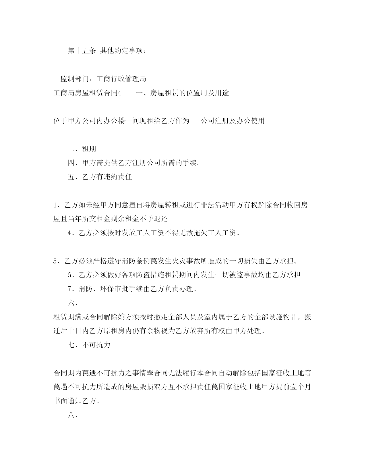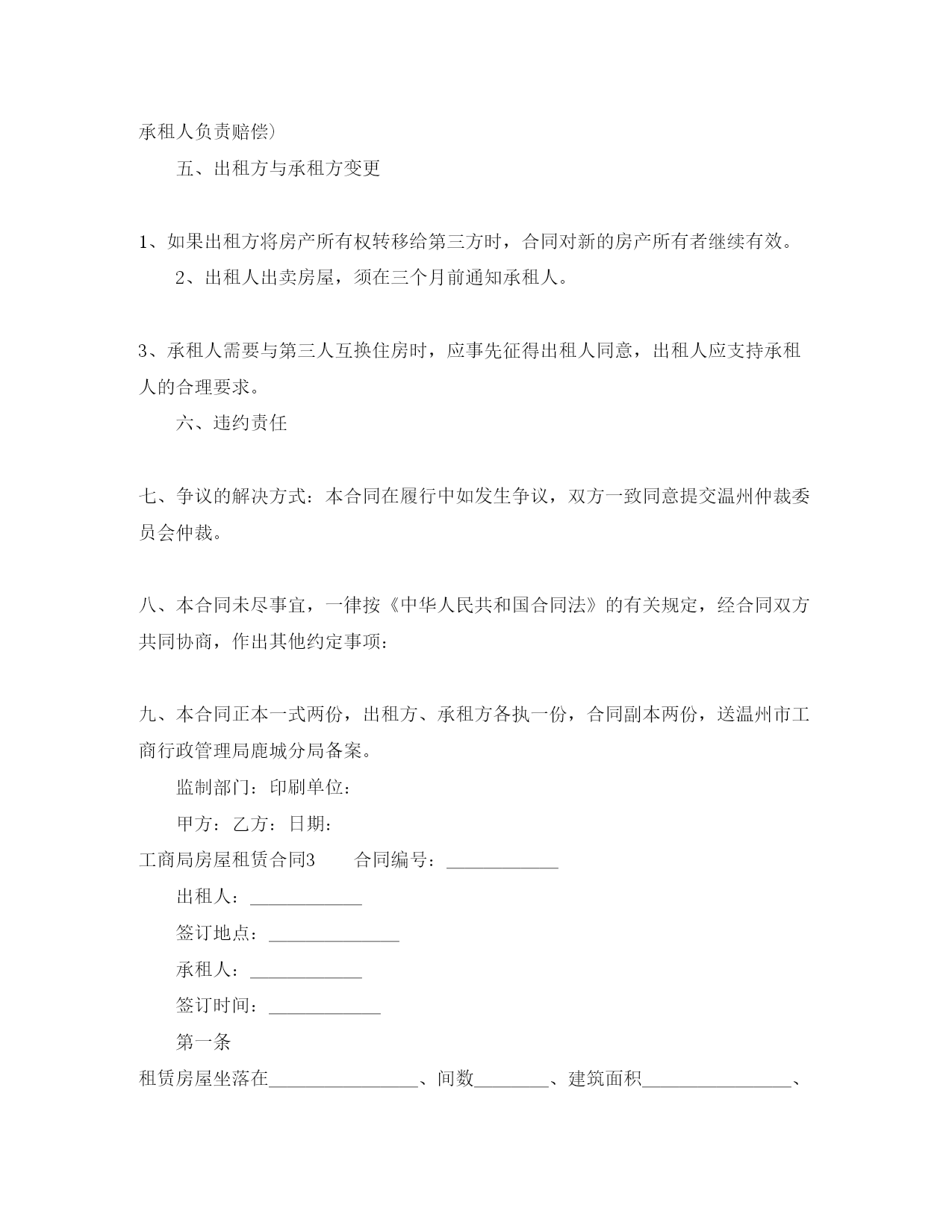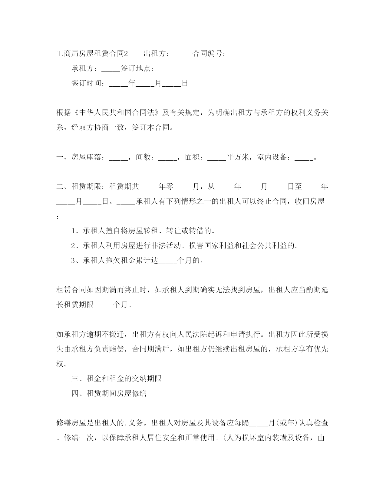 此资料由网络收集而来,如有侵权请告知上传者立即删除。资料共分享,我们负责传递知识。工商局房屋租赁合同工商局房屋租赁合同在人们越来越相信法律的社会中,合同对我们的约束力越来越不可忽视,签订合同能平衡双方当事人的平等地位。知道吗,写合同可是有方法的哦,以下是小编整理的工商局房屋租赁合同,仅供参考,希望能够帮助到大家。工商局房屋租赁合同1出租人:_____合同编号:承租人:_____签订地点:签订时间:一、租赁房屋坐落在间数,建筑面积、房屋质量。二、租赁期限从年月日至年月日。(期限不得超过二十年)三、租金(大写)四、租金的支付方式与期限:五、承租人负责支付出租房屋的水费、电费、煤气费、电话费、光缆电视收视费、卫生费和物业管理费。六、租赁房屋的用途:七、租赁房屋的维修:出租人维修的范围、时间及费用负担:承租人维修的范围及费用负担:八、出租人(是/否)允许承租人对租赁房屋进行装修或改善增设他物。装修、改善增设他物的范围是:租赁合同期满,租赁房屋的装修、改善增设他物的处理:九、出租人(是/否)允许承租人转租租赁房屋。十、定金(大写)元。承租人在前交给出租人。十一、合同解除的条件有下列情形之一,出租人有权解除本合同;1、承租人不交付或者不按约定交付租金达个月以上;2、承租人所欠费用达(大写)元以上;3、未经出租人同意或有关部门批准,承租人擅自改变出租房屋用途的;4、承租人违反本合同约定,不承担维修责任致使房屋或设备严重损坏的;5、未经出租人书面同意,承租人将出租房屋进行装修的;6、未经出租人书面同意,承租人将出租房屋转租第三人;7、承租人在出租房屋进行违法活动的。_____有下列情形之一的,承租人有权解除合同;1、出租人迟延交付出租房屋个月以上;2、出租人违反本合同约定,不承担维修责任,使租人无法继续使用出租房屋。十二、房屋租赁合同期满,承租人返还房屋的时间是:十三、违约责任:出租人未按时或未按要求维修房屋造成承租人人身受到伤害或财务毁损的,负责赔偿损失。承租人逾期交付租金的,除应及时如数补交外,还应支付滞纳金。承租人违反合同,擅自将出租房屋转租第三人使用的,因此造成出租房屋损坏的,应付损害赔偿责任。十四、合同争议解决方式:本合同在履行过程中发生争议,由双方当事人协商解决;也可由有关部门调解;协商或调解不成的,按下列第种方式解决;_____(一)提交仲裁委员会仲裁;_____(二)依法向人民法院起诉。十五、其他约定事项:甲方:乙方:日期:工商局房屋租赁合同2出租方:_____合同编号:承租方:_____签订地点:签订时间:_____年_____月_____日根据《中华人民共和国合同法》及有关规定,为明确出租方与承租方的权利义务关系,经双方协商一致,签订本合同。一、房屋座落:_____,间数:_____,面积:_____平方米,室内设备:_____。二、租赁期限:租赁期共_____年零_____月,从_____年_____月_____日至_____年_____月_____日。_____承租人有下列情形之一的出租人可以终止合同,收回房屋:1、承租人擅自将房屋转租、转让或转借的。2、承租人利用房屋进行非法活动。损害国家利益和社会公共利益的。3、承租人拖欠租金累计达_____个月的。租赁合同如因期满而终止时,如承租人到期确实无法找到房屋,出租人应当酌期延长租赁期限_____个月。如承租方逾期不搬迁,出租方有权向人民法院起诉和申请执行。出租方因此所受损失由承租方负责赔偿,合同期满后,如出租方仍继续出租房屋的,承租方享有优先权。三、租金和租金的交纳期限四、租赁期间房屋修缮修缮房屋是出租人的.义务。出租人对房屋及其设备应每隔_____月(或年)认真检查、修缮一次,以保障承租人居住安全和正常使用。(人为损坏室内装璜及设备,由承租人负责赔偿)五、出租方与承租方变更1、如果出租方将房产所有权转移给第三方时,合同对新的房产所有者继续有效。2、出租人出卖房屋,须在三个月前通知承租人。3、承租人需要与第三人互换住房时,应事先征得出租人同意,出租人应支持承租人的合理要求。六、违约责任七、争议的解决方式:本合同在履行中如发生争议,双方一致同意提交温州仲裁委员会仲裁。八、本合同未尽事宜,一律按《中华人民共和国合同法》的有关规定,经合同双方共同协商,作出其他约定事项:九、本合同正本一式两份,出租方、承租方各执一份,合同副本两份,送温州市工商行政管理局鹿城分局备案。监制部门:印刷单位:甲方:乙方:日期:工商局房屋租赁合同3合同编号:______出租人:______签订地点:_______承租人:______签订时间:______第一条租赁房屋坐落