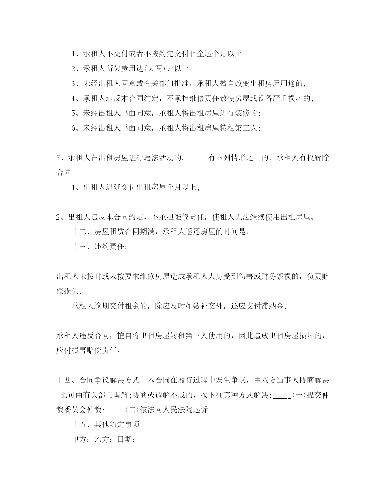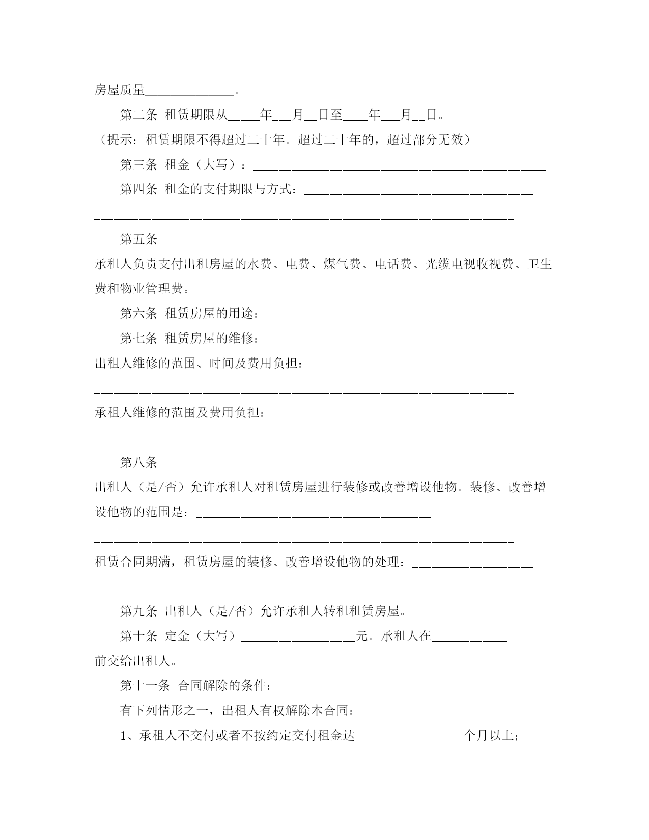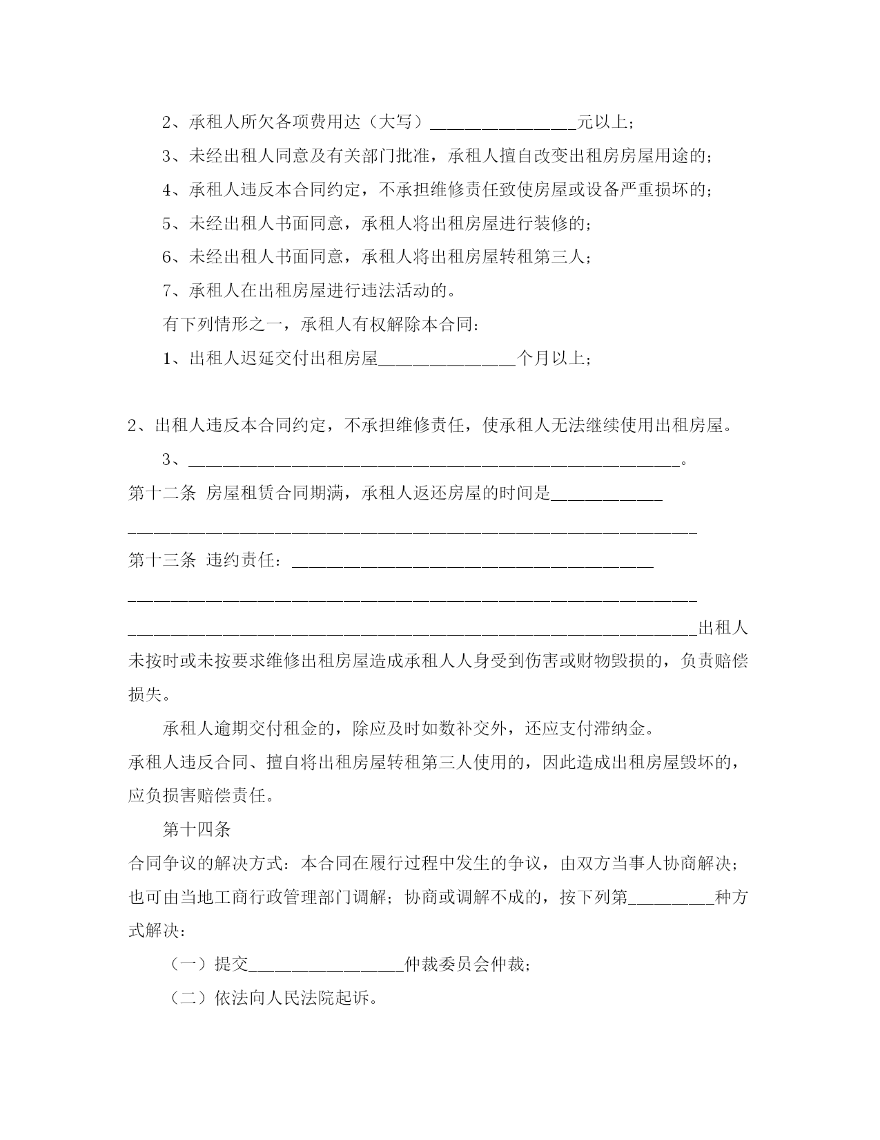 此资料由网络收集而来,如有侵权请告知上传者立即删除。资料共分享,我们负责传递知识。工商局房屋租赁合同工商局房屋租赁合同在人们越来越相信法律的社会中,合同对我们的约束力越来越不可忽视,签订合同能平衡双方当事人的平等地位。知道吗,写合同可是有方法的哦,以下是小编整理的工商局房屋租赁合同,仅供参考,希望能够帮助到大家。工商局房屋租赁合同1出租人:_____合同编号:承租人:_____签订地点:签订时间:一、租赁房屋坐落在间数,建筑面积、房屋质量。二、租赁期限从年月日至年月日。(期限不得超过二十年)三、租金(大写)四、租金的支付方式与期限:五、承租人负责支付出租房屋的水费、电费、煤气费、电话费、光缆电视收视费、卫生费和物业管理费。六、租赁房屋的用途:七、租赁房屋的维修:出租人维修的范围、时间及费用负担:承租人维修的范围及费用负担:八、出租人(是/否)允许承租人对租赁房屋进行装修或改善增设他物。装修、改善增设他物的范围是:租赁合同期满,租赁房屋的装修、改善增设他物的处理:九、出租人(是/否)允许承租人转租租赁房屋。十、定金(大写)元。承租人在前交给出租人。十一、合同解除的条件有下列情形之一,出租人有权解除本合同;1、承租人不交付或者不按约定交付租金达个月以上;2、承租人所欠费用达(大写)元以上;3、未经出租人同意或有关部门批准,承租人擅自改变出租房屋用途的;4、承租人违反本合同约定,不承担维修责任致使房屋或设备严重损坏的;5、未经出租人书面同意,承租人将出租房屋进行装修的;6、未经出租人书面同意,承租人将出租房屋转租第三人;7、承租人在出租房屋进行违法活动的。_____有下列情形之一的,承租人有权解除合同;1、出租人迟延交付出租房屋个月以上;2、出租人违反本合同约定,不承担维修责任,使租人无法继续使用出租房屋。十二、房屋租赁合同期满,承租人返还房屋的时间是:十三、违约责任:出租人未按时或未按要求维修房屋造成承租人人身受到伤害或财务毁损的,负责赔偿损失。承租人逾期交付租金的,除应及时如数补交外,还应支付滞纳金。承租人违反合同,擅自将出租房屋转租第三人使用的,因此造成出租房屋损坏的,应付损害赔偿责任。十四、合同争议解决方式:本合同在履行过程中发生争议,由双方当事人协商解决;也可由有关部门调解;协商或调解不成的,按下列第种方式解决;_____(一)提交仲裁委员会仲裁;_____(二)依法向人民法院起诉。十五、其他约定事项:甲方:乙方:日期:工商局房屋租赁合同2出租方:_____合同编号:承租方:_____签订地点:签订时间:_____年_____月_____日根据《中华人民共和国合同法》及有关规定,为明确出租方与承租方的权利义务关系,经双方协商一致,签订本合同。一、房屋座落:_____,间数:_____,面积:_____平方米,室内设备:_____。二、租赁期限:租赁期共_____年零_____月,从_____年_____月_____日至_____年_____月_____日。_____承租人有下列情形之一的出租人可以终止合同,收回房屋:1、承租人擅自将房屋转租、转让或转借的。2、承租人利用房屋进行非法活动。损害国家利益和社会公共利益的。3、承租人拖欠租金累计达_____个月的。租赁合同如因期满而终止时,如承租人到期确实无法找到房屋,出租人应当酌期延长租赁期限_____个月。如承租方逾期不搬迁,出租方有权向人民法院起诉和申请执行。出租方因此所受损失由承租方负责赔偿,合同期满后,如出租方仍继续出租房屋的,承租方享有优先权。三、租金和租金的交纳期限四、租赁期间房屋修缮修缮房屋是出租人的.义务。出租人对房屋及其设备应每隔_____月(或年)认真检查、修缮一次,以保障承租人居住安全和正常使用。(人为损坏室内装璜及设备,由承租人负责赔偿)五、出租方与承租方变更1、如果出租方将房产所有权转移给第三方时,合同对新的房产所有者继续有效。2、出租人出卖房屋,须在三个月前通知承租人。3、承租人需要与第三人互换住房时,应事先征得出租人同意,出租人应支持承租人的合理要求。六、违约责任七、争议的解决方式:本合同在履行中如发生争议,双方一致同意提交温州仲裁委员会仲裁。八、本合同未尽事宜,一律按《中华人民共和国合同法》的有关规定,经合同双方共同协商,作出其他约定事项:九、本合同正本一式两份,出租方、承租方各执一份,合同副本两份,送温州市工商行政管理局鹿城分局备案。监制部门:印刷单位:甲方:乙方:日期:工商局房屋租赁合同3合同编号:______出租人:______签订地点:_______承租人:______签订时间:______第一条租赁房屋坐落
