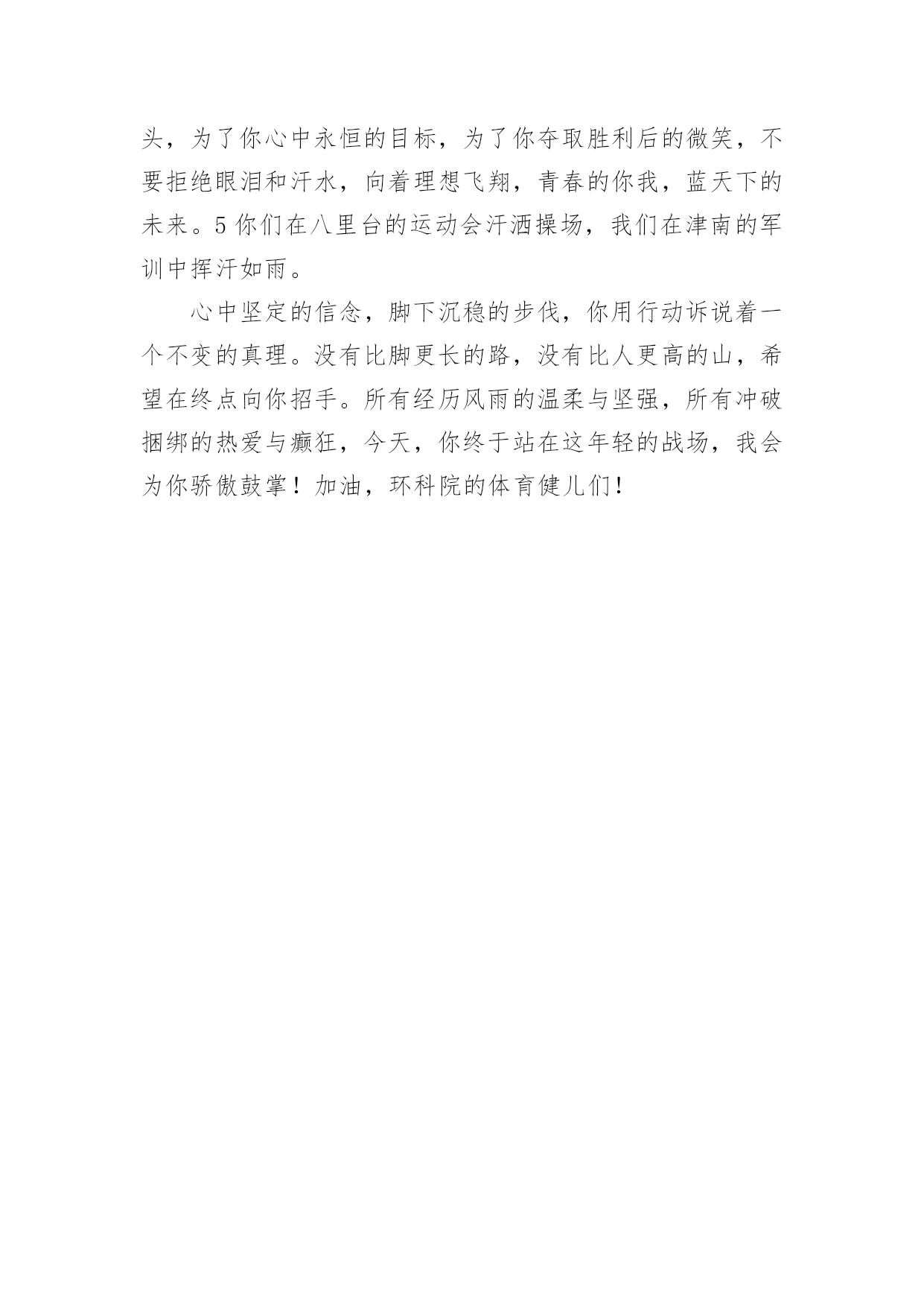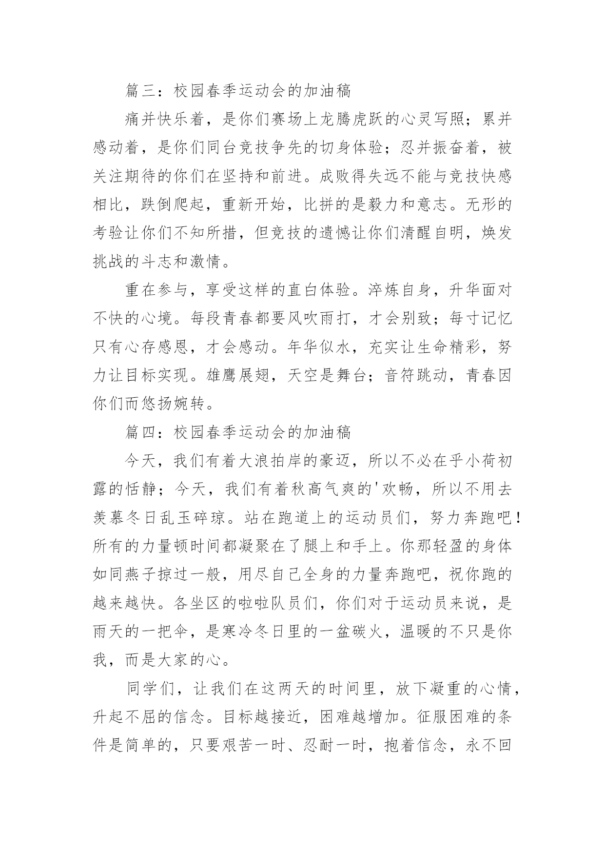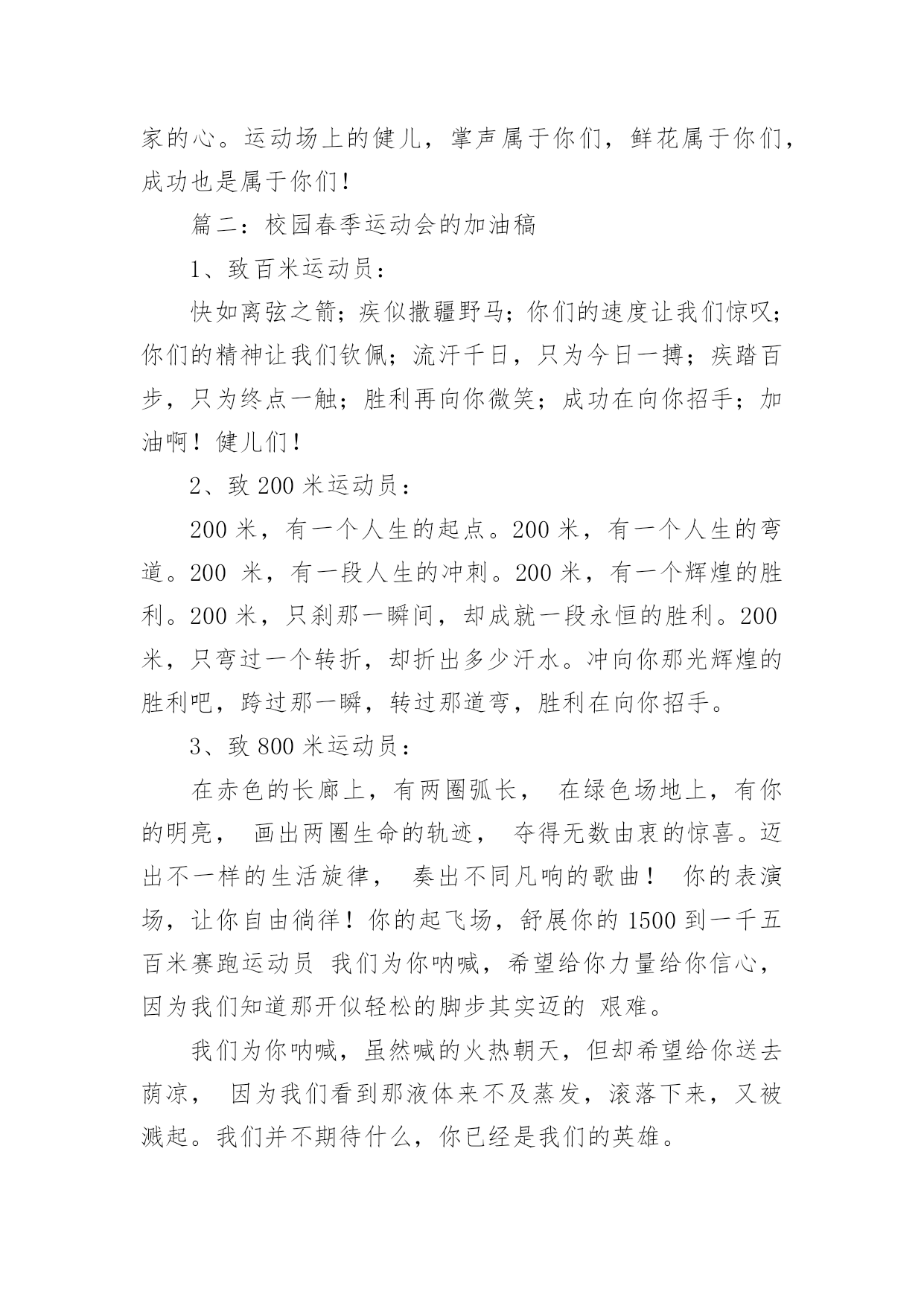 校园春季运动会的加油稿校园春季运动会的加油稿四篇篇一:校园春季运动会的加油稿1、“拼却老红一万点,换将新绿百千重”,拼搏的永远是勇者,成功也永远属于勇于拼搏的强者。接力棒传递的是一种精神,一种力量,更传递一种无畏、所向披靡的意志。每个健儿们都在拼,拼体力,拼意志。把自己青春活力尽情挥洒在长长短短的跑道上。拼搏吧,健儿们,用我们的精神去书写我们的青春风貌去展现我们的青春!2、不为鲜花的围绕,不为刹那的荣耀,只有执着的信念,化作不停的奔跑,心中燃烧着梦想,脚下不停的步伐,你用行动述说着过程的重要,没有无尽的终点,没有无法攀登的险峰,希望载着终点在向你微笑,拼搏吧!经历是一种精彩,迸发你全部的能量,成功是你汗水的写照。3、今天下着蒙蒙细雨,但运动健儿们却敬发着向上朝气,蓬勃的激情!运动员们你不用紧张,我们班的同学们正为你们加油!使尽全力,取得最好的成绩,为我们班争光吧!加油!你们是最棒的!4、每一份辛劳都有一份收获,每一次的痛苦都是快乐的开始,每一声呐喊都是力量的呼唤。我们有着大浪拍岸的豪迈,所以你不必在乎小荷初露的恬静,我们有着春日的阳光明媚,所以不用去羡慕冬日乱玉碎琼,我们是雨天的一把伞,是寒冷冬日里的一盆碳火,温暖的不只是你我,而是大家的心。运动场上的健儿,掌声属于你们,鲜花属于你们,成功也是属于你们!篇二:校园春季运动会的加油稿1、致百米运动员:快如离弦之箭;疾似撒疆野马;你们的速度让我们惊叹;你们的精神让我们钦佩;流汗千日,只为今日一搏;疾踏百步,只为终点一触;胜利再向你微笑;成功在向你招手;加油啊!健儿们!2、致200米运动员:200米,有一个人生的起点。200米,有一个人生的弯道。200米,有一段人生的冲刺。200米,有一个辉煌的胜利。200米,只刹那一瞬间,却成就一段永恒的胜利。200米,只弯过一个转折,却折出多少汗水。冲向你那光辉煌的胜利吧,跨过那一瞬,转过那道弯,胜利在向你招手。3、致800米运动员:在赤色的长廊上,有两圈弧长,在绿色场地上,有你的明亮,画出两圈生命的轨迹,夺得无数由衷的惊喜。迈出不一样的生活旋律,奏出不同凡响的歌曲!你的表演场,让你自由徜徉!你的起飞场,舒展你的1500到一千五百米赛跑运动员我们为你呐喊,希望给你力量给你信心,因为我们知道那开似轻松的脚步其实迈的艰难。我们为你呐喊,虽然喊的火热朝天,但却希望给你送去荫凉,因为我们看到那液体来不及蒸发,滚落下来,又被溅起。我们并不期待什么,你已经是我们的英雄。篇三:校园春季运动会的加油稿痛并快乐着,是你们赛场上龙腾虎跃的心灵写照;累并感动着,是你们同台竞技争先的切身体验;忍并振奋着,被关注期待的你们在坚持和前进。成败得失远不能与竞技快感相比,跌倒爬起,重新开始,比拼的是毅力和意志。无形的考验让你们不知所措,但竞技的遗憾让你们清醒自明,焕发挑战的斗志和激情。重在参与,享受这样的直白体验。淬炼自身,升华面对不快的心境。每段青春都要风吹雨打,才会别致;每寸记忆只有心存感恩,才会感动。年华似水,充实让生命精彩,努力让目标实现。雄鹰展翅,天空是舞台;音符跳动,青春因你们而悠扬婉转。篇四:校园春季运动会的加油稿今天,我们有着大浪拍岸的豪迈,所以不必在乎小荷初露的恬静;今天,我们有着秋高气爽的'欢畅,所以不用去羡慕冬日乱玉碎琼。站在跑道上的运动员们,努力奔跑吧!所有的力量顿时间都凝聚在了腿上和手上。你那轻盈的身体如同燕子掠过一般,用尽自己全身的力量奔跑吧,祝你跑的越来越快。各坐区的啦啦队员们,你们对于运动员来说,是雨天的一把伞,是寒冷冬日里的一盆碳火,温暖的不只是你我,而是大家的心。同学们,让我们在这两天的时间里,放下凝重的心情,升起不屈的信念。目标越接近,困难越增加。征服困难的条件是简单的,只要艰苦一时、忍耐一时,抱着信念,永不回头,为了你心中永恒的目标,为了你夺取胜利后的微笑,不要拒绝眼泪和汗水,向着理想飞翔,青春的你我,蓝天下的未来。5你们在八里台的运动会汗洒操场,我们在津南的军训中挥汗如雨。心中坚定的信念,脚下沉稳的步伐,你用行动诉说着一个不变的真理。没有比脚更长的路,没有比人更高的山,希望在终点向你招手。所有经历风雨的温柔与坚强,所有冲破捆绑的热爱与癫狂,今天,你终于站在这年轻的战场,我会为你骄傲鼓掌!加油,环科院的体育健儿们!