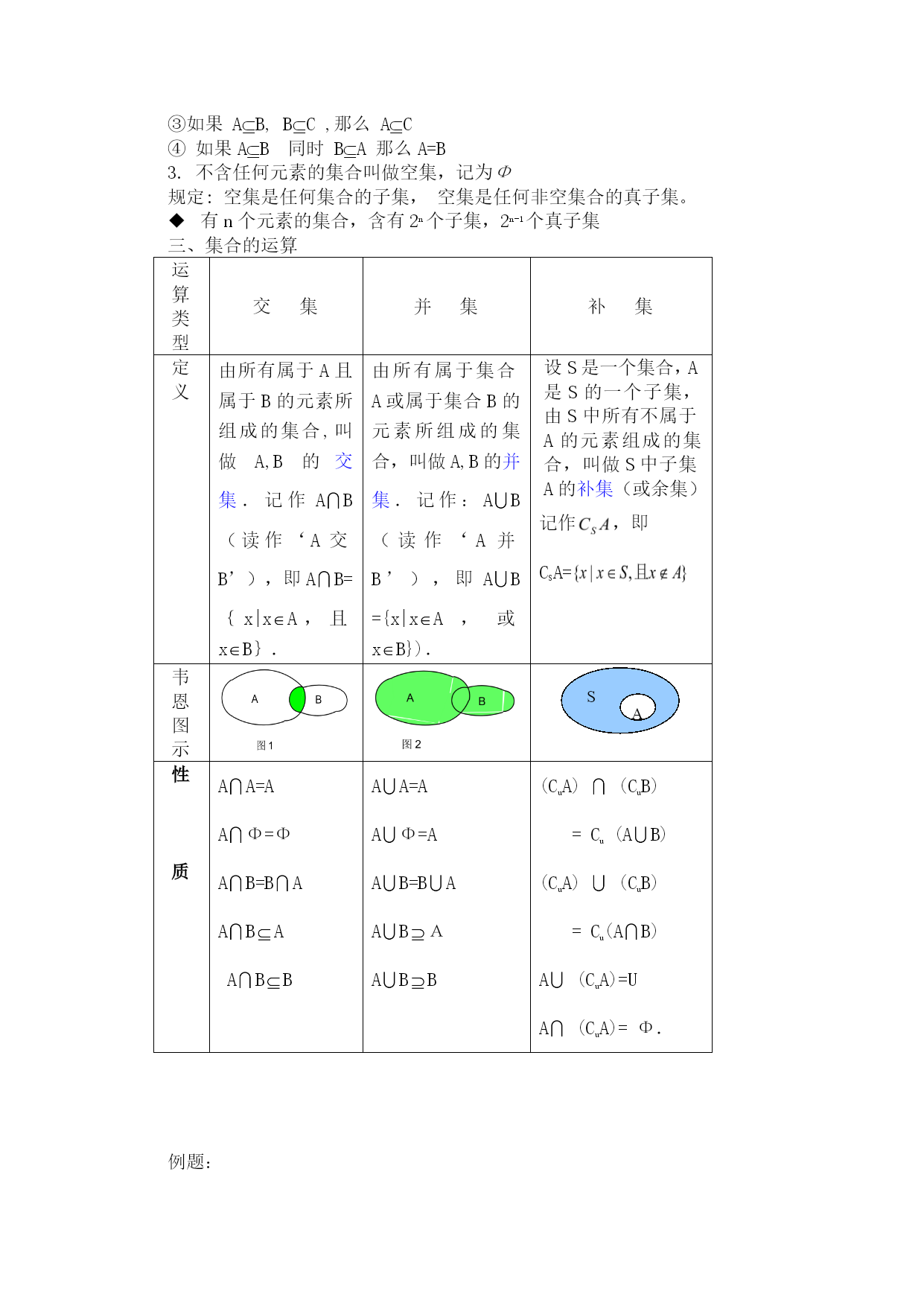 第一章集合与函数概念一、集合有关概念集合的含义:某些指定的对象集在一起就成为一个集合,其中每一个对象叫元素。集合的中元素的三个特性:元素的确定性如:世界上最高的山元素的互异性如:由HAPPY的字母组成的集合{H,A,P,Y}元素的无序性:如:{a,b,c}和{a,c,b}是表示同一个集合说明:(1)对于一个给定的集合,集合中的元素是确定的,任何一个对象或者是或者不是这个给定的集合的元素。(2)任何一个给定的集合中,任何两个元素都是不同的对象,相同的对象归入一个集合时,仅算一个元素。(3)集合中的元素是平等的,没有先后顺序,因此判定两个集合是否一样,仅需比较它们的元素是否一样,不需考查排列顺序是否一样。(4)集合元素的三个特性使集合本身具有了确定性和整体性。3.集合的表示:{…}如:{我校的篮球队员},{太平洋,大西洋,印度洋,北冰洋}用拉丁字母表示集合:A={我校的篮球队员},B={1,2,3,4,5}集合的表示方法:注意:常用数集及其记法:非负整数集(即自然数集)记作:N正整数集N*或N+整数集Z有理数集Q实数集R列举法:{a,b,c……}描述法:将集合中的元素的公共属性描述出来,写在大括号内表示集合的方法。{xR|x-3>2},{x|x-3>2}语言描述法:例:{不是直角三角形的三角形}Venn图:4、集合的分类:有限集含有有限个元素的集合无限集含有无限个元素的集合空集不含任何元素的集合例:{x|x2=-5}二、集合间的基本关系1.“包含”关系—子集注意:有两种可能(1)A是B的一部分,;(2)A与B是同一集合。反之:集合A不包含于集合B,或集合B不包含集合A,记作AB或BA2.“相等”关系:A=B(5≥5,且5≤5,则5=5)实例:设A={x|x2-1=0}B={-1,1}“元素相同则两集合相等”即:①任何一个集合是它本身的子集。AA②真子集:如果AB,且AB那就说集合A是集合B的真子集,记作AB(或BA)③如果AB,BC,那么AC④如果AB同时BA那么A=B3.不含任何元素的集合叫做空集,记为Φ规定:空集是任何集合的子集,空集是任何非空集合的真子集。有n个元素的集合,含有2n个子集,2n-1个真子集三、集合的运算运算类型交集并集补集定义由所有属于A且属于B的元素所组成的集合,叫做A,B的交集.记作AB(读作‘A交B’),即AB={x|xA,且xB}.由所有属于集合A或属于集合B的元素所组成的集合,叫做A,B的并集.记作:AB(读作‘A并B’),即AB={x|xA,或xB}).设S是一个集合,A是S的一个子集,由S中所有不属于A的元素组成的集合,叫做S中子集A的补集(或余集)SA记作,即CSA=韦恩图示SA性质AA=AAΦ=ΦAB=BAABAABBAA=AAΦ=AAB=BAABAABB(CuA)(CuB)=Cu(AB)(CuA)(CuB)=Cu(AB)A(CuA)=UA(CuA)=Φ.例题:设集合,问是否存在这样的实数a,使得与同时成立?求出实数a;若不存在说明理由