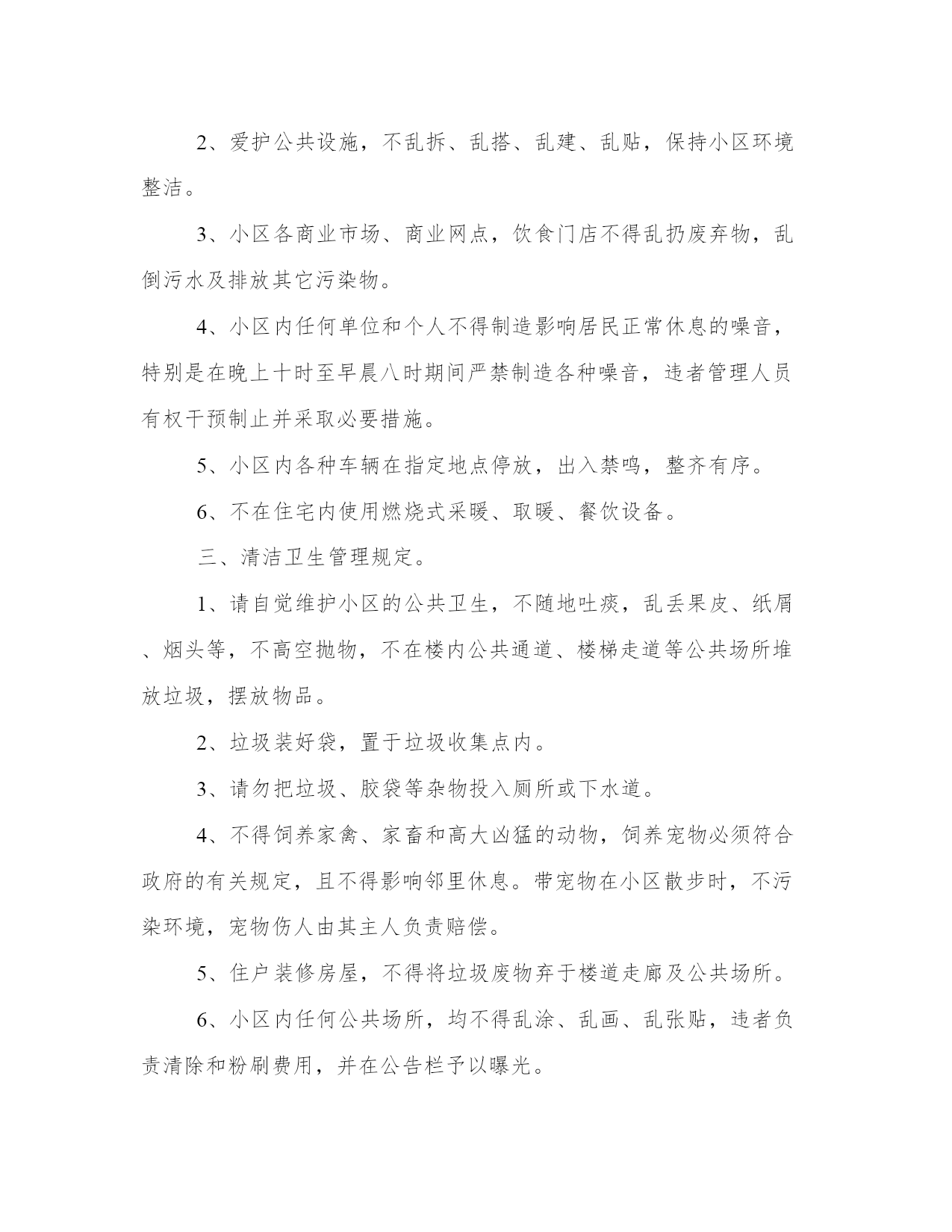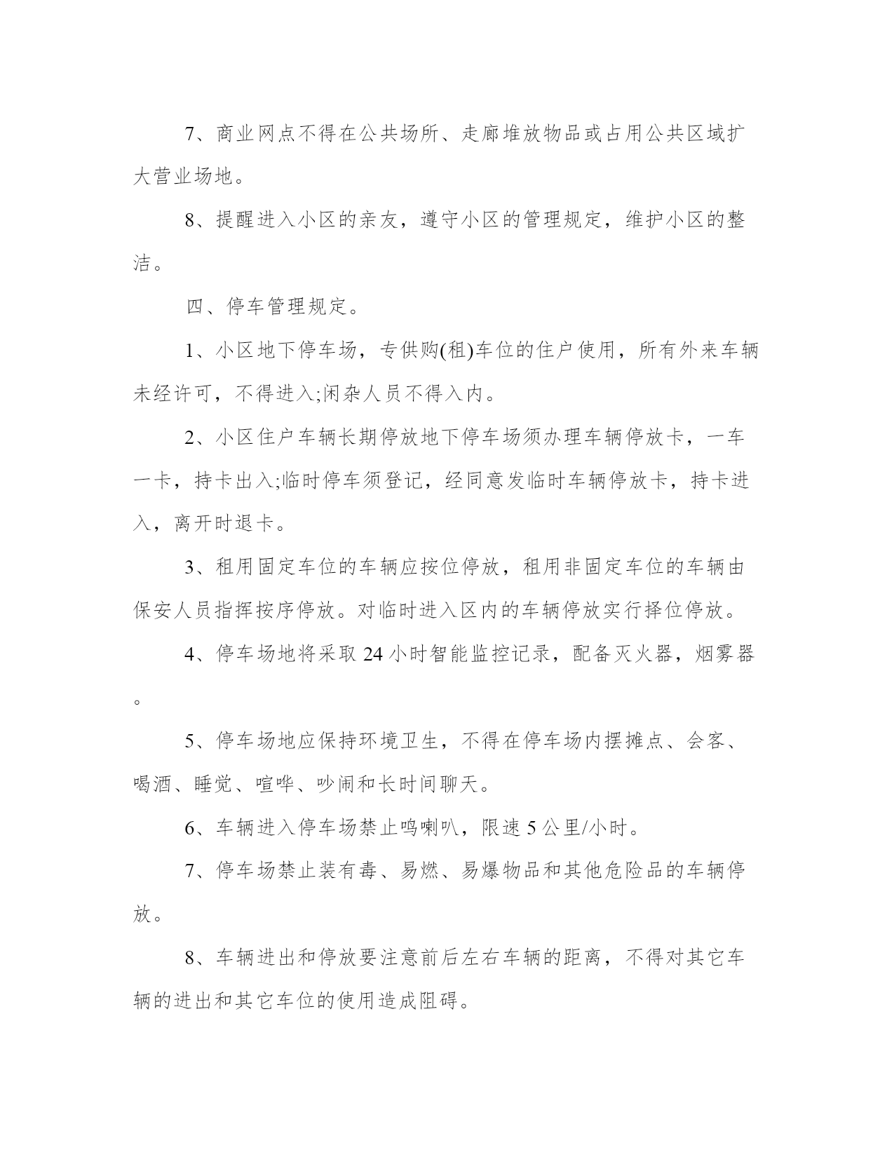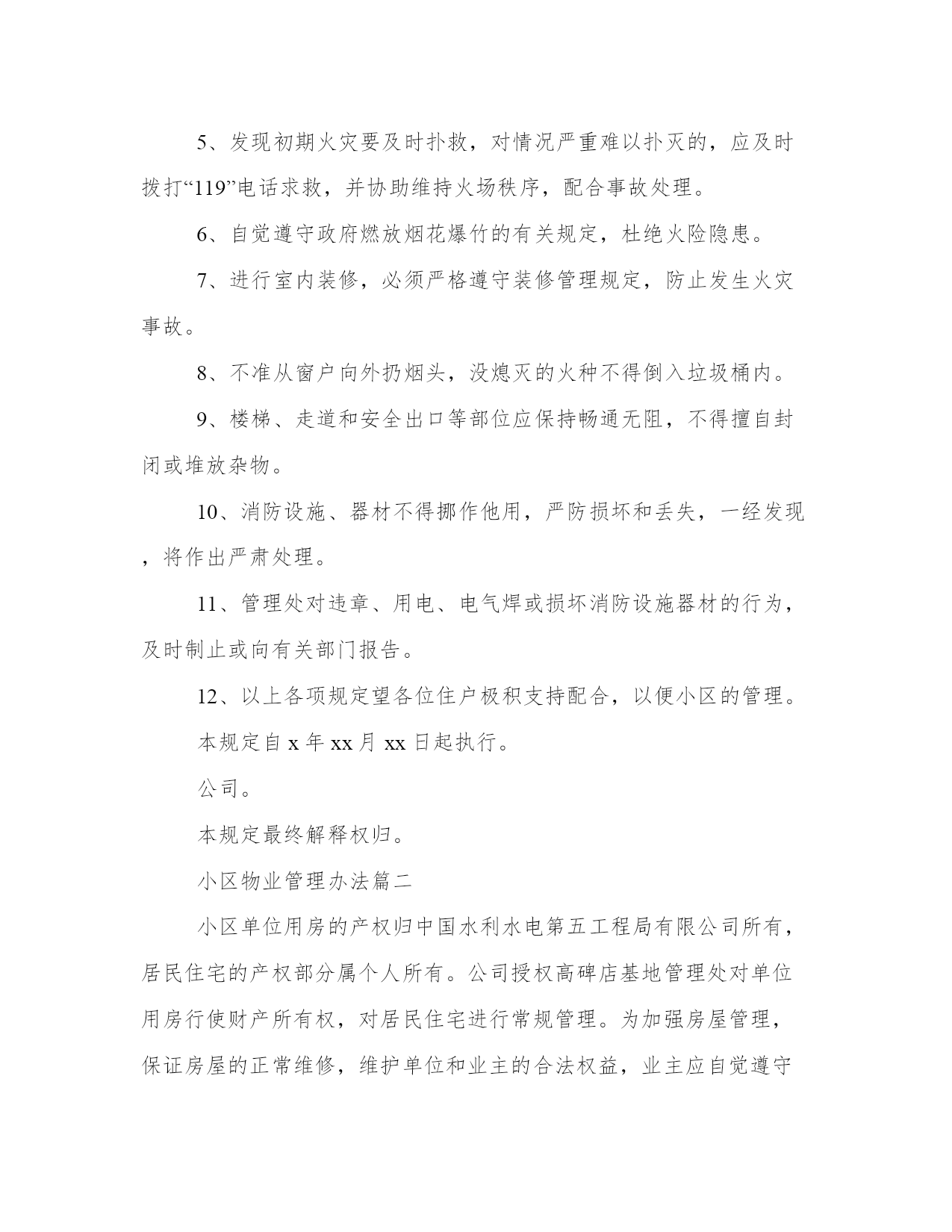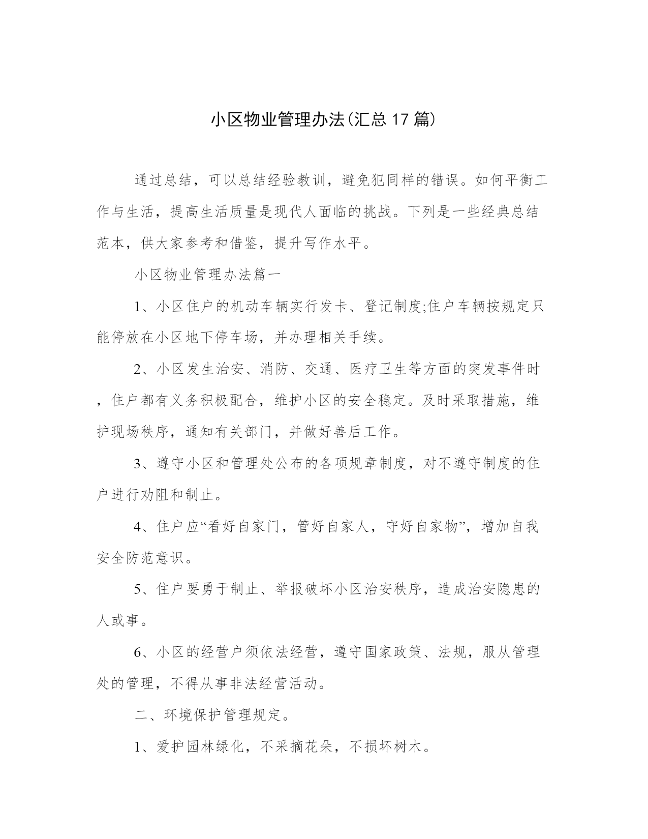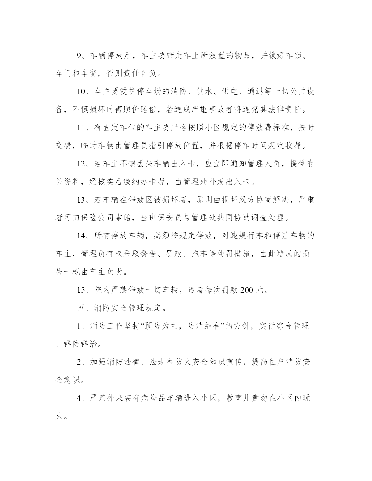 小区物业管理办法(汇总17篇)通过总结,可以总结经验教训,避免犯同样的错误。如何平衡工作与生活,提高生活质量是现代人面临的挑战。下列是一些经典总结范本,供大家参考和借鉴,提升写作水平。小区物业管理办法篇一1、小区住户的机动车辆实行发卡、登记制度;住户车辆按规定只能停放在小区地下停车场,并办理相关手续。2、小区发生治安、消防、交通、医疗卫生等方面的突发事件时,住户都有义务积极配合,维护小区的安全稳定。及时采取措施,维护现场秩序,通知有关部门,并做好善后工作。3、遵守小区和管理处公布的各项规章制度,对不遵守制度的住户进行劝阻和制止。4、住户应“看好自家门,管好自家人,守好自家物”,增加自我安全防范意识。5、住户要勇于制止、举报破坏小区治安秩序,造成治安隐患的人或事。6、小区的经营户须依法经营,遵守国家政策、法规,服从管理处的管理,不得从事非法经营活动。二、环境保护管理规定。1、爱护园林绿化,不采摘花朵,不损坏树木。2、爱护公共设施,不乱拆、乱搭、乱建、乱贴,保持小区环境整洁。3、小区各商业市场、商业网点,饮食门店不得乱扔废弃物,乱倒污水及排放其它污染物。4、小区内任何单位和个人不得制造影响居民正常休息的噪音,特别是在晚上十时至早晨八时期间严禁制造各种噪音,违者管理人员有权干预制止并采取必要措施。5、小区内各种车辆在指定地点停放,出入禁鸣,整齐有序。6、不在住宅内使用燃烧式采暖、取暖、餐饮设备。三、清洁卫生管理规定。1、请自觉维护小区的公共卫生,不随地吐痰,乱丢果皮、纸屑、烟头等,不高空抛物,不在楼内公共通道、楼梯走道等公共场所堆放垃圾,摆放物品。2、垃圾装好袋,置于垃圾收集点内。3、请勿把垃圾、胶袋等杂物投入厕所或下水道。4、不得饲养家禽、家畜和高大凶猛的动物,饲养宠物必须符合政府的有关规定,且不得影响邻里休息。带宠物在小区散步时,不污染环境,宠物伤人由其主人负责赔偿。5、住户装修房屋,不得将垃圾废物弃于楼道走廊及公共场所。6、小区内任何公共场所,均不得乱涂、乱画、乱张贴,违者负责清除和粉刷费用,并在公告栏予以曝光。7、商业网点不得在公共场所、走廊堆放物品或占用公共区域扩大营业场地。8、提醒进入小区的亲友,遵守小区的管理规定,维护小区的整洁。四、停车管理规定。1、小区地下停车场,专供购(租)车位的住户使用,所有外来车辆未经许可,不得进入;闲杂人员不得入内。2、小区住户车辆长期停放地下停车场须办理车辆停放卡,一车一卡,持卡出入;临时停车须登记,经同意发临时车辆停放卡,持卡进入,离开时退卡。3、租用固定车位的车辆应按位停放,租用非固定车位的车辆由保安人员指挥按序停放。对临时进入区内的车辆停放实行择位停放。4、停车场地将采取24小时智能监控记录,配备灭火器,烟雾器。5、停车场地应保持环境卫生,不得在停车场内摆摊点、会客、喝酒、睡觉、喧哗、吵闹和长时间聊天。6、车辆进入停车场禁止鸣喇叭,限速5公里/小时。7、停车场禁止装有毒、易燃、易爆物品和其他危险品的车辆停放。8、车辆进出和停放要注意前后左右车辆的距离,不得对其它车辆的进出和其它车位的使用造成阻碍。9、车辆停放后,车主要带走车上所放置的物品,并锁好车锁、车门和车窗,否则责任自负。10、车主要爱护停车场的消防、供水、供电、通迅等一切公共设备,不慎损坏时需照价赔偿,若造成严重事故者将追究其法律责任。11、有固定车位的车主要严格按照小区规定的停放费标准,按时交费,临时车辆由管理员指引停放位置,并根据停车时间规定收费。12、若车主不慎丢失车辆出入卡,应立即通知管理人员,提供有关资料,经核实后缴纳办卡费,由管理处补发出入卡。13、若车辆在停放区被损坏者,原则由损坏双方协商解决,严重者可向保险公司索赔,当班保安员与管理处共同协助调查处理。14、所有停放车辆,必须按规定停放,对违规行车和停泊车辆的车主,管理员有权采取警告、罚款、拖车等处罚措施,由此造成的损失一概由车主负责。15、院内严禁停放一切车辆,违者每次罚款200元。五、消防安全管理规定。1、消防工作坚持“预防为主,防消结合”的方针,实行综合管理、群防群治。2、加强消防法律、法规和防火安全知识宣传,提高住户消防安全意识。4、严禁外来装有危险品车辆进入小区,教育儿童勿在小区内玩火。5、发现初期火灾要及时扑救,对情况严重难以扑灭的,应及时拨打“119”电话求救,并协助维持火场秩序,配合事故处理。6、自觉遵守政府燃放烟花爆竹的有关规定,杜绝火险隐患。7、进行室内装修,必须严格遵守装修管理规定,防止发生火灾事故。8、不准从窗户向外扔烟头,没熄灭的火种不得倒入垃圾桶内。9、楼梯、走道和安全出口等部位应保持畅通无阻,不得擅自封闭或堆放杂物。10、消防设施、