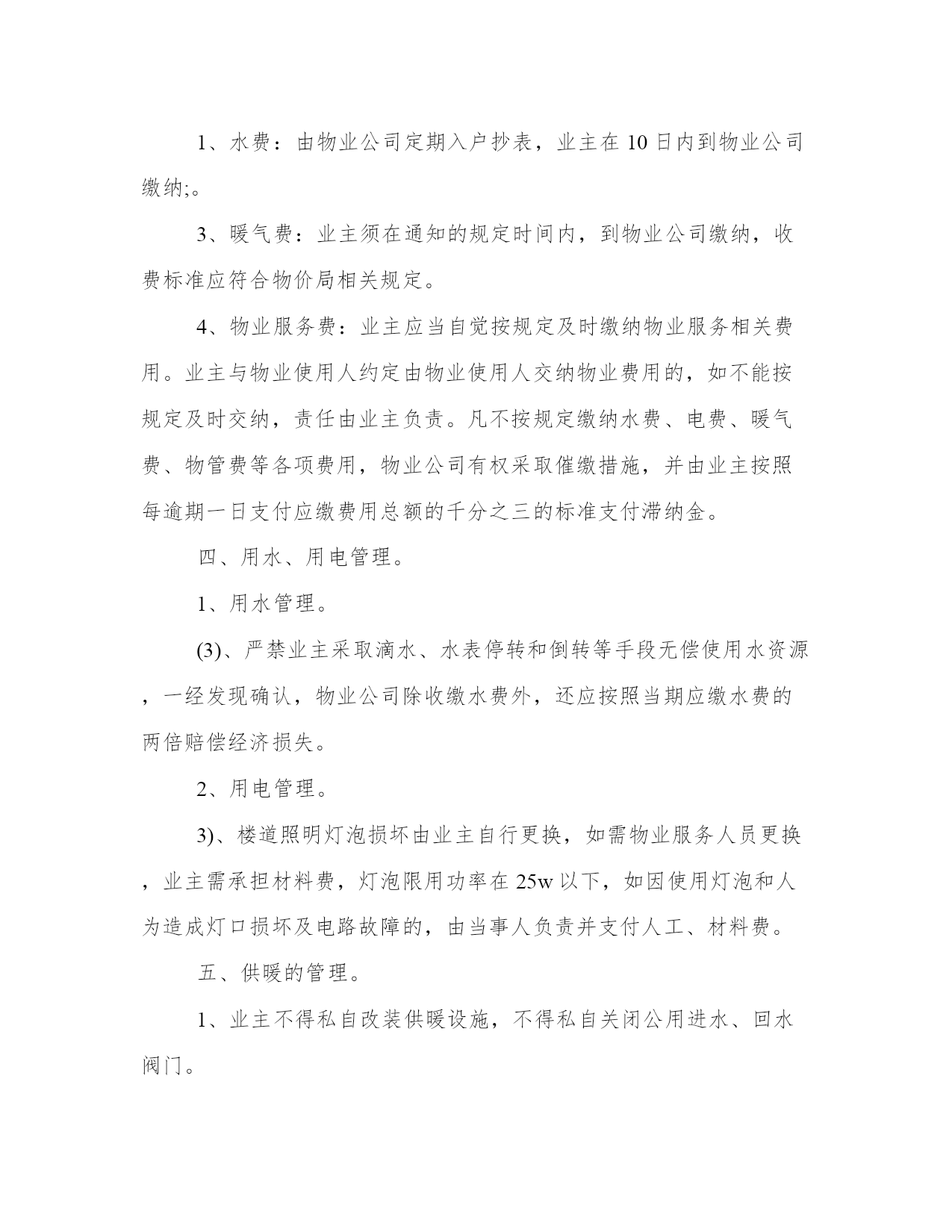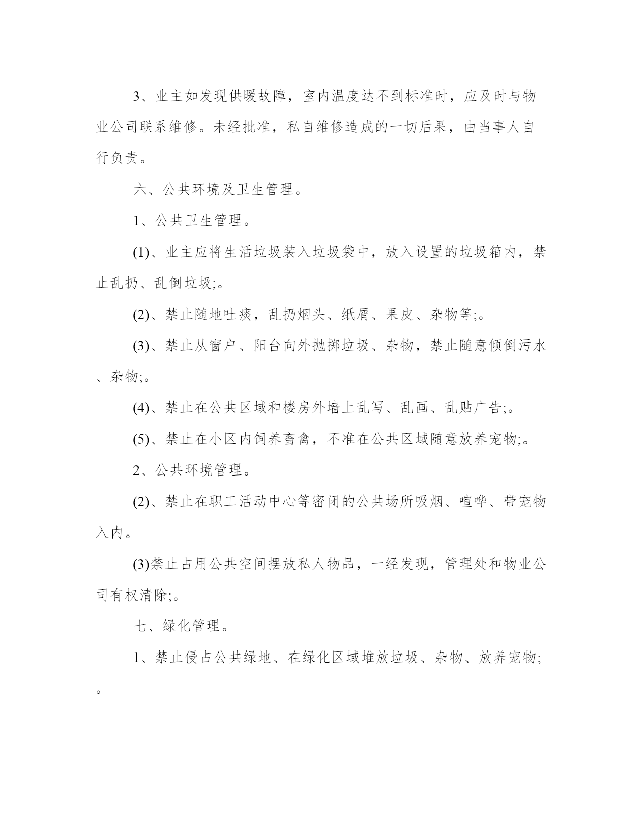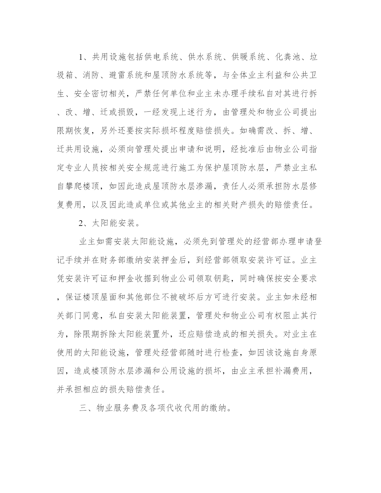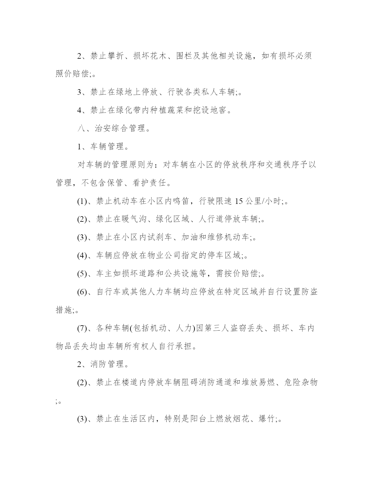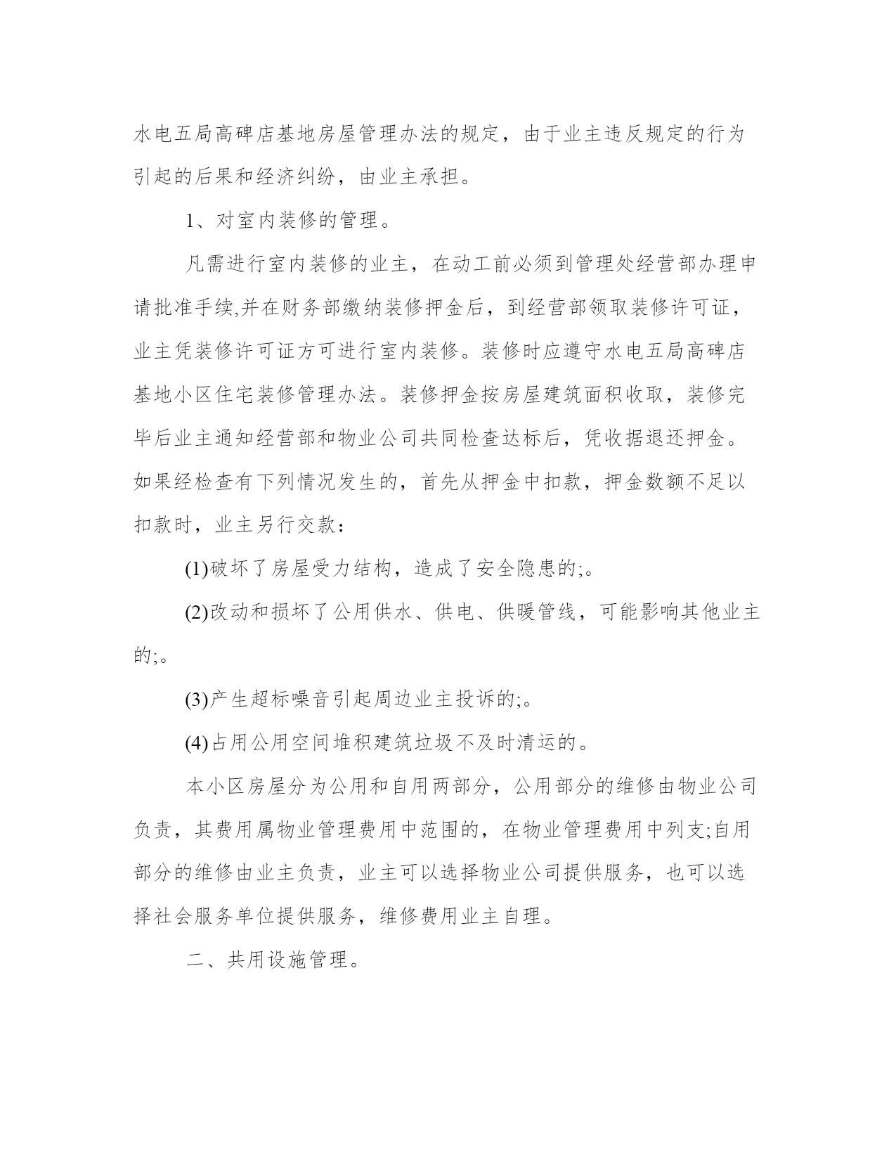 小区物业管理办法(汇总17篇)通过总结,可以总结经验教训,避免犯同样的错误。如何平衡工作与生活,提高生活质量是现代人面临的挑战。下列是一些经典总结范本,供大家参考和借鉴,提升写作水平。小区物业管理办法篇一1、小区住户的机动车辆实行发卡、登记制度;住户车辆按规定只能停放在小区地下停车场,并办理相关手续。2、小区发生治安、消防、交通、医疗卫生等方面的突发事件时,住户都有义务积极配合,维护小区的安全稳定。及时采取措施,维护现场秩序,通知有关部门,并做好善后工作。3、遵守小区和管理处公布的各项规章制度,对不遵守制度的住户进行劝阻和制止。4、住户应“看好自家门,管好自家人,守好自家物”,增加自我安全防范意识。5、住户要勇于制止、举报破坏小区治安秩序,造成治安隐患的人或事。6、小区的经营户须依法经营,遵守国家政策、法规,服从管理处的管理,不得从事非法经营活动。二、环境保护管理规定。1、爱护园林绿化,不采摘花朵,不损坏树木。2、爱护公共设施,不乱拆、乱搭、乱建、乱贴,保持小区环境整洁。3、小区各商业市场、商业网点,饮食门店不得乱扔废弃物,乱倒污水及排放其它污染物。4、小区内任何单位和个人不得制造影响居民正常休息的噪音,特别是在晚上十时至早晨八时期间严禁制造各种噪音,违者管理人员有权干预制止并采取必要措施。5、小区内各种车辆在指定地点停放,出入禁鸣,整齐有序。6、不在住宅内使用燃烧式采暖、取暖、餐饮设备。三、清洁卫生管理规定。1、请自觉维护小区的公共卫生,不随地吐痰,乱丢果皮、纸屑、烟头等,不高空抛物,不在楼内公共通道、楼梯走道等公共场所堆放垃圾,摆放物品。2、垃圾装好袋,置于垃圾收集点内。3、请勿把垃圾、胶袋等杂物投入厕所或下水道。4、不得饲养家禽、家畜和高大凶猛的动物,饲养宠物必须符合政府的有关规定,且不得影响邻里休息。带宠物在小区散步时,不污染环境,宠物伤人由其主人负责赔偿。5、住户装修房屋,不得将垃圾废物弃于楼道走廊及公共场所。6、小区内任何公共场所,均不得乱涂、乱画、乱张贴,违者负责清除和粉刷费用,并在公告栏予以曝光。7、商业网点不得在公共场所、走廊堆放物品或占用公共区域扩大营业场地。8、提醒进入小区的亲友,遵守小区的管理规定,维护小区的整洁。四、停车管理规定。1、小区地下停车场,专供购(租)车位的住户使用,所有外来车辆未经许可,不得进入;闲杂人员不得入内。2、小区住户车辆长期停放地下停车场须办理车辆停放卡,一车一卡,持卡出入;临时停车须登记,经同意发临时车辆停放卡,持卡进入,离开时退卡。3、租用固定车位的车辆应按位停放,租用非固定车位的车辆由保安人员指挥按序停放。对临时进入区内的车辆停放实行择位停放。4、停车场地将采取24小时智能监控记录,配备灭火器,烟雾器。5、停车场地应保持环境卫生,不得在停车场内摆摊点、会客、喝酒、睡觉、喧哗、吵闹和长时间聊天。6、车辆进入停车场禁止鸣喇叭,限速5公里/小时。7、停车场禁止装有毒、易燃、易爆物品和其他危险品的车辆停放。8、车辆进出和停放要注意前后左右车辆的距离,不得对其它车辆的进出和其它车位的使用造成阻碍。9、车辆停放后,车主要带走车上所放置的物品,并锁好车锁、车门和车窗,否则责任自负。10、车主要爱护停车场的消防、供水、供电、通迅等一切公共设备,不慎损坏时需照价赔偿,若造成严重事故者将追究其法律责任。11、有固定车位的车主要严格按照小区规定的停放费标准,按时交费,临时车辆由管理员指引停放位置,并根据停车时间规定收费。12、若车主不慎丢失车辆出入卡,应立即通知管理人员,提供有关资料,经核实后缴纳办卡费,由管理处补发出入卡。13、若车辆在停放区被损坏者,原则由损坏双方协商解决,严重者可向保险公司索赔,当班保安员与管理处共同协助调查处理。14、所有停放车辆,必须按规定停放,对违规行车和停泊车辆的车主,管理员有权采取警告、罚款、拖车等处罚措施,由此造成的损失一概由车主负责。15、院内严禁停放一切车辆,违者每次罚款200元。五、消防安全管理规定。1、消防工作坚持“预防为主,防消结合”的方针,实行综合管理、群防群治。2、加强消防法律、法规和防火安全知识宣传,提高住户消防安全意识。4、严禁外来装有危险品车辆进入小区,教育儿童勿在小区内玩火。5、发现初期火灾要及时扑救,对情况严重难以扑灭的,应及时拨打“119”电话求救,并协助维持火场秩序,配合事故处理。6、自觉遵守政府燃放烟花爆竹的有关规定,杜绝火险隐患。7、进行室内装修,必须严格遵守装修管理规定,防止发生火灾事故。8、不准从窗户向外扔烟头,没熄灭的火种不得倒入垃圾桶内。9、楼梯、走道和安全出口等部位应保持畅通无阻,不得擅自封闭或堆放杂物。10、消防设施、