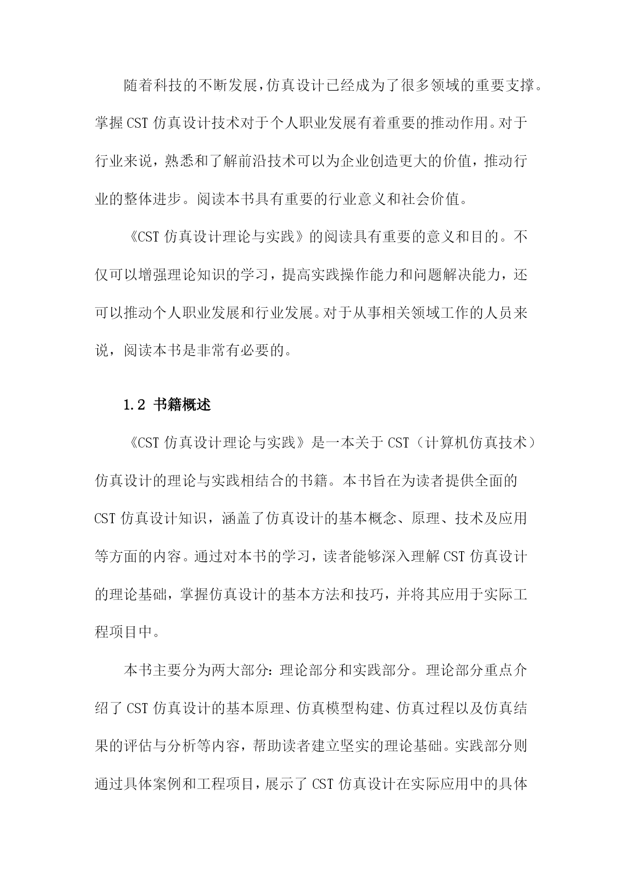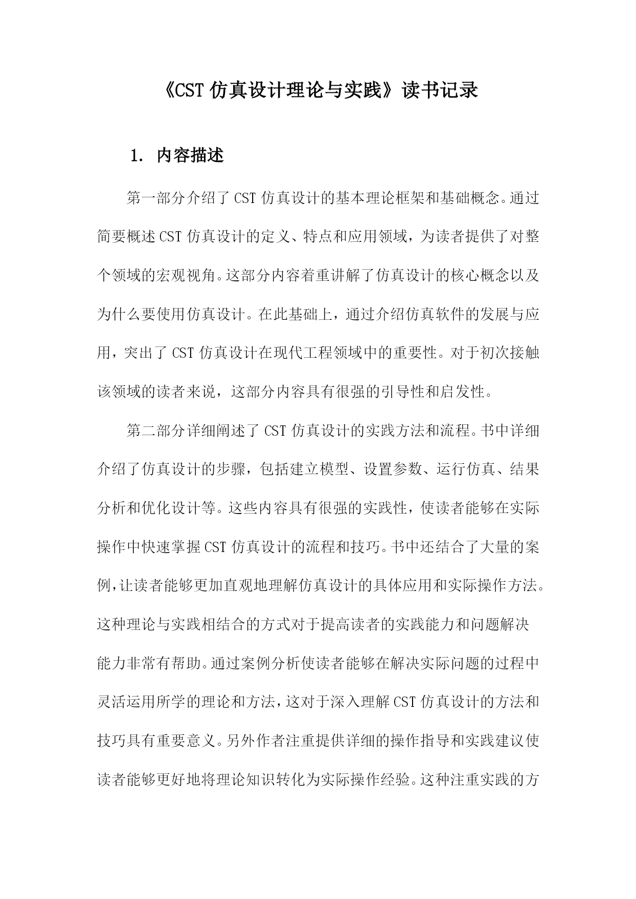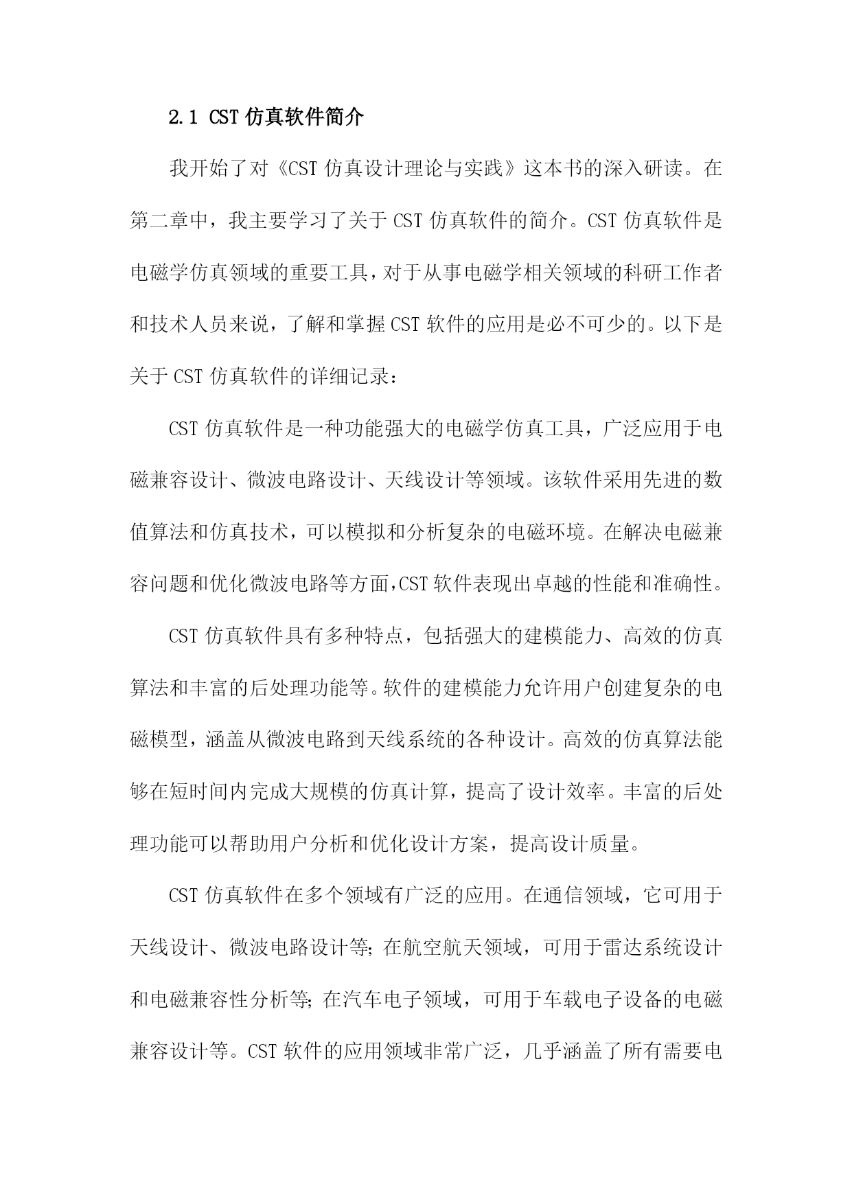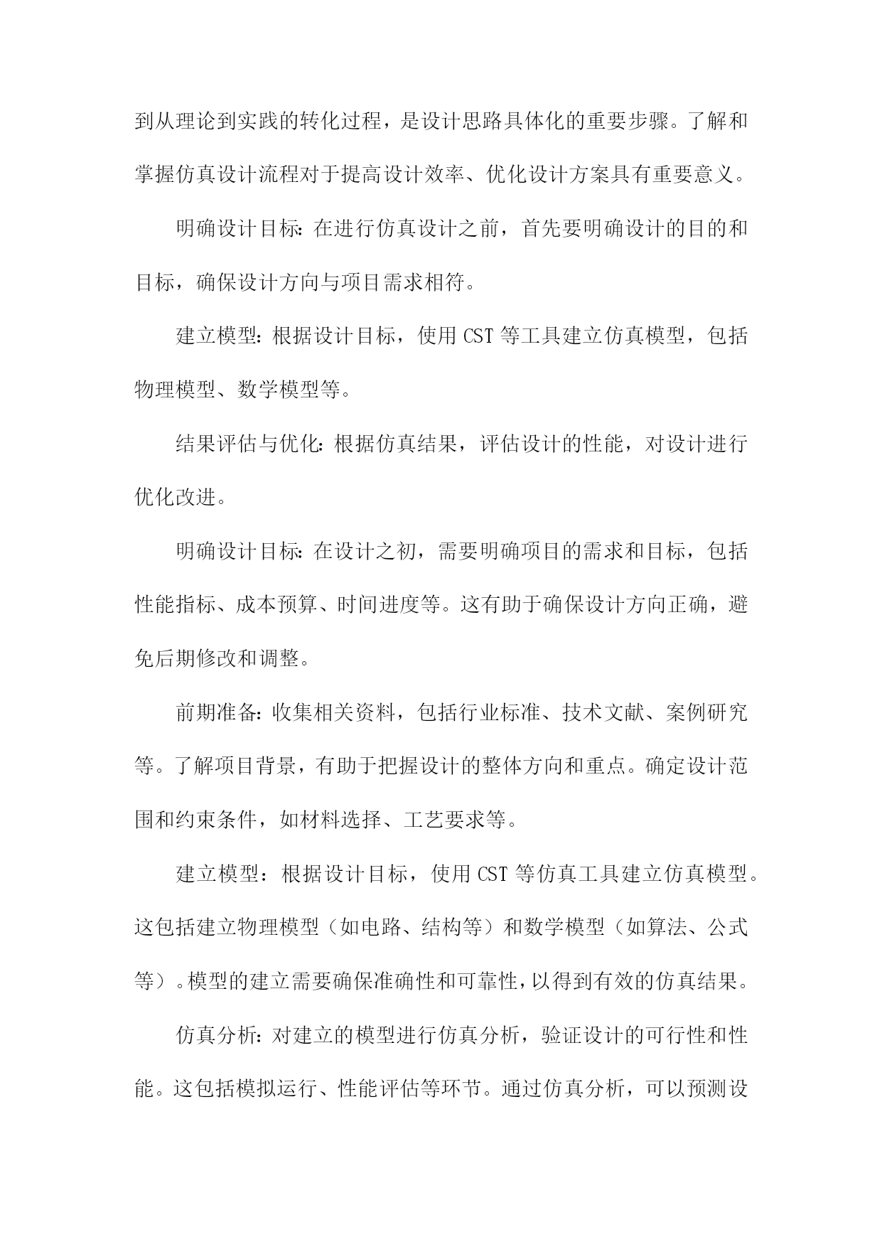 《CST仿真设计理论与实践》读书记录1.内容描述第一部分介绍了CST仿真设计的基本理论框架和基础概念。通过简要概述CST仿真设计的定义、特点和应用领域,为读者提供了对整个领域的宏观视角。这部分内容着重讲解了仿真设计的核心概念以及为什么要使用仿真设计。在此基础上,通过介绍仿真软件的发展与应用,突出了CST仿真设计在现代工程领域中的重要性。对于初次接触该领域的读者来说,这部分内容具有很强的引导性和启发性。第二部分详细阐述了CST仿真设计的实践方法和流程。书中详细介绍了仿真设计的步骤,包括建立模型、设置参数、运行仿真、结果分析和优化设计等。这些内容具有很强的实践性,使读者能够在实际操作中快速掌握CST仿真设计的流程和技巧。书中还结合了大量的案例,让读者能够更加直观地理解仿真设计的具体应用和实际操作方法。这种理论与实践相结合的方式对于提高读者的实践能力和问题解决能力非常有帮助。通过案例分析使读者能够在解决实际问题的过程中灵活运用所学的理论和方法,这对于深入理解CST仿真设计的方法和技巧具有重要意义。另外作者注重提供详细的操作指导和实践建议使读者能够更好地将理论知识转化为实际操作经验。这种注重实践的方法有利于培养读者的动手能力和创新意识,使其成为独立的解决问题者。1.1读书目的和意义随着科技的不断进步和深化,仿真设计技术在多个领域中都扮演着越来越重要的角色。特别是随着通信技术的飞速发展和电磁环境的日益复杂,CST仿真设计技术成为了行业内不可或缺的一种手段。《CST仿真设计理论与实践》不仅有助于加深对这一技术领域理解与应用,更重要的是能帮助提升实际操作能力和解决复杂问题的能力。以下为详细的读书目的和意义分析:通过阅读本书,可以对CST仿真设计的基本理论有更深入的理解和认知。这不仅包括仿真设计的核心思想和方法,还涉及了相关领域的技术背景、研究动态和趋势预测。掌握这些知识可以有助于在面临问题时能够准确识别问题的本质和复杂性,为后续的设计和决策提供依据。理论知识的学习固然重要,但实践应用更是检验学习成果的关键。通过阅读本书的实践部分,可以了解到如何在真实环境中应用CST仿真设计技术,解决各种实际问题。这不仅包括具体的操作流程和技巧,还包括对可能出现问题的预判和处理方法。这对于提高实践操作能力和问题解决能力至关重要。随着科技的不断发展,仿真设计已经成为了很多领域的重要支撑。掌握CST仿真设计技术对于个人职业发展有着重要的推动作用。对于行业来说,熟悉和了解前沿技术可以为企业创造更大的价值,推动行业的整体进步。阅读本书具有重要的行业意义和社会价值。《CST仿真设计理论与实践》的阅读具有重要的意义和目的。不仅可以增强理论知识的学习,提高实践操作能力和问题解决能力,还可以推动个人职业发展和行业发展。对于从事相关领域工作的人员来说,阅读本书是非常有必要的。1.2书籍概述《CST仿真设计理论与实践》是一本关于CST(计算机仿真技术)仿真设计的理论与实践相结合的书籍。本书旨在为读者提供全面的CST仿真设计知识,涵盖了仿真设计的基本概念、原理、技术及应用等方面的内容。通过对本书的学习,读者能够深入理解CST仿真设计的理论基础,掌握仿真设计的基本方法和技巧,并将其应用于实际工程项目中。本书主要分为两大部分:理论部分和实践部分。理论部分重点介绍了CST仿真设计的基本原理、仿真模型构建、仿真过程以及仿真结果的评估与分析等内容,帮助读者建立坚实的理论基础。实践部分则通过具体案例和工程项目,展示了CST仿真设计在实际应用中的具体操作方法和应用技巧,使读者能够将理论知识转化为实际操作能力。本书的特点在于理论与实践相结合,既注重理论知识的介绍,又注重实践能力的培养。通过本书的学习,读者不仅能够掌握CST仿真设计的基本原理和技术,还能够了解仿真设计在实际工程项目中的应用情况,提高解决实际问题的能力。本书还注重与时俱进,介绍了最新的仿真技术和应用趋势,使读者能够跟上时代的发展步伐。《CST仿真设计理论与实践》是一本非常实用的书籍,适合从事CST仿真设计的工程师、科研人员以及相关专业的学生阅读。通过阅读本书,读者可以全面了解CST仿真设计的基本原理、技术及应用情况,提高仿真设计的能力和水平。2.CST仿真设计基础我深入阅读了《CST仿真设计理论与实践》的第二章节,即“CST仿真设计基础”。这一章节为我揭示了CST仿真设计的核心概念和基础知识,使我对这一领域有了更为清晰的认识。书中详细介绍了CST仿真的定义和重要性。CST仿真是一种先进的仿真技术,广泛应用于电子、通信、自动化等多个领域。它能够模拟真实环境中的各种情况,从而帮助工程师预测并优化设计结果。掌握CST仿真技术是工程师必备的技能之一。书中详细阐述了仿真设计的基础概念,仿真设计是一种基于数学