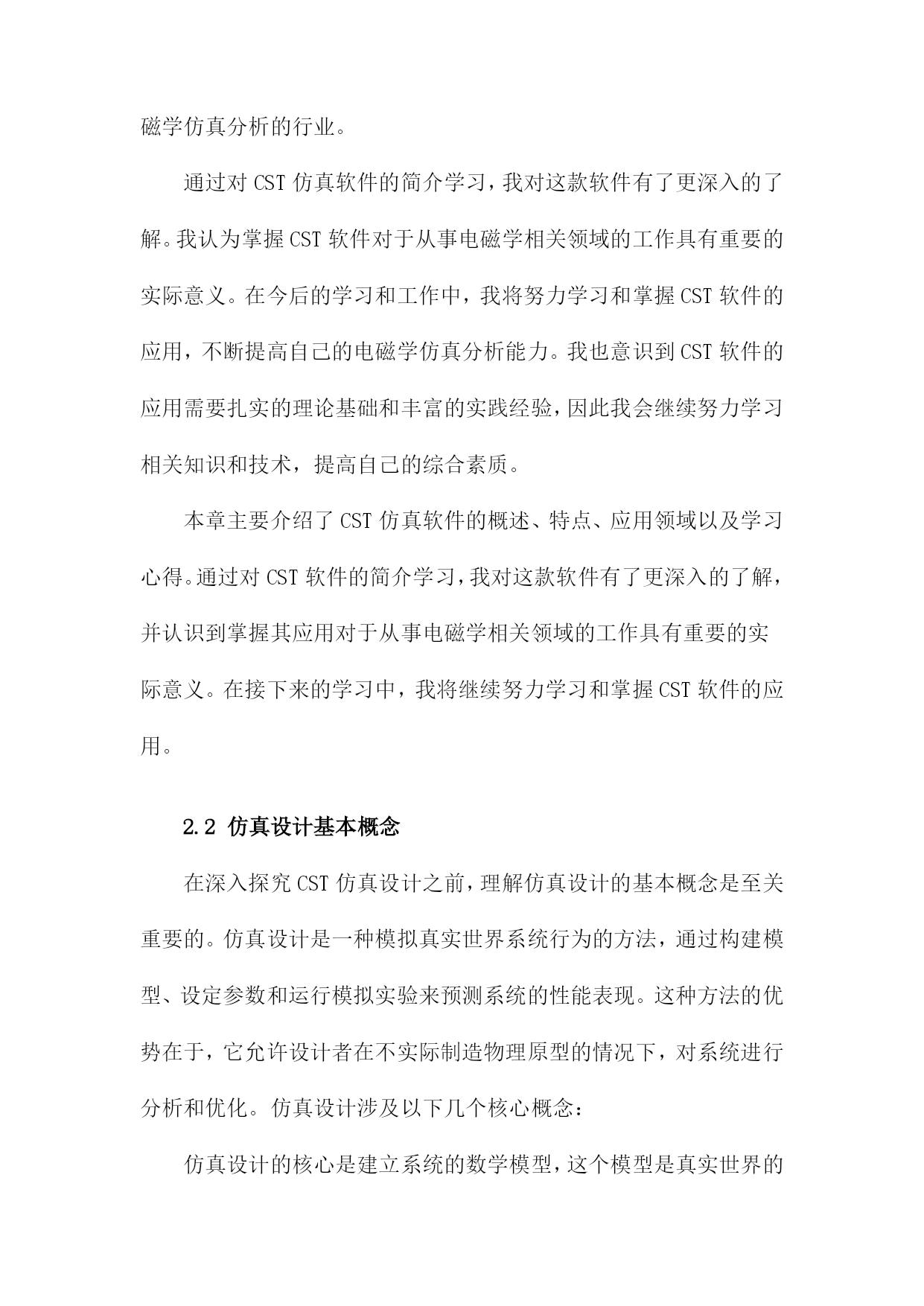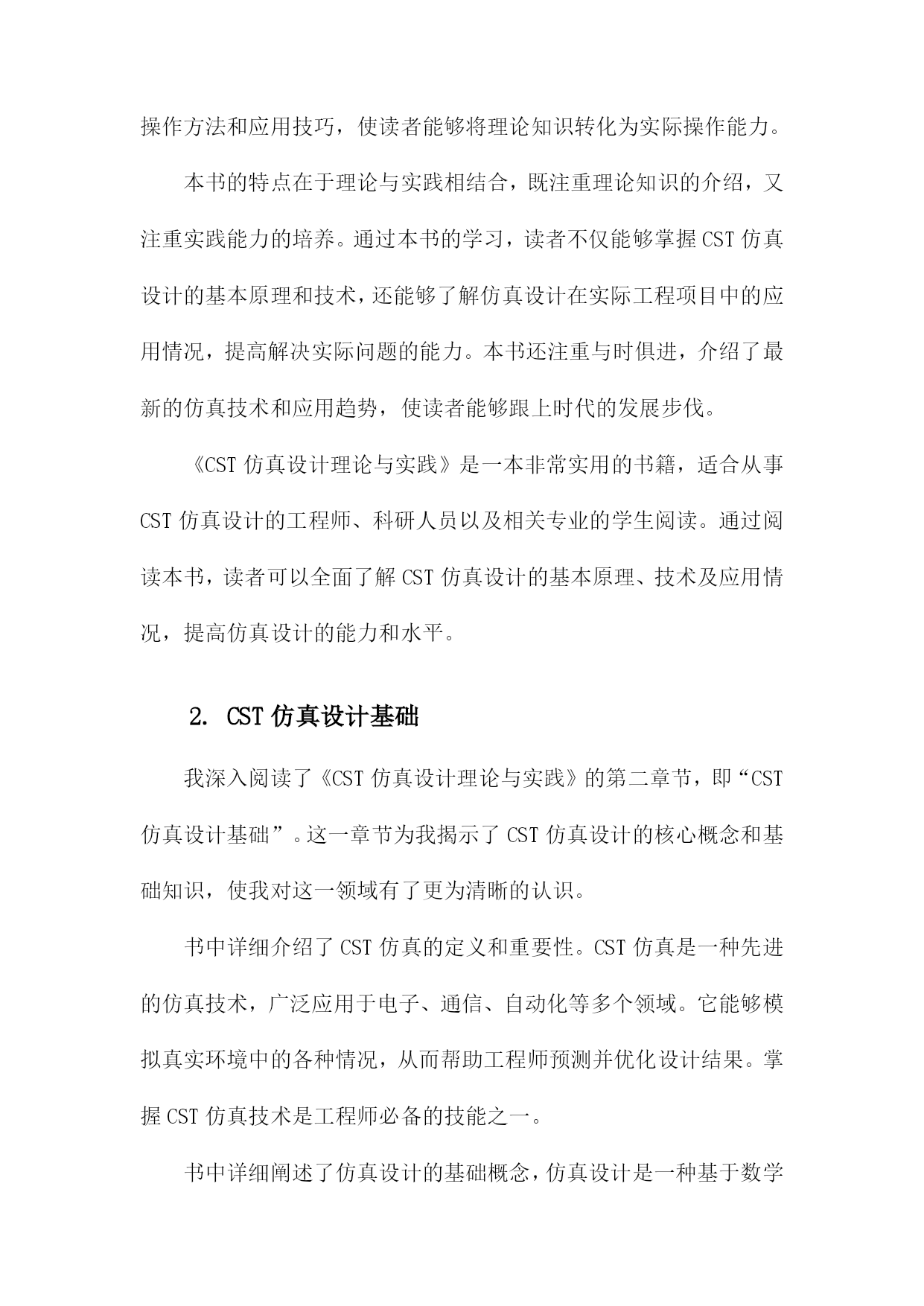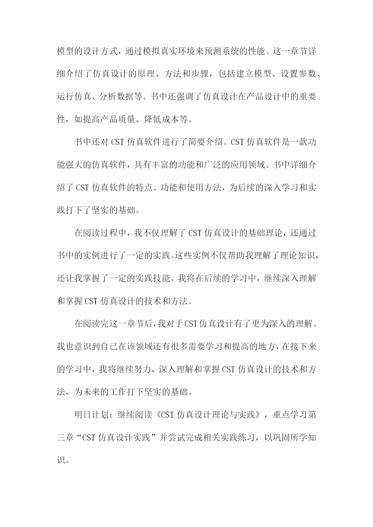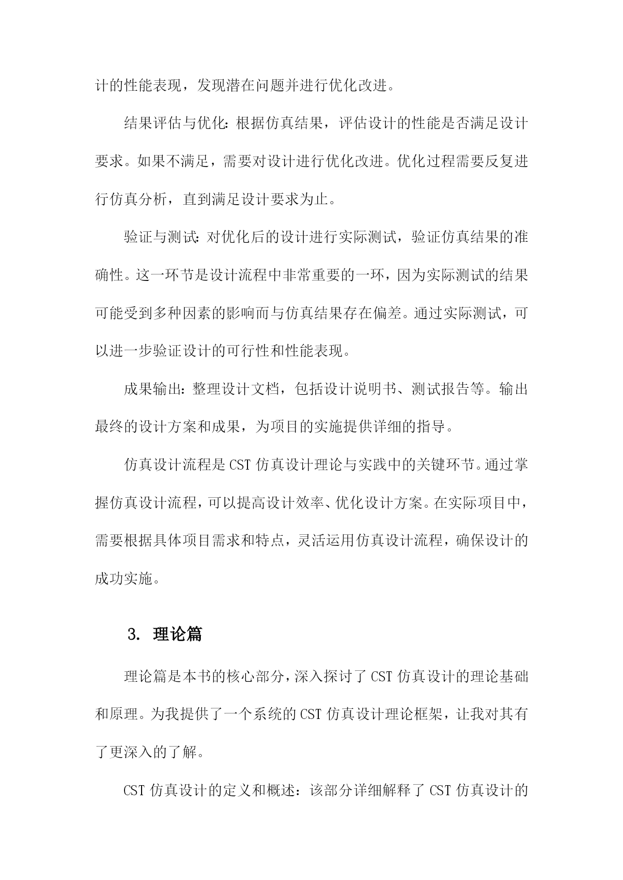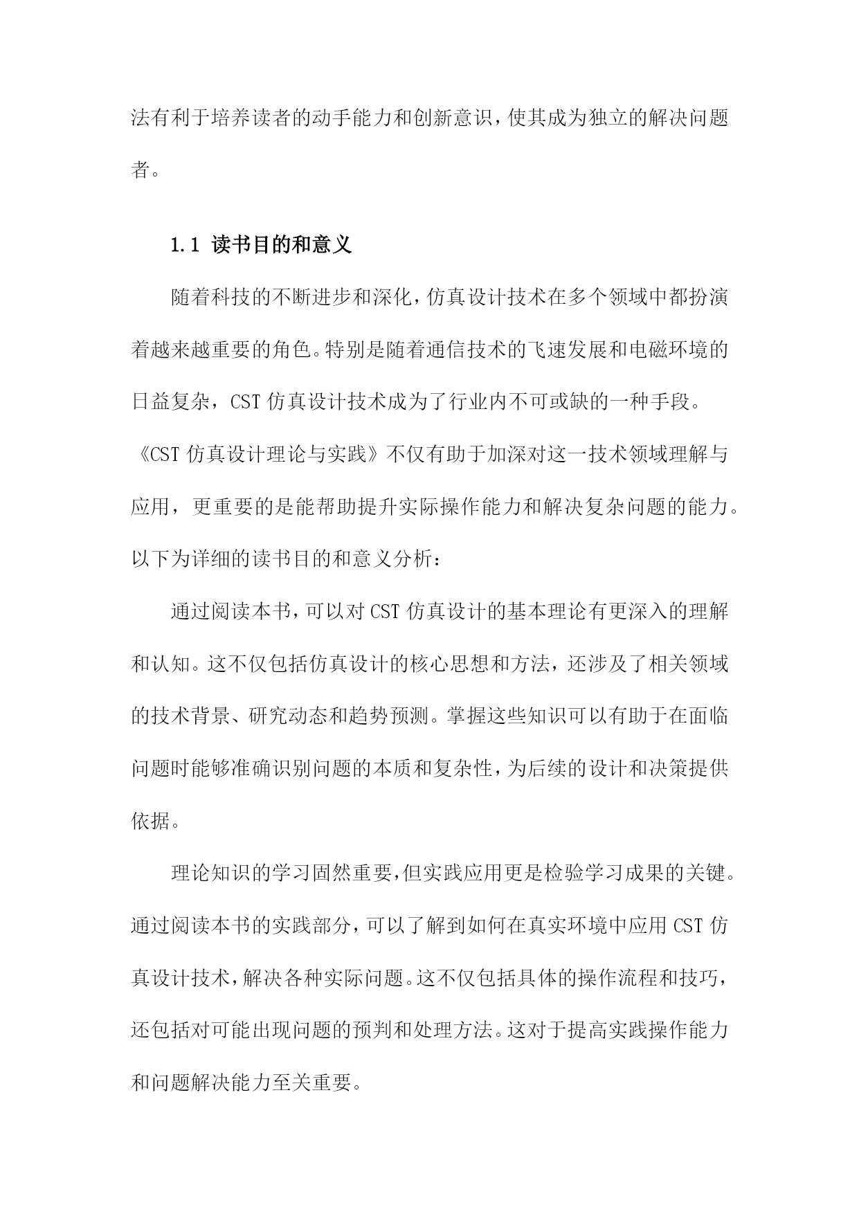 《CST仿真设计理论与实践》读书记录1.内容描述第一部分介绍了CST仿真设计的基本理论框架和基础概念。通过简要概述CST仿真设计的定义、特点和应用领域,为读者提供了对整个领域的宏观视角。这部分内容着重讲解了仿真设计的核心概念以及为什么要使用仿真设计。在此基础上,通过介绍仿真软件的发展与应用,突出了CST仿真设计在现代工程领域中的重要性。对于初次接触该领域的读者来说,这部分内容具有很强的引导性和启发性。第二部分详细阐述了CST仿真设计的实践方法和流程。书中详细介绍了仿真设计的步骤,包括建立模型、设置参数、运行仿真、结果分析和优化设计等。这些内容具有很强的实践性,使读者能够在实际操作中快速掌握CST仿真设计的流程和技巧。书中还结合了大量的案例,让读者能够更加直观地理解仿真设计的具体应用和实际操作方法。这种理论与实践相结合的方式对于提高读者的实践能力和问题解决能力非常有帮助。通过案例分析使读者能够在解决实际问题的过程中灵活运用所学的理论和方法,这对于深入理解CST仿真设计的方法和技巧具有重要意义。另外作者注重提供详细的操作指导和实践建议使读者能够更好地将理论知识转化为实际操作经验。这种注重实践的方法有利于培养读者的动手能力和创新意识,使其成为独立的解决问题者。1.1读书目的和意义随着科技的不断进步和深化,仿真设计技术在多个领域中都扮演着越来越重要的角色。特别是随着通信技术的飞速发展和电磁环境的日益复杂,CST仿真设计技术成为了行业内不可或缺的一种手段。《CST仿真设计理论与实践》不仅有助于加深对这一技术领域理解与应用,更重要的是能帮助提升实际操作能力和解决复杂问题的能力。以下为详细的读书目的和意义分析:通过阅读本书,可以对CST仿真设计的基本理论有更深入的理解和认知。这不仅包括仿真设计的核心思想和方法,还涉及了相关领域的技术背景、研究动态和趋势预测。掌握这些知识可以有助于在面临问题时能够准确识别问题的本质和复杂性,为后续的设计和决策提供依据。理论知识的学习固然重要,但实践应用更是检验学习成果的关键。通过阅读本书的实践部分,可以了解到如何在真实环境中应用CST仿真设计技术,解决各种实际问题。这不仅包括具体的操作流程和技巧,还包括对可能出现问题的预判和处理方法。这对于提高实践操作能力和问题解决能力至关重要。随着科技的不断发展,仿真设计已经成为了很多领域的重要支撑。掌握CST仿真设计技术对于个人职业发展有着重要的推动作用。对于行业来说,熟悉和了解前沿技术可以为企业创造更大的价值,推动行业的整体进步。阅读本书具有重要的行业意义和社会价值。《CST仿真设计理论与实践》的阅读具有重要的意义和目的。不仅可以增强理论知识的学习,提高实践操作能力和问题解决能力,还可以推动个人职业发展和行业发展。对于从事相关领域工作的人员来说,阅读本书是非常有必要的。1.2书籍概述《CST仿真设计理论与实践》是一本关于CST(计算机仿真技术)仿真设计的理论与实践相结合的书籍。本书旨在为读者提供全面的CST仿真设计知识,涵盖了仿真设计的基本概念、原理、技术及应用等方面的内容。通过对本书的学习,读者能够深入理解CST仿真设计的理论基础,掌握仿真设计的基本方法和技巧,并将其应用于实际工程项目中。本书主要分为两大部分:理论部分和实践部分。理论部分重点介绍了CST仿真设计的基本原理、仿真模型构建、仿真过程以及仿真结果的评估与分析等内容,帮助读者建立坚实的理论基础。实践部分则通过具体案例和工程项目,展示了CST仿真设计在实际应用中的具体操作方法和应用技巧,使读者能够将理论知识转化为实际操作能力。本书的特点在于理论与实践相结合,既注重理论知识的介绍,又注重实践能力的培养。通过本书的学习,读者不仅能够掌握CST仿真设计的基本原理和技术,还能够了解仿真设计在实际工程项目中的应用情况,提高解决实际问题的能力。本书还注重与时俱进,介绍了最新的仿真技术和应用趋势,使读者能够跟上时代的发展步伐。《CST仿真设计理论与实践》是一本非常实用的书籍,适合从事CST仿真设计的工程师、科研人员以及相关专业的学生阅读。通过阅读本书,读者可以全面了解CST仿真设计的基本原理、技术及应用情况,提高仿真设计的能力和水平。2.CST仿真设计基础我深入阅读了《CST仿真设计理论与实践》的第二章节,即“CST仿真设计基础”。这一章节为我揭示了CST仿真设计的核心概念和基础知识,使我对这一领域有了更为清晰的认识。书中详细介绍了CST仿真的定义和重要性。CST仿真是一种先进的仿真技术,广泛应用于电子、通信、自动化等多个领域。它能够模拟真实环境中的各种情况,从而帮助工程师预测并优化设计结果。掌握CST仿真技术是工程师必备的技能之一。书中详细阐述了仿真设计的基础概念,仿真设计是一种基于数学