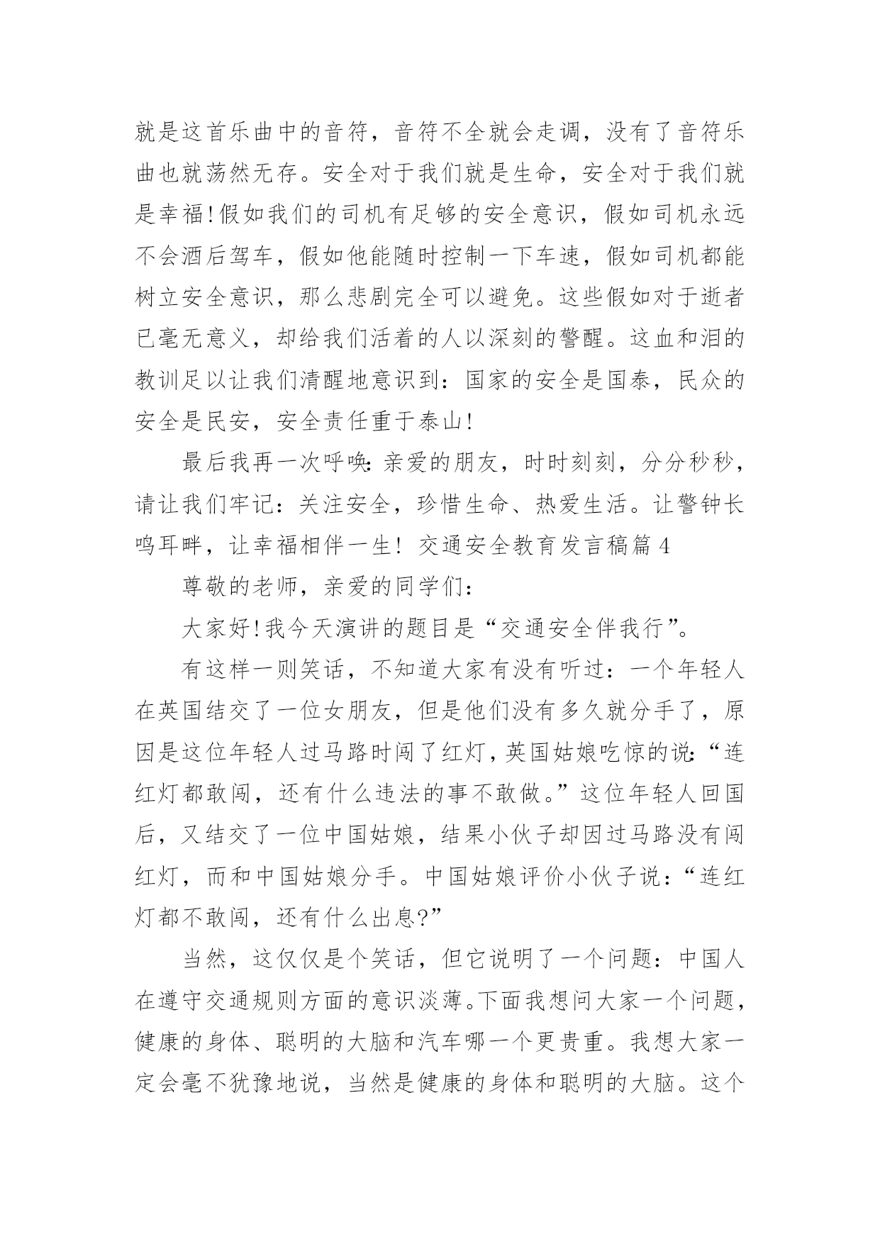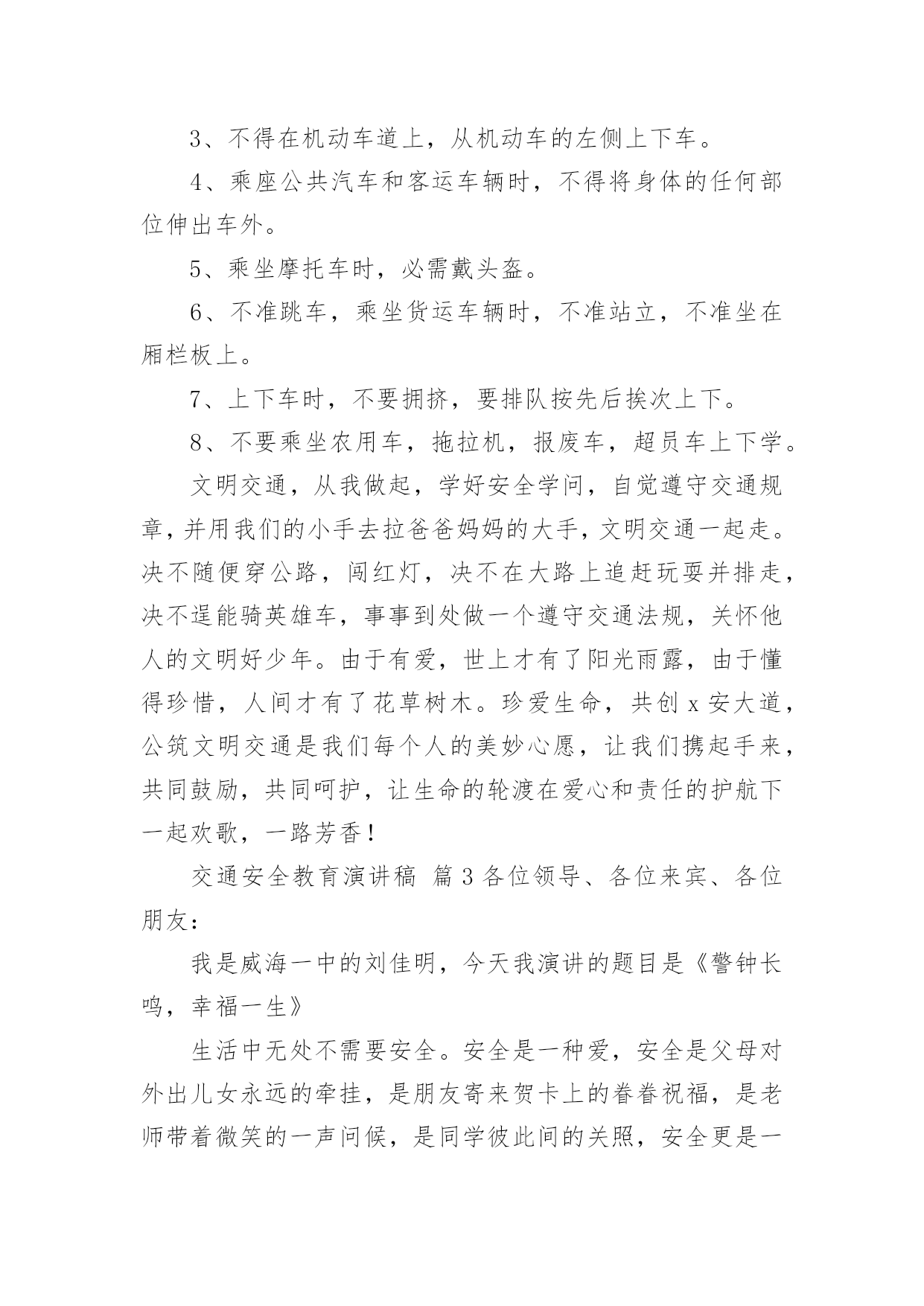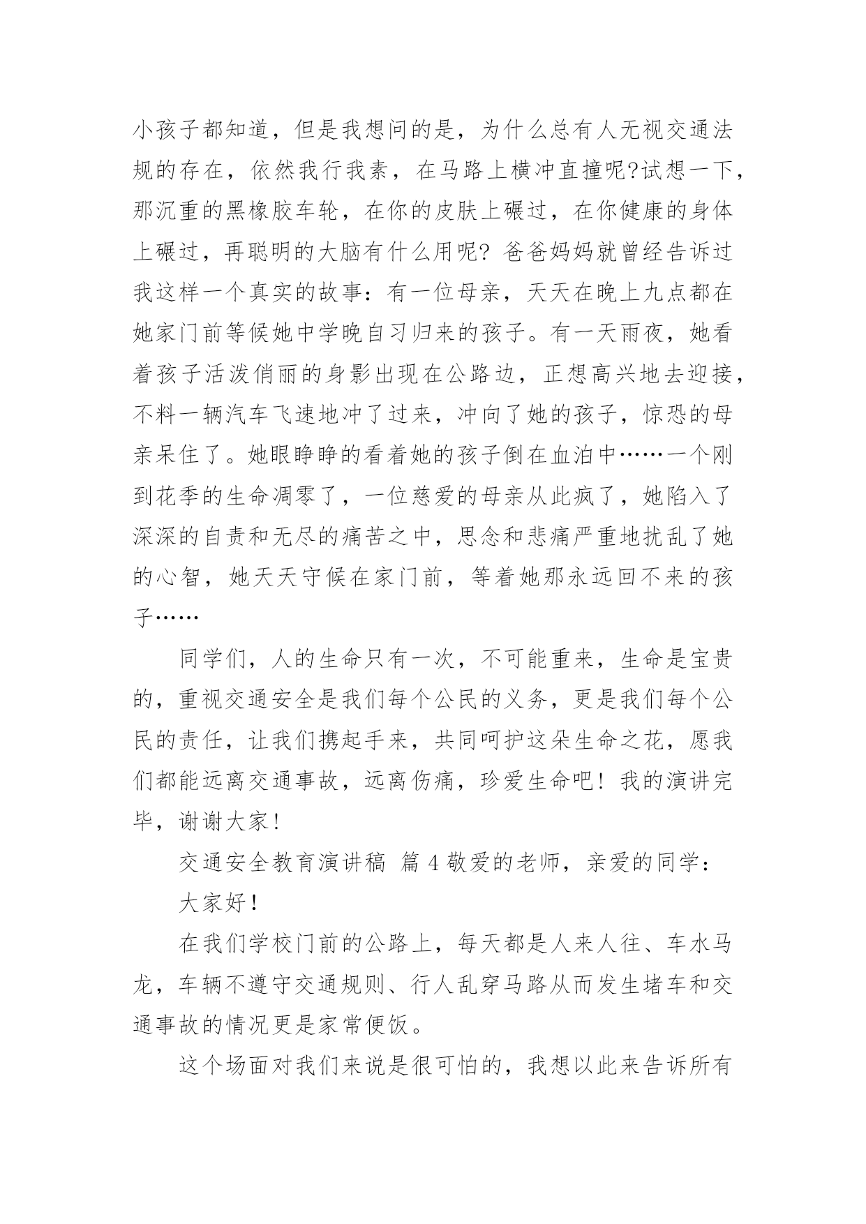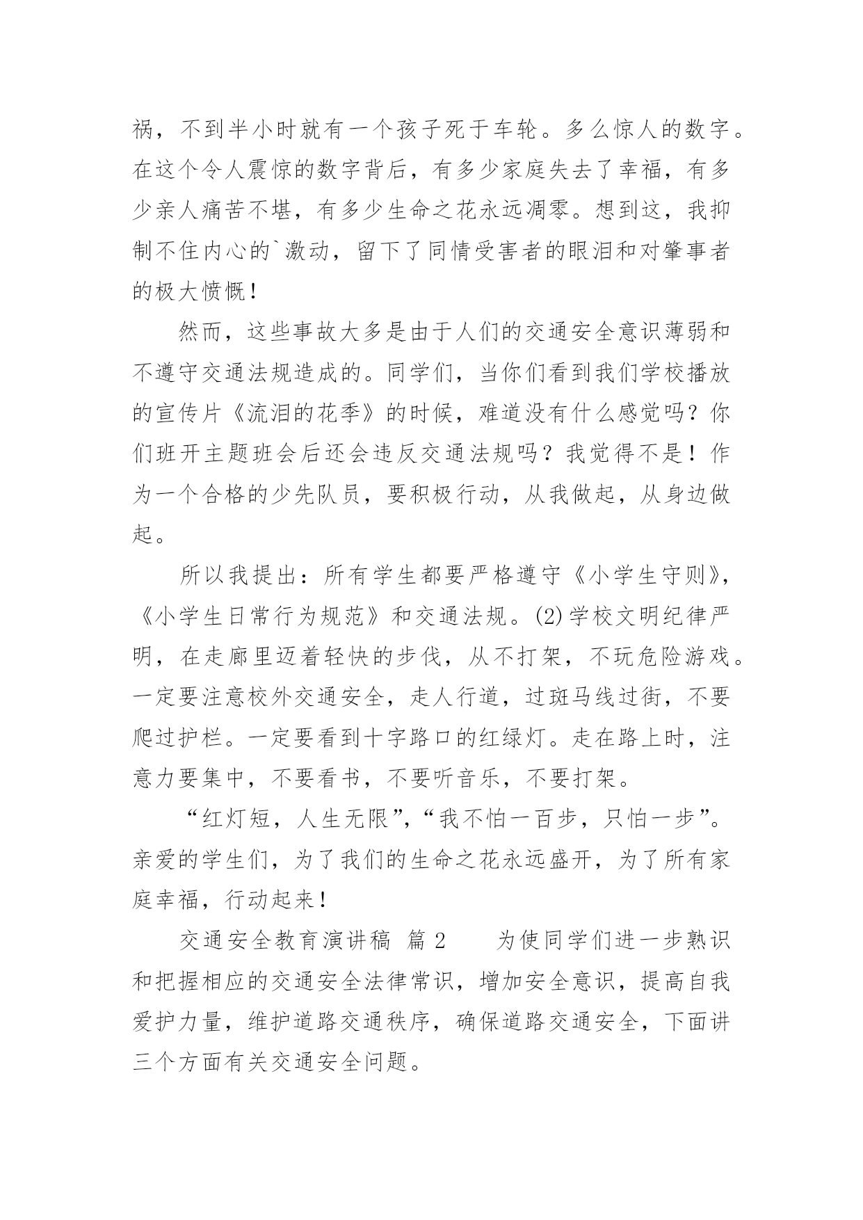 交通安全教育演讲稿交通安全教育演讲稿演讲稿以发表意见,表达观点为主,是为演讲而事先准备好的文稿。在日新月异的现代社会中,演讲稿使用的情况越来越多,演讲稿的注意事项有许多,你确定会写吗?下面是小编为大家收集的交通安全教育演讲稿,欢迎阅读,希望大家能够喜欢。交通安全教育演讲稿篇1亲爱的老师和同学们你们好!我今天演讲的题目是《交通安全伴我行》。安全与每个人的生活息息相关。每当我走在上学放学的路上,看到“车水马龙”、“人来人往”的繁华景象,看到过往的车辆,心里都会感到恐惧。我害怕眼前的车祸场景。你可能看过这样的报道:20xx年11月14日是个阳光明媚的日子。山西省沁源县第二中学数百名师生沿路奔跑。突然,一辆大卡车像疯了的恶魔一样碾过奔跑的队伍。伴随着尖叫声和尖叫声,21条花一样的生命永远离开了这个美丽的世界。许多父母听到这个坏消息,一路喊着孩子的名字来到现场。然而,不管大人们怎么哭,他们永远也不会有反应。这个血淋淋的教训给很多家庭带来痛苦,也拆散了很多幸福的家庭。中国是一个人口众多的国家,人多车多,这使得道路更加拥挤。据统计,中国每年有10多万人死于车祸,其中近2名儿童死亡,居世界首位。平均每五分钟就有一个人死于车祸,不到半小时就有一个孩子死于车轮。多么惊人的数字。在这个令人震惊的数字背后,有多少家庭失去了幸福,有多少亲人痛苦不堪,有多少生命之花永远凋零。想到这,我抑制不住内心的`激动,留下了同情受害者的眼泪和对肇事者的极大愤慨!然而,这些事故大多是由于人们的交通安全意识薄弱和不遵守交通法规造成的。同学们,当你们看到我们学校播放的宣传片《流泪的花季》的时候,难道没有什么感觉吗?你们班开主题班会后还会违反交通法规吗?我觉得不是!作为一个合格的少先队员,要积极行动,从我做起,从身边做起。所以我提出:所有学生都要严格遵守《小学生守则》,《小学生日常行为规范》和交通法规。(2)学校文明纪律严明,在走廊里迈着轻快的步伐,从不打架,不玩危险游戏。一定要注意校外交通安全,走人行道,过斑马线过街,不要爬过护栏。一定要看到十字路口的红绿灯。走在路上时,注意力要集中,不要看书,不要听音乐,不要打架。“红灯短,人生无限”,“我不怕一百步,只怕一步”。亲爱的学生们,为了我们的生命之花永远盛开,为了所有家庭幸福,行动起来!交通安全教育演讲稿篇2为使同学们进一步熟识和把握相应的交通安全法律常识,增加安全意识,提高自我爱护力量,维护道路交通秩序,确保道路交通安全,下面讲三个方面有关交通安全问题。一、怎样走路1、在道路划有机动车道、非机动车道和人行道的道路上,行人应当在人行道内行走,在没有划分上述车道的道路上,行人要靠道路的右侧通行。2、在通过有交通信号灯、斑马线等交通设施的路口时,要按信号指示走人行横道线。3、在通过没有交通设施路口时,要留意过往车辆,在确认安全前方可通过。4、不许在大路上、公路口和机动车道坐卧、停留、打闹、来回奔驰、相互追赶,随便突然横穿公路。5、不许追车、扒车、拦车、向车上抛物。6、不许在道路上使用滑板、旱冰鞋等任何滑行工具。7、不许跨越、倚坐道路隔离设施,或在有隔离设施的路段上逆向行驶。8、上放学时,三人以上,要结队通行。走路时,思想要集中,不能一边走一边玩耍或一边看书,不能三五成群并排行走,更不能追逐车辆玩耍打闹。9、学龄儿童应当由其监护人或者对其负有治理、爱护职责的'人带着方可在道路上通行。10、学生集体外出活动,要有教师的带着,排成两列纵队,在人行道上行走。不要任凭离开队伍。不要在队伍里你推我拉,玩耍打闹。不做阻碍交通安全的事,不在交通拥挤的地方集队、停留,以免影响他人通行。二、怎样骑车1、不满12周岁的儿童,不准在道路上骑自行车,不满16周岁的人不准在道路上驾驶电动自行车,更不许无证驾驶任何机动车。2、在道路划有非机动车道的路段,骑车要走非机动车车道,不许在机动车道和人行道上骑自行车。3、在没划有非机动车道的道路上,要靠路的右侧通行,不许逆向行驶。4、在通过有交通信号的路口时,要按信号指示,下车推车而行,制止闯红灯。5、在通过没有交通信号的道路上,横过公路时,要下车左右眺望,在确认安全下,推车而过。6、骑车转弯前要减速慢行,向后眺望,伸手示意,不准突然猛拐。7、骑车时不得牵引、攀扶车辆或者被其他车辆牵引,不得双手离把或者手中持物。8、不得扶身并行,拉横排骑行,相互追赶或者曲折竞驶。9、不得在道路上骑独轮自行车,或者二人以上骑的自行车。10、必需确保自行车、车闸、车铃等部件齐全有效。三、怎样乘车1、乘坐公共汽车,或者长途汽车时,要在站台或指定地点依次候车,待车停稳后,依次上下。2、不得在机动车道上拦乘机动车。3、不得在机动车道上,从机动车的左侧上下车。4、乘座公共汽车和客运车辆时,不得将身体的任何部位伸出车外。5、乘坐摩托车时,必需