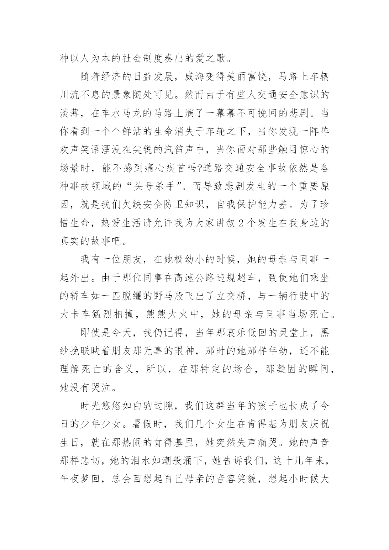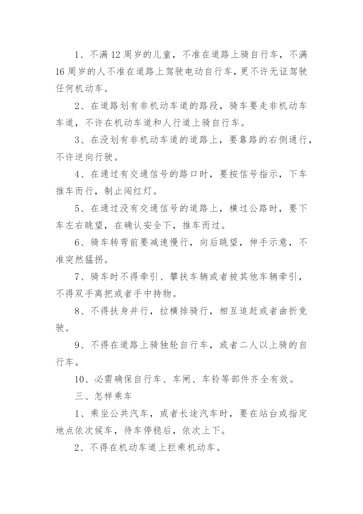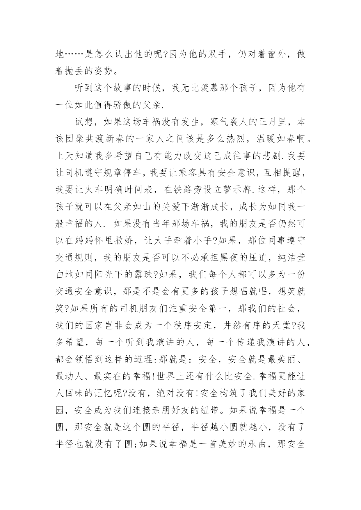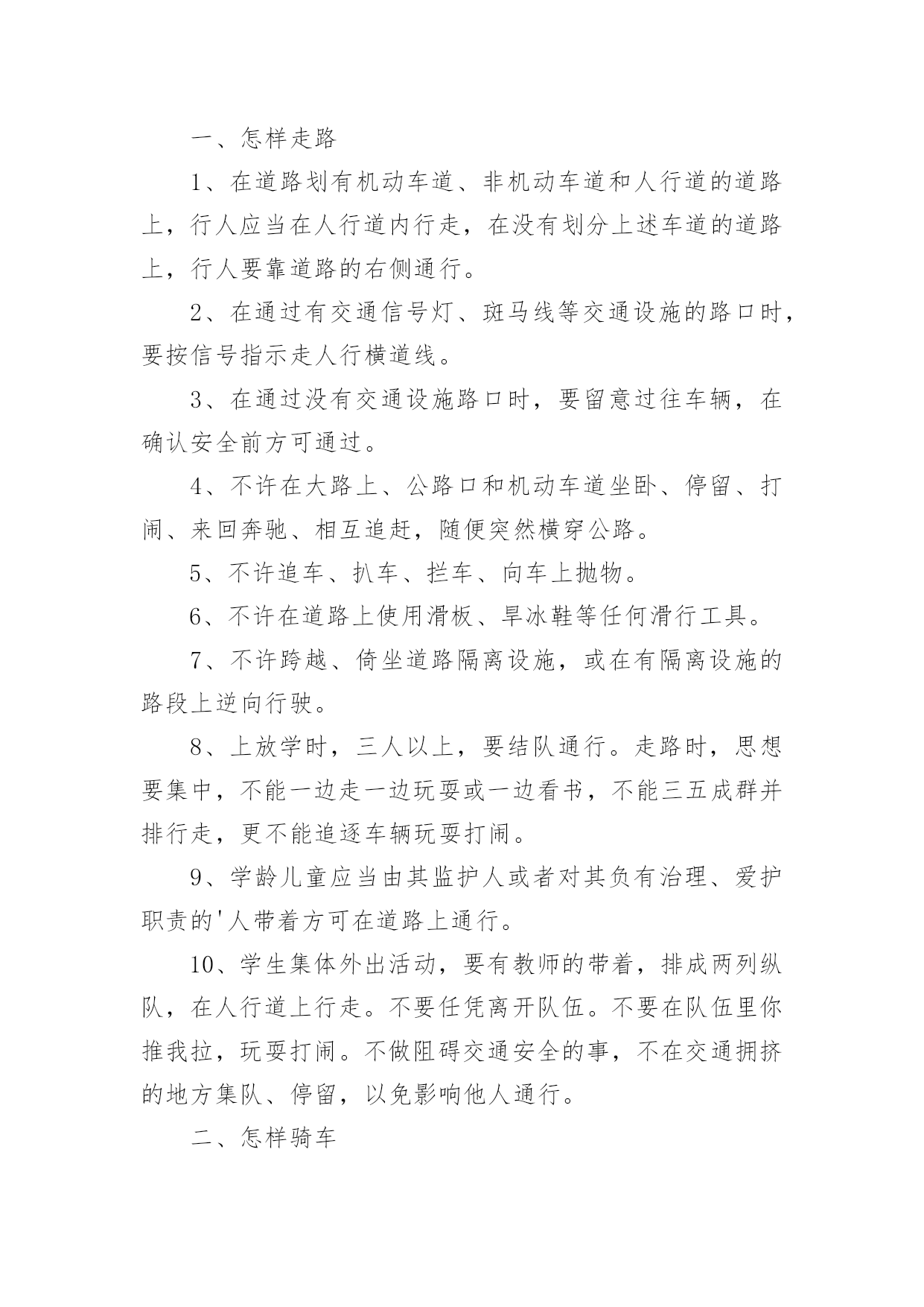 交通安全教育演讲稿交通安全教育演讲稿演讲稿以发表意见,表达观点为主,是为演讲而事先准备好的文稿。在日新月异的现代社会中,演讲稿使用的情况越来越多,演讲稿的注意事项有许多,你确定会写吗?下面是小编为大家收集的交通安全教育演讲稿,欢迎阅读,希望大家能够喜欢。交通安全教育演讲稿篇1亲爱的老师和同学们你们好!我今天演讲的题目是《交通安全伴我行》。安全与每个人的生活息息相关。每当我走在上学放学的路上,看到“车水马龙”、“人来人往”的繁华景象,看到过往的车辆,心里都会感到恐惧。我害怕眼前的车祸场景。你可能看过这样的报道:20xx年11月14日是个阳光明媚的日子。山西省沁源县第二中学数百名师生沿路奔跑。突然,一辆大卡车像疯了的恶魔一样碾过奔跑的队伍。伴随着尖叫声和尖叫声,21条花一样的生命永远离开了这个美丽的世界。许多父母听到这个坏消息,一路喊着孩子的名字来到现场。然而,不管大人们怎么哭,他们永远也不会有反应。这个血淋淋的教训给很多家庭带来痛苦,也拆散了很多幸福的家庭。中国是一个人口众多的国家,人多车多,这使得道路更加拥挤。据统计,中国每年有10多万人死于车祸,其中近2名儿童死亡,居世界首位。平均每五分钟就有一个人死于车祸,不到半小时就有一个孩子死于车轮。多么惊人的数字。在这个令人震惊的数字背后,有多少家庭失去了幸福,有多少亲人痛苦不堪,有多少生命之花永远凋零。想到这,我抑制不住内心的`激动,留下了同情受害者的眼泪和对肇事者的极大愤慨!然而,这些事故大多是由于人们的交通安全意识薄弱和不遵守交通法规造成的。同学们,当你们看到我们学校播放的宣传片《流泪的花季》的时候,难道没有什么感觉吗?你们班开主题班会后还会违反交通法规吗?我觉得不是!作为一个合格的少先队员,要积极行动,从我做起,从身边做起。所以我提出:所有学生都要严格遵守《小学生守则》,《小学生日常行为规范》和交通法规。(2)学校文明纪律严明,在走廊里迈着轻快的步伐,从不打架,不玩危险游戏。一定要注意校外交通安全,走人行道,过斑马线过街,不要爬过护栏。一定要看到十字路口的红绿灯。走在路上时,注意力要集中,不要看书,不要听音乐,不要打架。“红灯短,人生无限”,“我不怕一百步,只怕一步”。亲爱的学生们,为了我们的生命之花永远盛开,为了所有家庭幸福,行动起来!交通安全教育演讲稿篇2为使同学们进一步熟识和把握相应的交通安全法律常识,增加安全意识,提高自我爱护力量,维护道路交通秩序,确保道路交通安全,下面讲三个方面有关交通安全问题。一、怎样走路1、在道路划有机动车道、非机动车道和人行道的道路上,行人应当在人行道内行走,在没有划分上述车道的道路上,行人要靠道路的右侧通行。2、在通过有交通信号灯、斑马线等交通设施的路口时,要按信号指示走人行横道线。3、在通过没有交通设施路口时,要留意过往车辆,在确认安全前方可通过。4、不许在大路上、公路口和机动车道坐卧、停留、打闹、来回奔驰、相互追赶,随便突然横穿公路。5、不许追车、扒车、拦车、向车上抛物。6、不许在道路上使用滑板、旱冰鞋等任何滑行工具。7、不许跨越、倚坐道路隔离设施,或在有隔离设施的路段上逆向行驶。8、上放学时,三人以上,要结队通行。走路时,思想要集中,不能一边走一边玩耍或一边看书,不能三五成群并排行走,更不能追逐车辆玩耍打闹。9、学龄儿童应当由其监护人或者对其负有治理、爱护职责的'人带着方可在道路上通行。10、学生集体外出活动,要有教师的带着,排成两列纵队,在人行道上行走。不要任凭离开队伍。不要在队伍里你推我拉,玩耍打闹。不做阻碍交通安全的事,不在交通拥挤的地方集队、停留,以免影响他人通行。二、怎样骑车1、不满12周岁的儿童,不准在道路上骑自行车,不满16周岁的人不准在道路上驾驶电动自行车,更不许无证驾驶任何机动车。2、在道路划有非机动车道的路段,骑车要走非机动车车道,不许在机动车道和人行道上骑自行车。3、在没划有非机动车道的道路上,要靠路的右侧通行,不许逆向行驶。4、在通过有交通信号的路口时,要按信号指示,下车推车而行,制止闯红灯。5、在通过没有交通信号的道路上,横过公路时,要下车左右眺望,在确认安全下,推车而过。6、骑车转弯前要减速慢行,向后眺望,伸手示意,不准突然猛拐。7、骑车时不得牵引、攀扶车辆或者被其他车辆牵引,不得双手离把或者手中持物。8、不得扶身并行,拉横排骑行,相互追赶或者曲折竞驶。9、不得在道路上骑独轮自行车,或者二人以上骑的自行车。10、必需确保自行车、车闸、车铃等部件齐全有效。三、怎样乘车1、乘坐公共汽车,或者长途汽车时,要在站台或指定地点依次候车,待车停稳后,依次上下。2、不得在机动车道上拦乘机动车。3、不得在机动车道上,从机动车的左侧上下车。4、乘座公共汽车和客运车辆时,不得将身体的任何部位伸出车外。5、乘坐摩托车时,必需