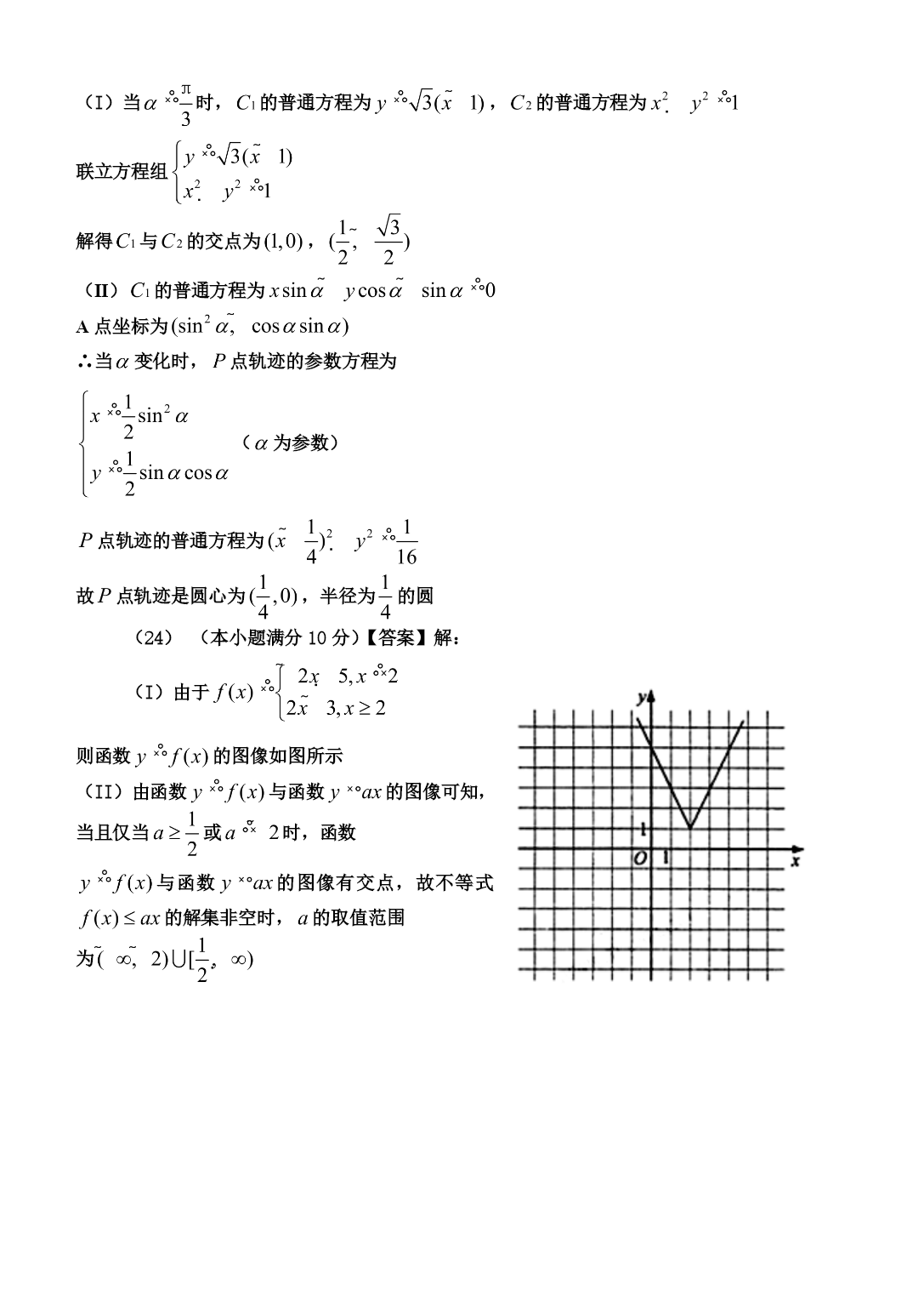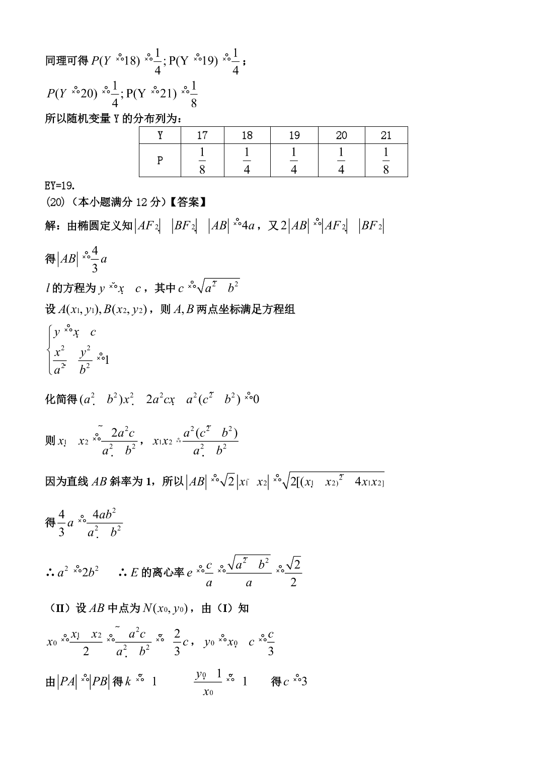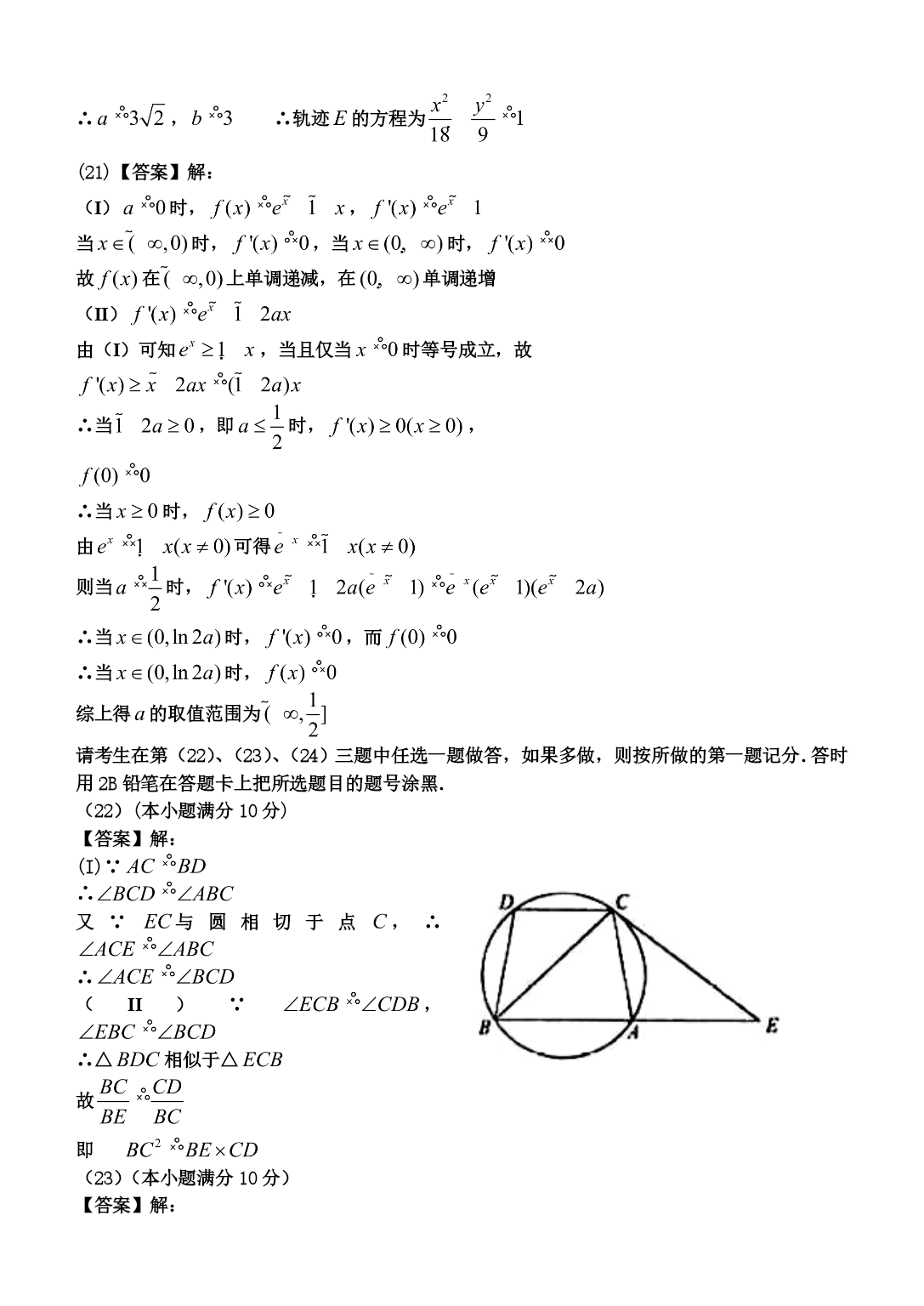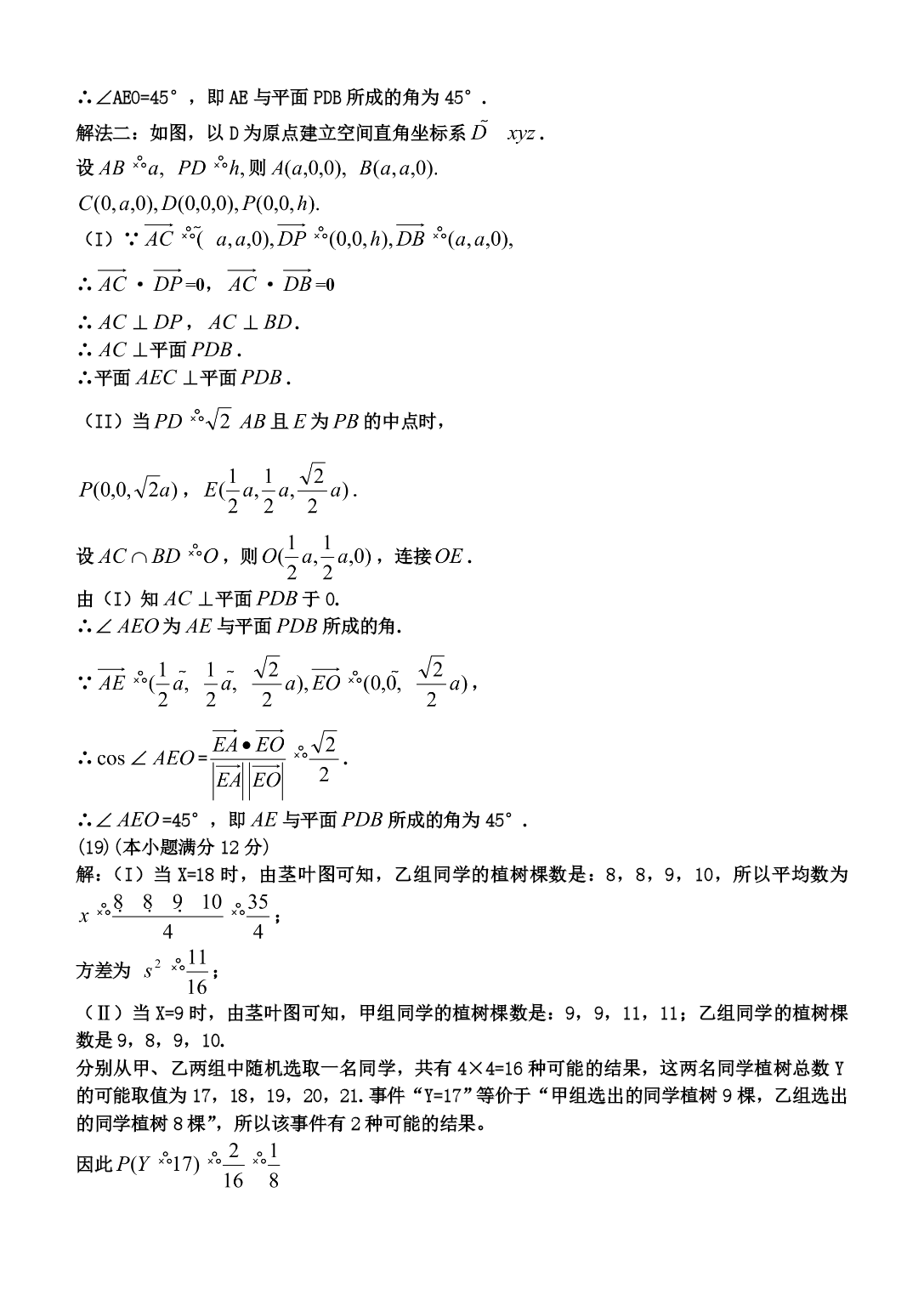 PAGE第I卷选择题(1)D(2)A(3)A(4)C(5)C(6)B(7)B(8)B(9)A(10)B(11)C(12)B第Ⅱ卷二、填空题(13)(14)三棱柱,三棱锥,圆锥(15)(16)60°三、解答题(17)(本小题满分l2分)【答案】解:(I)由已知,当时,而所以数列的通项公式为(II)由可知则,(18)(本小题满分12分)解法一:(I)∵四边形ABCD是正方形,∴AC⊥BD.∵PD⊥底面ABCD,∴AC⊥BD.∴AC⊥平面PDB.∴平面AEC⊥平面PDB.(II)设AC,连接OE.由(I)知AC⊥平面PDB于O.∴∠AEO为AE与平面PDB所成的角.∵O,E分别为DB,PB的中点,∴OE∥PD,.又∵PD⊥底面ABCD,∴OE⊥底面ABCD,OE⊥AO.在Rt△AOE中,,∴∠AEO=45°,即AE与平面PDB所成的角为45°.解法二:如图,以D为原点建立空间直角坐标系.设则(I)∵∴·=0,·=0∴⊥,⊥.∴⊥平面.∴平面⊥平面.(II)当且为的中点时,,.设,则,连接.由(I)知⊥平面于O.∴∠为与平面所成的角.∵,∴∠=.∴∠=45°,即与平面所成的角为45°.(19)(本小题满分12分)解:(I)当X=18时,由茎叶图可知,乙组同学的植树棵数是:8,8,9,10,所以平均数为;方差为;(Ⅱ)当X=9时,由茎叶图可知,甲组同学的植树棵数是:9,9,11,11;乙组同学的植树棵数是9,8,9,10.分别从甲、乙两组中随机选取一名同学,共有4×4=16种可能的结果,这两名同学植树总数Y的可能取值为17,18,19,20,21.事件“Y=17”等价于“甲组选出的同学植树9棵,乙组选出的同学植树8棵”,所以该事件有2种可能的结果。因此同理可得;所以随机变量Y的分布列为:Y1718192021PEY=19.(20)(本小题满分12分)【答案】解:由椭圆定义知,又得的方程为,其中设,则两点坐标满足方程组化简得则,因为直线斜率为1,所以得∴∴的离心率(II)设中点为,由(I)知,由得得∴,∴轨迹的方程为(21)【答案】解:(I)时,,当时,,当时,故在上单调递减,在单调递增(II)由(I)可知,当且仅当时等号成立,故∴当,即时,,∴当时,由可得则当时,∴当时,,而∴当时,综上得的取值范围为请考生在第(22)、(23)、(24)三题中任选一题做答,如果多做,则按所做的第一题记分.答时用2B铅笔在答题卡上把所选题目的题号涂黑.(22)(本小题满分10分)【答案】解:(I)∵又∵与圆相切于点,∴∴(II)∵,∴△相似于△故即(23)(本小题满分10分)【答案】解:(I)当时,的普通方程为,的普通方程为联立方程组解得与的交点为,(II)的普通方程为A点坐标为∴当变化时,点轨迹的参数方程为(为参数)点轨迹的普通方程为故点轨迹是圆心为,半径为的圆(24)(本小题满分10分)【答案】解:(I)由于则函数的图像如图所示(II)由函数与函数的图像可知,当且仅当或时,函数与函数的图像有交点,故不等式的解集非空时,的取值范围为