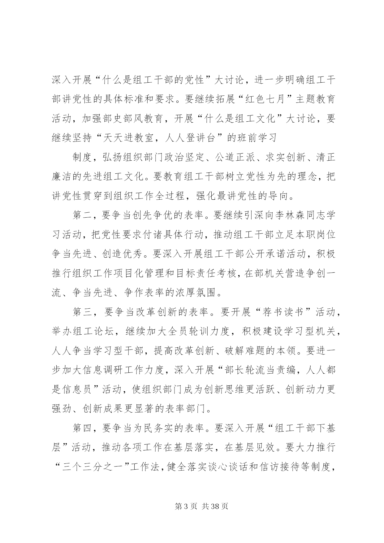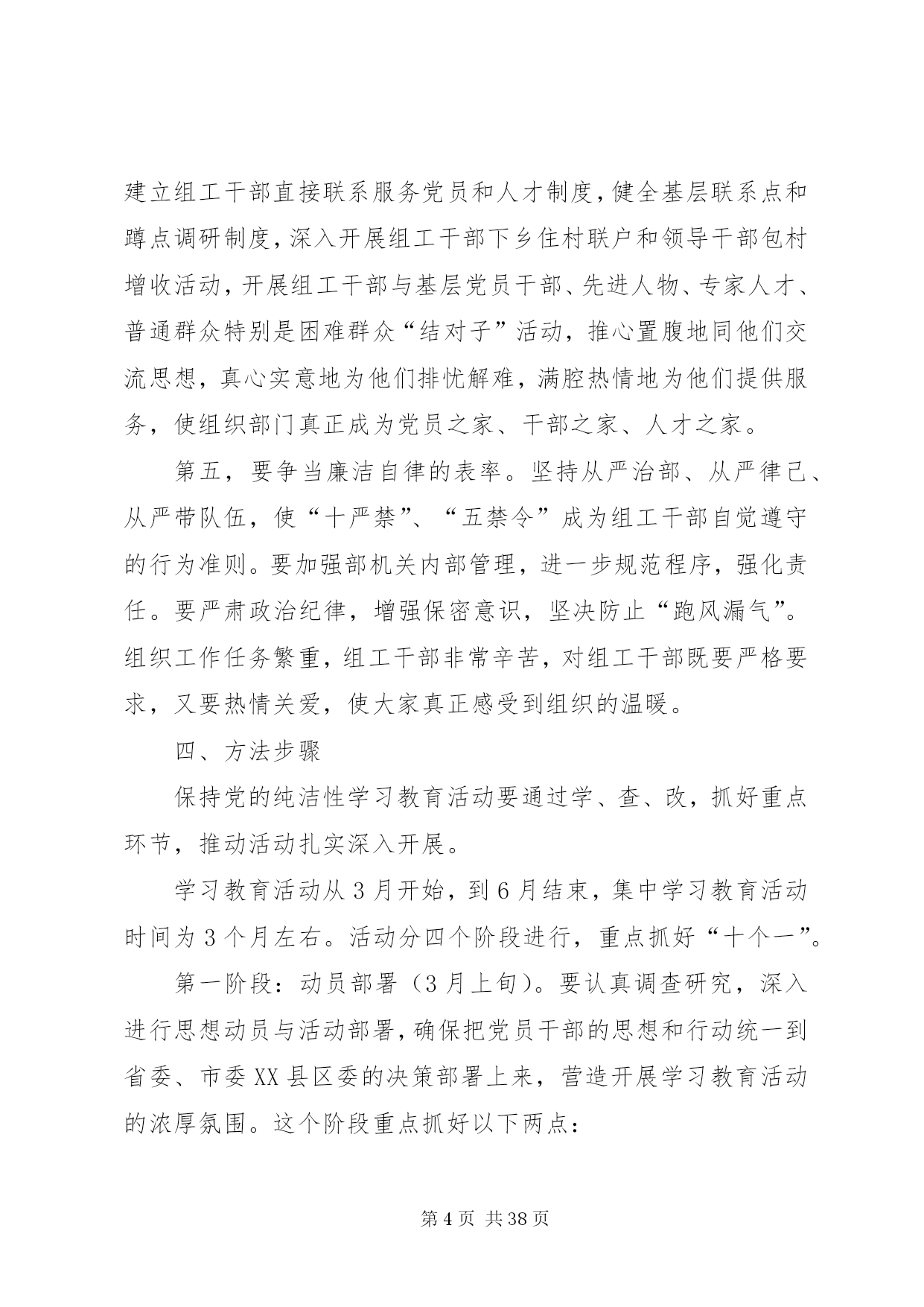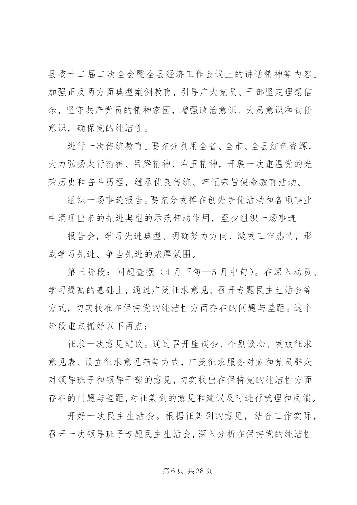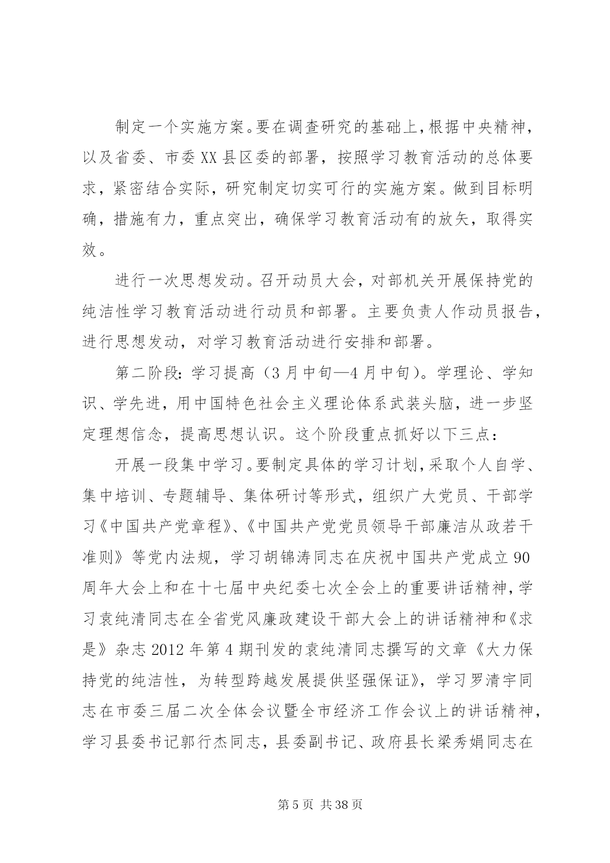 第PAGE\*Arabic\*MERGEFORMAT38页共NUMPAGES\*MERGEFORMAT38页纯洁性活动方案关于开展保持党的纯洁性学习教育活动的实施方案为全面贯彻落实胡锦涛总书记在十七届中央纪委七次全会上的重要讲话精神,进一步引深和扎实推进创先争优活动,迎接党的十八大胜利召开,按照x发(2012)6号《中共xxx委印发〈关于开展保持党的纯洁性学习教育活动的实施方案〉的通知》的决定,在部机关开展保持党的纯洁性学习教育活动。现提出如下实施方案。一、重要意义保持党的纯洁性是马克思主义政党的本质要求和我们党的优良传统。永葆党的纯洁性是我们党长期实践和历史经验的总结。经受“四个考验”,化解“四种危险”,最根本的就是要进一步加强党的自身建设,始终保持马克思主义政党的先进性和纯洁性。胡锦涛总书记在十七届中央纪委七次全体会议上明确强调,我们党作为马克思主义执政党,只有不断保持纯洁性,才能提高在群众中的威信,才能赢得人民信赖和拥护,才能不断巩固执政基础,才能实现党和国家兴旺发达、长治久安。当前,正处于实施“十二五”规划的关键时期,要实现转型跨越目标,必须从党的纯洁性抓起。每位党员干部必须站在战略和全局的高度,充分认识保持党的纯洁性的极端重要性和紧迫性,不断增强党的意识、政治意识、危机意识、责任意识,切实做好保持党的纯洁性的各项工作,为加快推进我县转型跨越发展提供坚强组织保证。二、指导思想以邓小平理论和“三个代表”重要思想为指导,深入贯彻落实科学发展观,认真学习贯彻胡锦涛总书记在十七届中央纪委七次全会上的重要讲话精神,坚持党要管党、从严治党,大力保持党员干部思想纯洁、队伍纯洁、作风纯洁和清正廉洁,以应对精神懈怠的危险、能力不足的危险、脱离群众的危险、消极腐败的危险,不断增强自我净化、自我完善、自我革新、自我提高能力,始终坚持党的性质和宗旨,永葆共产党人政治本色,不断开创转型跨越发展新局面,以优异成绩迎接党的十八大胜利召开。三、目标要求保持党的纯洁性学习教育活动重在思想提高,要坚持以思想教育、正面教育、自我教育为主的原则,把深入学习、提高认识贯穿始终,把边学边改、解决问题贯穿始终。每位组工干部要带头学习提高、带头查找问题、带头开展批评与自我批评,争做引领发展的带头人、保持党的纯洁性的示范者。具体要在以下几方面做出表率。第一,要争当党性坚强的表率。能力不足可以逐步提高,但党性不强绝对不能从事组织工作。要加强对组工干部的党性教育,深入开展“什么是组工干部的党性”大讨论,进一步明确组工干部讲党性的具体标准和要求。要继续拓展“红色七月”主题教育活动,加强部史部风教育,开展“什么是组工文化”大讨论,要继续坚持“天天进教室,人人登讲台”的班前学习制度,弘扬组织部门政治坚定、公道正派、求实创新、清正廉洁的先进组工文化。要教育组工干部树立党性为先的理念,把讲党性贯穿到组织工作全过程,强化最讲党性的导向。第二,要争当创先争优的表率。要继续引深向李林森同志学习活动,把党性要求付诸具体行动,推动组工干部立足本职岗位争当先进、创造优秀。要深入开展组工干部公开承诺活动,积极推行组织工作项目化管理和目标责任考核,在部机关营造争创一流、争当先进、争作表率的浓厚氛围。第三,要争当改革创新的表率。要开展“荐书读书”活动,举办组工论坛,继续加大全员轮训力度,积极建设学习型机关,人人争当学习型干部,提高改革创新、破解难题的本领。要进一步加大信息调研工作力度,深入开展“部长轮流当责编,人人都是信息员”活动,使组织部门成为创新思维更活跃、创新动力更强劲、创新成果更显著的表率部门。第四,要争当为民务实的表率。要深入开展“组工干部下基层”活动,推动各项工作在基层落实,在基层见效。要大力推行“三个三分之一”工作法,健全落实谈心谈话和信访接待等制度,建立组工干部直接联系服务党员和人才制度,健全基层联系点和蹲点调研制度,深入开展组工干部下乡住村联户和领导干部包村增收活动,开展组工干部与基层党员干部、先进人物、专家人才、普通群众特别是困难群众“结对子”活动,推心置腹地同他们交流思想,真心实意地为他们排忧解难,满腔热情地为他们提供服务,使组织部门真正成为党员之家、干部之家、人才之家。第五,要争当廉洁自律的表率。坚持从严治部、从严律己、从严带队伍,使“十严禁”、“五禁令”成为组工干部自觉遵守的行为准则。要加强部机关内部管理,进一步规范程序,强化责任。要严肃政治纪律,增强保密意识,坚决防止“跑风漏气”。组织工作任务繁重,组工干部非常辛苦,对组工干部既要严格要求,又要热情关爱,使大家真正感受到组织的温暖。四、方法步骤保持党的纯洁性学习教育活动要通过学、查、改,抓好重点环节,推动活动扎实深入开展。学习教育活动从3月开始,到6月结束,集中学习教育活动时间为3个月左右。活动分