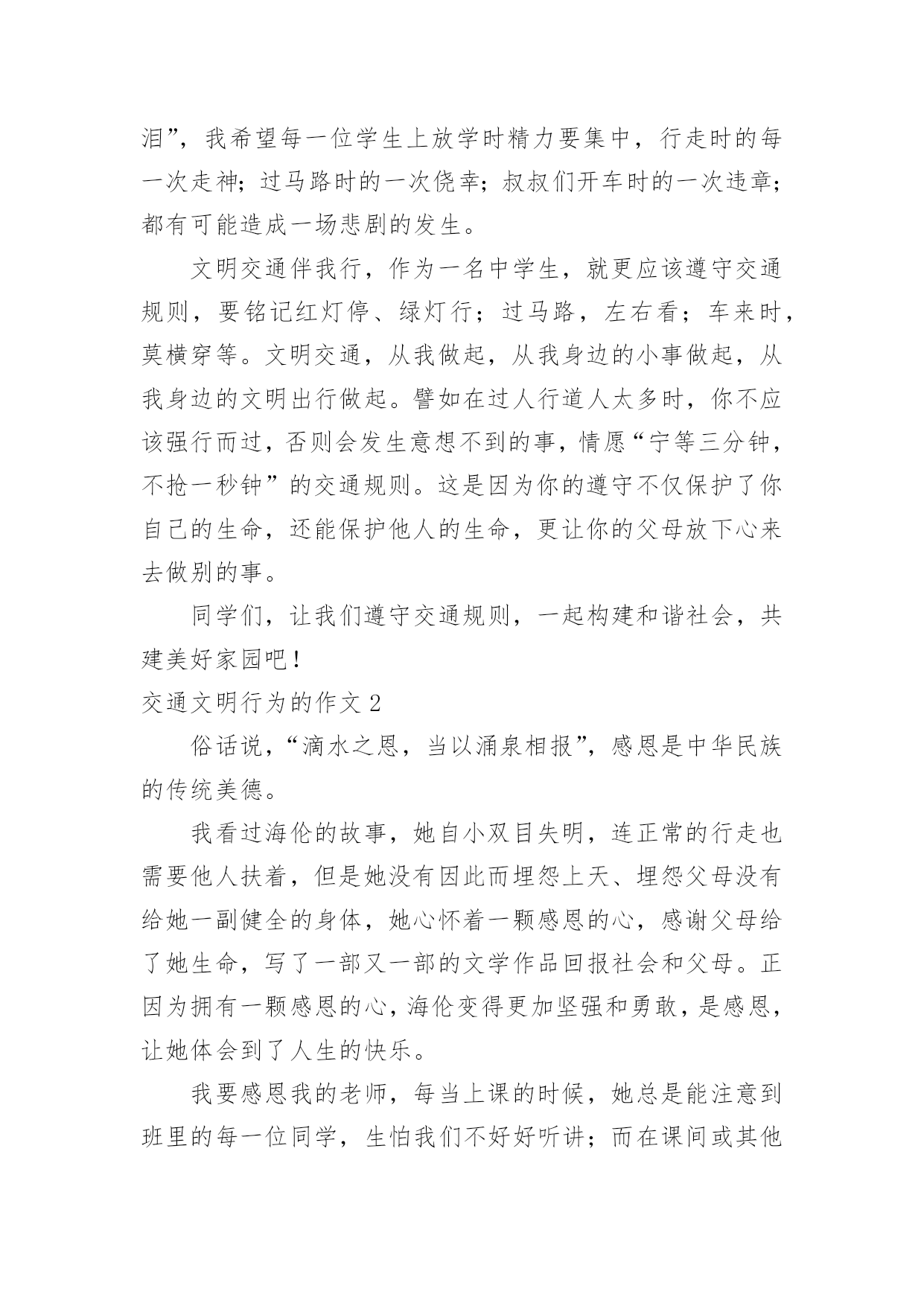 交通文明行为的作文交通文明行为的作文在现实生活或工作学习中,大家最不陌生的就是作文了吧,作文要求篇章结构完整,一定要避免无结尾作文的出现。为了让您在写作文时更加简单方便,以下是小编收集整理的交通文明行为的作文,欢迎大家借鉴与参考,希望对大家有所帮助。交通文明行为的作文1“文明交通,人人有责!”对于交通规则,人人都不陌生,可是对于遵守交通规则,又有多少的人做得到呢?仅仅每年因为不遵守交通规则而出交通事故的事不计其数。只有遵守交通规则,才不会有哪些悲剧发生。文明交通伴我行,只要你踏出了家门一步,你就应该遵守交通规则。因为人们不遵守交通规则,导致了那接二连三惨不忍睹的交通事故。例如司机酒后驾车,以为自己只喝了一点酒,不碍事,可他恰恰就小看了这一点酒。在20xx年1月30日,就因为司机酒后驾车,结果就发生了惨不忍睹的悲剧。那天肇事者朱某参加完同学聚会后,准备骑摩托车回家,再加上有一点疲劳,在行驶的过程中,结果和对面相向而行的.申某相撞,当场毕命。两个活生生的生命就在那一瞬间的时间消失了。让两个家庭同时失去了亲人,使活着的亲人痛苦不堪。正如一句话所说“司机一杯酒,亲人两行泪”,我希望每一位学生上放学时精力要集中,行走时的每一次走神;过马路时的一次侥幸;叔叔们开车时的一次违章;都有可能造成一场悲剧的发生。文明交通伴我行,作为一名中学生,就更应该遵守交通规则,要铭记红灯停、绿灯行;过马路,左右看;车来时,莫横穿等。文明交通,从我做起,从我身边的小事做起,从我身边的文明出行做起。譬如在过人行道人太多时,你不应该强行而过,否则会发生意想不到的事,情愿“宁等三分钟,不抢一秒钟”的交通规则。这是因为你的遵守不仅保护了你自己的生命,还能保护他人的生命,更让你的父母放下心来去做别的事。同学们,让我们遵守交通规则,一起构建和谐社会,共建美好家园吧!交通文明行为的作文2俗话说,“滴水之恩,当以涌泉相报”,感恩是中华民族的传统美德。我看过海伦的故事,她自小双目失明,连正常的行走也需要他人扶着,但是她没有因此而埋怨上天、埋怨父母没有给她一副健全的身体,她心怀着一颗感恩的心,感谢父母给了她生命,写了一部又一部的文学作品回报社会和父母。正因为拥有一颗感恩的心,海伦变得更加坚强和勇敢,是感恩,让她体会到了人生的快乐。我要感恩我的老师,每当上课的时候,她总是能注意到班里的每一位同学,生怕我们不好好听讲;而在课间或其他课时,她总是在不远处看着我们,时刻操心着我们的安全;老师每一天,都在为我们操劳。今年这个春节我们最应该感恩的是我们白衣天使的无私奉献。今年春节来势凶猛的新冠病毒席卷了祖国大地,威胁着我们的健康,随着我们的医学专家钟南山爷爷一声令下,给全国按下了暂停键,只有我们的白衣战士逆向而行,冲到病毒的`最前线,打响了一场没有硝烟的战争,保卫着人民的生命安全。感恩,充实着我们的生活;感恩,塑造着我们的心灵;感恩,使世界变得美丽;感恩,使我们拥有爱心。让我们怀带一颗感恩的心,去感谢生活中的点点滴滴吧!