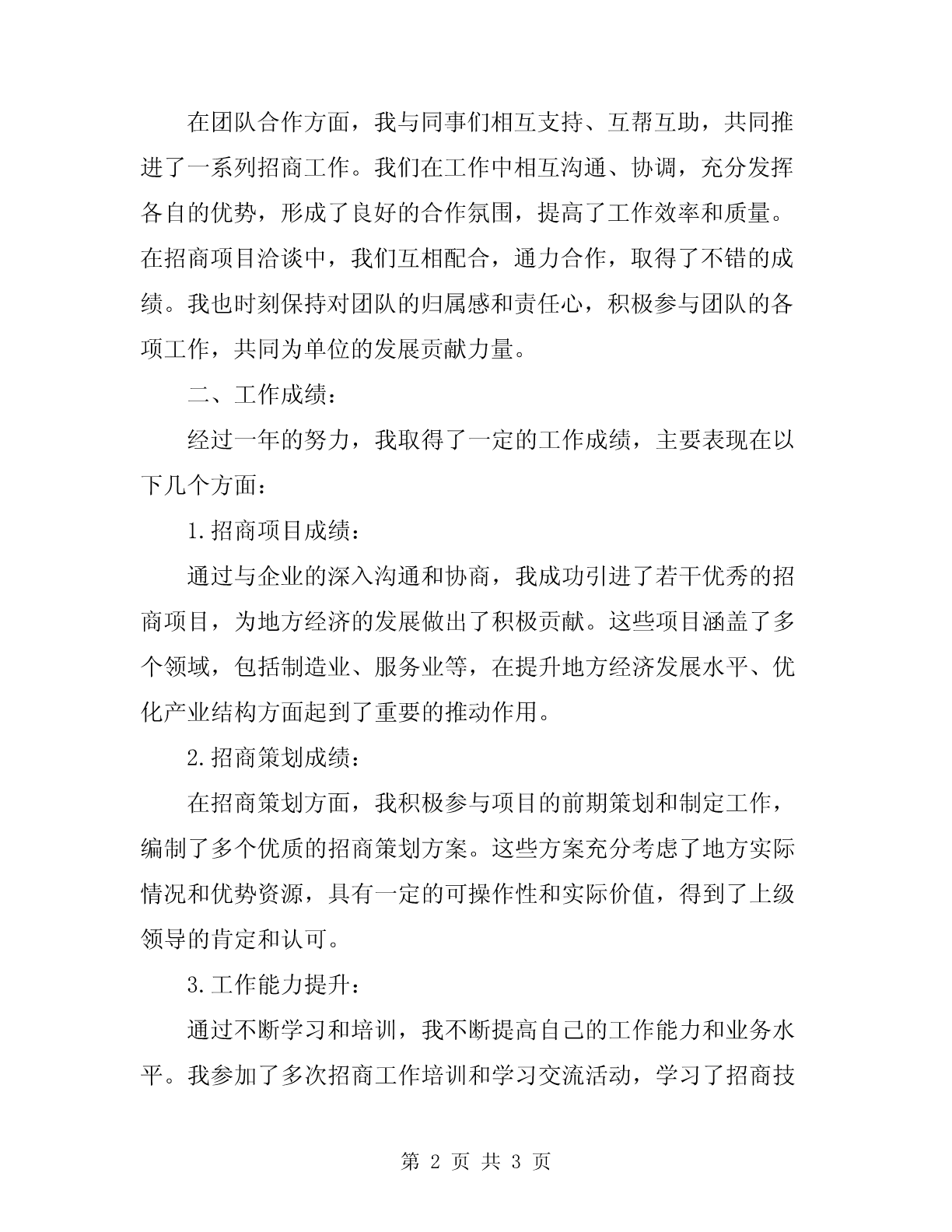 ____年公务员年度考核个人总结招商尊敬的领导、各位考官:您好!我是您单位____年度公务员考核中的一名考生,我衷心感谢各位考官能够给我这样一个宝贵的机会,让我有机会参加考试并通过个人总结展示自己的工作情况和成绩。在此,我将结合自己的实际工作情况和个人经验,就过去的一年中的工作情况、工作成绩以及自我评价进行总结和反思。一、工作情况:____年,作为一名公务员,我深感责任重大、使命光荣。在这一年里,我始终坚持以人民为中心的思想,切实履行职责,全力服务群众,努力为国家和社会的发展贡献自己的一份力量。1.工作内容:在岗位工作中,我主要负责招商方面的工作。通过与企业、投资者的沟通和配合,我积极推进了一系列招商项目的落地工作。在项目洽谈过程中,我细致入微地为企业提供了全方位的服务和支持,与企业建立了良好的合作关系,取得了不错的成绩。同时,我也参与了编制招商策划方案、招商政策的制定和宣传等工作,着力提升了全市的招商水平和形象。此外,我还积极参与招商工作培训和学习,不断提高自己的业务能力和知识水平,为更好地履行职责做好准备。2.团队合作:在团队合作方面,我与同事们相互支持、互帮互助,共同推进了一系列招商工作。我们在工作中相互沟通、协调,充分发挥各自的优势,形成了良好的合作氛围,提高了工作效率和质量。在招商项目洽谈中,我们互相配合,通力合作,取得了不错的成绩。我也时刻保持对团队的归属感和责任心,积极参与团队的各项工作,共同为单位的发展贡献力量。二、工作成绩:经过一年的努力,我取得了一定的工作成绩,主要表现在以下几个方面:1.招商项目成绩:通过与企业的深入沟通和协商,我成功引进了若干优秀的招商项目,为地方经济的发展做出了积极贡献。这些项目涵盖了多个领域,包括制造业、服务业等,在提升地方经济发展水平、优化产业结构方面起到了重要的推动作用。2.招商策划成绩:在招商策划方面,我积极参与项目的前期策划和制定工作,编制了多个优质的招商策划方案。这些方案充分考虑了地方实际情况和优势资源,具有一定的可操作性和实际价值,得到了上级领导的肯定和认可。3.工作能力提升:通过不断学习和培训,我不断提高自己的工作能力和业务水平。我参加了多次招商工作培训和学习交流活动,学习了招商技巧和经验,拓宽了自己的视野,提高了自己的工作能力。同时,我也通过自主学习和阅读,不断学习业务知识和相关政策法规,为更好地履行职责做好准备。三、自我评价:在这一年中,我深感自己在工作中有诸多不足和需要改进之处。首先,我在招商项目洽谈中需要进一步提高自己的沟通和协商能力,与企业建立更加深入的合作关系,更好地为企业提供服务和支持。其次,我在工作中需要更加注重团队合作和协作精神,加强与同事之间的沟通和配合,形成更加紧密的团队。最后,我也需要进一步提高自身的学习能力和业务能力,为更好地履职尽责做好准备。未来,我将进一步加强自身能力的提升,深入学习相关政策法规和业务知识,努力提升自己在招商方面的专业能力和业务水平。同时,我也将加强与企业和投资者的沟通和联系,建立更加紧密的合作关系,为优质项目的落地提供更好的服务与支持。最后,再次感谢各位考官的评审和指导,感谢领导的信任和支持。我将时刻保持对公务员职业的热爱和敬业精神,不断提升自己的工作能力和业务水平,为实现中华民族伟大复兴的中国梦,为我国的繁荣富强贡献自己的一份力量!谢谢!