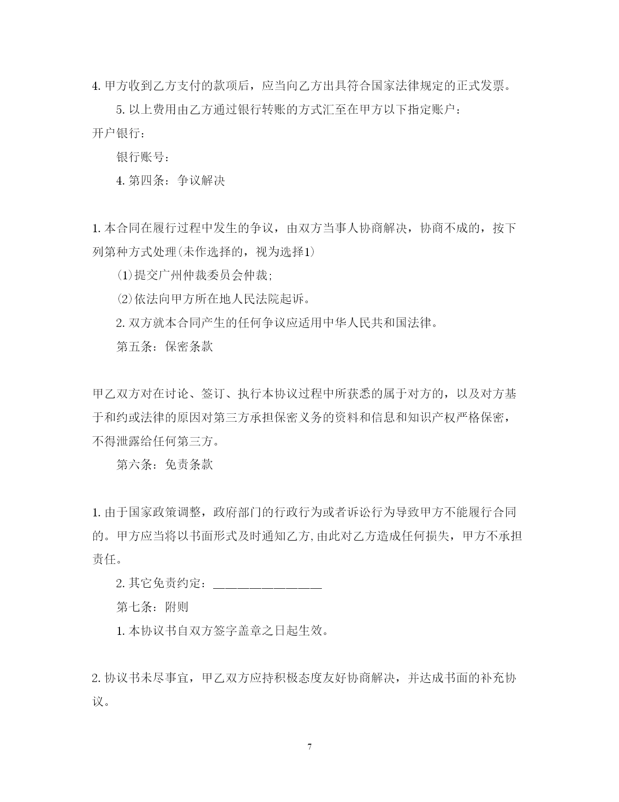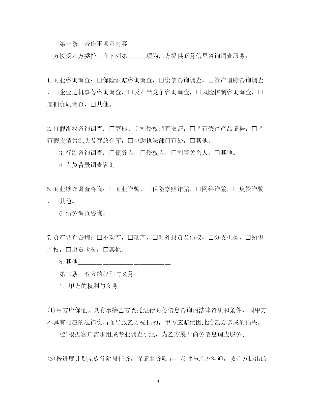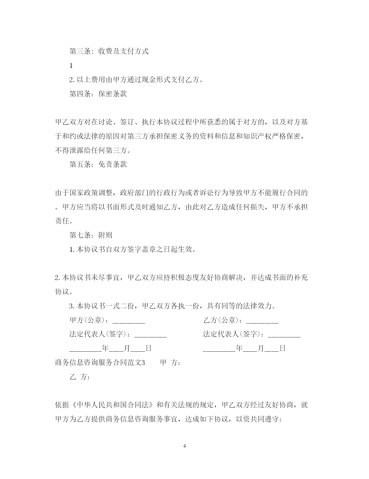 此资料由网络收集而来,如有侵权请告知上传者立即删除。资料共分享,我们负责传递知识。PAGEPAGE8商务信息咨询服务合同范本随着科技的发展,商务信息咨询服务合同产生的纠纷越来越多,那么签订商务信息咨询服务合同需要注意什么呢?以下是在范文网小编为大家整理的商务信息咨询服务合同范文,感谢您的阅读。商务信息咨询服务合同范文1甲方:乙方:甲乙双方根据国家对有偿信息发布的有关规定,签订本合同,并共同遵守。一、甲方委托乙方于20xx年9月25日至20xx年9月31日期间在所属的网站或刊物上发布有偿信息服务。本合同所指的有偿信息服务包括:文字、图片及其他多媒体形式。二、样稿来源:□甲方提供;□乙方设计后经甲方确认(需要额外收费)。三、乙方有权审查信息内容和表现形式,对不符合法律、法规的内容和表现形式,乙方可要求甲方做出修改。四、甲方对委托乙方发布的经济信息的合法性承担全部责任,并承诺对因此给乙方造成的损失承担赔偿责任。五、有偿信息服务单价及报价:1.首页通栏图片信息:2SWF/GIF□3500元/月;2.标准横幅图文信息:1SWF/GIF□20xx元/月;3.首页图标图文信息:2SWF/GIF□3000元/月;4.文字连接20xx个字以内文本□1000元/月;5.58同城招聘频道广告10000字以内文本□6000元/月;□350元/篇;送招聘栏目图标广告3月。六、甲方应在双方签约后的5个工作日内将费用付给乙方,付款方式:□转账;□现金。乙方收款后,应在10工作日内向甲方开据正式发票。七、甲方在投放有偿信息服务期间可以修改期内容,修改频率不得超过10次/月,如超过此限制,甲方需另外支付修改费用,金额由双方约定。八、任何一方违反本合同规定之条款,应立即停止违约行为,并在15个工作日内赔偿守约方的损失。双方约定赔偿金额以付款总额的20%为准。九、因不可抗力导致本合同无法履行,则本合作在不可抗力影响范围和影响期限内中止,双方均不承担责任。就本合同而言,不可抗力是指由于政府或主管单位管制、电信部门中止互联网服务等因素造成乙方无法正常履行本合同。十、本合同产生的任何争议,应通过友好协商解决。不能协商解决的,任何一方有权将争议提交深圳仲裁委员会,按照该会仲裁规则在进行终局裁决。十一、本合同一式两份,经双方代表签字、加盖公章后生效。甲方(公章):_________乙方(公章):_________法定代表人(签字):_________法定代表人(签字):__________________年____月____日_________年____月____日商务信息咨询服务合同范文2甲方:乙方:依据《中华人民共和国合同法》和有关法规的规定,甲乙双方经过友好协商,就甲方为乙方提供商务信息咨询服务事宜,达成如下协议,以资共同遵守:第一条:合作事项及内容乙方接受甲方委托,为甲方提供商务信息调查服务。第二条:双方的权利与义务1.乙方的权利与义务(1)乙方应保证其具有承接乙方委托进行商务信息咨询的法律资质和条件,因乙方不具有相应的法律资质而导致甲方受损的,乙方应赔偿因此给乙方造成的损失。(2)根据客户需求组成专业调查小组,为甲方展开商务信息调查服务;(3)按进度计划完成各阶段任务,保证服务质量,及时与甲方沟通,按甲方提出的指导性要求修改和完善各阶段调查成果。(4)确保各阶段的调查和咨询工作不违反国家有关法律、法规的规定,并不得侵犯其他人的合法权利。(5)乙方不得将为家方调查的商务信息泄露给任何第三方或作为本合同约定外的其他用途,因此给甲方造成损失的,应当承担赔偿责任。2.甲方的权利与义务(1)甲方须指派专人作为联络人,负责与乙方联络并协助乙方开展商务信息调查咨询工作;(2)为甲方工作及时提供所需的背景资料和相关信息;(3)对乙方各阶段成果提出建议性要求或修改意见,并在审定通过后及时给予书面确认;(4)及时向乙方支付报酬;(5)如果对委托调查咨询的项目内容、期限做出改变,应及时通知乙方,并采取适当措施,便于乙方及时调整工作。第三条:收费及支付方式12.以上费用由甲方通过现金形式支付乙方。第四条:保密条款甲乙双方对在讨论、签订、执行本协议过程中所获悉的属于对方的,以及对方基于和约或法律的原因对第三方承担保密义务的资料和信息和知识产权严格保密,不得泄露给任何第三方。第五条:免责条款由于国家政策调整,政府部门的行政行为或者诉讼行为导致甲方不能履行合同的。甲方应当将以书面形式及时通知乙方,由此对乙方造成任何损失,甲方不承担责任。第七条:附则1.本协议书自双方签字盖章之日起生效。2.本协议书未尽事宜,甲乙双方应持积极态度友好协商解决,并达成书面的补充协议。3.本