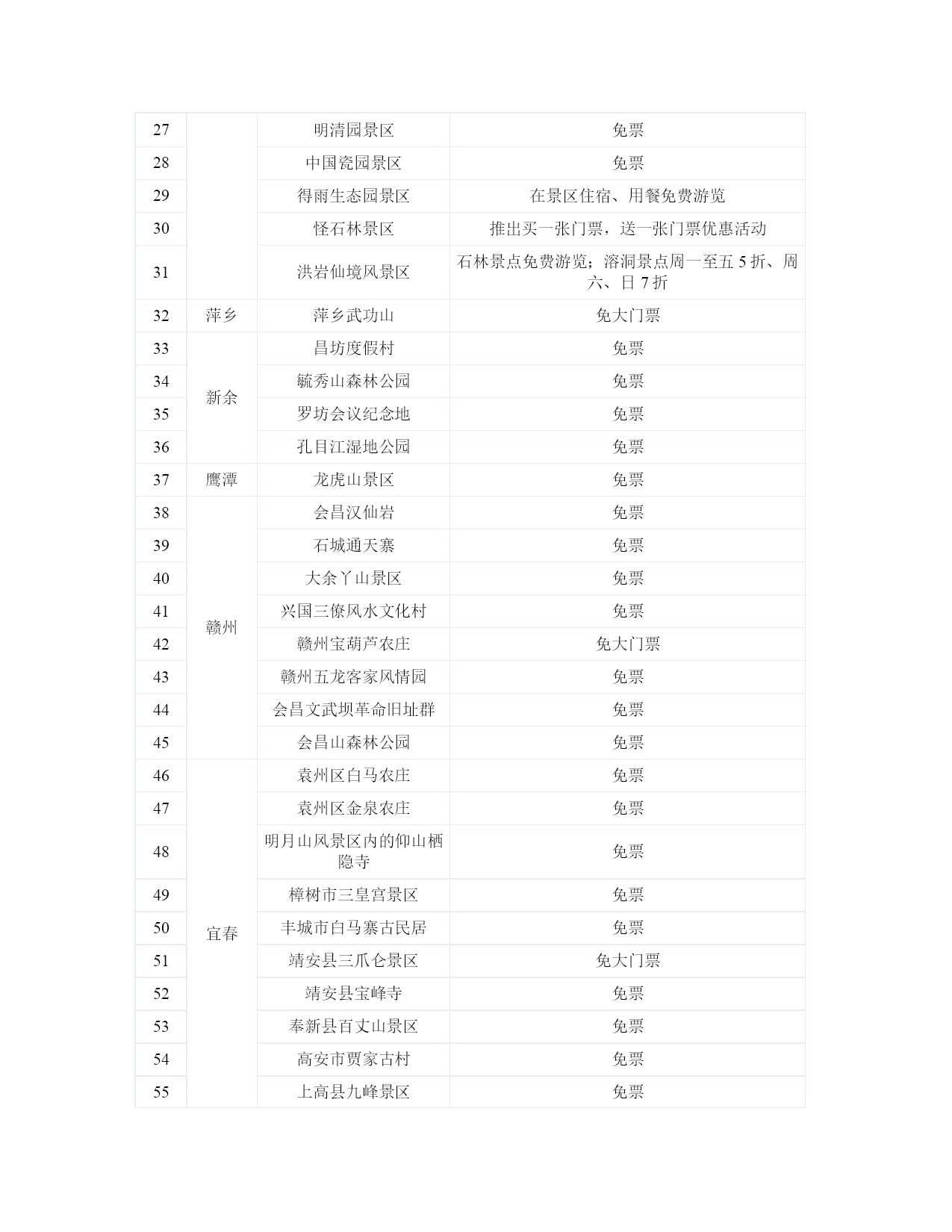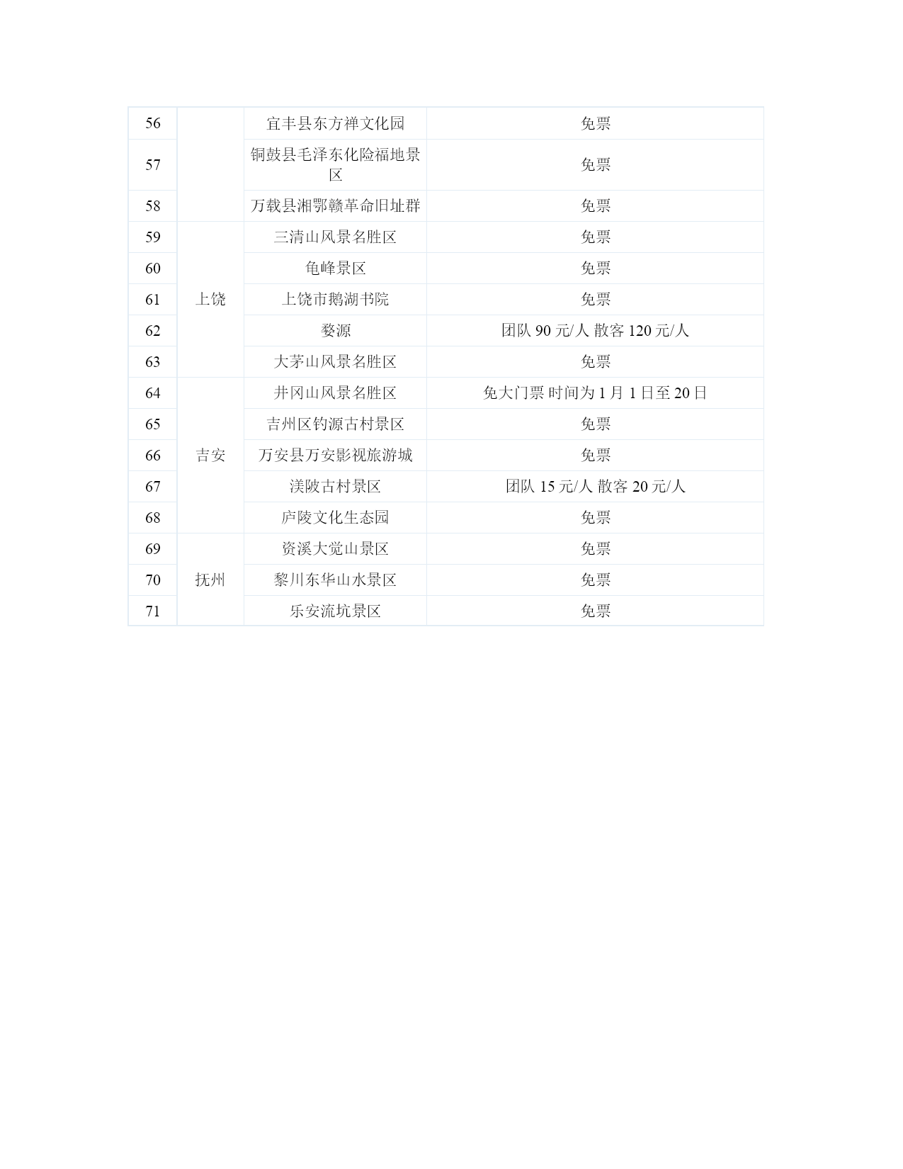 江西旅游景点20111220-20120120免票序号地市景区名称免票情况1南昌八一起义纪念馆免票2南昌新四军军部旧址陈列馆免票3厚田沙漠景区免票4江西凤凰沟景区免票5九江庐山风景名胜区免大门票6九江市共青城市富华山景区免票7修水县黄庭坚纪念馆免票8秋收起义纪念馆旅游区免票9九江兜率寺景区免票10武宁县神雾山风景区免票11武陵奇峡景区免票12都昌县南山风景区免票13老爷庙免票14鹤舍古村免票15李洞林村候鸟观赏点免票16千眼桥免票17大港(张岭)水库免票18三尖源森林公园免票19多宝沙山沙漠乐园免票20彭泽县马当炮台免票21武宁鲁溪洞五折优惠22庐山西海内仙女峡免票23景德镇古窑民俗博览区本地市民凭身份证免费游览24高岭瑶里风景区推出非周末住宿送门票优惠活动(春节长假除外)25冷水尖景区本地市民凭身份证免费游览26浮梁古县衙景区本地市民凭身份证免费游览27明清园景区免票28中国瓷园景区免票29得雨生态园景区在景区住宿、用餐免费游览30怪石林景区推出买一张门票,送一张门票优惠活动31洪岩仙境风景区石林景点免费游览;溶洞景点周一至五5折、周六、日7折32萍乡萍乡武功山免大门票33新余昌坊度假村免票34毓秀山森林公园免票35罗坊会议纪念地免票36孔目江湿地公园免票37鹰潭龙虎山景区免票38赣州会昌汉仙岩免票39石城通天寨免票40大余丫山景区免票41兴国三僚风水文化村免票42赣州宝葫芦农庄免大门票43赣州五龙客家风情园免票44会昌文武坝革命旧址群免票45会昌山森林公园免票46宜春袁州区白马农庄免票47袁州区金泉农庄免票48明月山风景区内的仰山栖隐寺免票49樟树市三皇宫景区免票50丰城市白马寨古民居免票51靖安县三爪仑景区免大门票52靖安县宝峰寺免票53奉新县百丈山景区免票54高安市贾家古村免票55上高县九峰景区免票56宜丰县东方禅文化园免票57铜鼓县毛泽东化险福地景区免票58万载县湘鄂赣革命旧址群免票59上饶三清山风景名胜区免票60龟峰景区免票61上饶市鹅湖书院免票62婺源团队90元/人散客120元/人63大茅山风景名胜区免票64吉安井冈山风景名胜区免大门票时间为1月1日至20日65吉州区钓源古村景区免票66万安县万安影视旅游城免票67渼陂古村景区团队15元/人散客20元/人68庐陵文化生态园免票69抚州资溪大觉山景区免票70黎川东华山水景区免票71乐安流坑景区免票