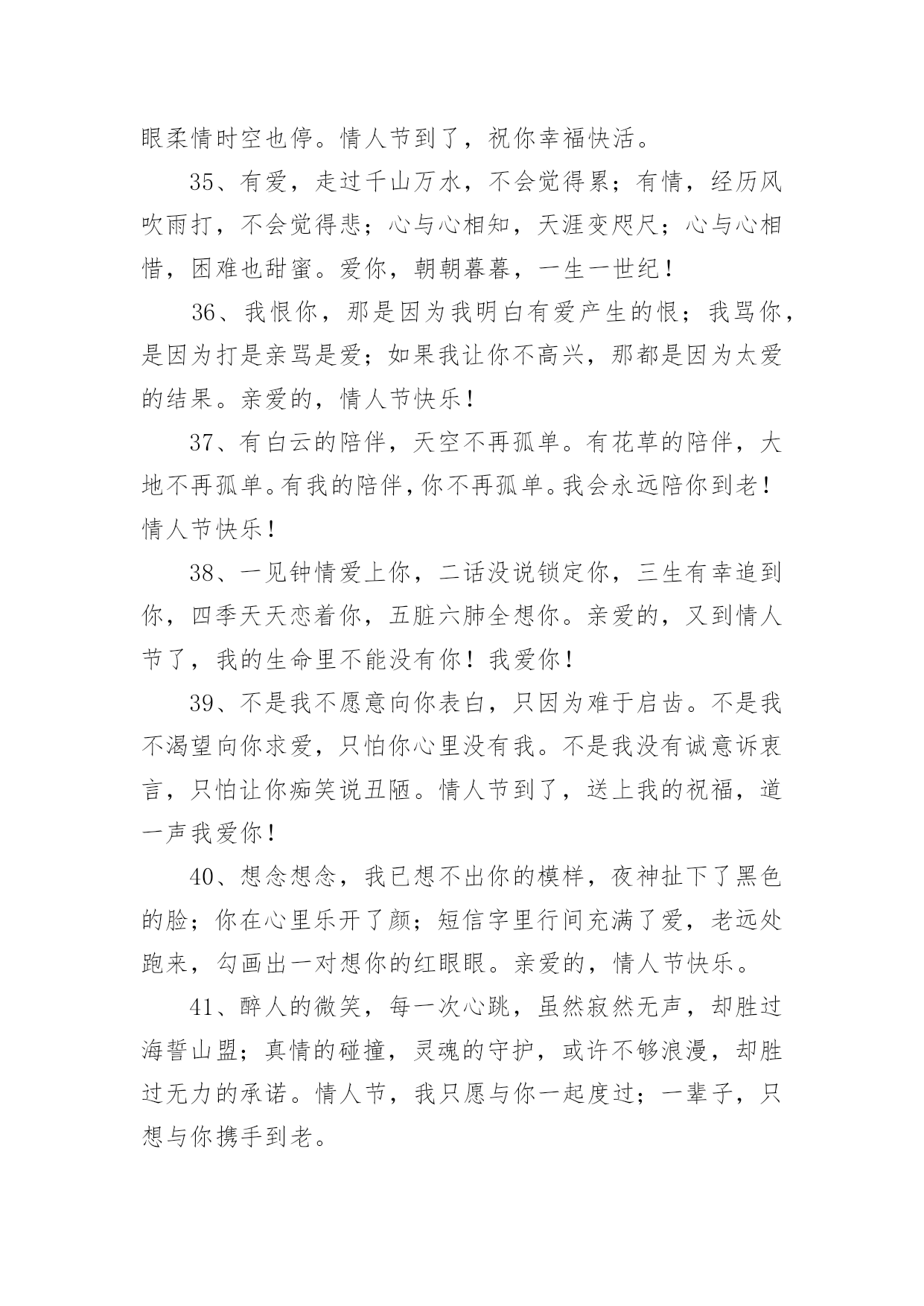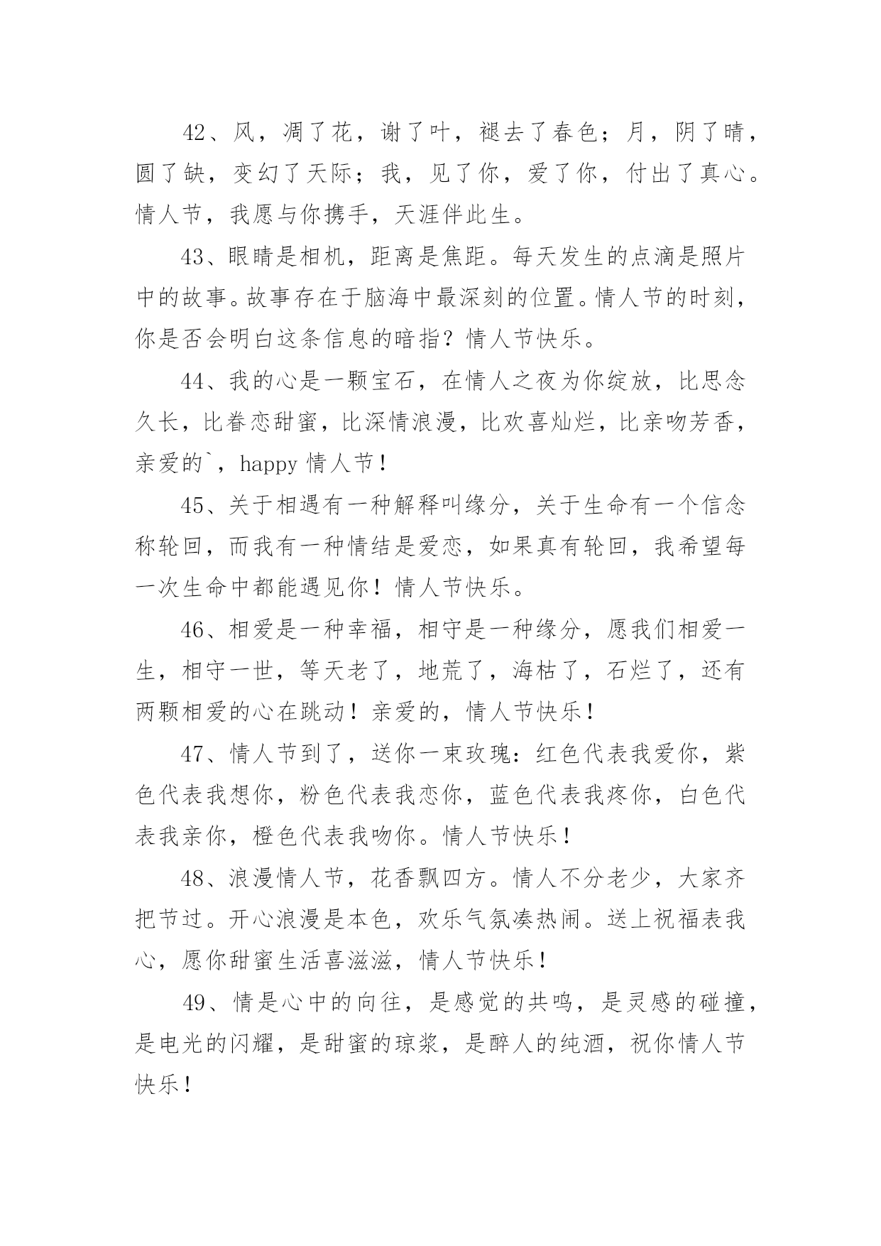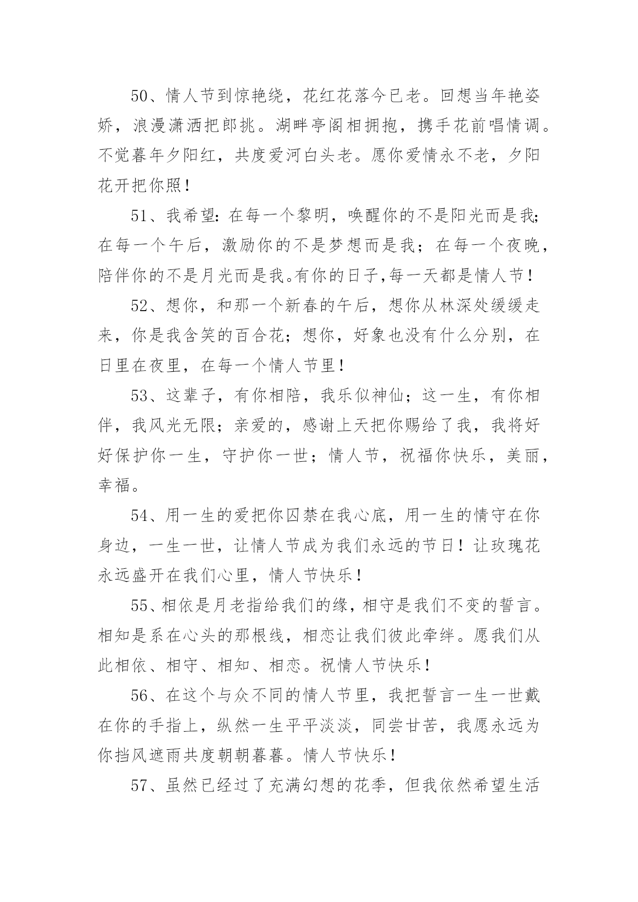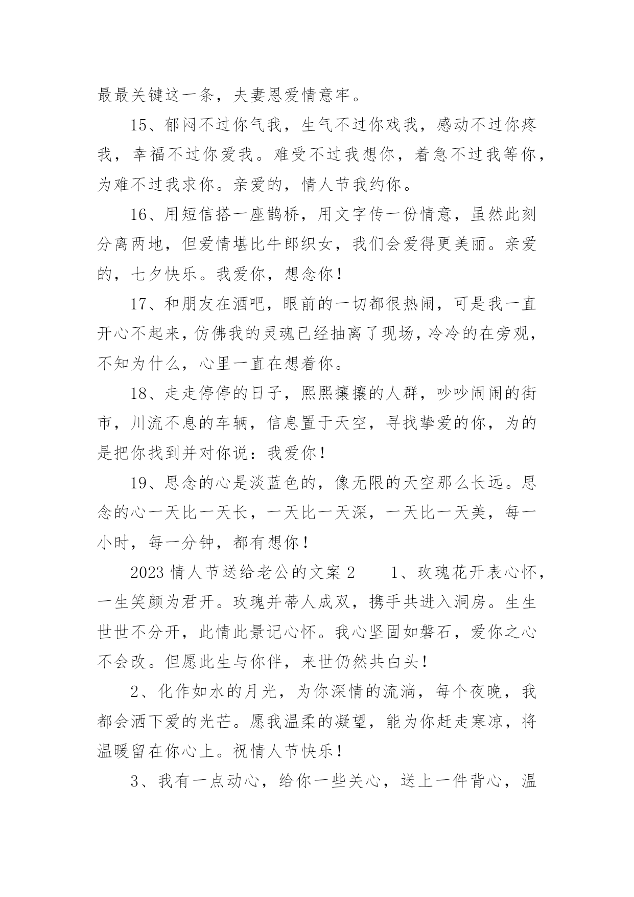 2023情人节送给老公的文案2023情人节送给老公的文案在学习、工作、生活中,大家都看到过文案吧,借助文案可以达到宣传文化的目的。你还在找寻优秀经典的文案吗?下面是小编帮大家整理的2023情人节送给老公的文案,希望能够帮助到大家。2023情人节送给老公的文案11、情人节到了,送你一把样式特别的雨伞,是用真心打造,爱心撑起,希望你雨天遮雨,夏天遮阳,一辈子为你遮风挡雨,宝贝,我爱你。2、爱,就是在一座叫缘分的桥上相遇,喝一碗叫相思的汤,拥一颗叫不变的心,过一种叫简单的生活,然后彼此牵手,走一条叫一辈子的路。3、相守相望的是眼,知冷知热的是心;不离不弃的是情,一生一世的是爱;传递祝福的是我的短信。亲爱的,愿你快乐每一季,甜蜜每一天。4、如果你(织女)找到了可以托付终生的伴侣(牛郎),我愿做那群喜鹊中的其中一只喜鹊,为你们搭起幸福的鹊桥。祝你们幸福一生,七夕快乐!5、二月春风似剪刀,柳枝吐绿玫瑰笑。人逢喜事精神爽,爱情开花人欢笑。双双对对手牵手,隐入花海幸福抱。情人节到了,祝你快乐欢笑!6、死生契阔,与子相悦,执子之手,与子偕老。执子之手,方知子丑,泪流满面,子不走我走。执子之爱,与你相伴,情人节来之,你我共享之!7、想念与你在一起的幸福时光,喜欢与你双手紧握的甜蜜感觉。想与你相爱到老,牵手一生,即使白发苍苍,也能彼此相依。宝贝,情人节快乐!8、好想做你的手机,揣在你的兜里;好想做你的水杯,捧在你的手里;好想做你的风景,看在你的眼里;好想做你的'情人,记在你的心里。情人节快乐!9、见到你,我就心情明朗,你就是阴雨天里久违的阳光;想着你,我就无比欢畅,你就是沙漠中那抹绿洲令我渴望。给我你的爱吧,我会爱你地久天长。10、假如我是风筝,你就是那根长线,牵引着我;假如我是蜡烛,你就是那团火焰,燃烧着我。没有你,连呼吸都变得多余,亲爱的,你就是我的唯一!11、鹊桥是银河的传奇,你是我心中的传奇。浪漫缘分是上天的安排,爱情神话是永恒的未来。许多的奇迹只有相信才会存在。亲爱的,七夕愉快!12、情人节快到了,为维护情场稳定,国家将发布限情令,规定每个人只能拥有一个情人,凡拥有两个及以上情人的,统统征收多情税。朋友,悠着点。13、请你轻轻打开手机,请你慢慢阅读信息,请你悄悄展开笑颜,请你天天将我思念。浪漫的节日即将到来,我的关爱在点滴间,祝你七夕节幸福快乐!14、七月初七恰今朝,牛郎织女会鹊桥。值此七夕节日到,发条短信问声好。祝你健康暑热消,心情愉快很重要。最最关键这一条,夫妻恩爱情意牢。15、郁闷不过你气我,生气不过你戏我,感动不过你疼我,幸福不过你爱我。难受不过我想你,着急不过我等你,为难不过我求你。亲爱的,情人节我约你。16、用短信搭一座鹊桥,用文字传一份情意,虽然此刻分离两地,但爱情堪比牛郎织女,我们会爱得更美丽。亲爱的,七夕快乐。我爱你,想念你!17、和朋友在酒吧,眼前的一切都很热闹,可是我一直开心不起来,仿佛我的灵魂已经抽离了现场,冷冷的在旁观,不知为什么,心里一直在想着你。18、走走停停的日子,熙熙攘攘的人群,吵吵闹闹的街市,川流不息的车辆,信息置于天空,寻找挚爱的你,为的是把你找到并对你说:我爱你!19、思念的心是淡蓝色的,像无限的天空那么长远。思念的心一天比一天长,一天比一天深,一天比一天美,每一小时,每一分钟,都有想你!2023情人节送给老公的文案21、玫瑰花开表心怀,一生笑颜为君开。玫瑰并蒂人成双,携手共进入洞房。生生世世不分开,此情此景记心怀。我心坚固如磐石,爱你之心不会改。但愿此生与你伴,来世仍然共白头!2、化作如水的月光,为你深情的流淌,每个夜晚,我都会洒下爱的光芒。愿我温柔的凝望,能为你赶走寒凉,将温暖留在你心上。祝情人节快乐!3、我有一点动心,给你一些关心,送上一件背心,温暖你的寒心,这是我的诚心,希望你能称心,即使你不动心,我有我的恒心,将我的真心,放在你的手心!4、再没有人唠叨你,你会不习惯。再没有人向你发脾气,你会觉得生活太平淡。再没有人在你面前哭,你会觉得自己不重要。情人节我想你!5、拉开爱情的帷幕,唱响柔情的序曲,讲句甜蜜的台词,在爱情的舞台上,主角只有我和你,宝贝,我爱你到永远,愿为你打造一世幸福!6、遇到你很开心!和你聊天很舒心!有你的日子很顺心!你的关心让我很贴心!给你我的心,让我的心陪伴你一生!情人节快乐!7、很抱歉,亲爱的,今天情人节我不能陪在你的身边,亲爱的,请你不要难过,我已为你送去我最最贵重的礼物,请注意检收,我最真情的心,祝你情人节快乐!8、你是我凝眸一生的身影,你是我相守相望的永恒,你是我美丽快乐的风景,你是我温暖明媚的心情。情人节,愿与你牵手,走那悠长的人生,任幸福甜蜜飞扬!9、情人节智力测试题:两种蔬菜同时拥有一个品牌的手机!猜两种蔬菜和一个手机品牌。答案:萝卜青菜各有所爱!今天你