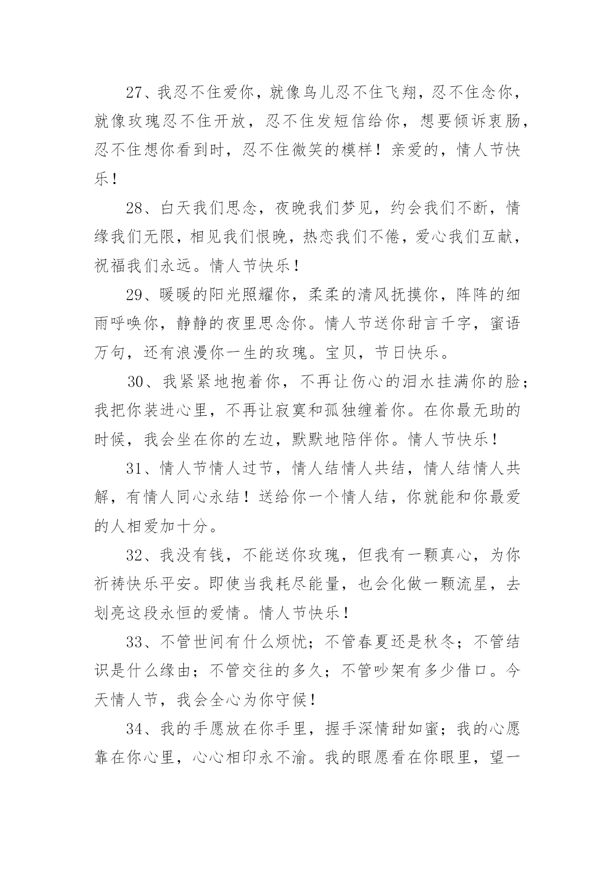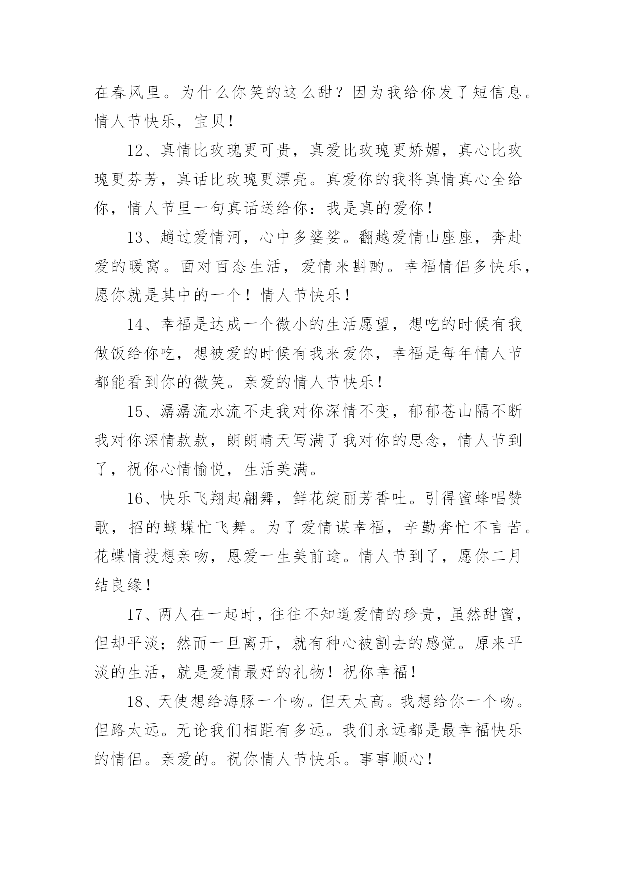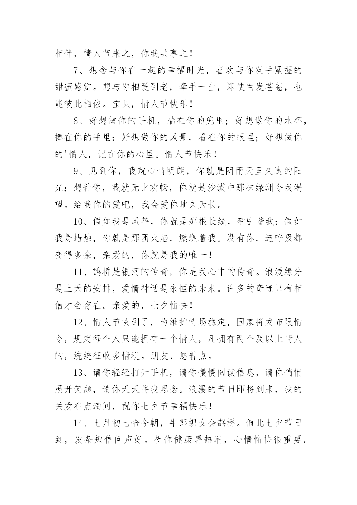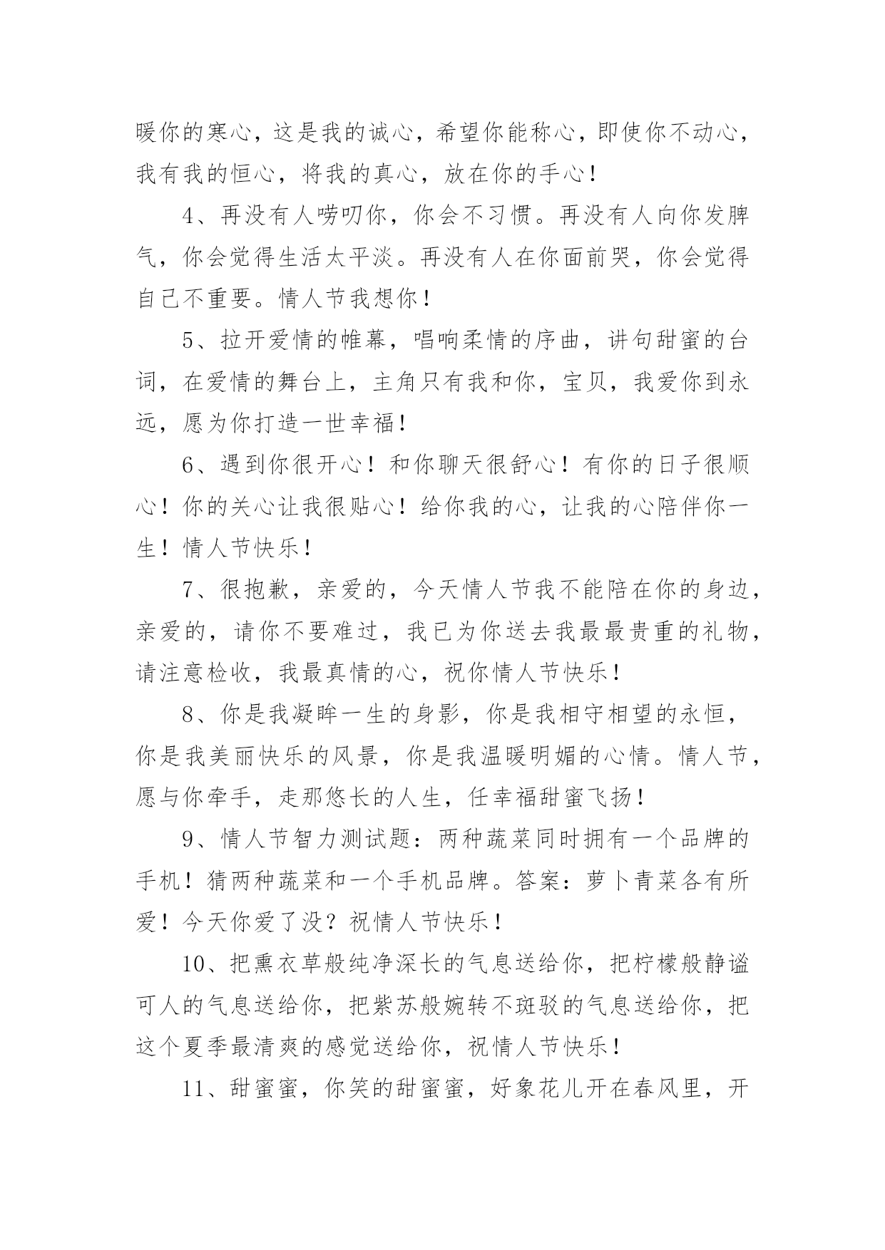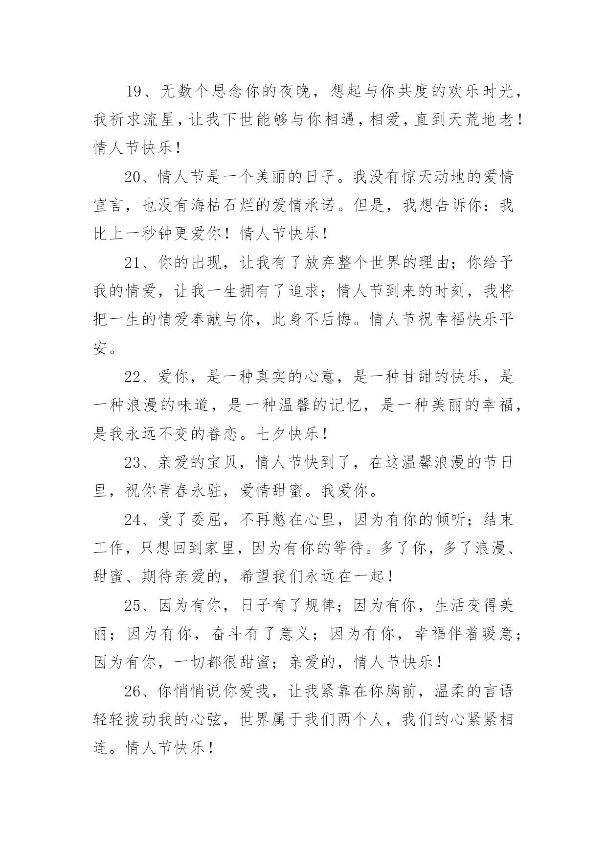 2023情人节送给老公的文案2023情人节送给老公的文案在学习、工作、生活中,大家都看到过文案吧,借助文案可以达到宣传文化的目的。你还在找寻优秀经典的文案吗?下面是小编帮大家整理的2023情人节送给老公的文案,希望能够帮助到大家。2023情人节送给老公的文案11、情人节到了,送你一把样式特别的雨伞,是用真心打造,爱心撑起,希望你雨天遮雨,夏天遮阳,一辈子为你遮风挡雨,宝贝,我爱你。2、爱,就是在一座叫缘分的桥上相遇,喝一碗叫相思的汤,拥一颗叫不变的心,过一种叫简单的生活,然后彼此牵手,走一条叫一辈子的路。3、相守相望的是眼,知冷知热的是心;不离不弃的是情,一生一世的是爱;传递祝福的是我的短信。亲爱的,愿你快乐每一季,甜蜜每一天。4、如果你(织女)找到了可以托付终生的伴侣(牛郎),我愿做那群喜鹊中的其中一只喜鹊,为你们搭起幸福的鹊桥。祝你们幸福一生,七夕快乐!5、二月春风似剪刀,柳枝吐绿玫瑰笑。人逢喜事精神爽,爱情开花人欢笑。双双对对手牵手,隐入花海幸福抱。情人节到了,祝你快乐欢笑!6、死生契阔,与子相悦,执子之手,与子偕老。执子之手,方知子丑,泪流满面,子不走我走。执子之爱,与你相伴,情人节来之,你我共享之!7、想念与你在一起的幸福时光,喜欢与你双手紧握的甜蜜感觉。想与你相爱到老,牵手一生,即使白发苍苍,也能彼此相依。宝贝,情人节快乐!8、好想做你的手机,揣在你的兜里;好想做你的水杯,捧在你的手里;好想做你的风景,看在你的眼里;好想做你的'情人,记在你的心里。情人节快乐!9、见到你,我就心情明朗,你就是阴雨天里久违的阳光;想着你,我就无比欢畅,你就是沙漠中那抹绿洲令我渴望。给我你的爱吧,我会爱你地久天长。10、假如我是风筝,你就是那根长线,牵引着我;假如我是蜡烛,你就是那团火焰,燃烧着我。没有你,连呼吸都变得多余,亲爱的,你就是我的唯一!11、鹊桥是银河的传奇,你是我心中的传奇。浪漫缘分是上天的安排,爱情神话是永恒的未来。许多的奇迹只有相信才会存在。亲爱的,七夕愉快!12、情人节快到了,为维护情场稳定,国家将发布限情令,规定每个人只能拥有一个情人,凡拥有两个及以上情人的,统统征收多情税。朋友,悠着点。13、请你轻轻打开手机,请你慢慢阅读信息,请你悄悄展开笑颜,请你天天将我思念。浪漫的节日即将到来,我的关爱在点滴间,祝你七夕节幸福快乐!14、七月初七恰今朝,牛郎织女会鹊桥。值此七夕节日到,发条短信问声好。祝你健康暑热消,心情愉快很重要。最最关键这一条,夫妻恩爱情意牢。15、郁闷不过你气我,生气不过你戏我,感动不过你疼我,幸福不过你爱我。难受不过我想你,着急不过我等你,为难不过我求你。亲爱的,情人节我约你。16、用短信搭一座鹊桥,用文字传一份情意,虽然此刻分离两地,但爱情堪比牛郎织女,我们会爱得更美丽。亲爱的,七夕快乐。我爱你,想念你!17、和朋友在酒吧,眼前的一切都很热闹,可是我一直开心不起来,仿佛我的灵魂已经抽离了现场,冷冷的在旁观,不知为什么,心里一直在想着你。18、走走停停的日子,熙熙攘攘的人群,吵吵闹闹的街市,川流不息的车辆,信息置于天空,寻找挚爱的你,为的是把你找到并对你说:我爱你!19、思念的心是淡蓝色的,像无限的天空那么长远。思念的心一天比一天长,一天比一天深,一天比一天美,每一小时,每一分钟,都有想你!2023情人节送给老公的文案21、玫瑰花开表心怀,一生笑颜为君开。玫瑰并蒂人成双,携手共进入洞房。生生世世不分开,此情此景记心怀。我心坚固如磐石,爱你之心不会改。但愿此生与你伴,来世仍然共白头!2、化作如水的月光,为你深情的流淌,每个夜晚,我都会洒下爱的光芒。愿我温柔的凝望,能为你赶走寒凉,将温暖留在你心上。祝情人节快乐!3、我有一点动心,给你一些关心,送上一件背心,温暖你的寒心,这是我的诚心,希望你能称心,即使你不动心,我有我的恒心,将我的真心,放在你的手心!4、再没有人唠叨你,你会不习惯。再没有人向你发脾气,你会觉得生活太平淡。再没有人在你面前哭,你会觉得自己不重要。情人节我想你!5、拉开爱情的帷幕,唱响柔情的序曲,讲句甜蜜的台词,在爱情的舞台上,主角只有我和你,宝贝,我爱你到永远,愿为你打造一世幸福!6、遇到你很开心!和你聊天很舒心!有你的日子很顺心!你的关心让我很贴心!给你我的心,让我的心陪伴你一生!情人节快乐!7、很抱歉,亲爱的,今天情人节我不能陪在你的身边,亲爱的,请你不要难过,我已为你送去我最最贵重的礼物,请注意检收,我最真情的心,祝你情人节快乐!8、你是我凝眸一生的身影,你是我相守相望的永恒,你是我美丽快乐的风景,你是我温暖明媚的心情。情人节,愿与你牵手,走那悠长的人生,任幸福甜蜜飞扬!9、情人节智力测试题:两种蔬菜同时拥有一个品牌的手机!猜两种蔬菜和一个手机品牌。答案:萝卜青菜各有所爱!今天你