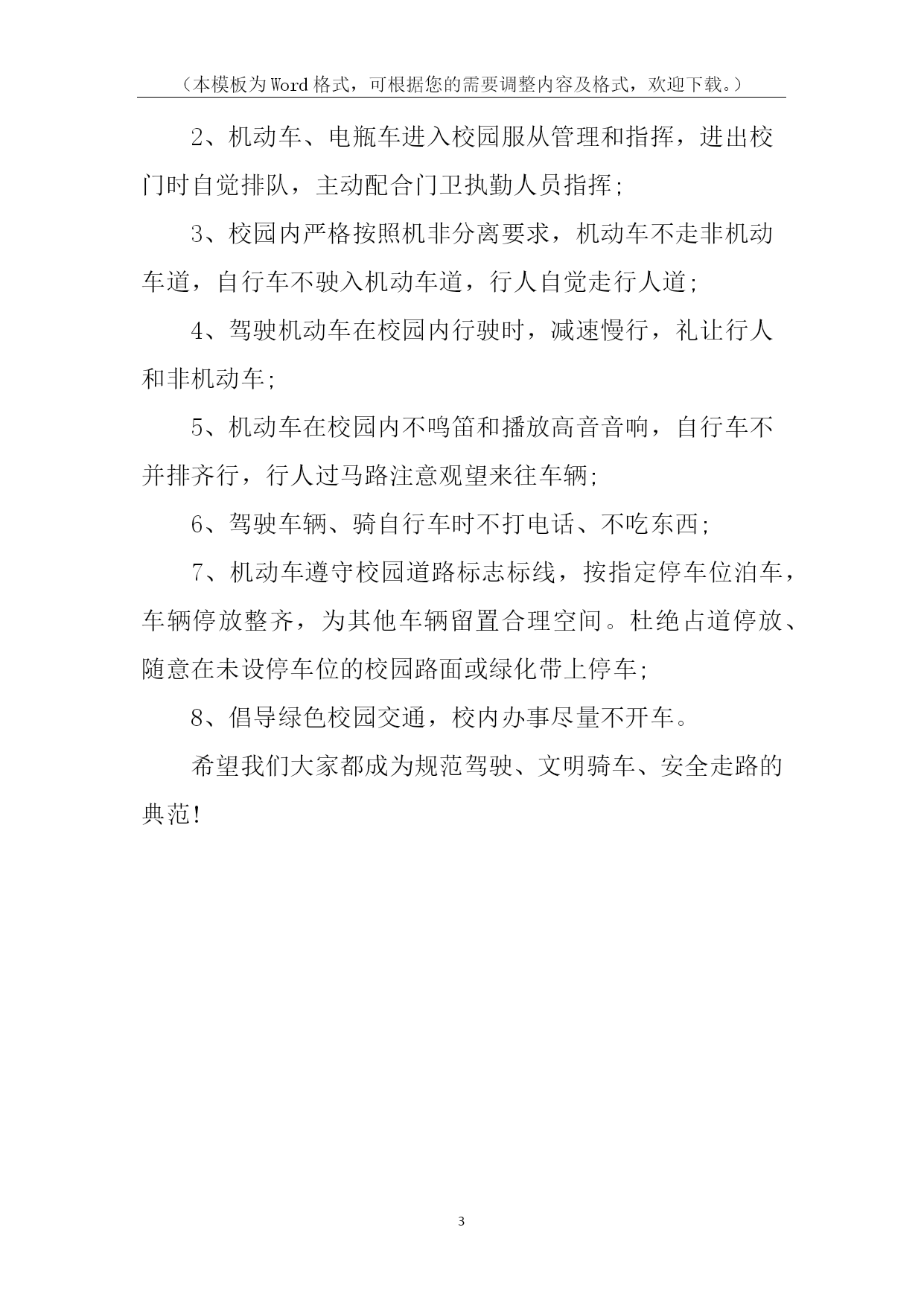 (本模板为Word格式,可根据您的需要调整内容及格式,欢迎下载。)PAGE\*MERGEFORMAT3交通安全的倡议书在上下学的路上,我经常会看到一些车辆不遵守交通规则。闯红灯,逆行,不按规定车道行驶等一些不文明的'交通行为。尤其是我们学校门前的那条小路上,挤满了车辆。我们总是从车缝间穿行。别认为这都是些小事,但这些交通隐患和淡薄的安全意识会扼杀名贵的生命。因此,我向全市人民发出倡议:1、遵守交通法规,不闯红灯,不逆行,不乱穿马路,过马路时要走斑马线,要做到:红灯停,绿灯行,黄灯等一等。2、杜绝超员超载车。3、车辆,行人各行其道,机动车礼让斑马线。4、禁止酒后驾车,无证驾驶。珍爱生命,遵守交通规则,让我们行动起来,从我做起,从现在做起,为交通的安全及畅通,为了名贵的生命,请遵守交通规则吧!交通安全的倡议书同学们:20**年全国共发生交通安全事故378781起,造成89455人死亡,其中有近3万名儿童在交通事故中受伤。俗话说:没有规矩不成方圆。遵守交通规则是我们应尽的责任和义务。一、认真学习、宣传和自觉遵守交通安全法律法规,增强社会公德意识和交通安全意识,树立文明交通新风。二、文明走路。不要在班马上拥挤前行,要按照线路直行。三、文明骑车。未满12周岁的不准骑自行车;未满16周岁的不准骑电动车。做到不闯红灯,不走快车道,不扶身并行、猛拐、互相追逐;不牵引、攀扶车辆,不双手离把;骑自行车横过机动车道时,应下车推行;不骑车带人,不违章载物;不打伞骑车;步行或骑自行车过马路时要做到一停、二看、三通过。同学们,平平安安出门,快快乐乐回家。交通安全的倡议书全校师生员工:交通文明,人人有责!交通安全,合力创造!安全文明的校园交通秩序需要我们大家共同维护,和谐稳定的校园氛围需要我们大家共同营造。让我们共同行动起来,规范驾驶、文明骑车、安全走路,从自身做起,从点滴做起,做一个文明的交大人!特提出以下倡议:1、自觉遵守各项交通法规,共同维护校园交通秩序;2、机动车、电瓶车进入校园服从管理和指挥,进出校门时自觉排队,主动配合门卫执勤人员指挥;3、校园内严格按照机非分离要求,机动车不走非机动车道,自行车不驶入机动车道,行人自觉走行人道;4、驾驶机动车在校园内行驶时,减速慢行,礼让行人和非机动车;5、机动车在校园内不鸣笛和播放高音音响,自行车不并排齐行,行人过马路注意观望来往车辆;6、驾驶车辆、骑自行车时不打电话、不吃东西;7、机动车遵守校园道路标志标线,按指定停车位泊车,车辆停放整齐,为其他车辆留置合理空间。杜绝占道停放、随意在未设停车位的校园路面或绿化带上停车;8、倡导绿色校园交通,校内办事尽量不开车。希望我们大家都成为规范驾驶、文明骑车、安全走路的典范!