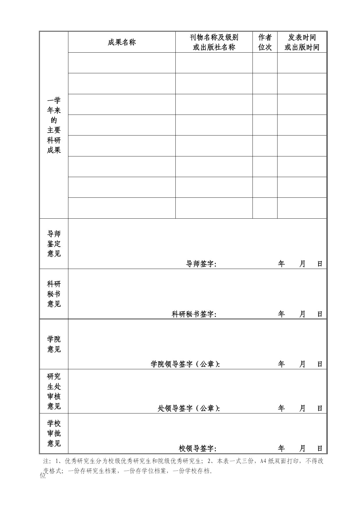优秀研究生申请表(——学年)姓名性别出生日期政治面貌贴相片处学院专业学号综合评定成绩名次学业成绩名次学生申请级别学院推荐级别学校审批级别申请理由一学年来在思想政治、学习、科研、社会活动等方面的主要表现:一学年来的获奖情况:一学年来的主要科研成果成果名称刊物名称及级别或出版社名称作者位次发表时间或出版时间导师鉴定意见导师签字:年月日科研秘书意见科研秘书签字:年月日学院意见学院领导签字(公章):年月日研究生处审核意见处领导签字(公章):年月日学校审批意见校领导签字:年月日注:1、优秀研究生分为校级优秀研究生和院级优秀研究生;2、本表一式三份,A4纸双面打印,不得改变格式;一份存研究生档案,一份存学位档案,一份学校存档。位