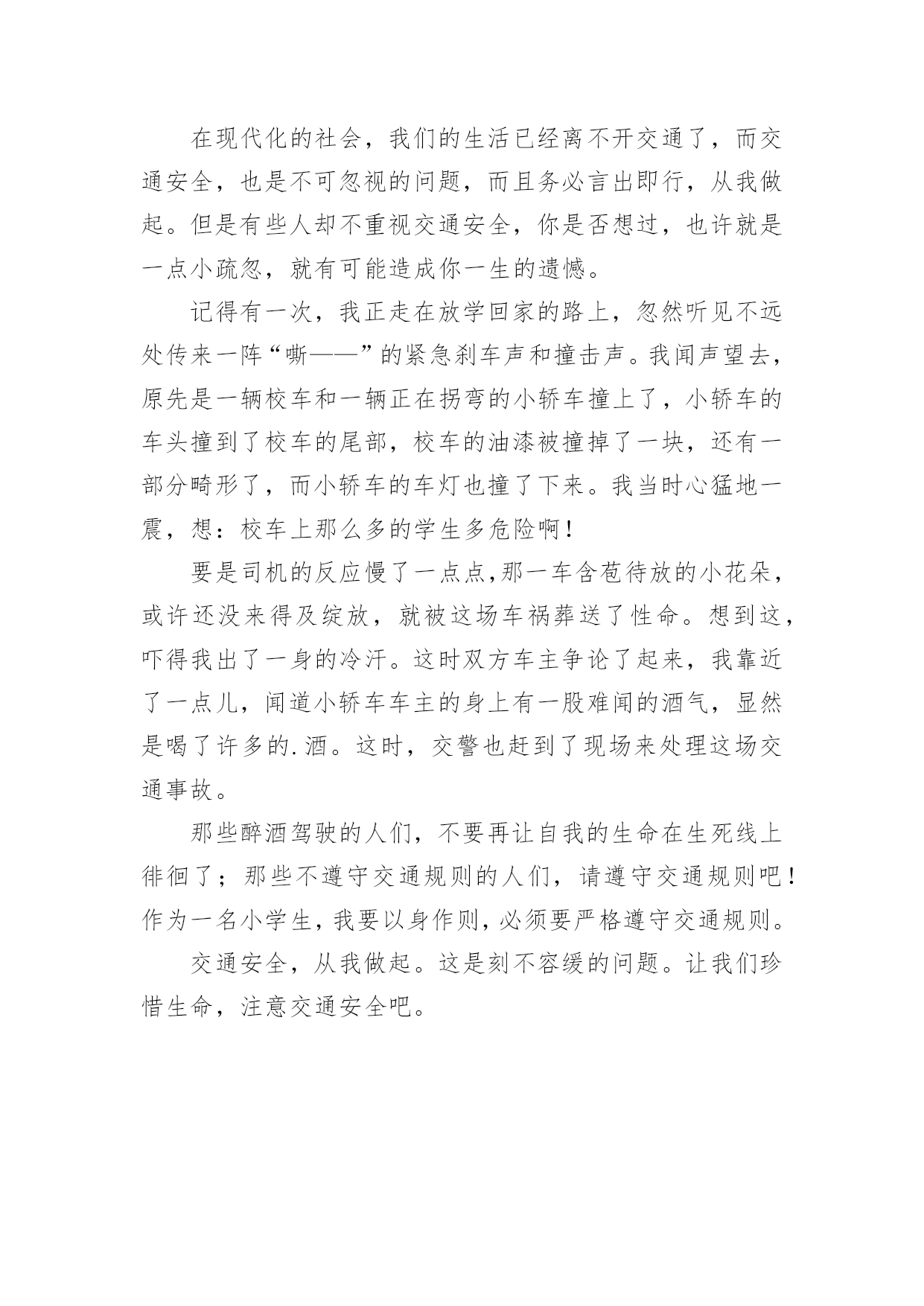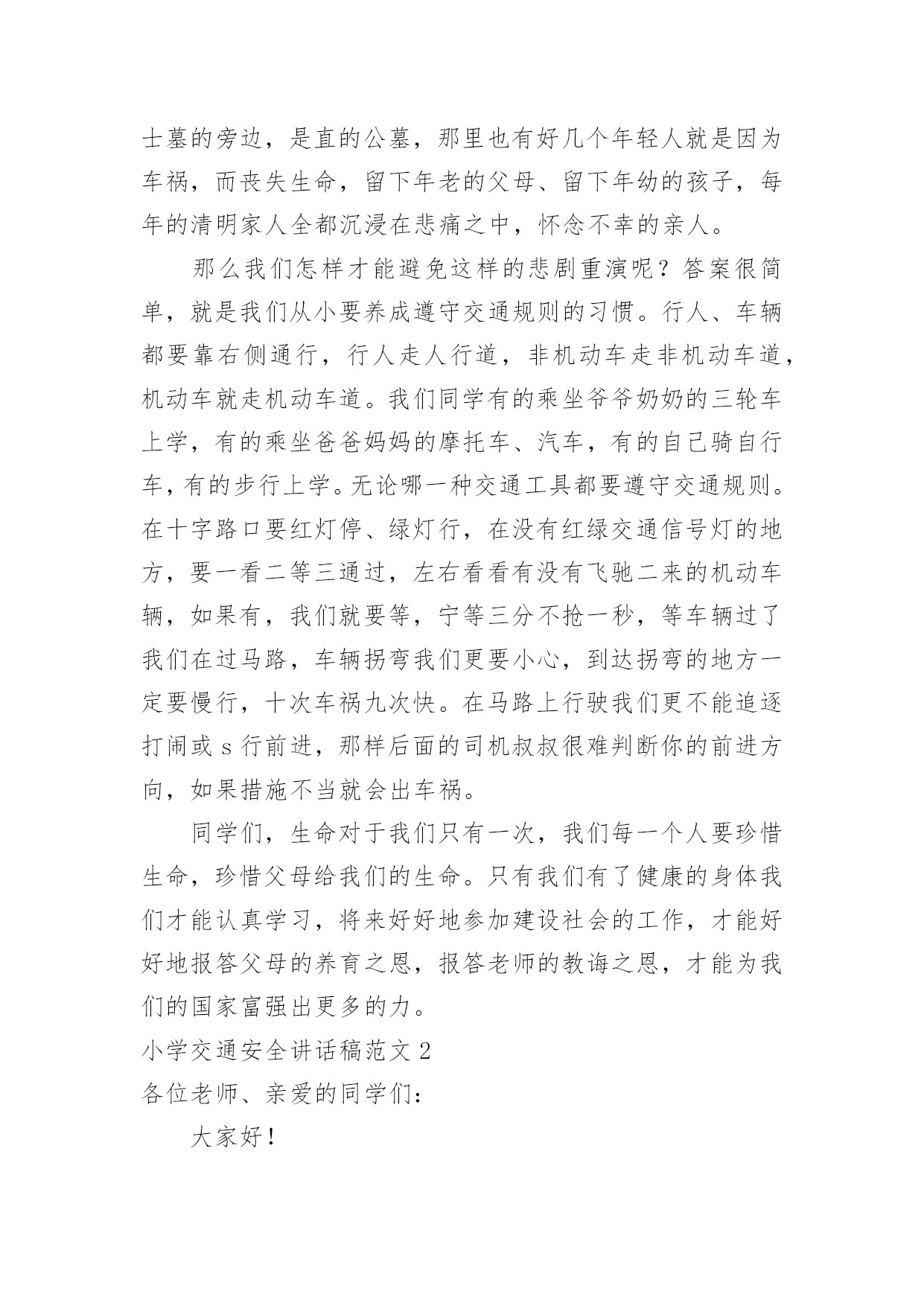 小学交通安全讲话稿小学交通安全讲话稿范文在日新月异的现代社会中,很多地方都会使用到讲话稿,讲话稿是人们在各种会议和一些较庄重、隆重的场合上发表带有宣传、指示、总结性质讲话的文稿。相信很多朋友都对写讲话稿感到非常苦恼吧,下面是小编为大家收集的小学交通安全讲话稿范文,希望对大家有所帮助。小学交通安全讲话稿范文1各位同学、各位老师:大家好!上星期四,我们全校师生分成两组进行了郊游活动。全体同学保持了、发扬了高度的纪律性,一路上排着整整齐齐的队伍,在道路的一侧,安全到达、安全回来,在郊游活动过程中,也没有同学吵闹,嘻笑,大家都严肃、安静、认真。不知各位同学在路上有没有发现你们在横穿马路的时候突然多了几个交通警察,在马路上指挥车辆慢行,甚至停下,让我们同学安全通过。同学们交通安全重于泰山,郊游路上的交通警察是我们学校特地为了同学们的安全请这些警察叔叔帮我们维持交通秩序的。交通安全的'重要我不讲同学们也都知道,上学期我校三年级的翁卓尔和她的爷爷就是因为交通事故而不幸离开我们。我们同学也许不知道,在我们区祭扫的革命烈士墓的旁边,是直的公墓,那里也有好几个年轻人就是因为车祸,而丧失生命,留下年老的父母、留下年幼的孩子,每年的清明家人全都沉浸在悲痛之中,怀念不幸的亲人。那么我们怎样才能避免这样的悲剧重演呢?答案很简单,就是我们从小要养成遵守交通规则的习惯。行人、车辆都要靠右侧通行,行人走人行道,非机动车走非机动车道,机动车就走机动车道。我们同学有的乘坐爷爷奶奶的三轮车上学,有的乘坐爸爸妈妈的摩托车、汽车,有的自己骑自行车,有的步行上学。无论哪一种交通工具都要遵守交通规则。在十字路口要红灯停、绿灯行,在没有红绿交通信号灯的地方,要一看二等三通过,左右看看有没有飞驰二来的机动车辆,如果有,我们就要等,宁等三分不抢一秒,等车辆过了我们在过马路,车辆拐弯我们更要小心,到达拐弯的地方一定要慢行,十次车祸九次快。在马路上行驶我们更不能追逐打闹或s行前进,那样后面的司机叔叔很难判断你的前进方向,如果措施不当就会出车祸。同学们,生命对于我们只有一次,我们每一个人要珍惜生命,珍惜父母给我们的生命。只有我们有了健康的身体我们才能认真学习,将来好好地参加建设社会的工作,才能好好地报答父母的养育之恩,报答老师的教诲之恩,才能为我们的国家富强出更多的力。小学交通安全讲话稿范文2各位老师、亲爱的同学们:大家好!在现代化的社会,我们的生活已经离不开交通了,而交通安全,也是不可忽视的问题,而且务必言出即行,从我做起。但是有些人却不重视交通安全,你是否想过,也许就是一点小疏忽,就有可能造成你一生的遗憾。记得有一次,我正走在放学回家的路上,忽然听见不远处传来一阵“嘶——”的紧急刹车声和撞击声。我闻声望去,原先是一辆校车和一辆正在拐弯的小轿车撞上了,小轿车的车头撞到了校车的尾部,校车的油漆被撞掉了一块,还有一部分畸形了,而小轿车的车灯也撞了下来。我当时心猛地一震,想:校车上那么多的学生多危险啊!要是司机的反应慢了一点点,那一车含苞待放的小花朵,或许还没来得及绽放,就被这场车祸葬送了性命。想到这,吓得我出了一身的冷汗。这时双方车主争论了起来,我靠近了一点儿,闻道小轿车车主的身上有一股难闻的酒气,显然是喝了许多的.酒。这时,交警也赶到了现场来处理这场交通事故。那些醉酒驾驶的人们,不要再让自我的生命在生死线上徘徊了;那些不遵守交通规则的人们,请遵守交通规则吧!作为一名小学生,我要以身作则,必须要严格遵守交通规则。交通安全,从我做起。这是刻不容缓的问题。让我们珍惜生命,注意交通安全吧。