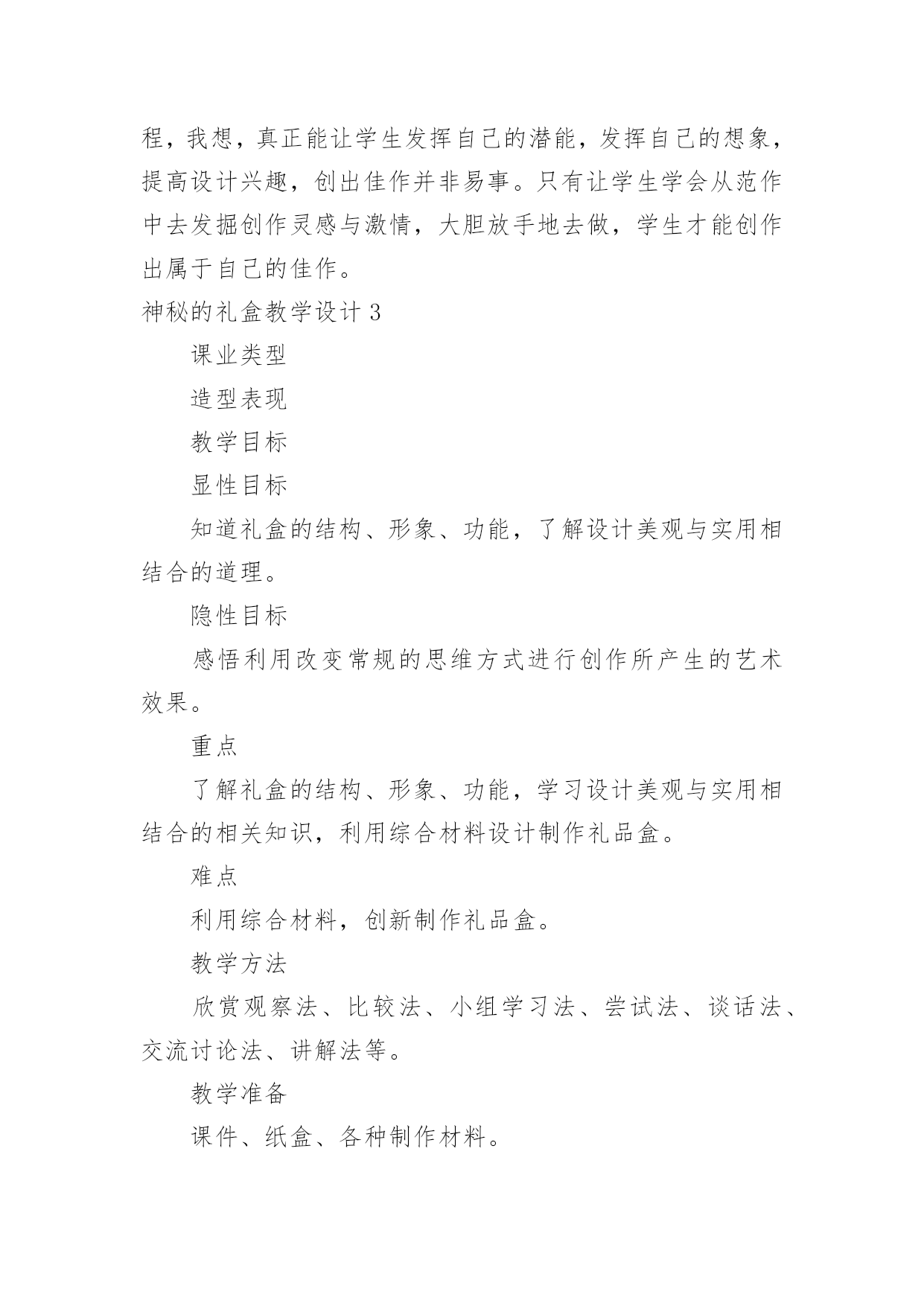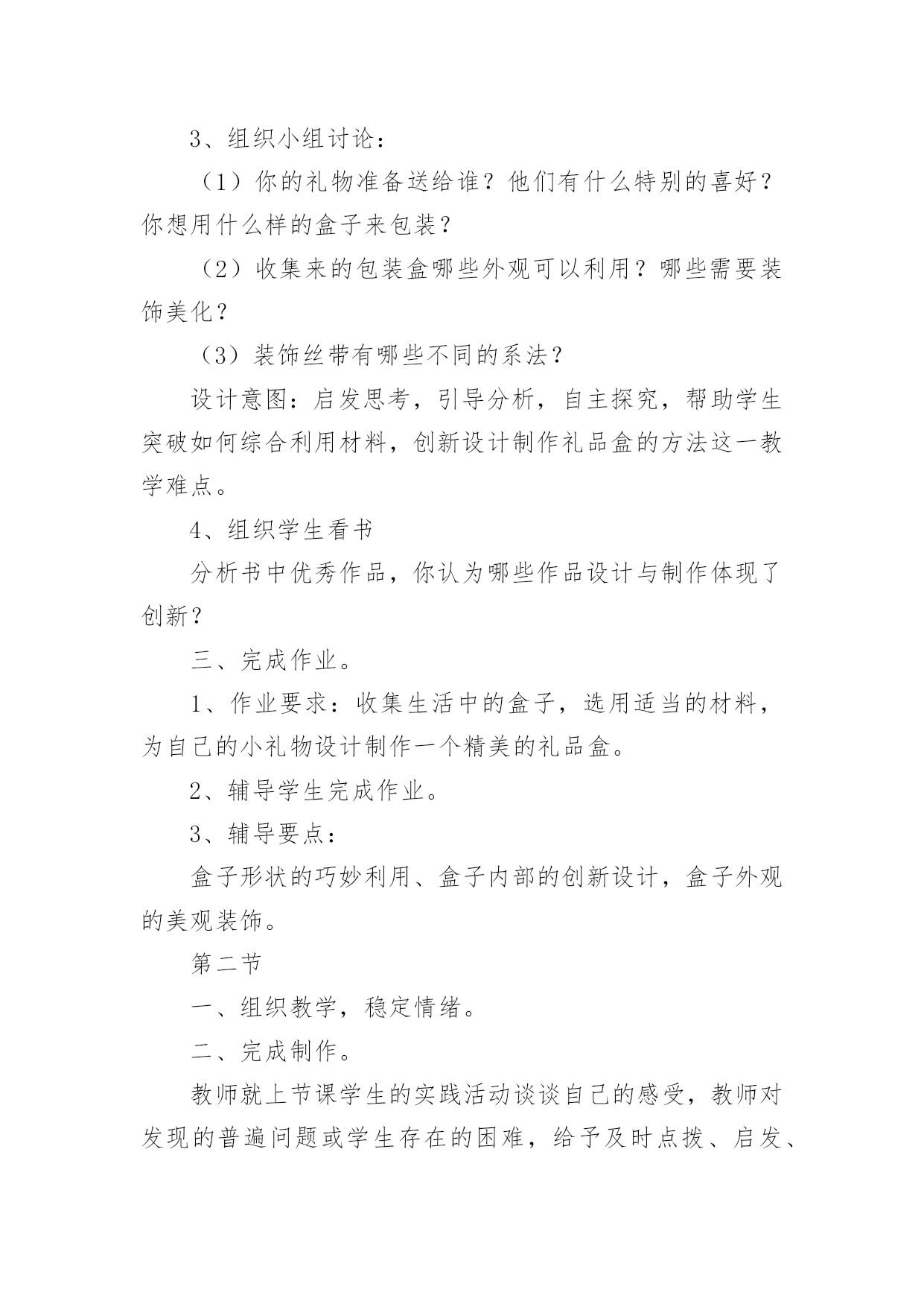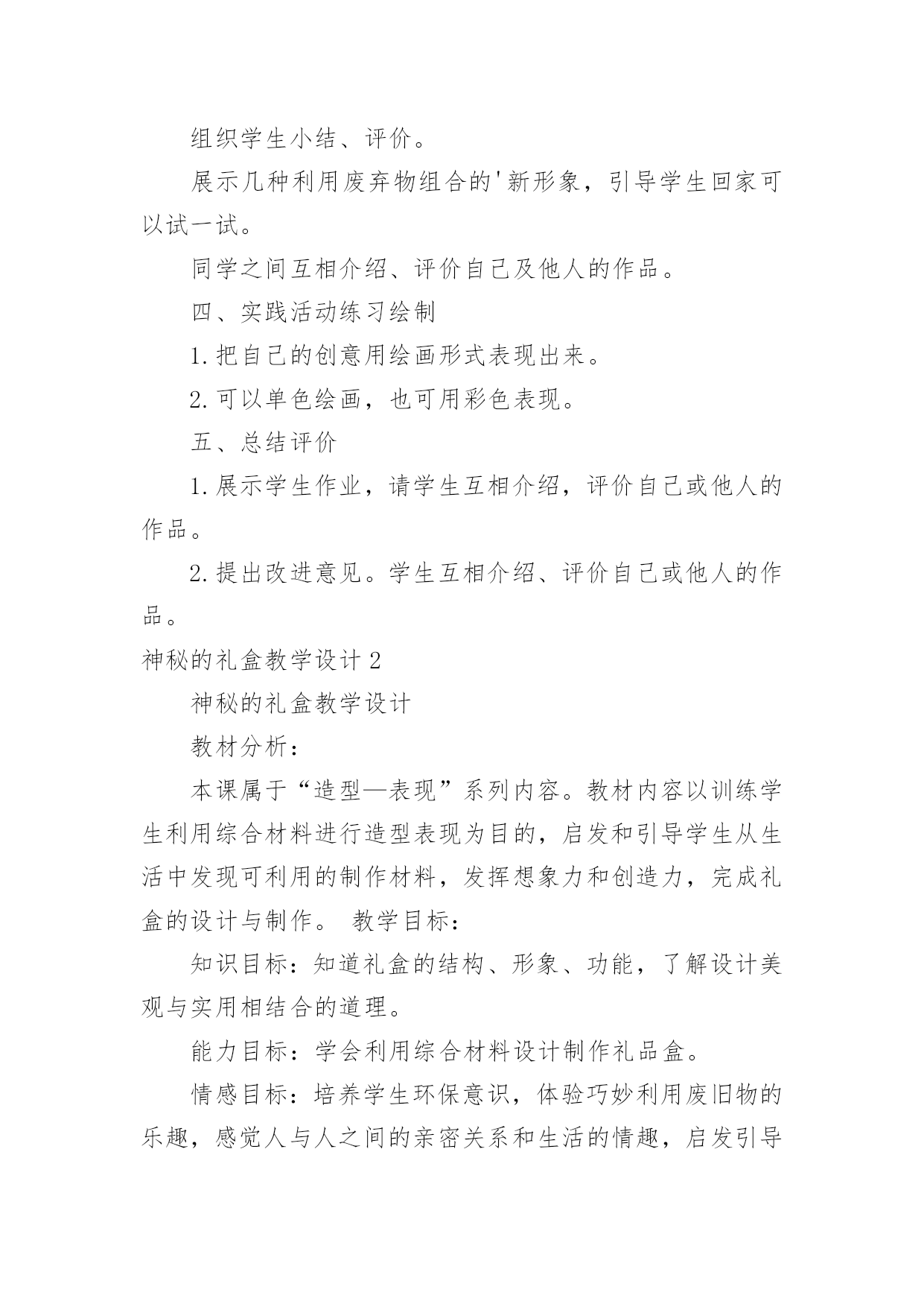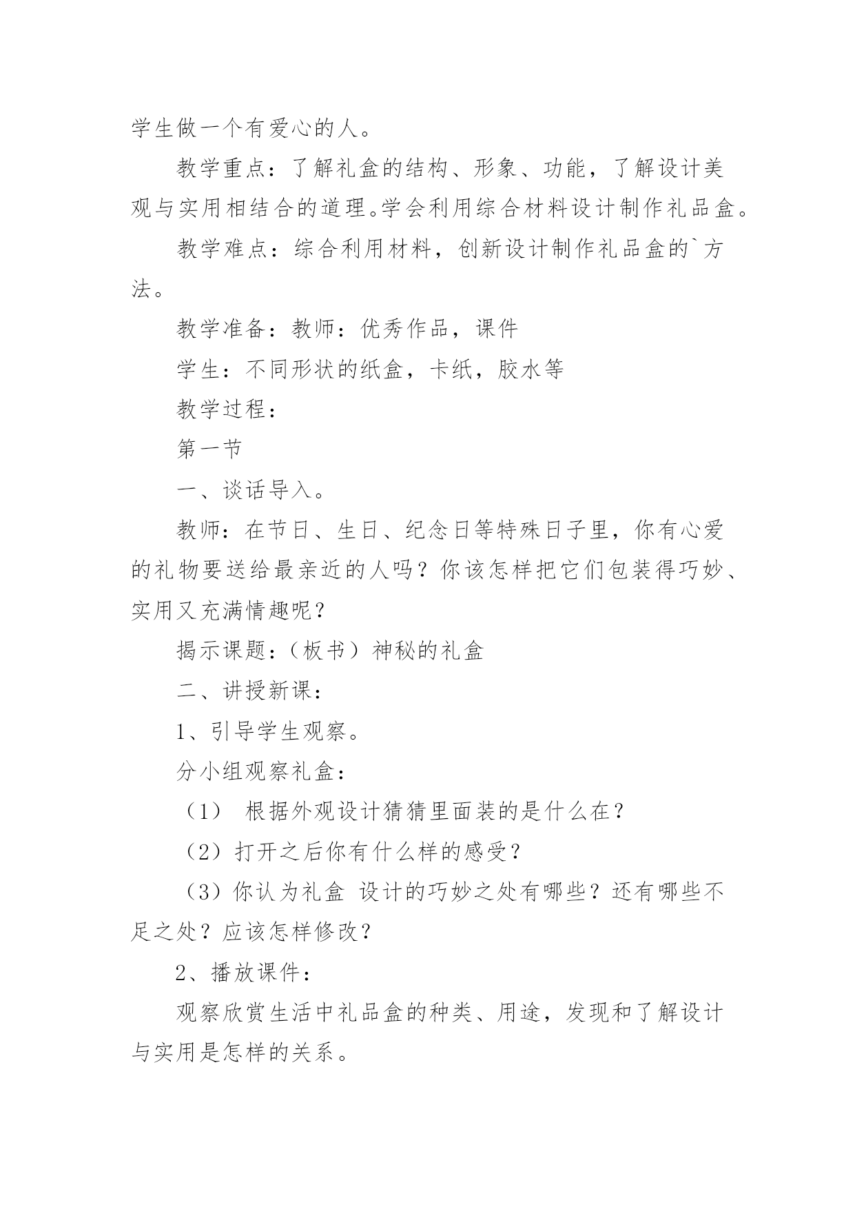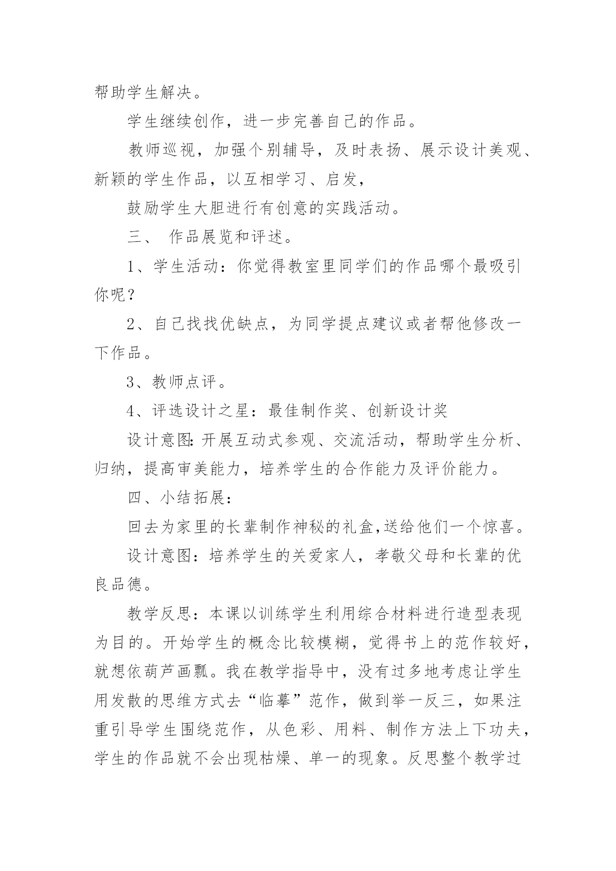 神秘的礼盒教学设计神秘的礼盒教学设计作为一名教学工作者,通常需要用到教学设计来辅助教学,借助教学设计可以提高教学质量,收到预期的教学效果。那么你有了解过教学设计吗?以下是小编为大家整理的神秘的礼盒教学设计,仅供参考,希望能够帮助到大家。神秘的礼盒教学设计1一、组织教学稳定情绪,检查用具准备情况。二、导入新课欣赏夏加尔作品《我和我的村庄》,讨论:1.这幅画上画了什么?2.你感觉与以前看到的作品有什么不同?给你什么感受?3.你能用自己带来的这些物品进行魔术组合吗?三、讲授新课布置讨论题:1.课本上的这些作业是怎样进行的魔术组合的?2.你认为哪些地方组合的巧妙?3.你还想怎样组合?教师用课件演示几种与课本不同的组合方法。学生实践课后拓展巡视辅导。组织学生小结、评价。展示几种利用废弃物组合的'新形象,引导学生回家可以试一试。同学之间互相介绍、评价自己及他人的作品。四、实践活动练习绘制1.把自己的创意用绘画形式表现出来。2.可以单色绘画,也可用彩色表现。五、总结评价1.展示学生作业,请学生互相介绍,评价自己或他人的作品。2.提出改进意见。学生互相介绍、评价自己或他人的作品。神秘的礼盒教学设计2神秘的礼盒教学设计教材分析:本课属于“造型—表现”系列内容。教材内容以训练学生利用综合材料进行造型表现为目的,启发和引导学生从生活中发现可利用的制作材料,发挥想象力和创造力,完成礼盒的设计与制作。教学目标:知识目标:知道礼盒的结构、形象、功能,了解设计美观与实用相结合的道理。能力目标:学会利用综合材料设计制作礼品盒。情感目标:培养学生环保意识,体验巧妙利用废旧物的乐趣,感觉人与人之间的亲密关系和生活的情趣,启发引导学生做一个有爱心的人。教学重点:了解礼盒的结构、形象、功能,了解设计美观与实用相结合的道理。学会利用综合材料设计制作礼品盒。教学难点:综合利用材料,创新设计制作礼品盒的`方法。教学准备:教师:优秀作品,课件学生:不同形状的纸盒,卡纸,胶水等教学过程:第一节一、谈话导入。教师:在节日、生日、纪念日等特殊日子里,你有心爱的礼物要送给最亲近的人吗?你该怎样把它们包装得巧妙、实用又充满情趣呢?揭示课题:(板书)神秘的礼盒二、讲授新课:1、引导学生观察。分小组观察礼盒:(1)根据外观设计猜猜里面装的是什么在?(2)打开之后你有什么样的感受?(3)你认为礼盒设计的巧妙之处有哪些?还有哪些不足之处?应该怎样修改?2、播放课件:观察欣赏生活中礼品盒的种类、用途,发现和了解设计与实用是怎样的关系。3、组织小组讨论:(1)你的礼物准备送给谁?他们有什么特别的喜好?你想用什么样的盒子来包装?(2)收集来的包装盒哪些外观可以利用?哪些需要装饰美化?(3)装饰丝带有哪些不同的系法?设计意图:启发思考,引导分析,自主探究,帮助学生突破如何综合利用材料,创新设计制作礼品盒的方法这一教学难点。4、组织学生看书分析书中优秀作品,你认为哪些作品设计与制作体现了创新?三、完成作业。1、作业要求:收集生活中的盒子,选用适当的材料,为自己的小礼物设计制作一个精美的礼品盒。2、辅导学生完成作业。3、辅导要点:盒子形状的巧妙利用、盒子内部的创新设计,盒子外观的美观装饰。第二节一、组织教学,稳定情绪。二、完成制作。教师就上节课学生的实践活动谈谈自己的感受,教师对发现的普遍问题或学生存在的困难,给予及时点拨、启发、帮助学生解决。学生继续创作,进一步完善自己的作品。教师巡视,加强个别辅导,及时表扬、展示设计美观、新颖的学生作品,以互相学习、启发,鼓励学生大胆进行有创意的实践活动。三、作品展览和评述。1、学生活动:你觉得教室里同学们的作品哪个最吸引你呢?2、自己找找优缺点,为同学提点建议或者帮他修改一下作品。3、教师点评。4、评选设计之星:最佳制作奖、创新设计奖设计意图:开展互动式参观、交流活动,帮助学生分析、归纳,提高审美能力,培养学生的合作能力及评价能力。四、小结拓展:回去为家里的长辈制作神秘的礼盒,送给他们一个惊喜。设计意图:培养学生的关爱家人,孝敬父母和长辈的优良品德。教学反思:本课以训练学生利用综合材料进行造型表现为目的。开始学生的概念比较模糊,觉得书上的范作较好,就想依葫芦画瓢。我在教学指导中,没有过多地考虑让学生用发散的思维方式去“临摹”范作,做到举一反三,如果注重引导学生围绕范作,从色彩、用料、制作方法上下功夫,学生的作品就不会出现枯燥、单一的现象。反思整个教学过程,我想,真正能让学生发挥自己的潜能,发挥自己的想象,提高设计兴趣,创出佳作并非易事。只有让学生学会从范作中去发掘创作灵感与激情,大胆放手地去做,学生才能创作出属于自己的佳作。神秘的礼盒教学设计3课业类型造型表现教学目标显性目标知道礼盒的结构、形象、功能,了解设计美观与实用相结合的道理。隐性目标感悟利用改变常规的