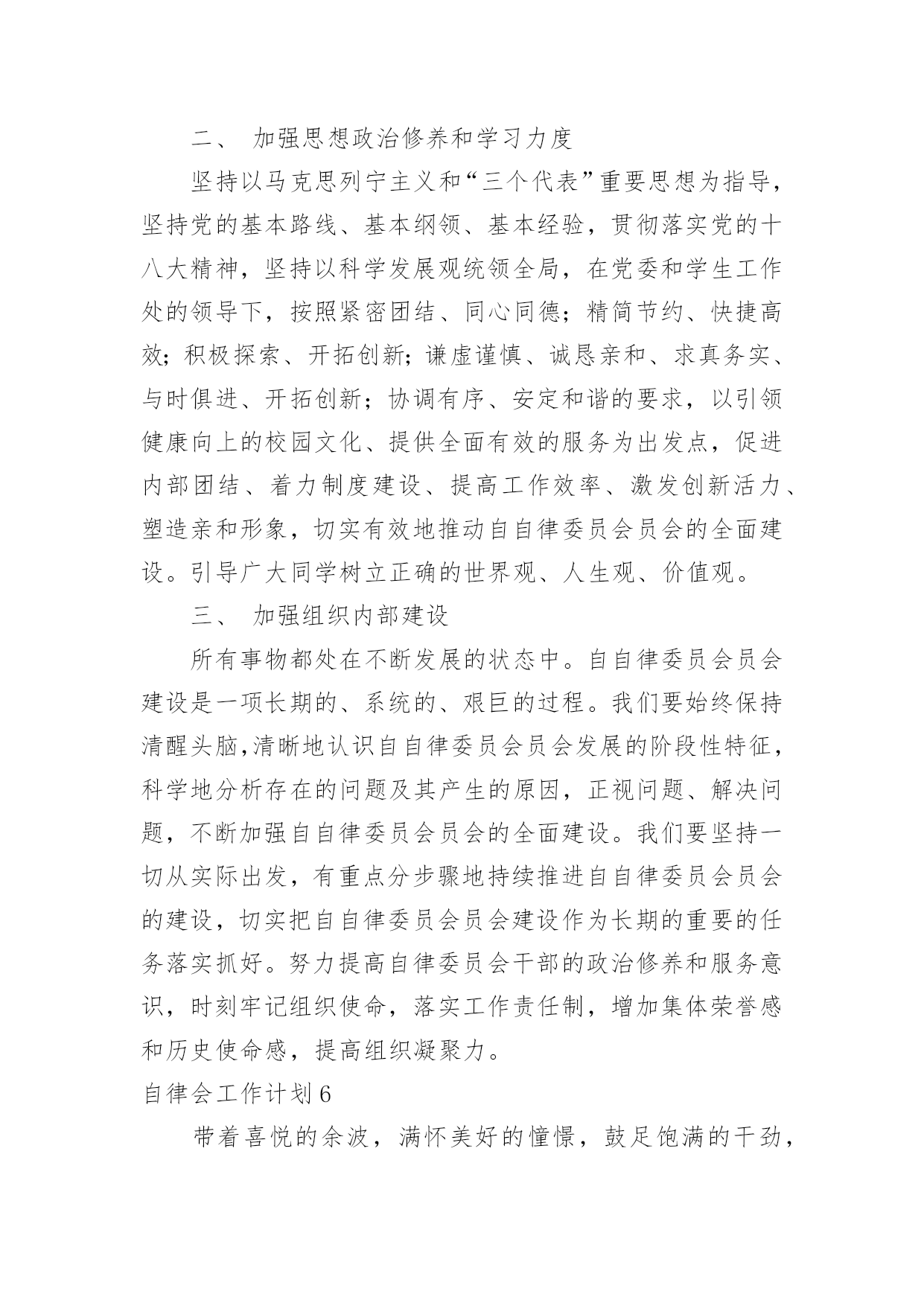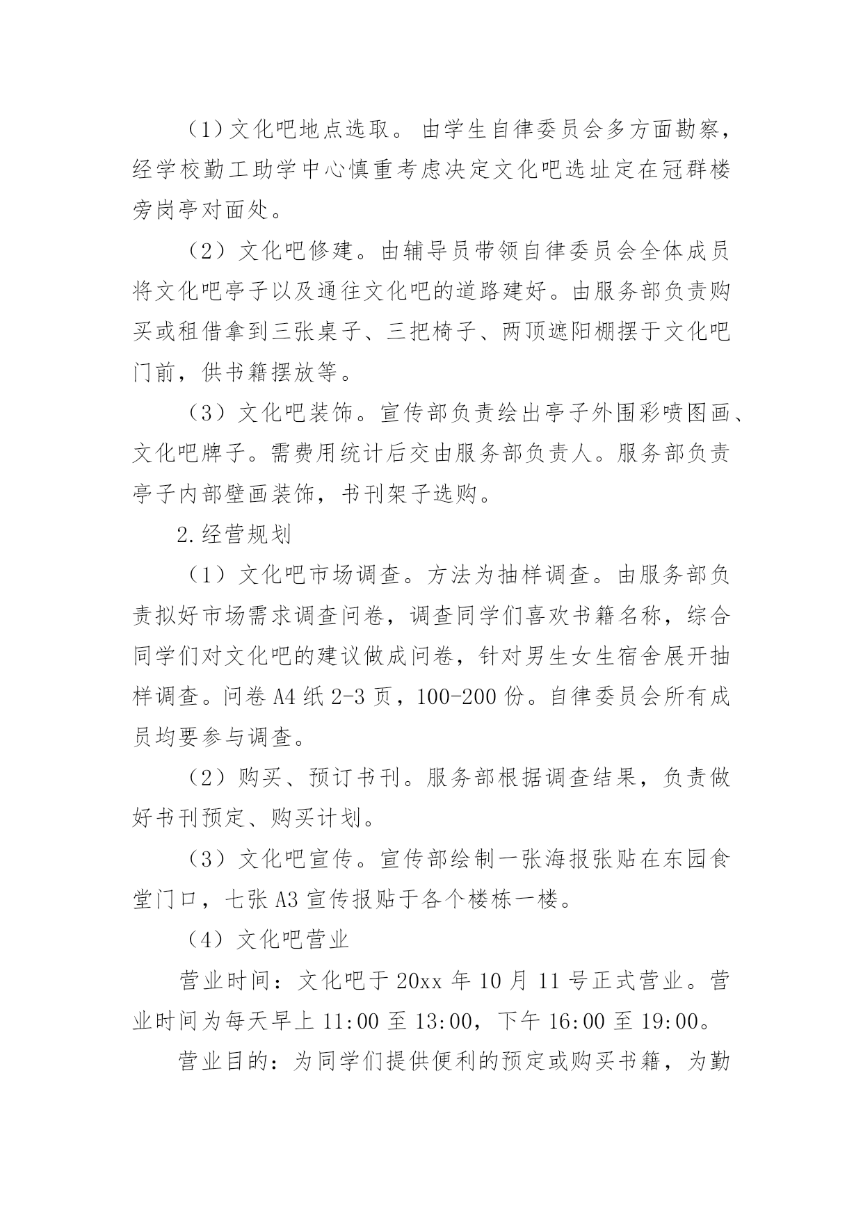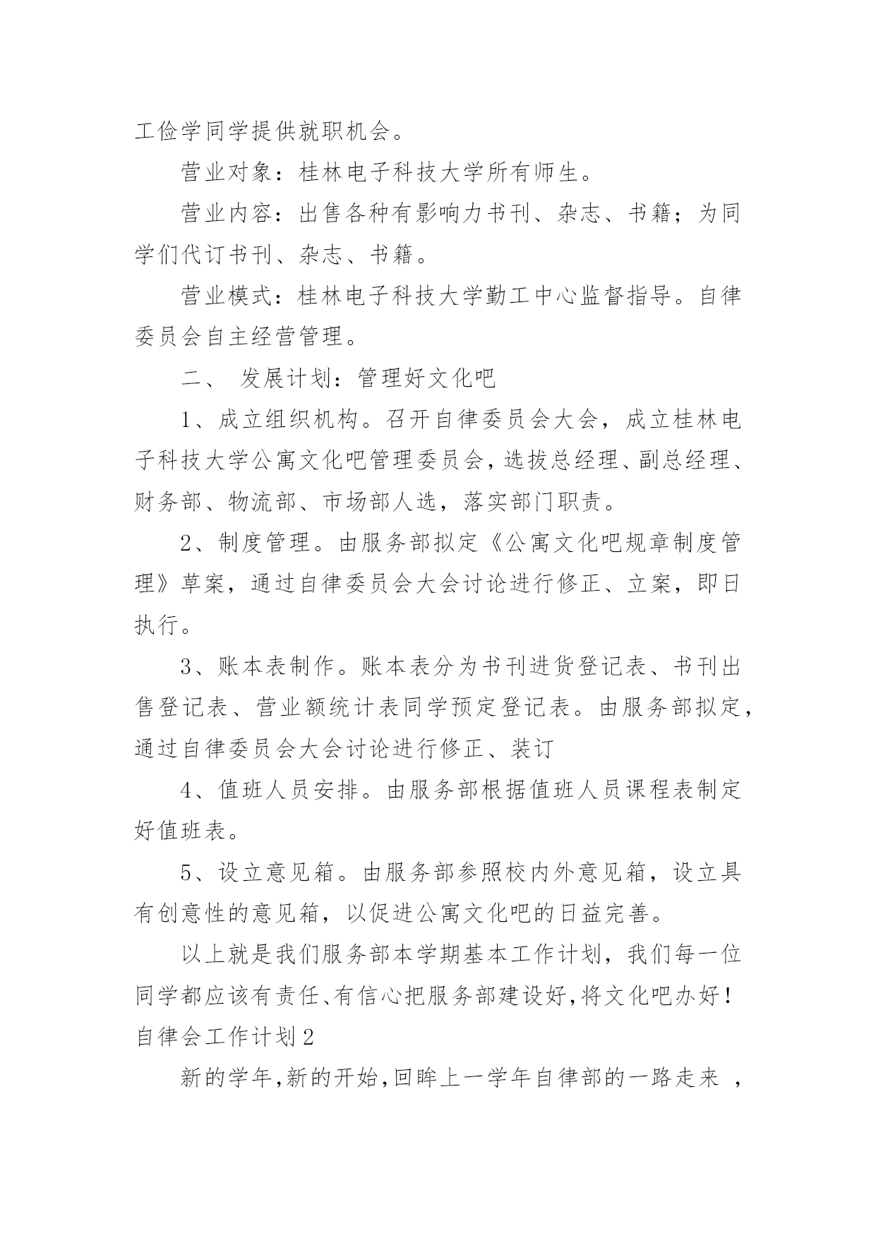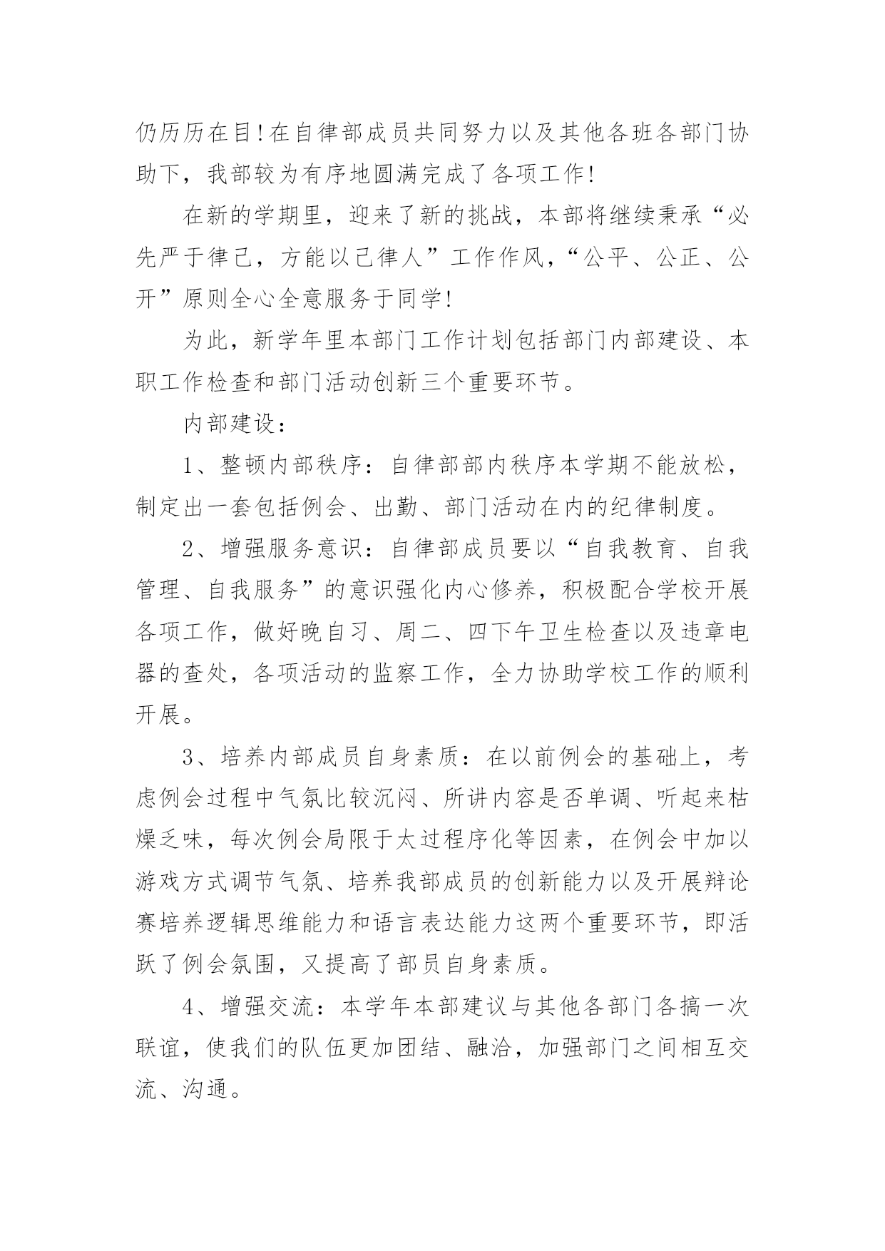 自律会工作计划自律会工作计划时间就如同白驹过隙般的流逝,前方等待着我们的是新的机遇和挑战,做好计划,让自己成为更有竞争力的人吧。你所接触过的计划都是什么样子的呢?以下是小编为大家收集的自律会工作计划,欢迎阅读与收藏。自律会工作计划1作为一名大学生,我们要抓住时代赋予我们的机遇,不断拼搏进取,不断求实创新,不断提高自己的物质文明和精神文明,积极成为一名有道德、有文化的优秀人才。因此,为开拓同学们的视野,丰富同学们的业余文化,促进校园文化传播,提高公寓生活质量,学校创办了公寓文化吧,为了搞好文化吧的建设,与之服务部顺应而生。服务部基本工作:创办文化吧,管理文化吧服务部服务理念:服务桂电,丰富校园文化生活服务部服务宗旨:用心服务,锻炼自我服务部服务精神:热忱敬业,诚信负责以下是服务部工作计划:一、近期工作计划:筹备文化吧创办。创办分为文化吧修建、经营。1.修建规划(1)文化吧地点选取。由学生自律委员会多方面勘察,经学校勤工助学中心慎重考虑决定文化吧选址定在冠群楼旁岗亭对面处。(2)文化吧修建。由辅导员带领自律委员会全体成员将文化吧亭子以及通往文化吧的道路建好。由服务部负责购买或租借拿到三张桌子、三把椅子、两顶遮阳棚摆于文化吧门前,供书籍摆放等。(3)文化吧装饰。宣传部负责绘出亭子外围彩喷图画、文化吧牌子。需费用统计后交由服务部负责人。服务部负责亭子内部壁画装饰,书刊架子选购。2.经营规划(1)文化吧市场调查。方法为抽样调查。由服务部负责拟好市场需求调查问卷,调查同学们喜欢书籍名称,综合同学们对文化吧的建议做成问卷,针对男生女生宿舍展开抽样调查。问卷A4纸2-3页,100-200份。自律委员会所有成员均要参与调查。(2)购买、预订书刊。服务部根据调查结果,负责做好书刊预定、购买计划。(3)文化吧宣传。宣传部绘制一张海报张贴在东园食堂门口,七张A3宣传报贴于各个楼栋一楼。(4)文化吧营业营业时间:文化吧于20xx年10月11号正式营业。营业时间为每天早上11:00至13:00,下午16:00至19:00。营业目的:为同学们提供便利的预定或购买书籍,为勤工俭学同学提供就职机会。营业对象:桂林电子科技大学所有师生。营业内容:出售各种有影响力书刊、杂志、书籍;为同学们代订书刊、杂志、书籍。营业模式:桂林电子科技大学勤工中心监督指导。自律委员会自主经营管理。二、发展计划:管理好文化吧1、成立组织机构。召开自律委员会大会,成立桂林电子科技大学公寓文化吧管理委员会,选拔总经理、副总经理、财务部、物流部、市场部人选,落实部门职责。2、制度管理。由服务部拟定《公寓文化吧规章制度管理》草案,通过自律委员会大会讨论进行修正、立案,即日执行。3、账本表制作。账本表分为书刊进货登记表、书刊出售登记表、营业额统计表同学预定登记表。由服务部拟定,通过自律委员会大会讨论进行修正、装订4、值班人员安排。由服务部根据值班人员课程表制定好值班表。5、设立意见箱。由服务部参照校内外意见箱,设立具有创意性的意见箱,以促进公寓文化吧的日益完善。以上就是我们服务部本学期基本工作计划,我们每一位同学都应该有责任、有信心把服务部建设好,将文化吧办好!自律会工作计划2新的学年,新的开始,回眸上一学年自律部的一路走来,仍历历在目!在自律部成员共同努力以及其他各班各部门协助下,我部较为有序地圆满完成了各项工作!在新的学期里,迎来了新的挑战,本部将继续秉承“必先严于律己,方能以己律人”工作作风,“公平、公正、公开”原则全心全意服务于同学!为此,新学年里本部门工作计划包括部门内部建设、本职工作检查和部门活动创新三个重要环节。内部建设:1、整顿内部秩序:自律部部内秩序本学期不能放松,制定出一套包括例会、出勤、部门活动在内的纪律制度。2、增强服务意识:自律部成员要以“自我教育、自我管理、自我服务”的意识强化内心修养,积极配合学校开展各项工作,做好晚自习、周二、四下午卫生检查以及违章电器的查处,各项活动的监察工作,全力协助学校工作的顺利开展。3、培养内部成员自身素质:在以前例会的基础上,考虑例会过程中气氛比较沉闷、所讲内容是否单调、听起来枯燥乏味,每次例会局限于太过程序化等因素,在例会中加以游戏方式调节气氛、培养我部成员的创新能力以及开展辩论赛培养逻辑思维能力和语言表达能力这两个重要环节,即活跃了例会氛围,又提高了部员自身素质。4、增强交流:本学年本部建议与其他各部门各搞一次联谊,使我们的队伍更加团结、融洽,加强部门之间相互交流、沟通。本职工作的检查:1、定时检查晚自习出勤以及周二、四卫生情况,每周总结记录,每周将定期向大家公开,以便大家了解,增强工作透明度2、不定期深入同学中间进行日常生活沟通,便于我部工作的完善3、及时了解同学们的意见和建议,通过面对面交流沟通建立与同学们交流的桥梁,对合理意