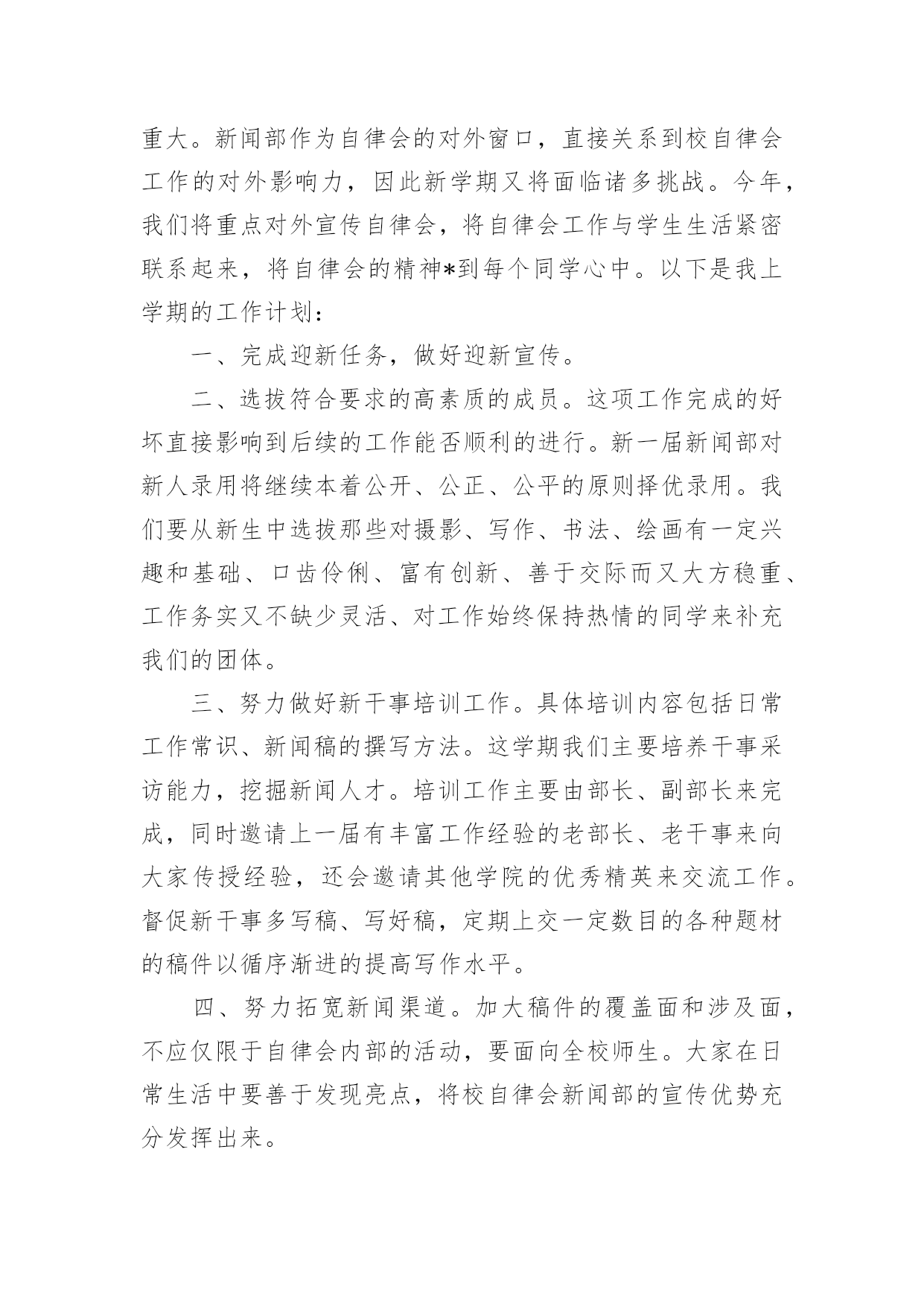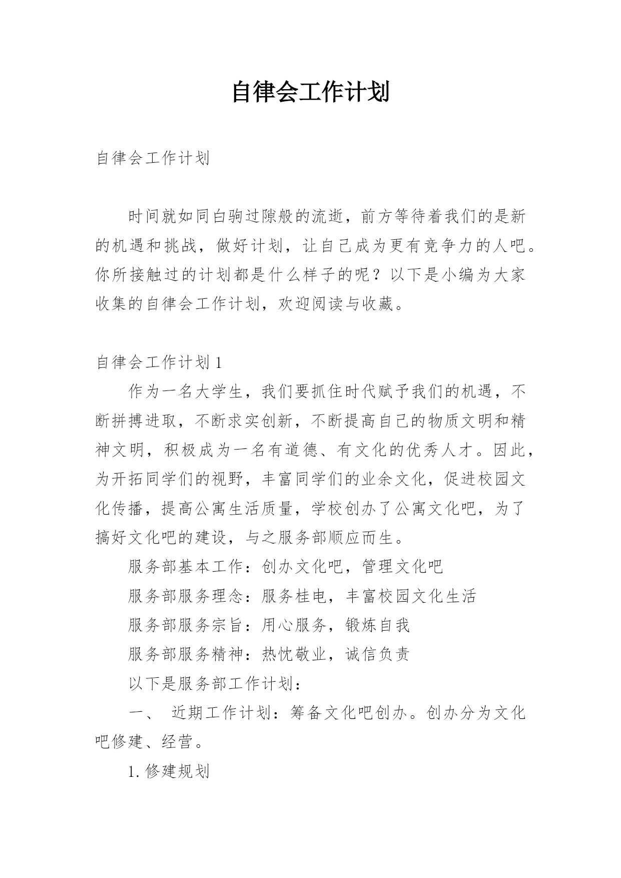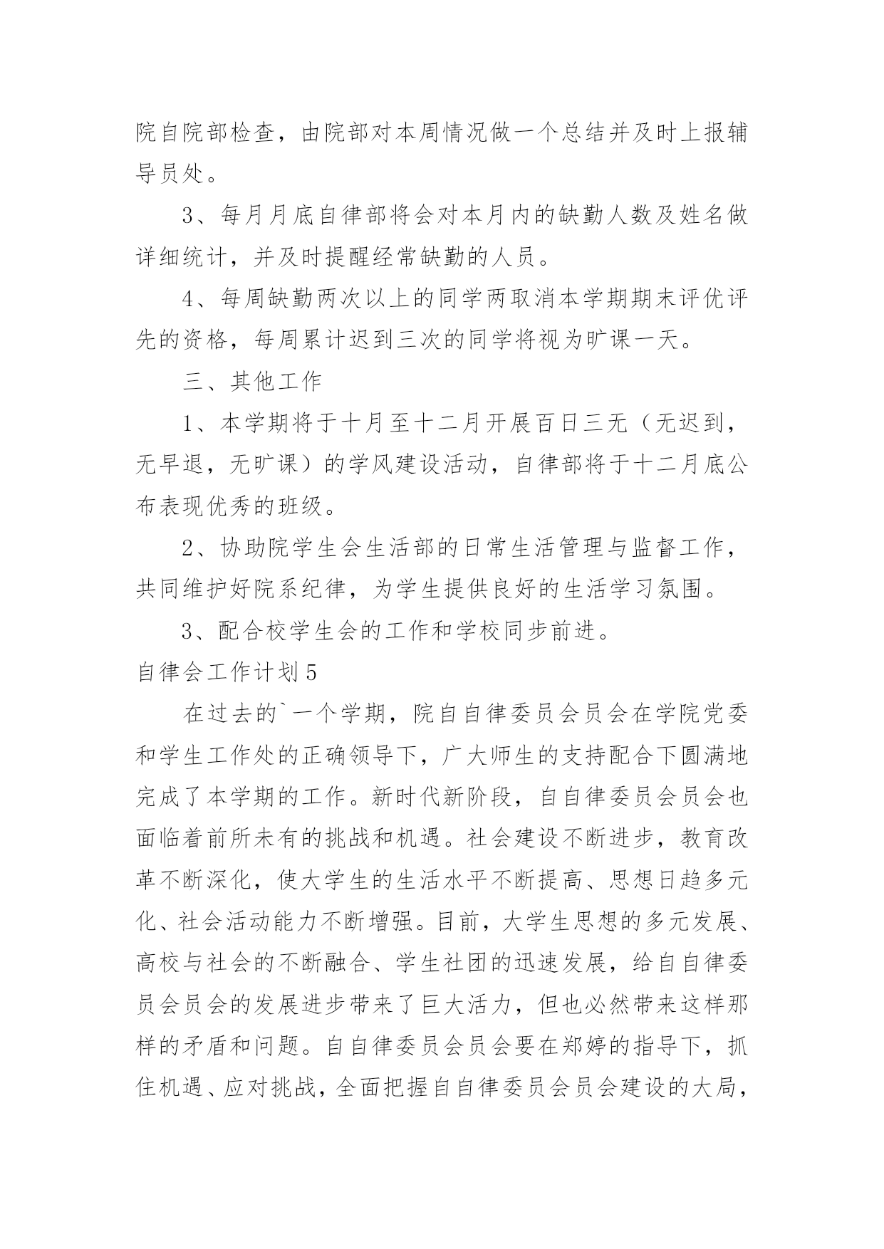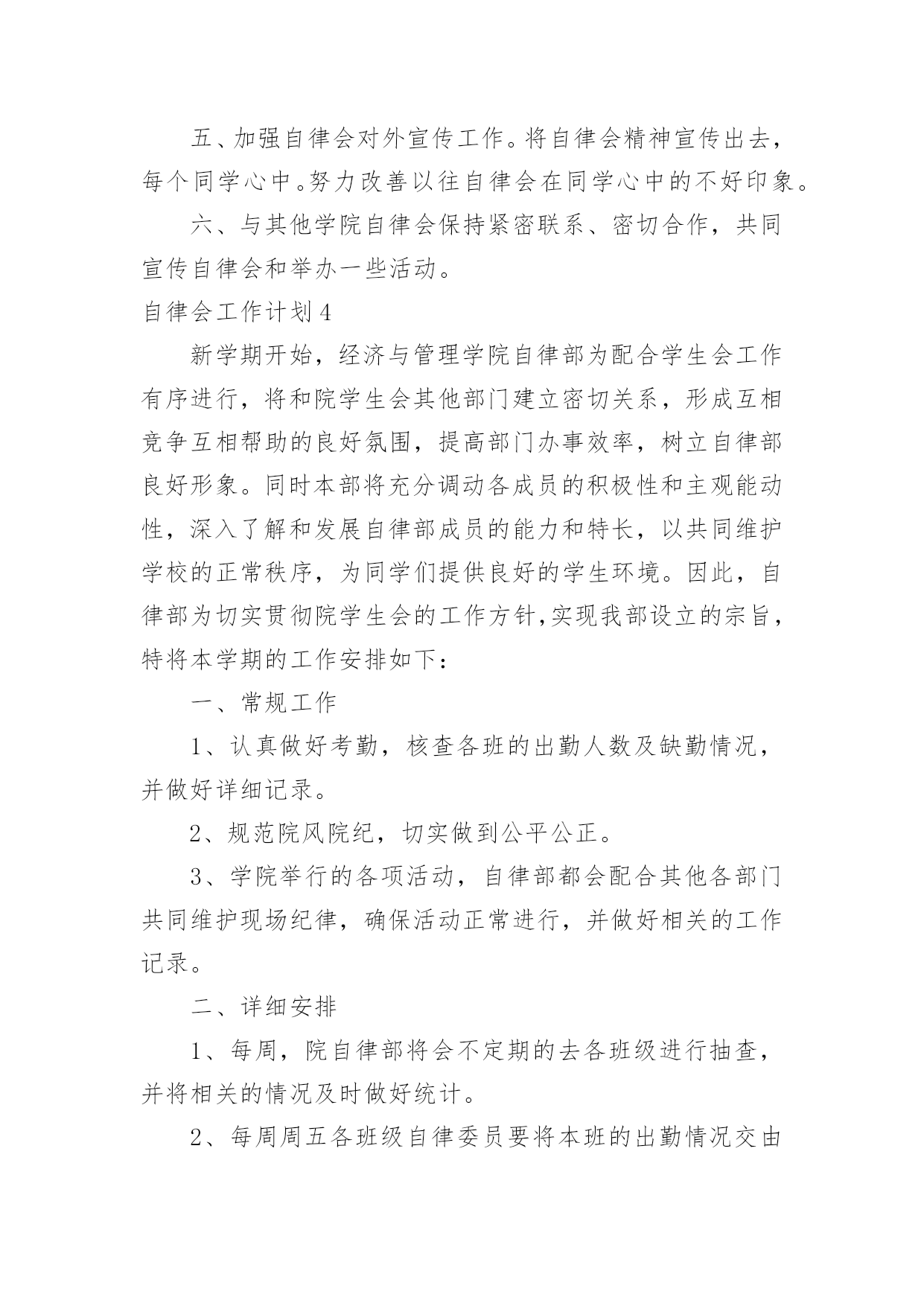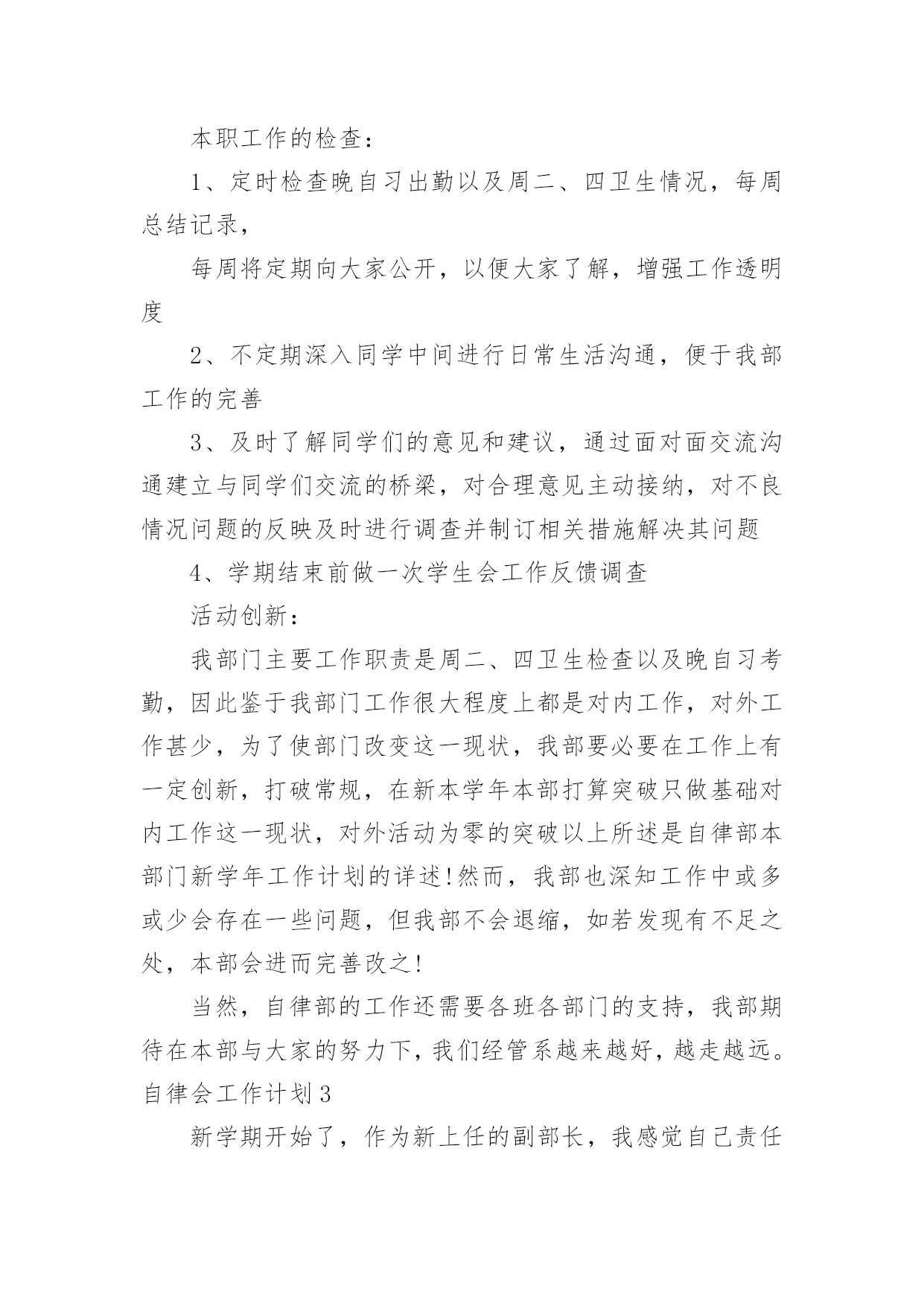 自律会工作计划自律会工作计划时间就如同白驹过隙般的流逝,前方等待着我们的是新的机遇和挑战,做好计划,让自己成为更有竞争力的人吧。你所接触过的计划都是什么样子的呢?以下是小编为大家收集的自律会工作计划,欢迎阅读与收藏。自律会工作计划1作为一名大学生,我们要抓住时代赋予我们的机遇,不断拼搏进取,不断求实创新,不断提高自己的物质文明和精神文明,积极成为一名有道德、有文化的优秀人才。因此,为开拓同学们的视野,丰富同学们的业余文化,促进校园文化传播,提高公寓生活质量,学校创办了公寓文化吧,为了搞好文化吧的建设,与之服务部顺应而生。服务部基本工作:创办文化吧,管理文化吧服务部服务理念:服务桂电,丰富校园文化生活服务部服务宗旨:用心服务,锻炼自我服务部服务精神:热忱敬业,诚信负责以下是服务部工作计划:一、近期工作计划:筹备文化吧创办。创办分为文化吧修建、经营。1.修建规划(1)文化吧地点选取。由学生自律委员会多方面勘察,经学校勤工助学中心慎重考虑决定文化吧选址定在冠群楼旁岗亭对面处。(2)文化吧修建。由辅导员带领自律委员会全体成员将文化吧亭子以及通往文化吧的道路建好。由服务部负责购买或租借拿到三张桌子、三把椅子、两顶遮阳棚摆于文化吧门前,供书籍摆放等。(3)文化吧装饰。宣传部负责绘出亭子外围彩喷图画、文化吧牌子。需费用统计后交由服务部负责人。服务部负责亭子内部壁画装饰,书刊架子选购。2.经营规划(1)文化吧市场调查。方法为抽样调查。由服务部负责拟好市场需求调查问卷,调查同学们喜欢书籍名称,综合同学们对文化吧的建议做成问卷,针对男生女生宿舍展开抽样调查。问卷A4纸2-3页,100-200份。自律委员会所有成员均要参与调查。(2)购买、预订书刊。服务部根据调查结果,负责做好书刊预定、购买计划。(3)文化吧宣传。宣传部绘制一张海报张贴在东园食堂门口,七张A3宣传报贴于各个楼栋一楼。(4)文化吧营业营业时间:文化吧于20xx年10月11号正式营业。营业时间为每天早上11:00至13:00,下午16:00至19:00。营业目的:为同学们提供便利的预定或购买书籍,为勤工俭学同学提供就职机会。营业对象:桂林电子科技大学所有师生。营业内容:出售各种有影响力书刊、杂志、书籍;为同学们代订书刊、杂志、书籍。营业模式:桂林电子科技大学勤工中心监督指导。自律委员会自主经营管理。二、发展计划:管理好文化吧1、成立组织机构。召开自律委员会大会,成立桂林电子科技大学公寓文化吧管理委员会,选拔总经理、副总经理、财务部、物流部、市场部人选,落实部门职责。2、制度管理。由服务部拟定《公寓文化吧规章制度管理》草案,通过自律委员会大会讨论进行修正、立案,即日执行。3、账本表制作。账本表分为书刊进货登记表、书刊出售登记表、营业额统计表同学预定登记表。由服务部拟定,通过自律委员会大会讨论进行修正、装订4、值班人员安排。由服务部根据值班人员课程表制定好值班表。5、设立意见箱。由服务部参照校内外意见箱,设立具有创意性的意见箱,以促进公寓文化吧的日益完善。以上就是我们服务部本学期基本工作计划,我们每一位同学都应该有责任、有信心把服务部建设好,将文化吧办好!自律会工作计划2新的学年,新的开始,回眸上一学年自律部的一路走来,仍历历在目!在自律部成员共同努力以及其他各班各部门协助下,我部较为有序地圆满完成了各项工作!在新的学期里,迎来了新的挑战,本部将继续秉承“必先严于律己,方能以己律人”工作作风,“公平、公正、公开”原则全心全意服务于同学!为此,新学年里本部门工作计划包括部门内部建设、本职工作检查和部门活动创新三个重要环节。内部建设:1、整顿内部秩序:自律部部内秩序本学期不能放松,制定出一套包括例会、出勤、部门活动在内的纪律制度。2、增强服务意识:自律部成员要以“自我教育、自我管理、自我服务”的意识强化内心修养,积极配合学校开展各项工作,做好晚自习、周二、四下午卫生检查以及违章电器的查处,各项活动的监察工作,全力协助学校工作的顺利开展。3、培养内部成员自身素质:在以前例会的基础上,考虑例会过程中气氛比较沉闷、所讲内容是否单调、听起来枯燥乏味,每次例会局限于太过程序化等因素,在例会中加以游戏方式调节气氛、培养我部成员的创新能力以及开展辩论赛培养逻辑思维能力和语言表达能力这两个重要环节,即活跃了例会氛围,又提高了部员自身素质。4、增强交流:本学年本部建议与其他各部门各搞一次联谊,使我们的队伍更加团结、融洽,加强部门之间相互交流、沟通。本职工作的检查:1、定时检查晚自习出勤以及周二、四卫生情况,每周总结记录,每周将定期向大家公开,以便大家了解,增强工作透明度2、不定期深入同学中间进行日常生活沟通,便于我部工作的完善3、及时了解同学们的意见和建议,通过面对面交流沟通建立与同学们交流的桥梁,对合理意